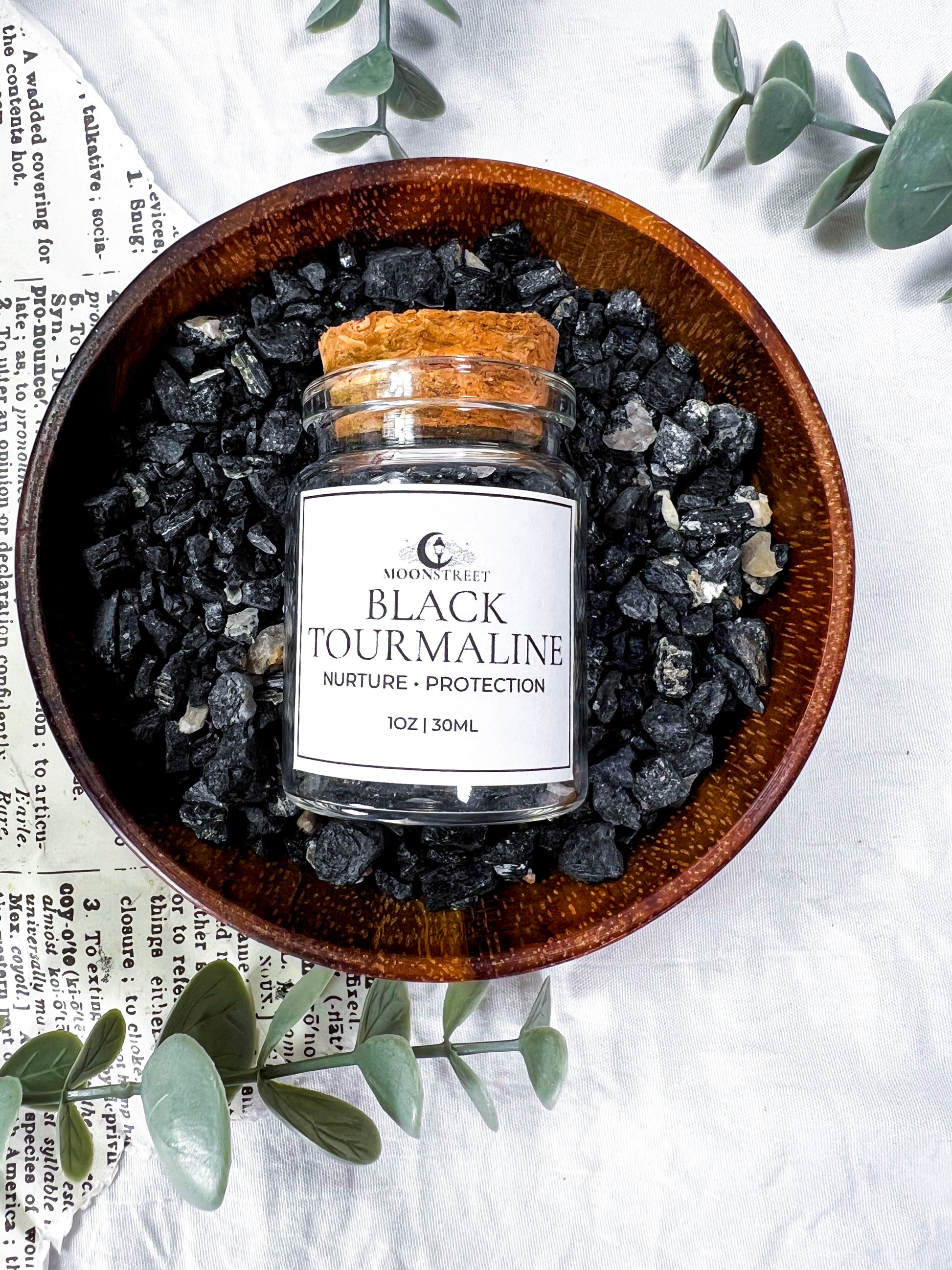 Bulk Black Tourmaline crystal chips in a 2oz glass jar, perfect for spell work, altars, jars, candles, grids, baths, and ritual magic. Known as the stone of protection and energetic cleansing, Black Tourmaline supports shielding, grounding, and clearing unwanted energy.