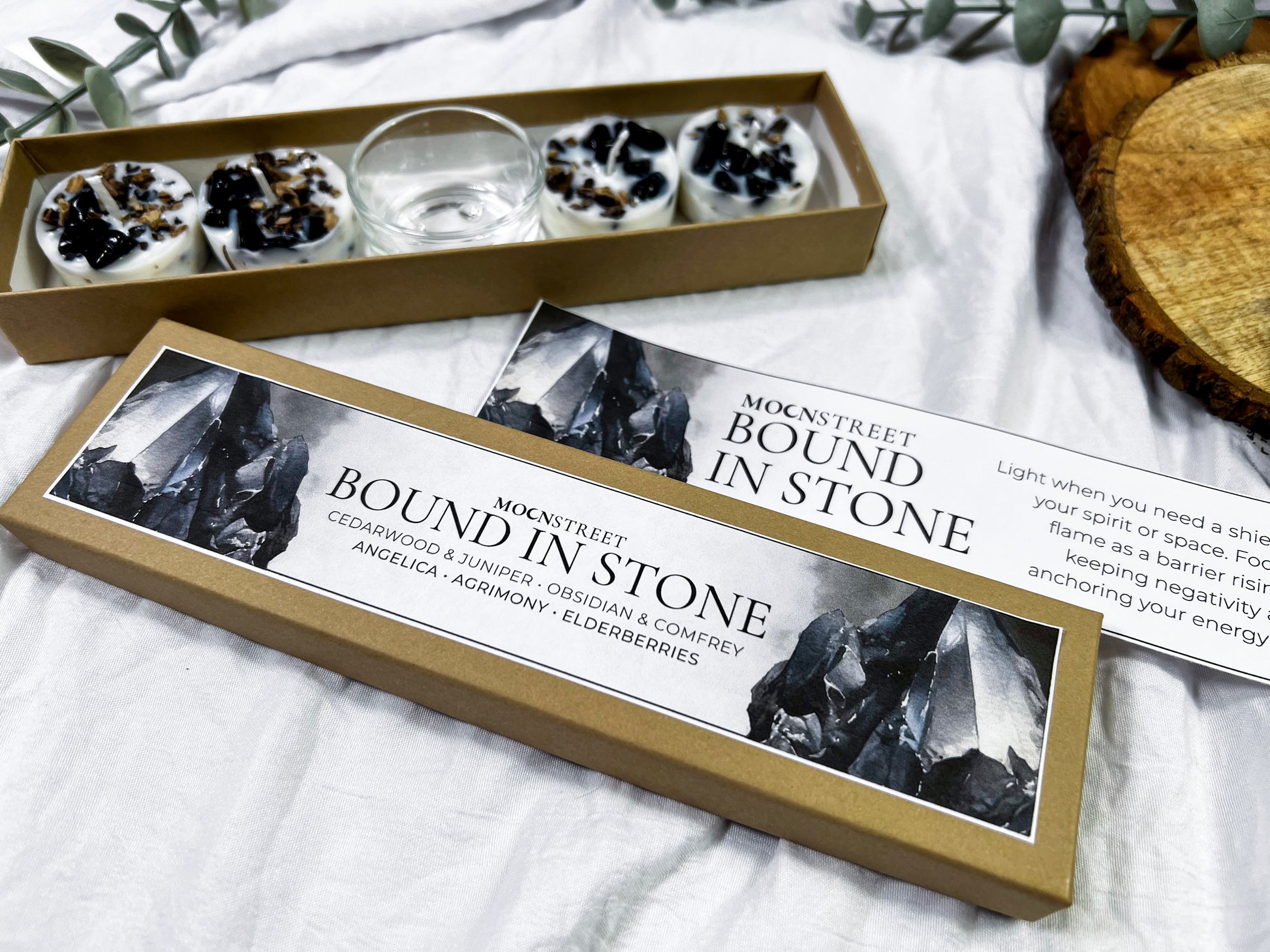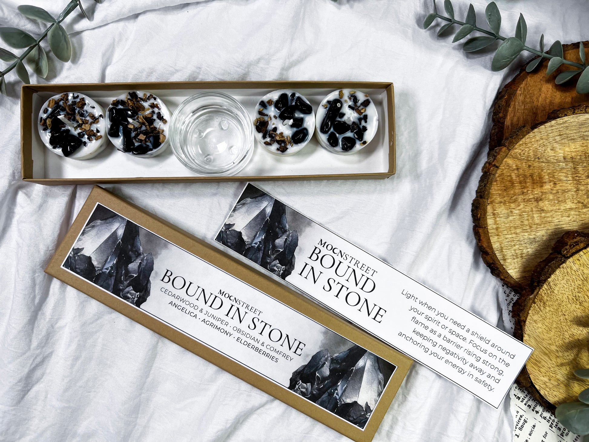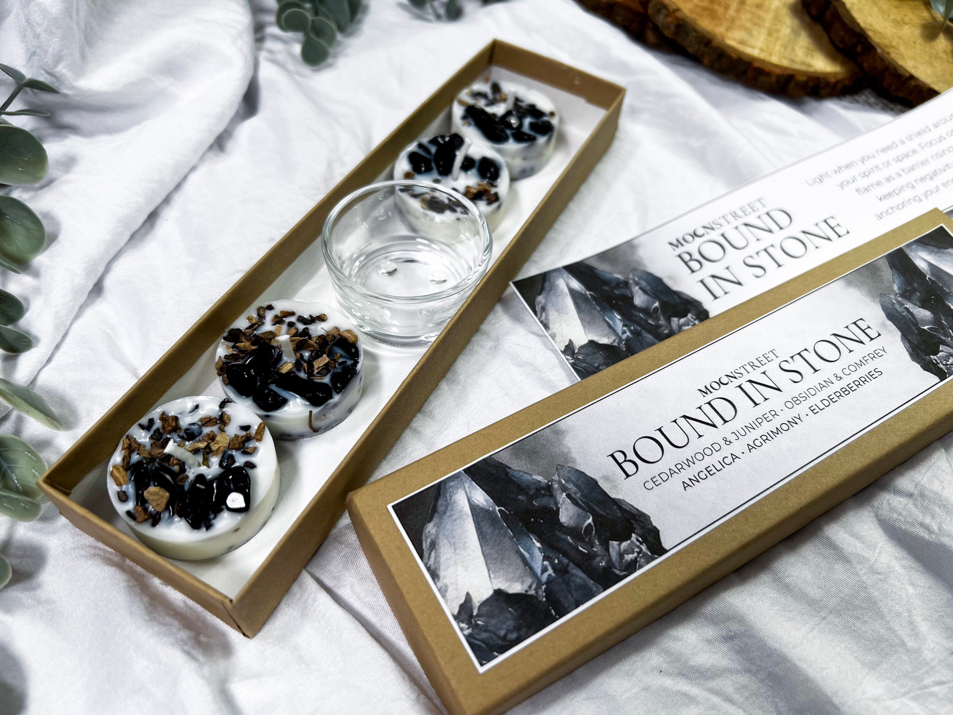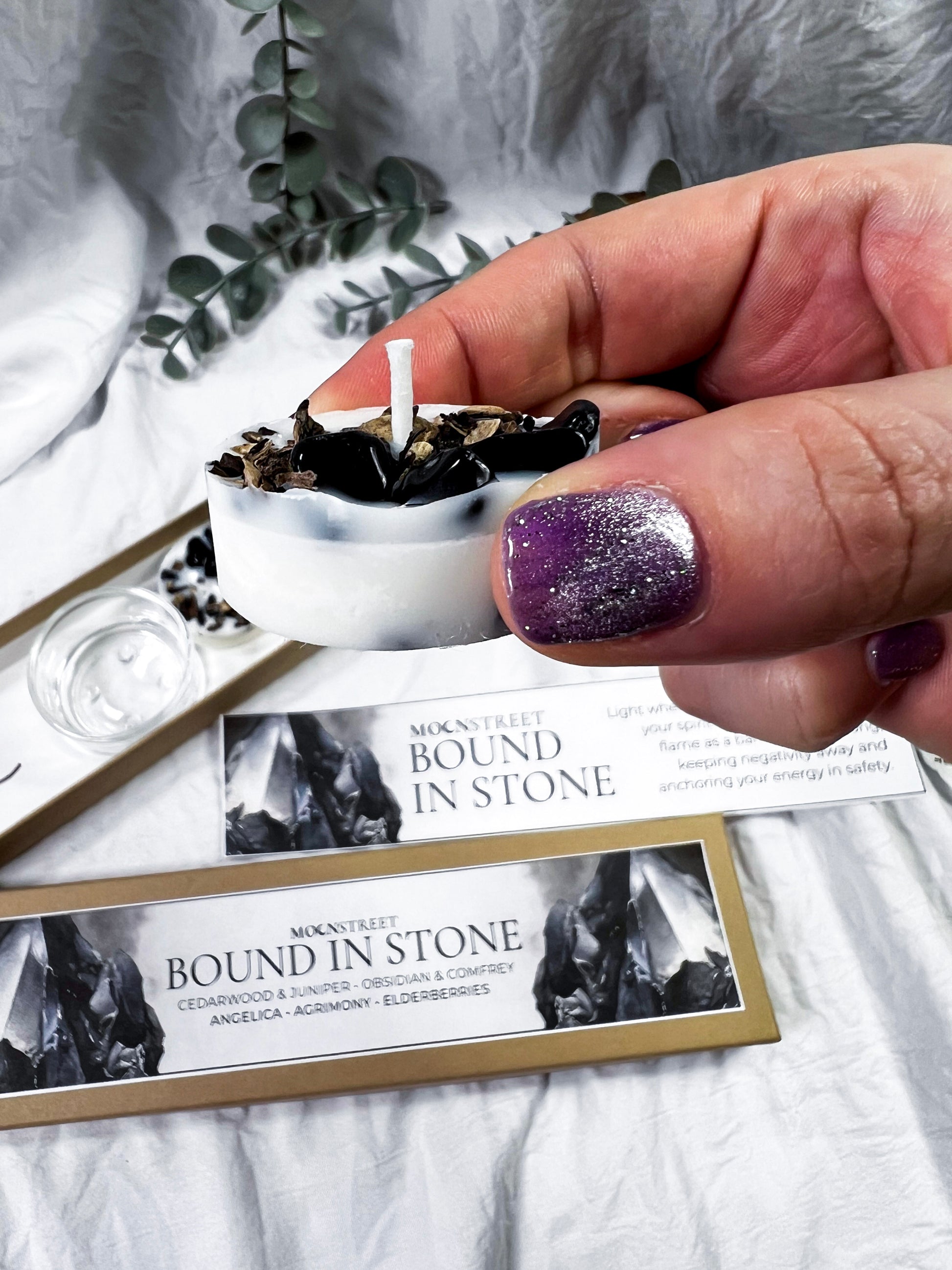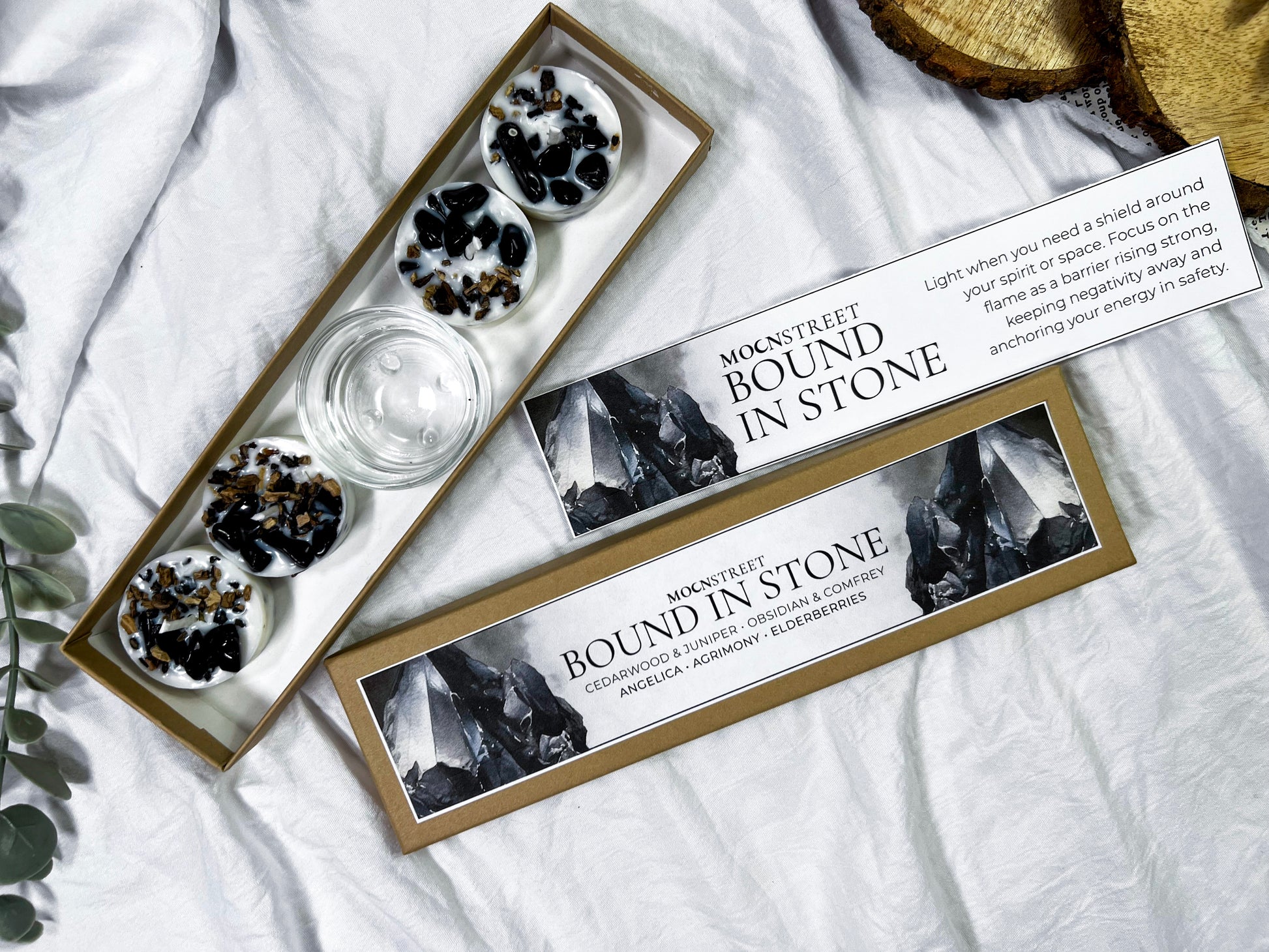 Four hand-poured tealights created for strength, safety, and removal of harmful energies. Scented with cedar and juniper, each tealight is infused with angelica, agrimony, and elderberries, then topped with obsidian and comfrey. Designed for grounding, banishing, and holding a firm protective circle, these tealights bring the energy of stone and shield into your practice. Burn during ritual or meditation to reinforce wards, block negativity, and anchor your space in safety.