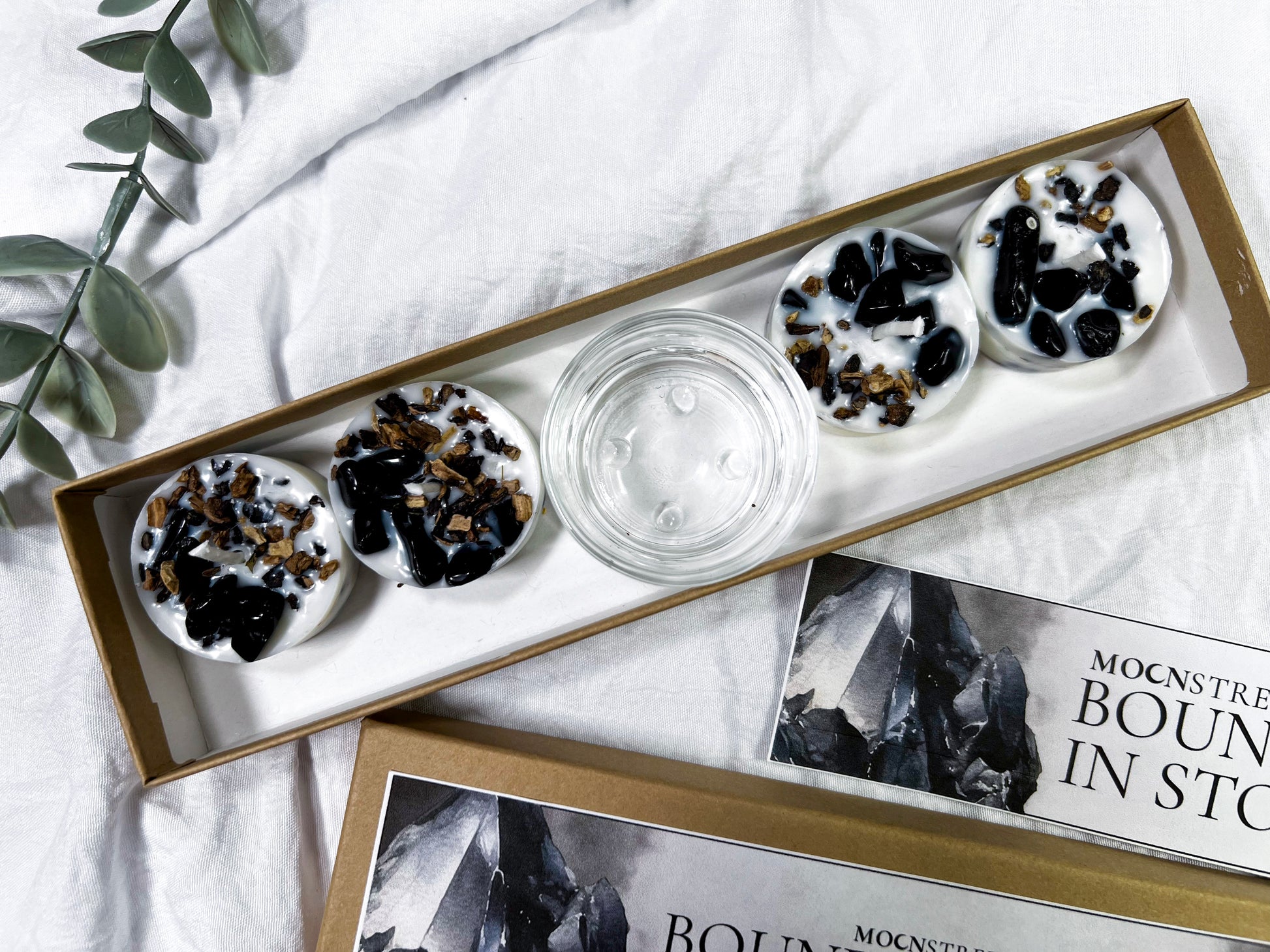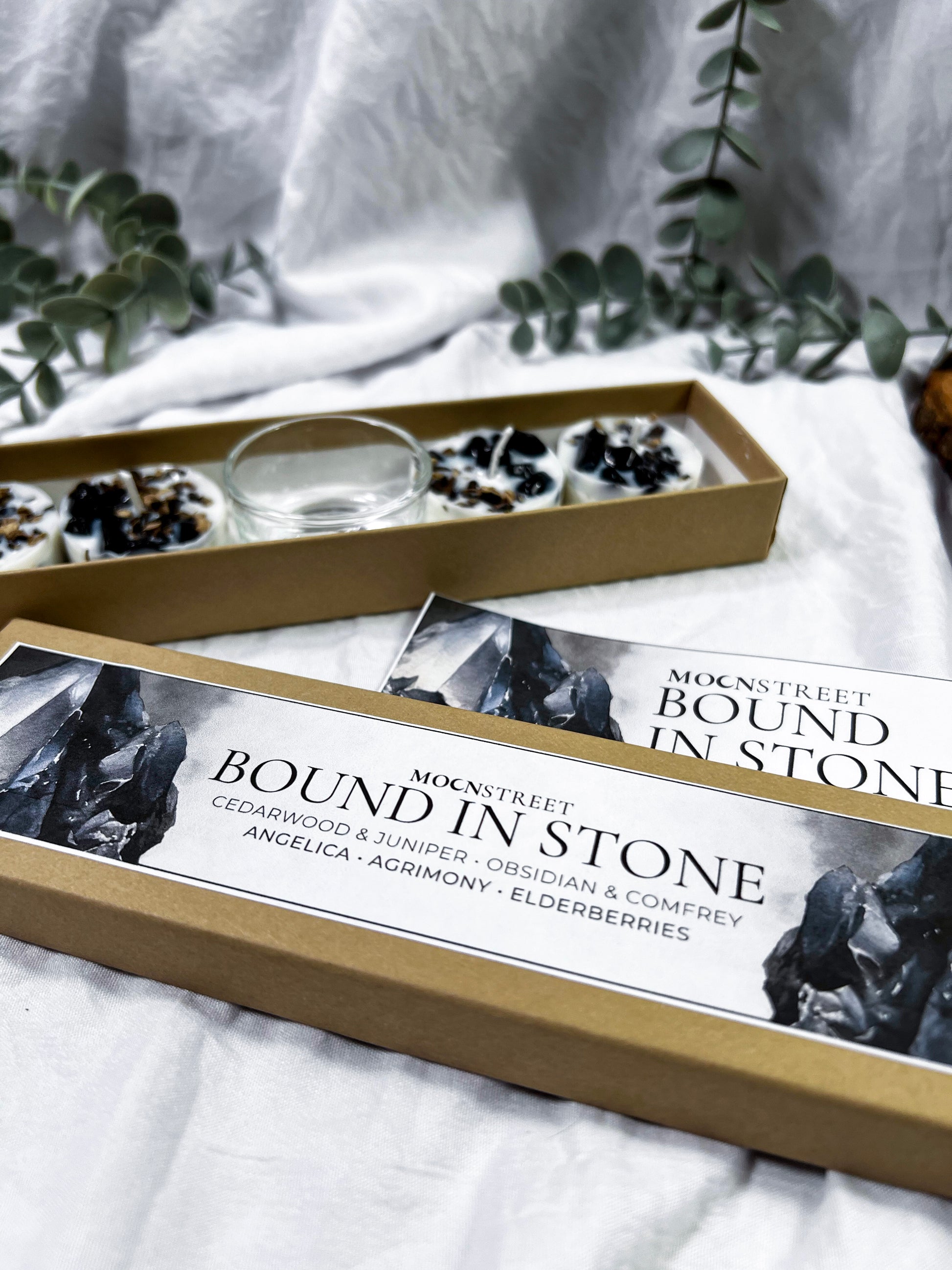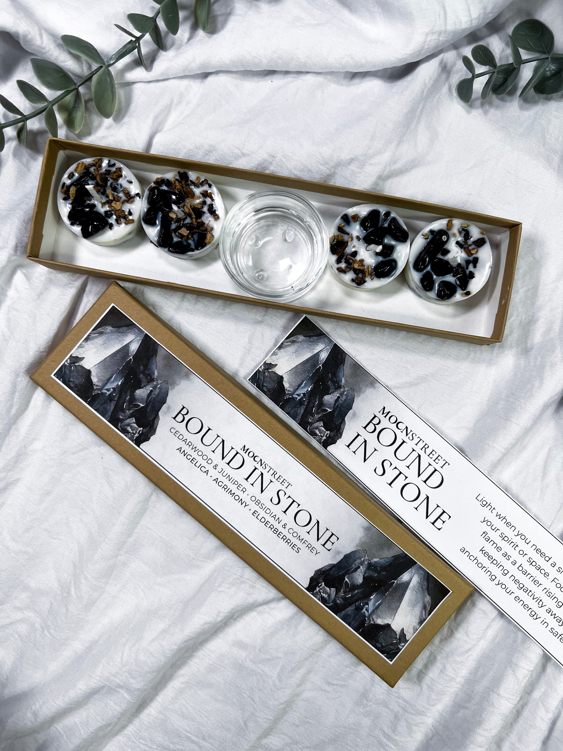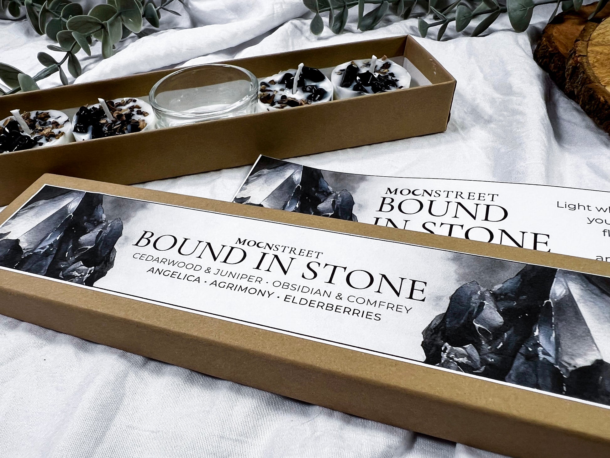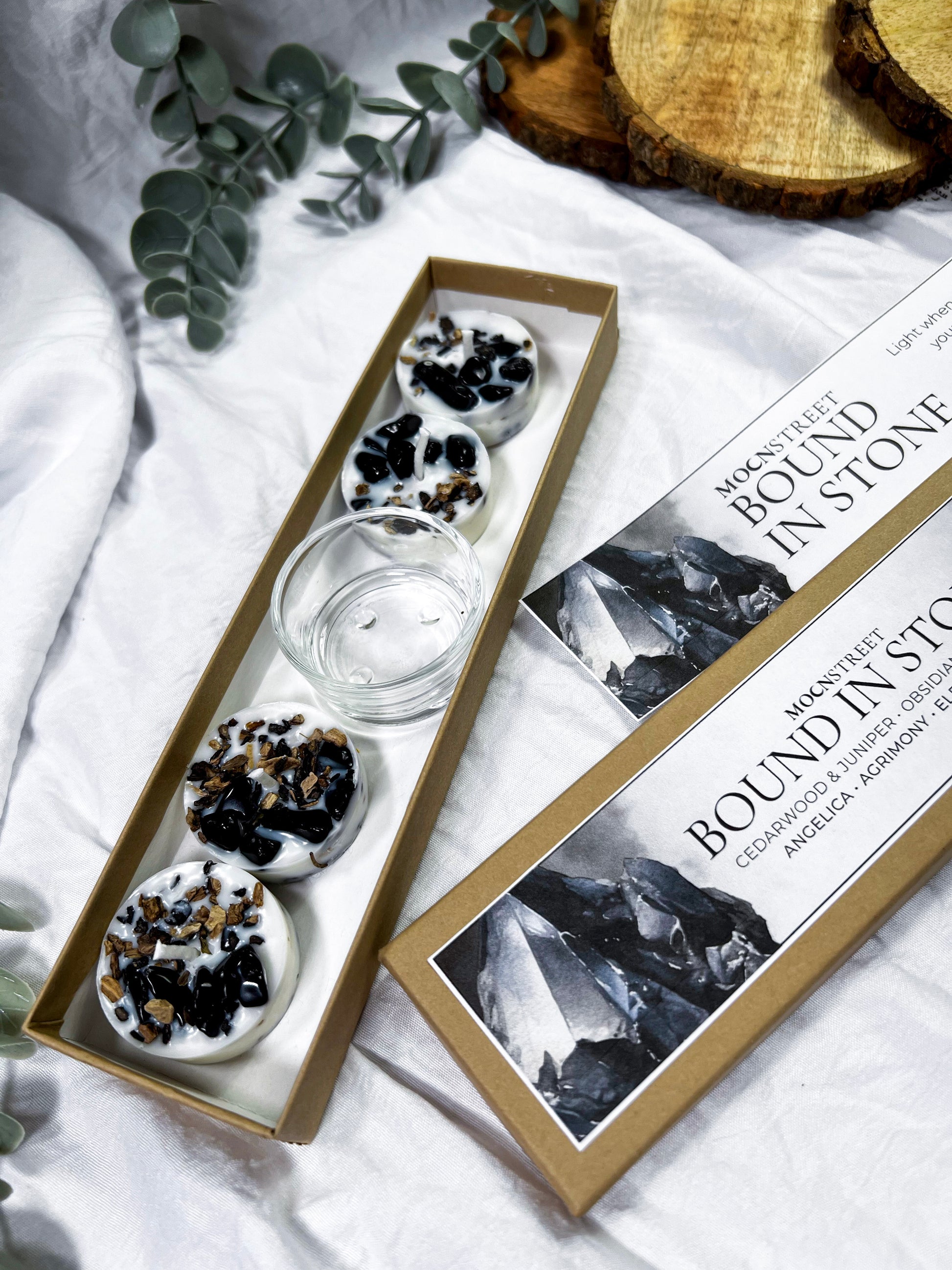 Four hand-poured tealights created for strength, safety, and removal of harmful energies. Scented with cedar and juniper, each tealight is infused with angelica, agrimony, and elderberries, then topped with obsidian and comfrey. Designed for grounding, banishing, and holding a firm protective circle, these tealights bring the energy of stone and shield into your practice. Burn during ritual or meditation to reinforce wards, block negativity, and anchor your space in safety.