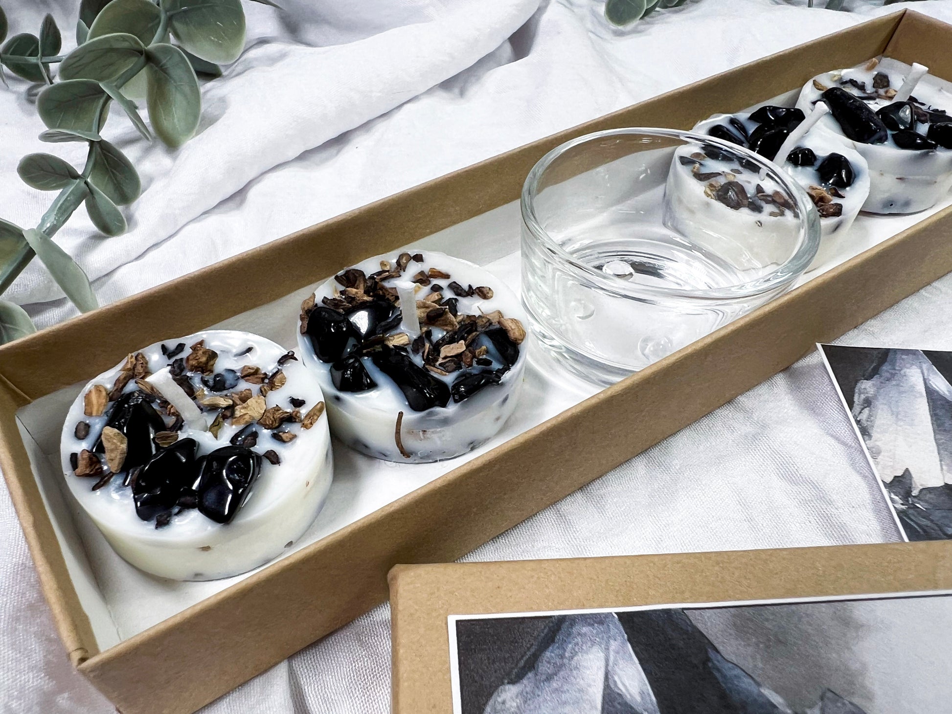 protection tealight set • warding candle ritual • cedar juniper spell • obsidian banishing candle • comfrey ward spell • angelica protection herb • agrimony magic tealights • glass holder tealight kit • witch ritual supplies
