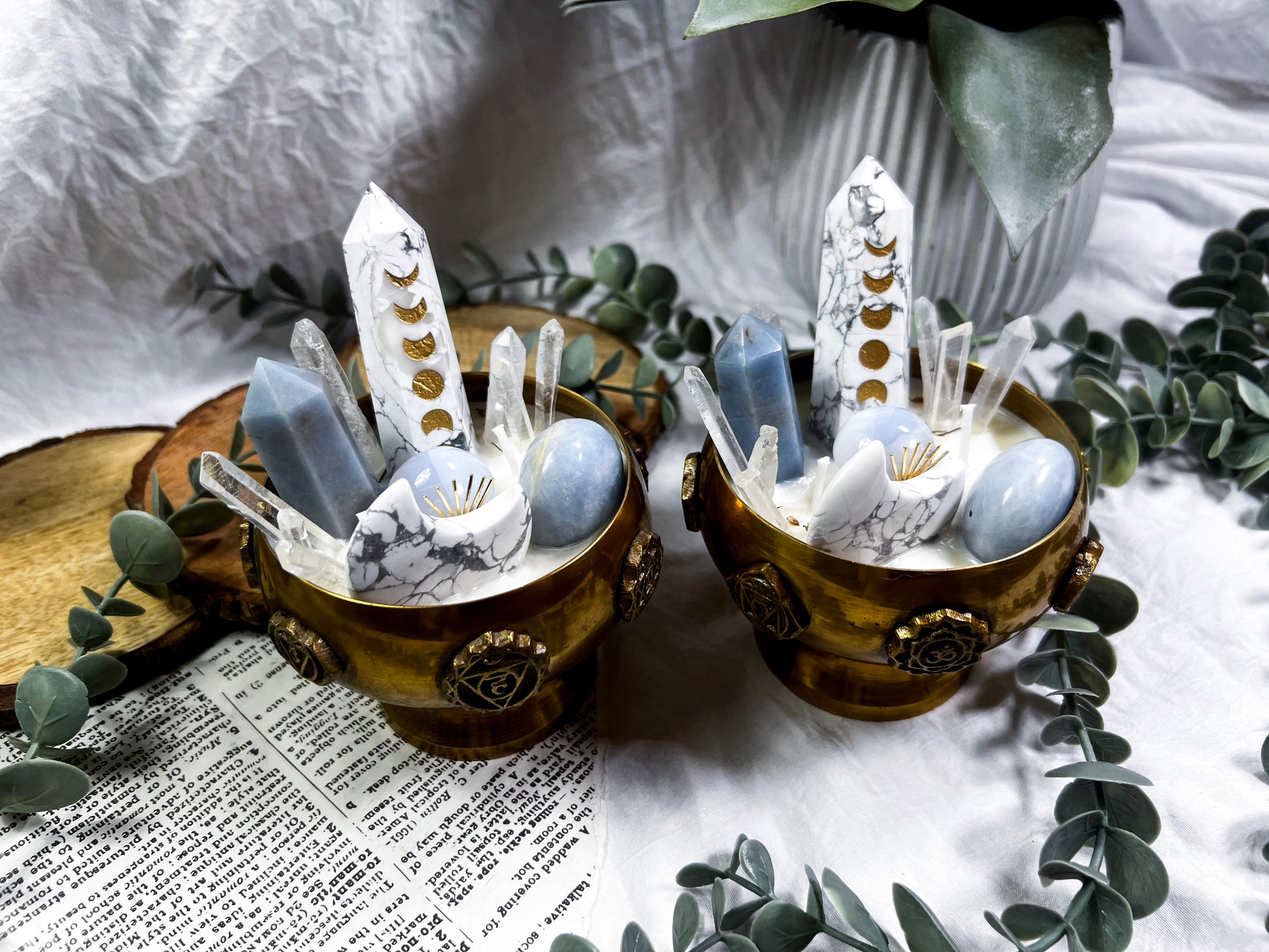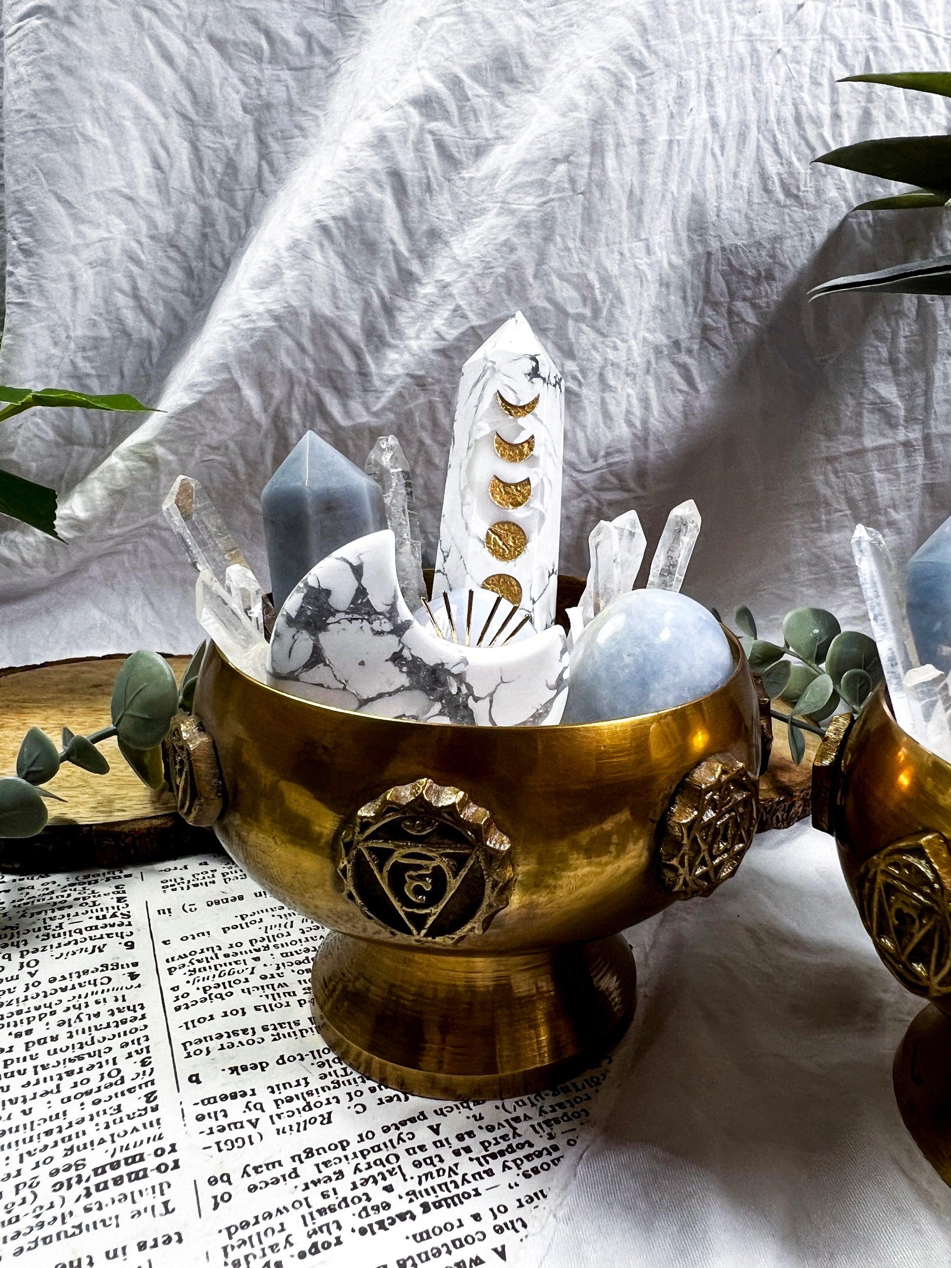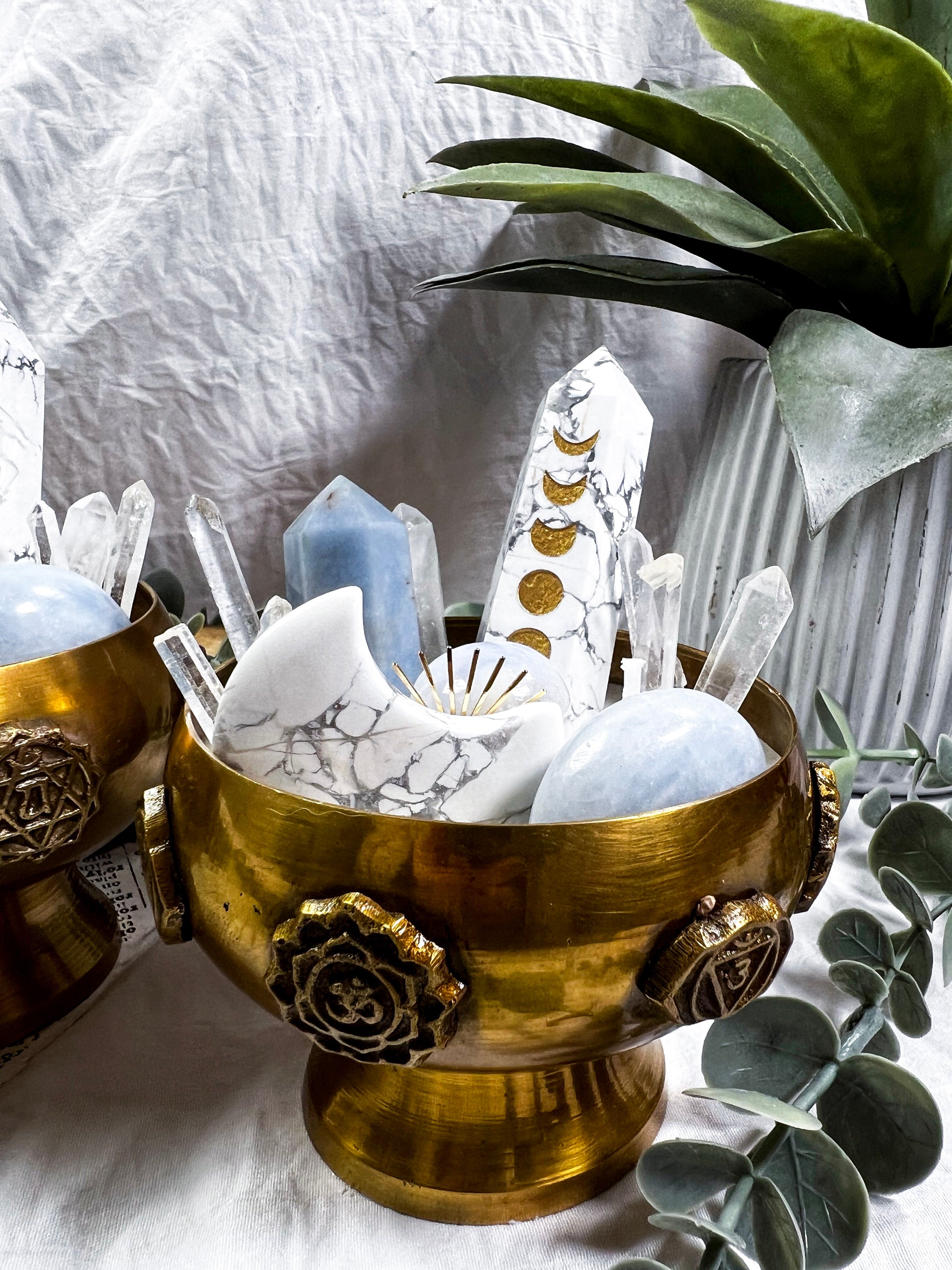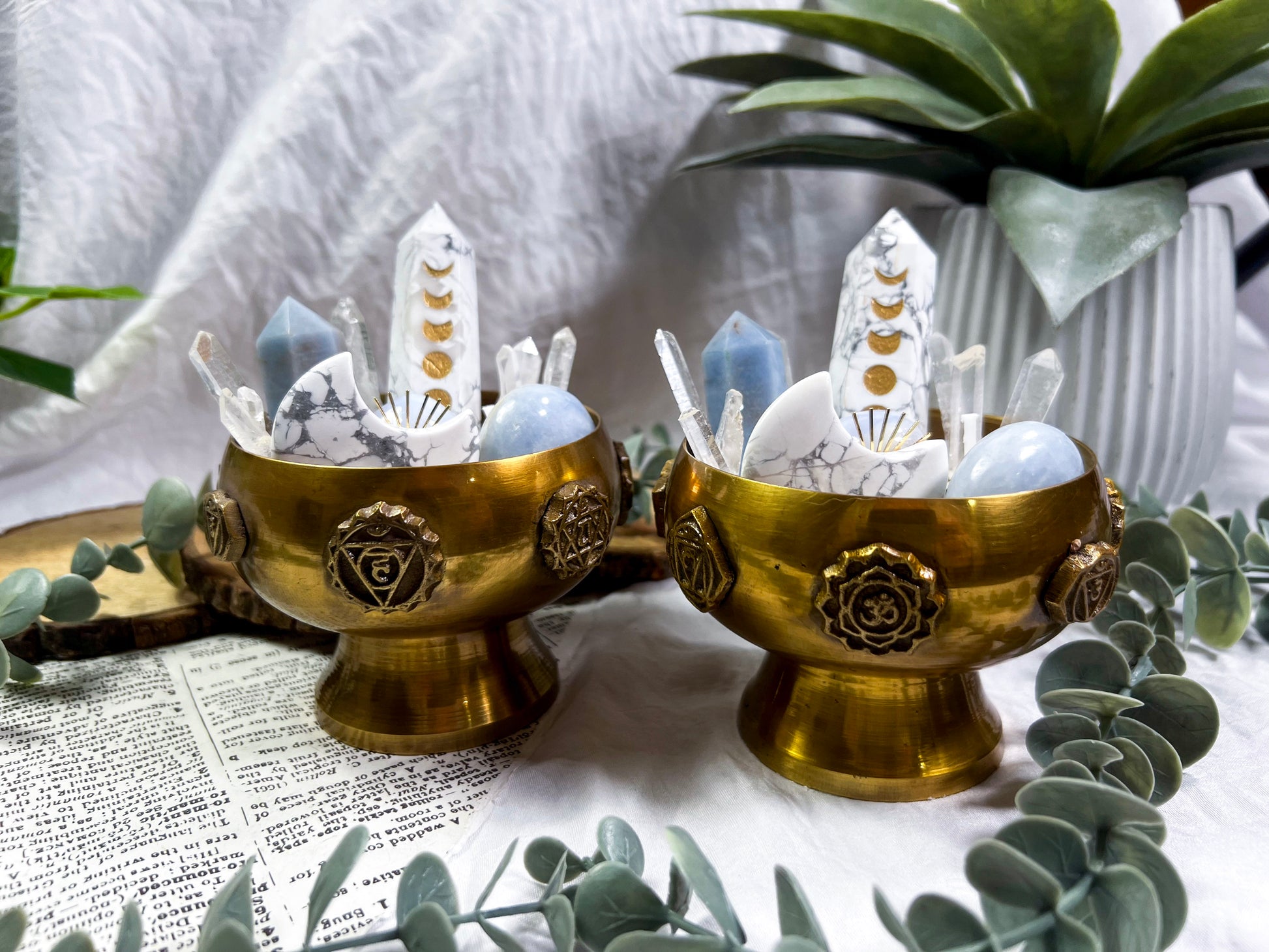 This Brass Chakra Burner Set is a beautifully balanced ritual piece designed for meditation, energetic alignment, and intuitive clarity. Each brass burner features a chakra symbol and comes filled with a curated crystal set: a howlite tower etched with moon phases, a howlite moon for emotional peace, an angel tower for spiritual support, and clear quartz points for amplification. The burner can be used for incense, charcoal, smoke cleansing, or as a crystal display dish once your ritual is complete. This set is ideal for grounding, breathwork, chakra balancing, or creating a calm sacred space that helps your mind and energy settle.