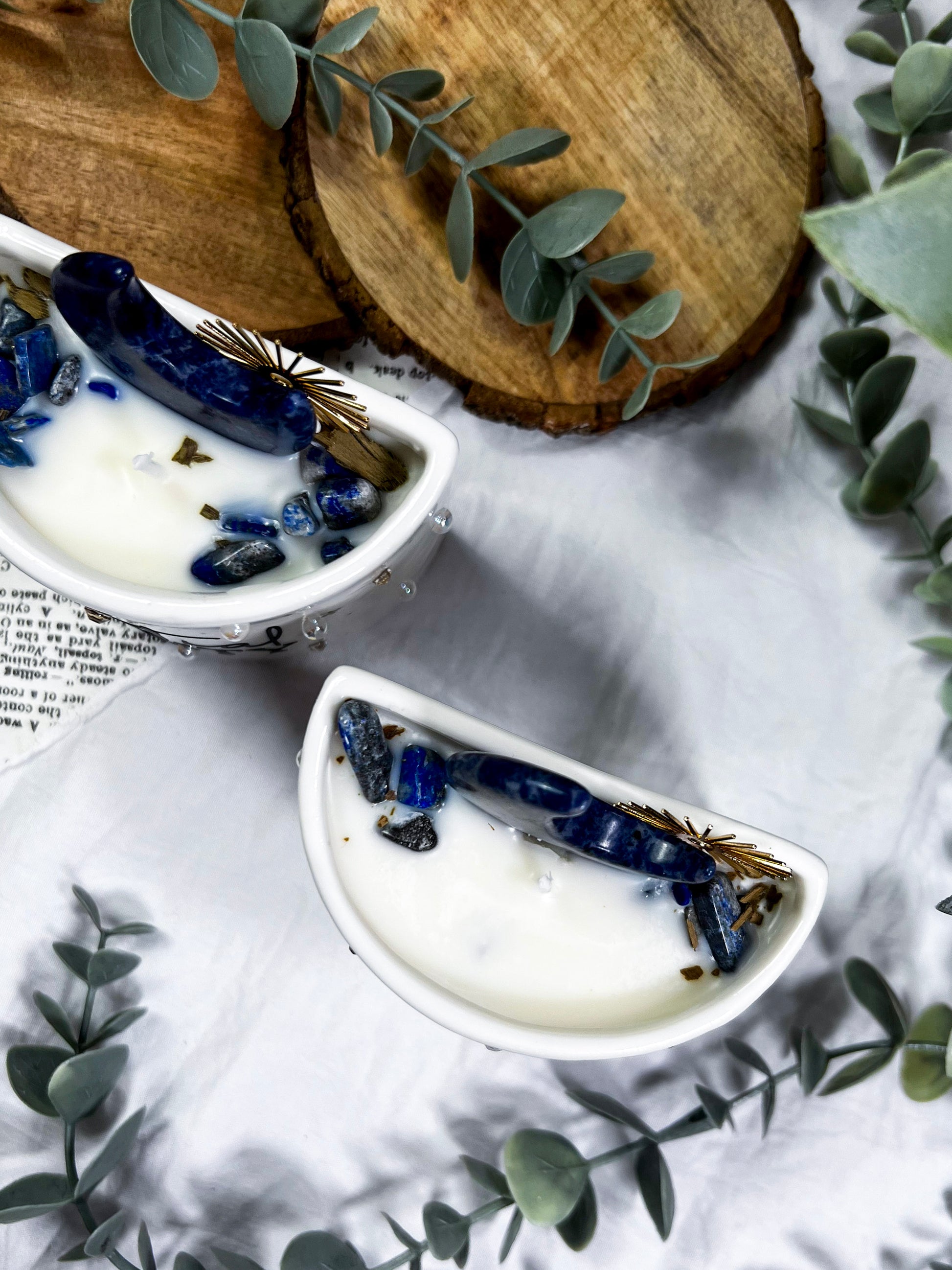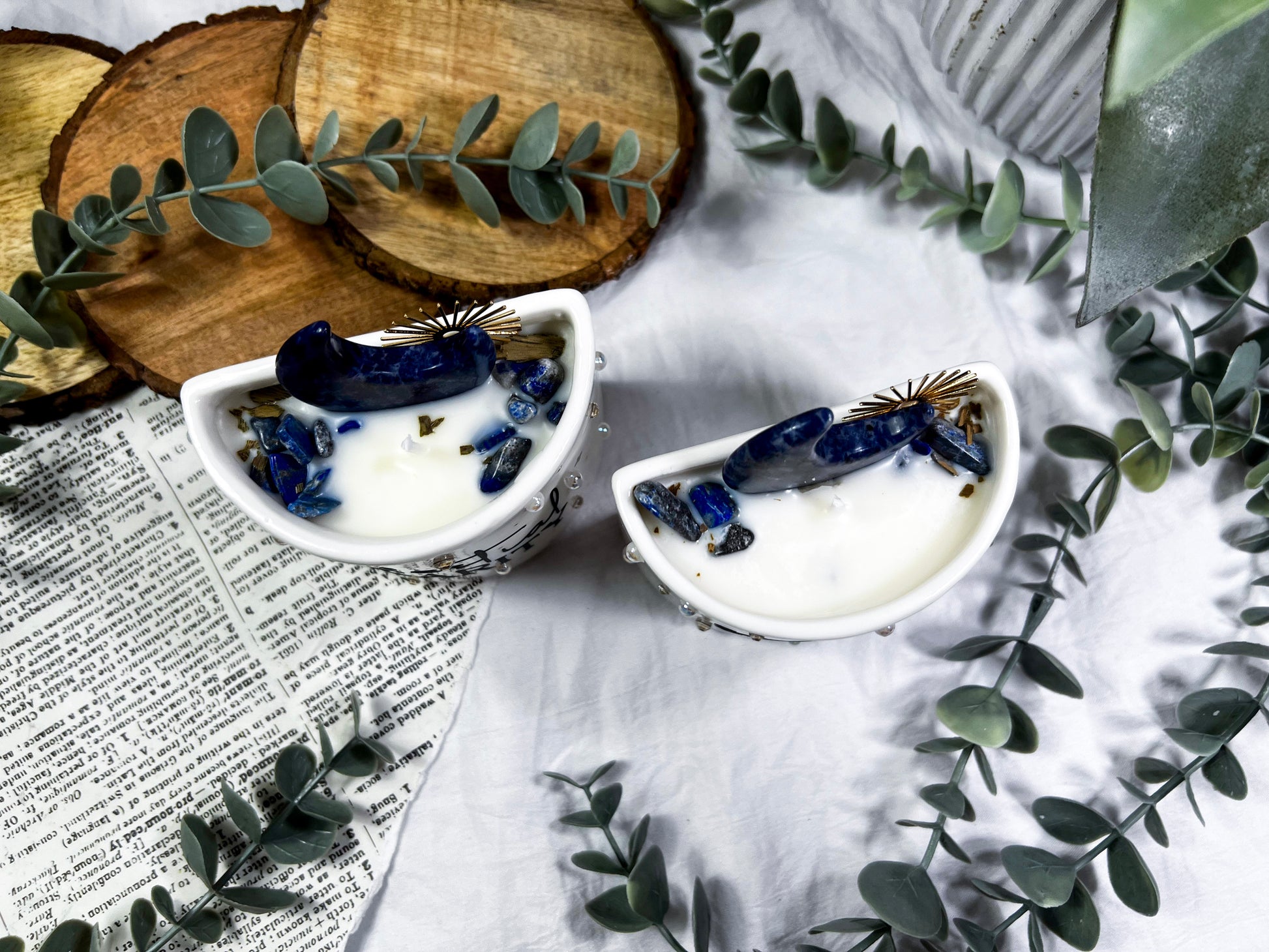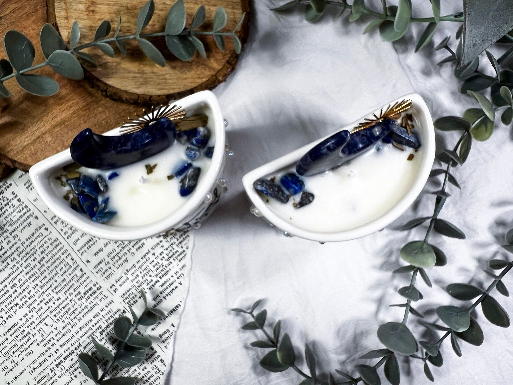The Celestial Clarity Candle is crafted for quiet focus, intuitive thinking, and calm mental alignment. Decorated with pearls, rhinestones, and tiny gold stars, it brings soft celestial energy into any workspace or altar. Scented with sea minerals and beachwood, the candle feels clean, refreshing, and mentally clearing. Each candle includes either a lapis or sodalite moon on top, with matching lapis chips for clarity, insight, and organized thoughts. Light it when you want your mind to settle, your intuition to sharpen, and your energy to feel balanced and productive.