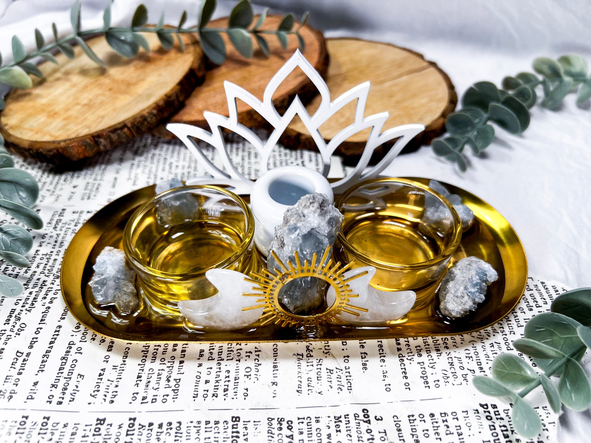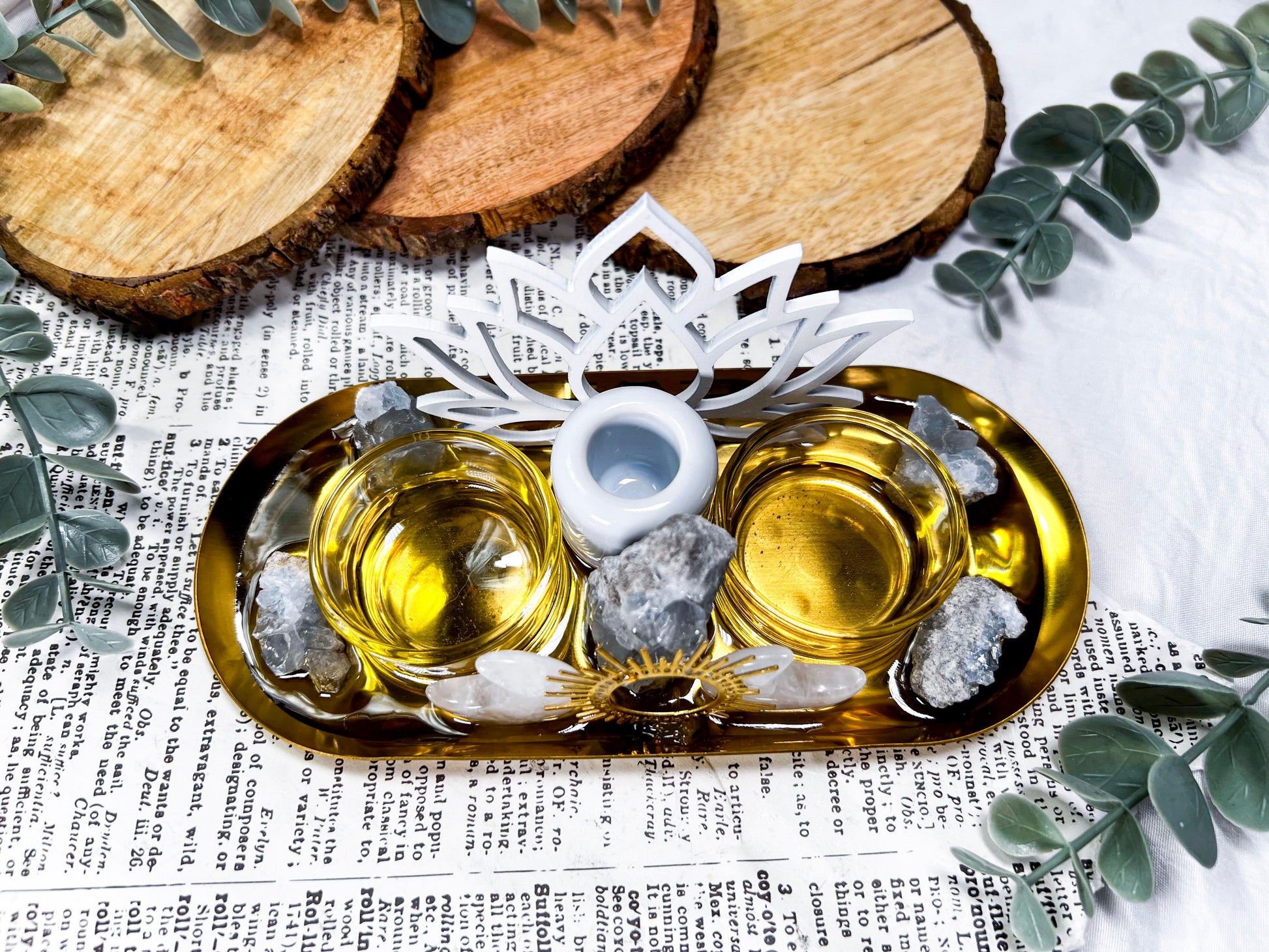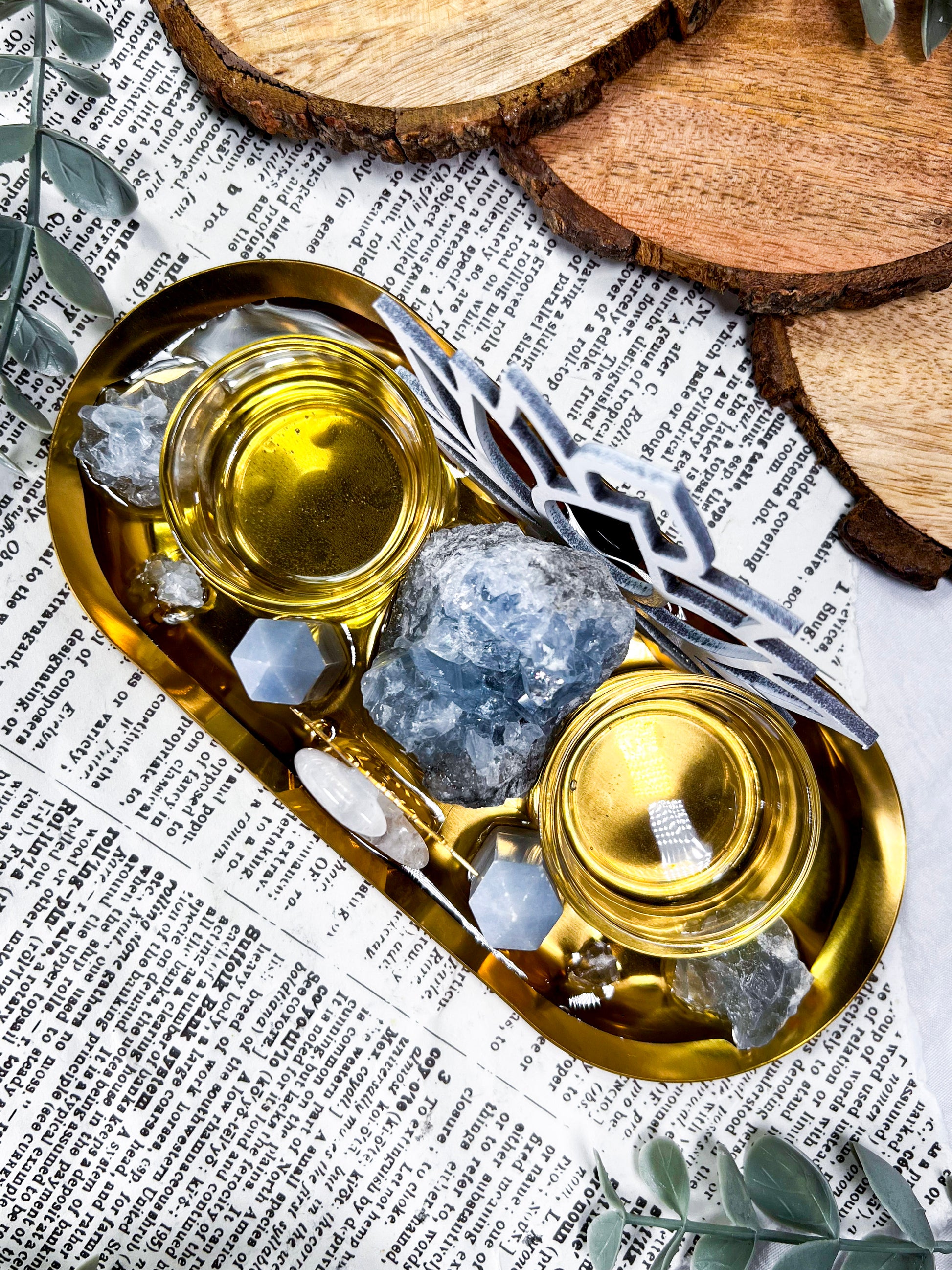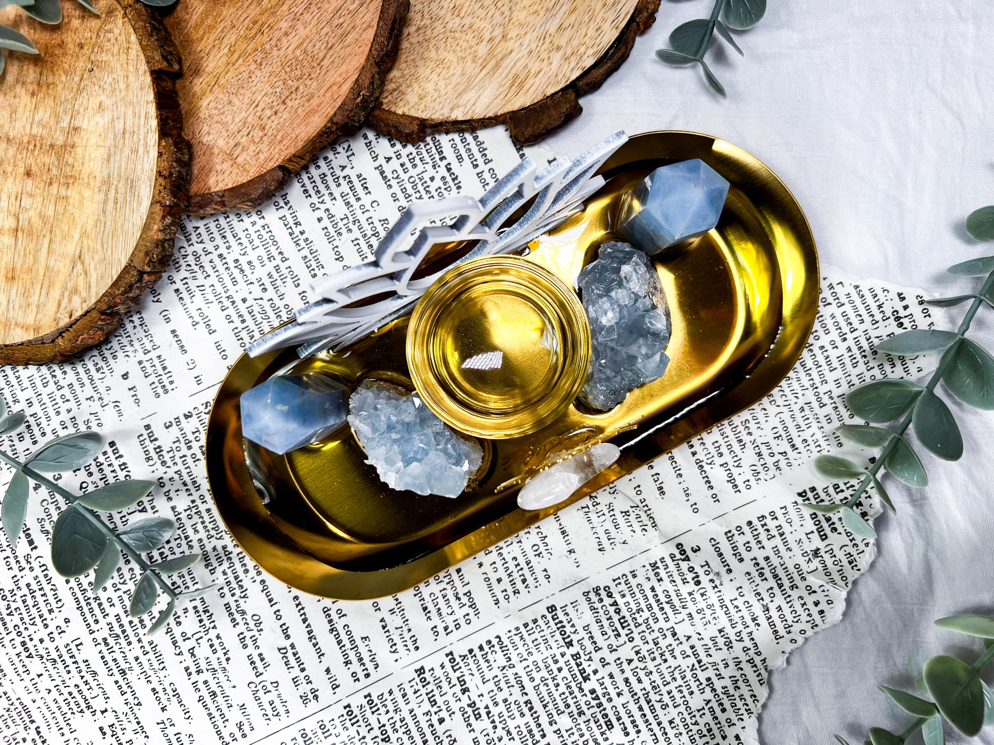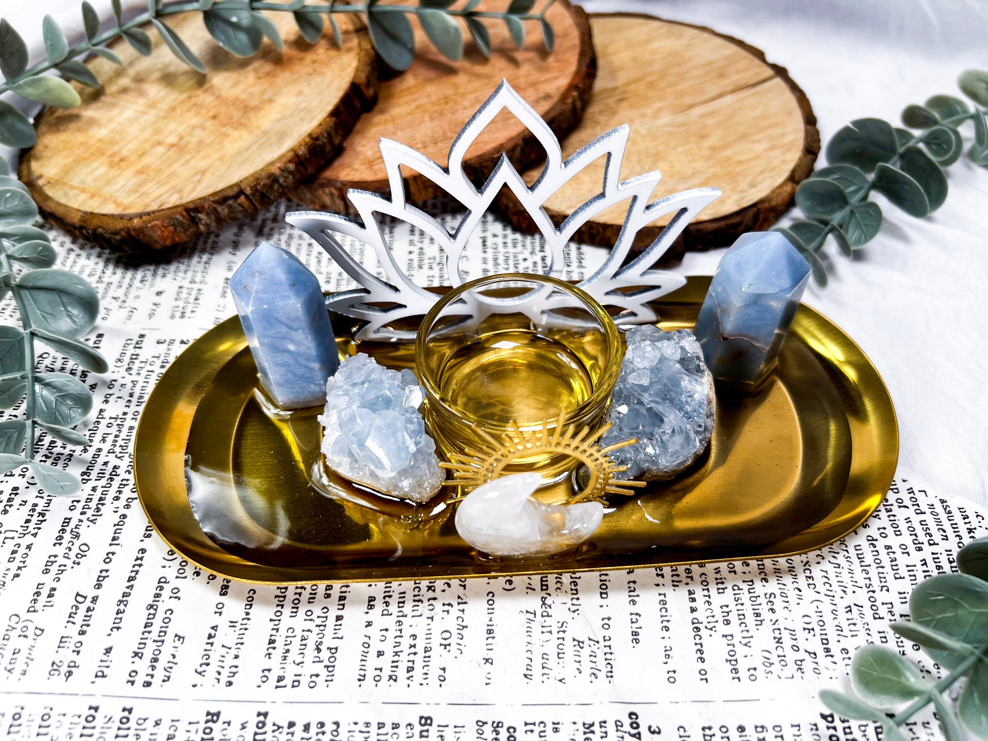 A soft and radiant setup for connection, clarity, and peace. Each Celestite and Angelite Altar is hand-curated on a gold metal tray with a white lotus background and a matching gold incense holder. The combination of celestite, angelite, and clear quartz carries calm communication, divine connection, and purification energy.