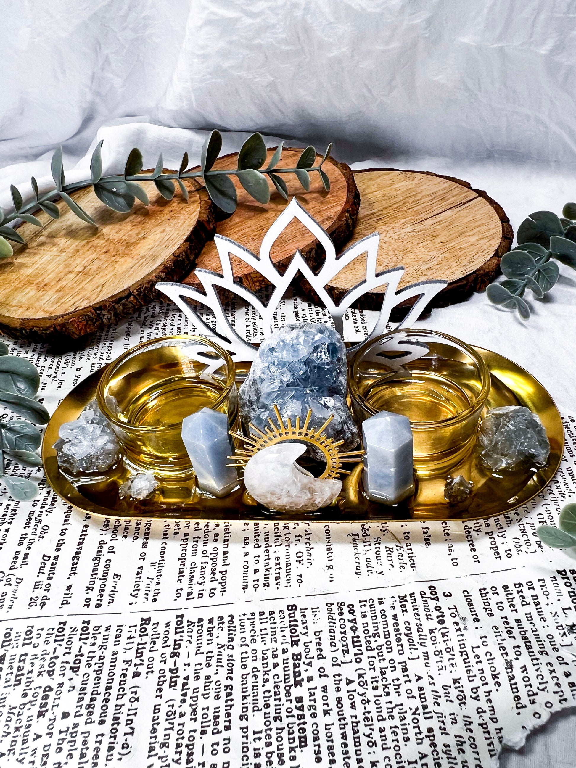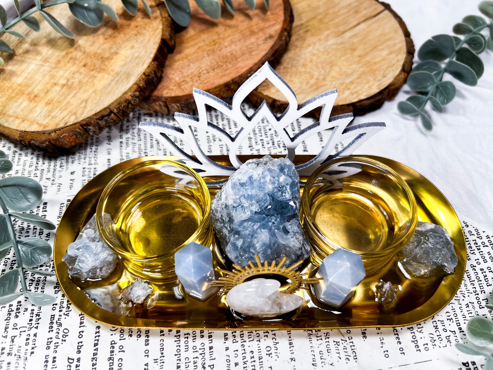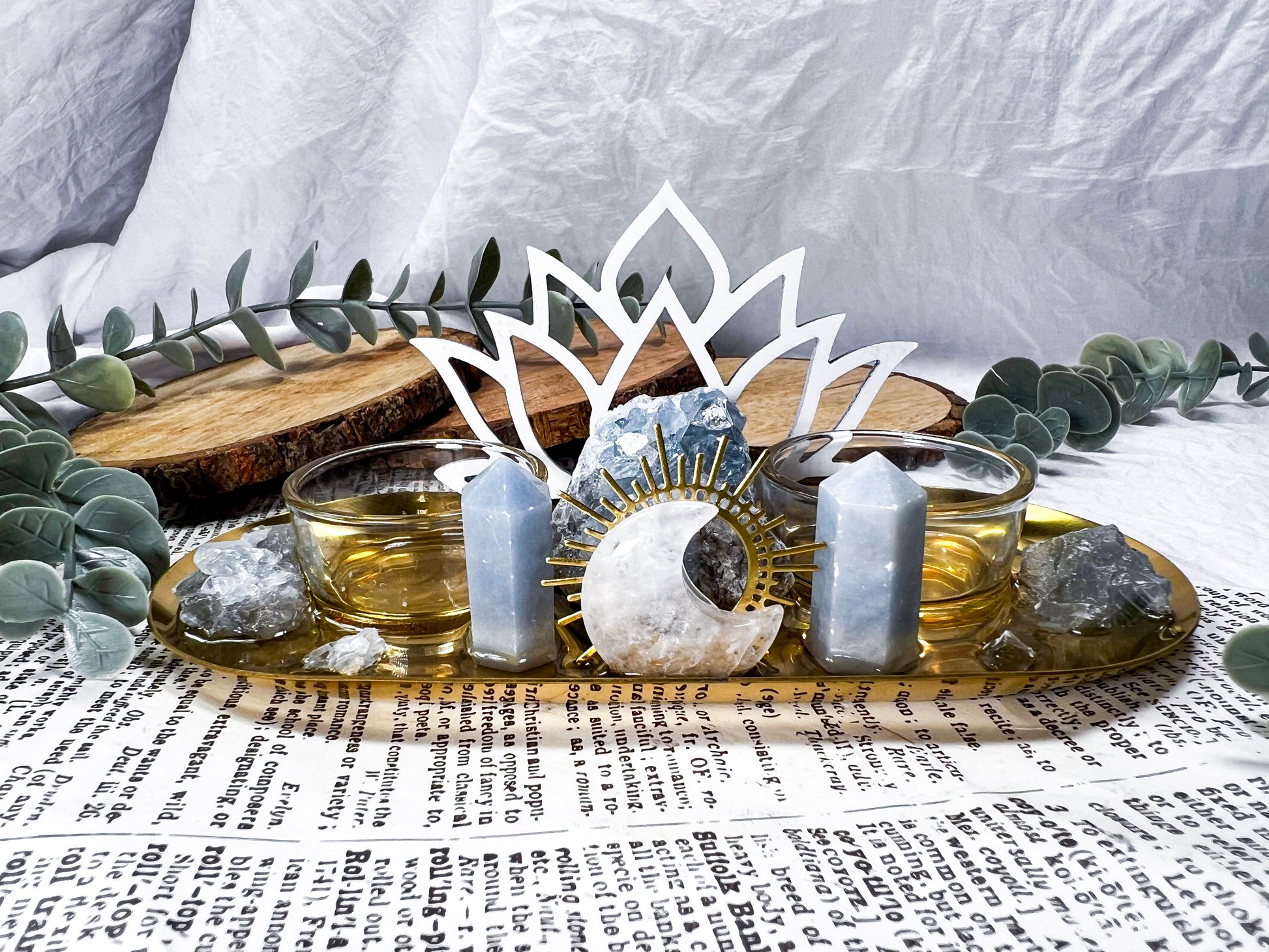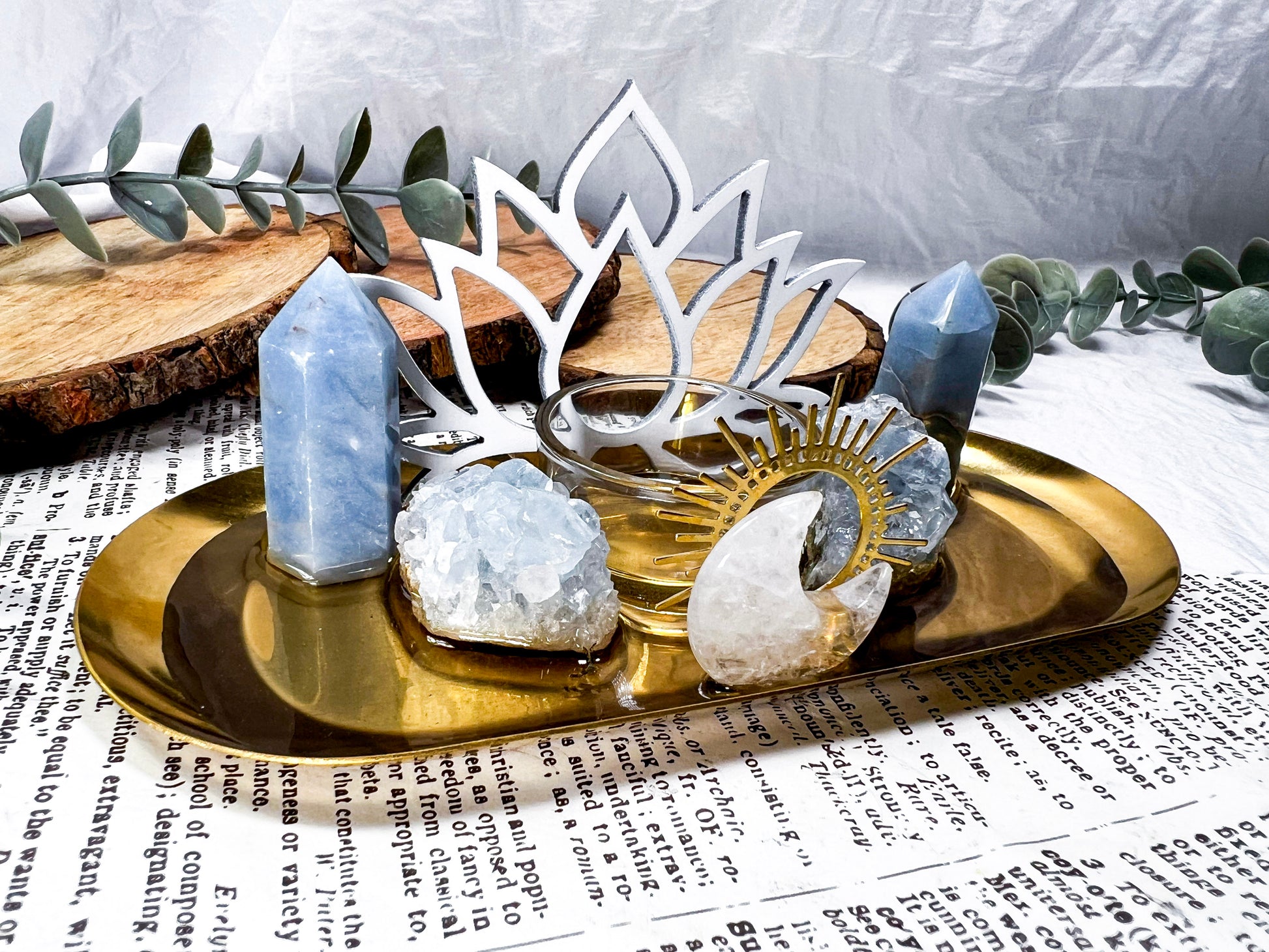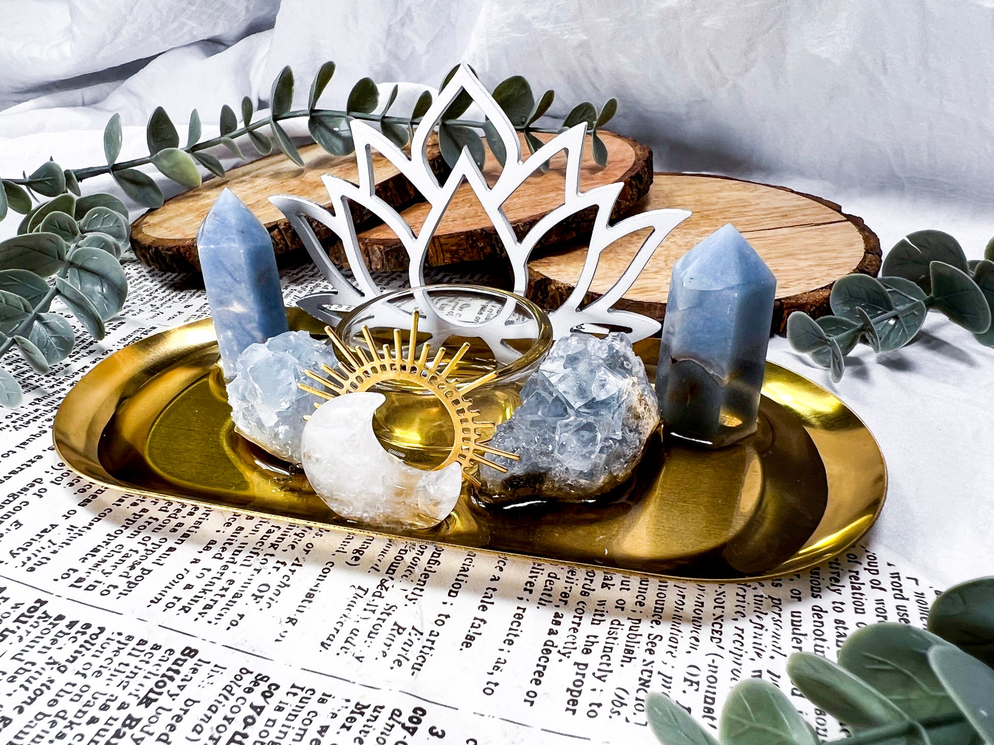 celestite · angelite · mini altar · crystal altar · celestial decor · meditation altar · witchy home decor · gold lotus tray · clear quartz · sun charm · peace and clarity · handmade altar set · spiritual home decor