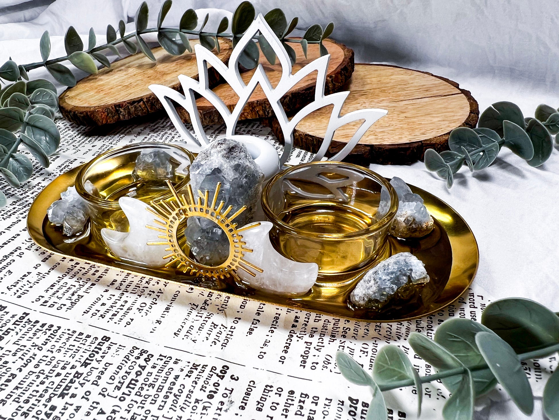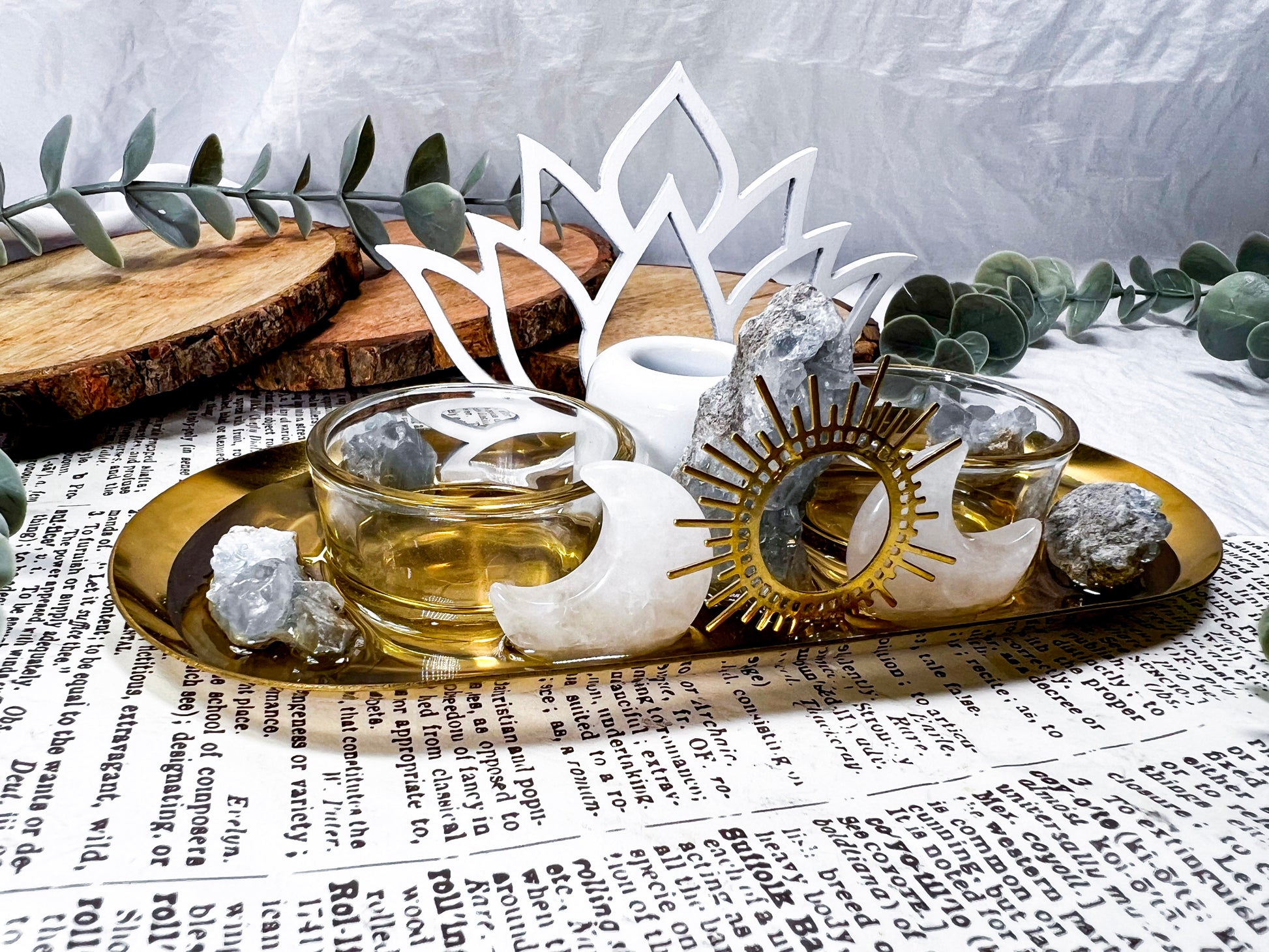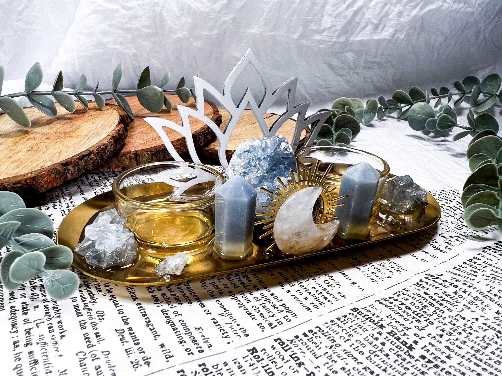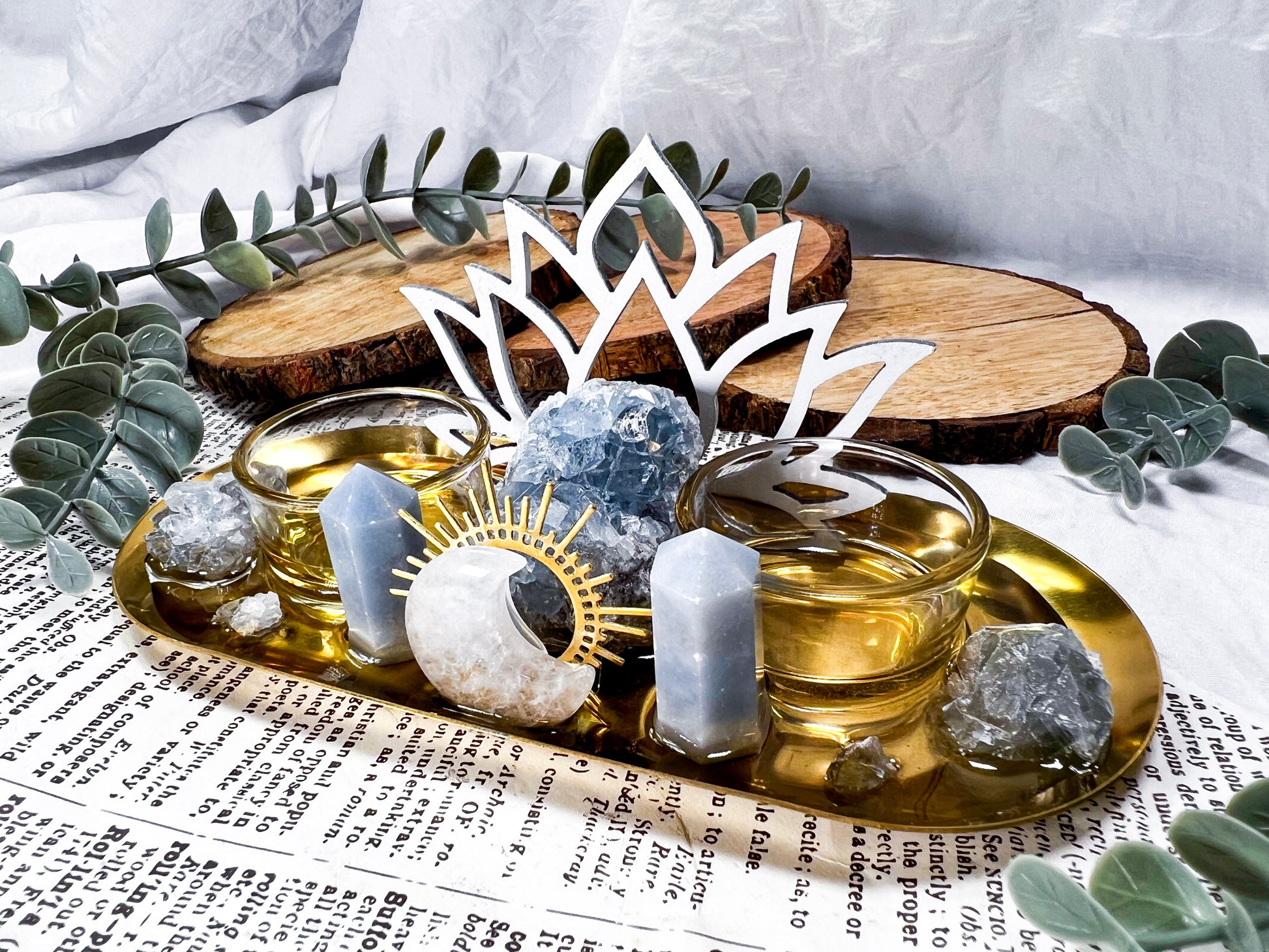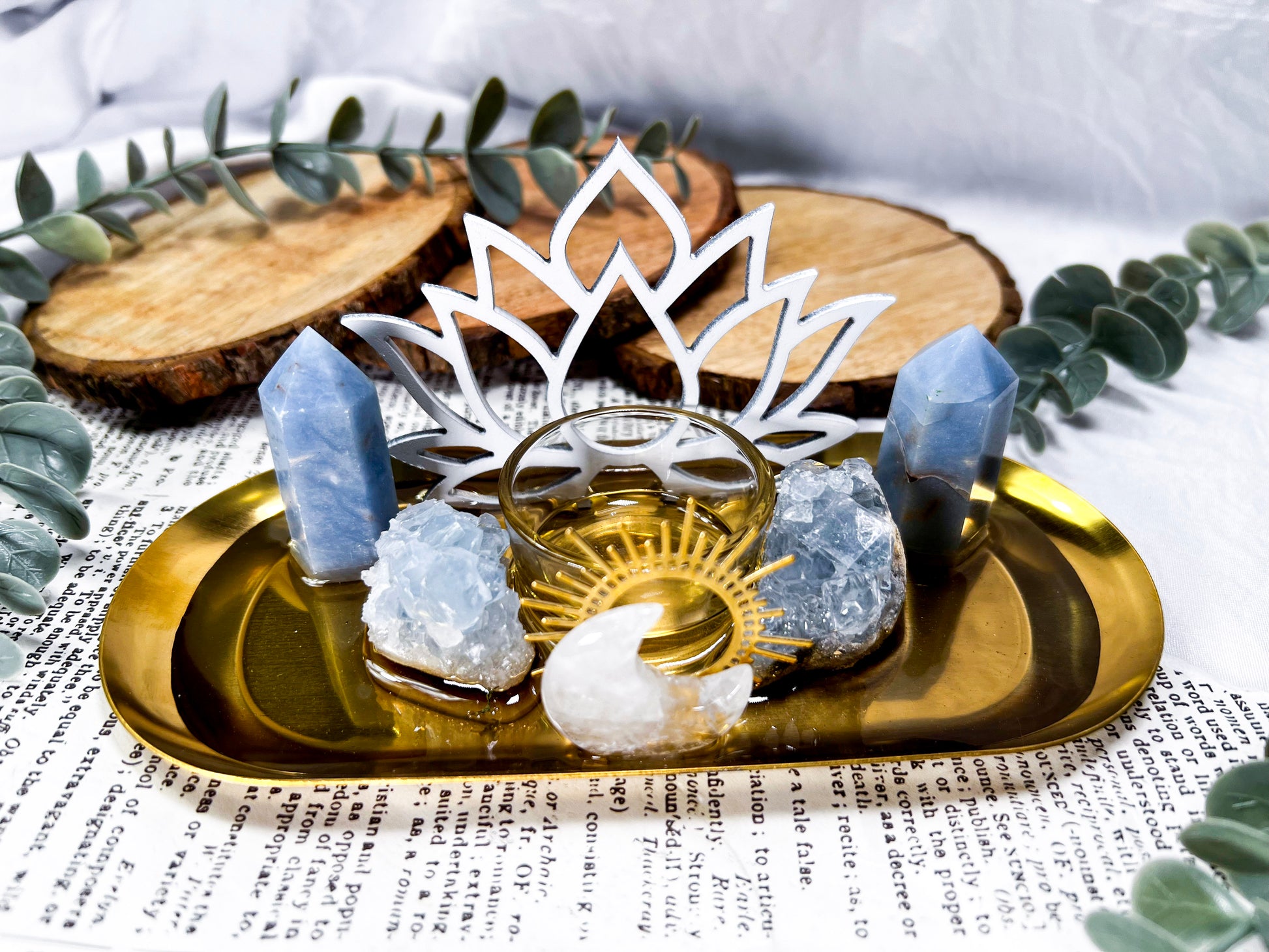 celestite · angelite · mini altar · crystal altar · celestial decor · meditation altar · witchy home decor · gold lotus tray · clear quartz · sun charm · peace and clarity · handmade altar set · spiritual home decor