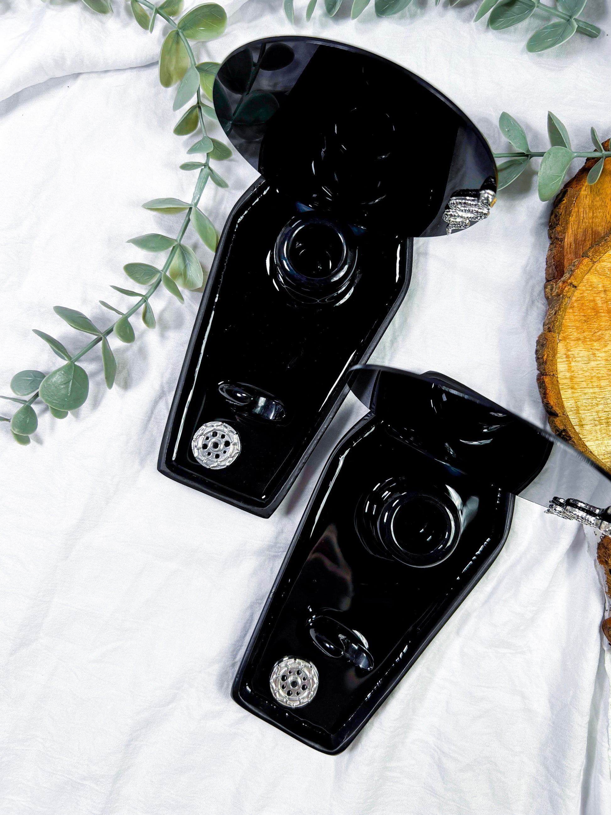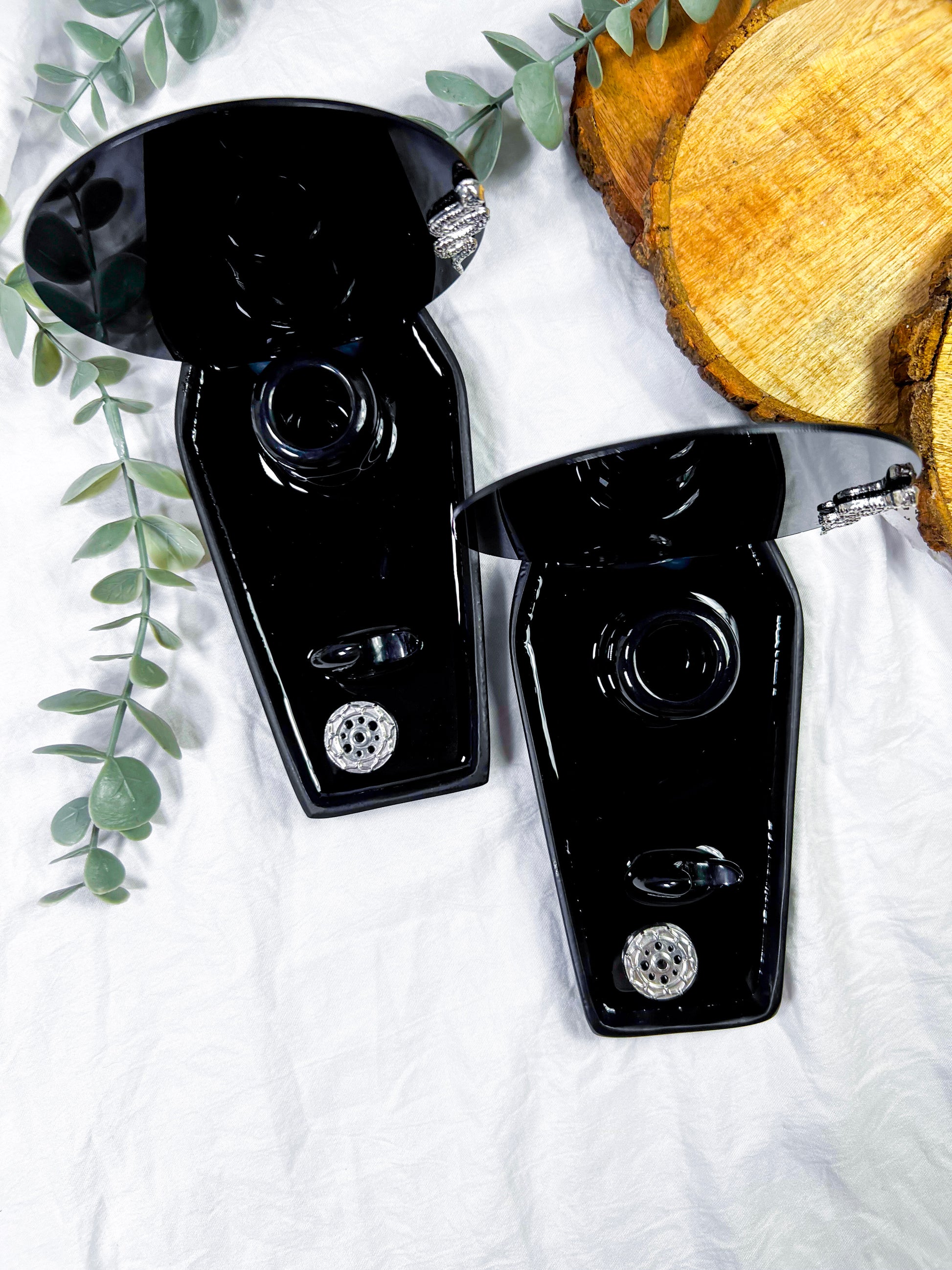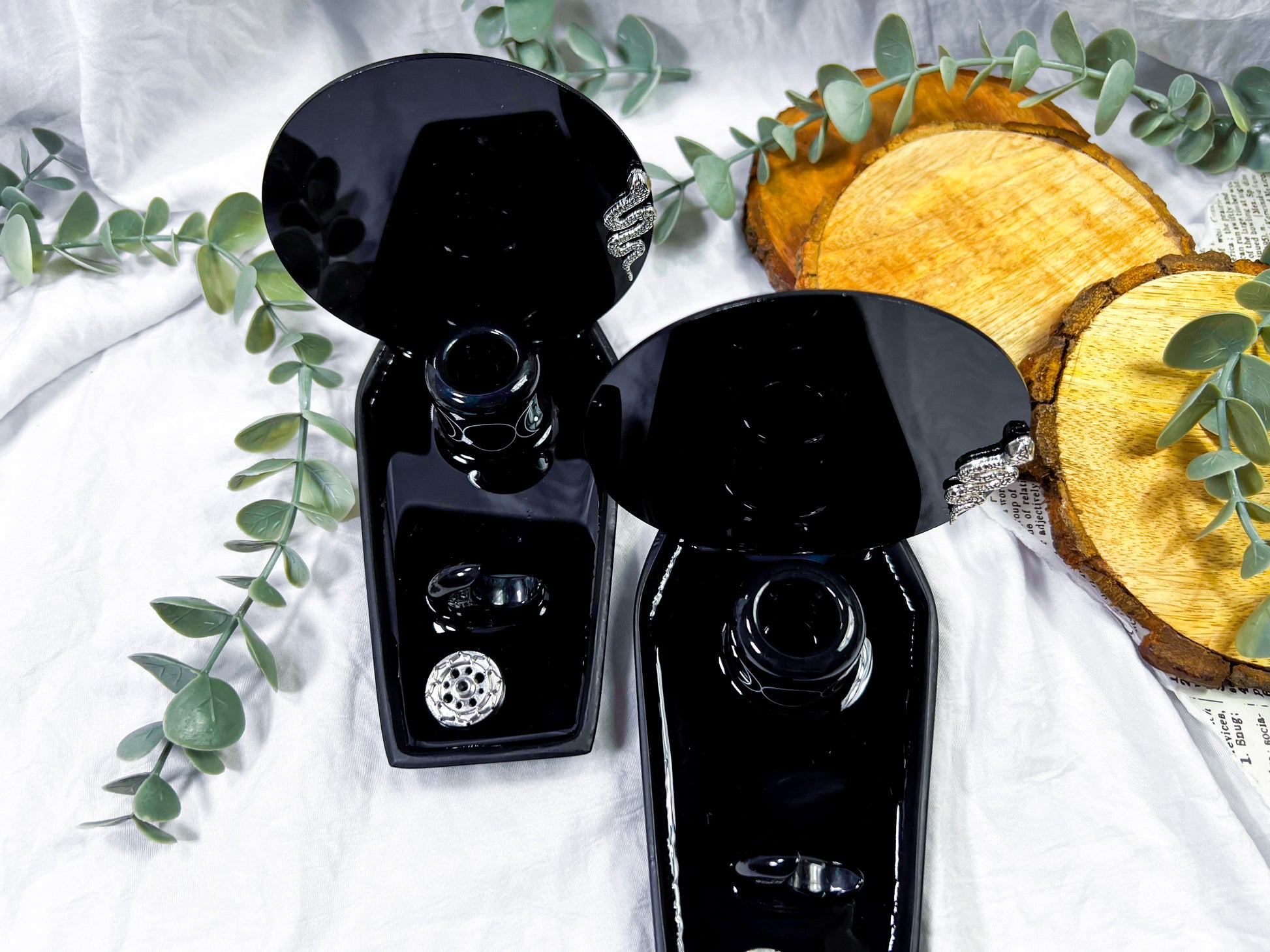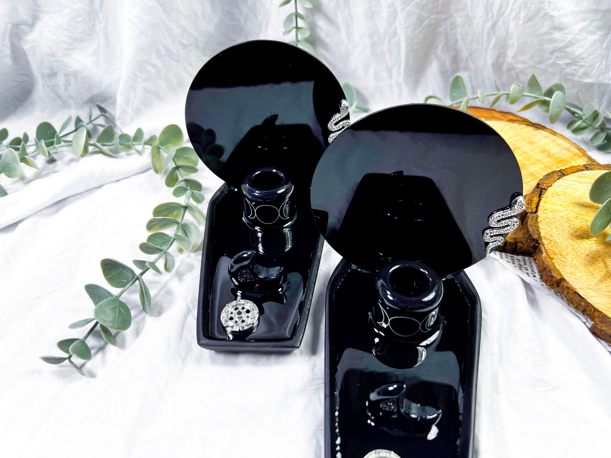 coffin altar tray, gothic witch altar, black onyx moon decor, smoky quartz altar kit, witchcraft coffin centerpiece, shadow work scrying tool, occult altar supplies, gothic witch home decor, magical coffin ritual tray, samhain witch altar