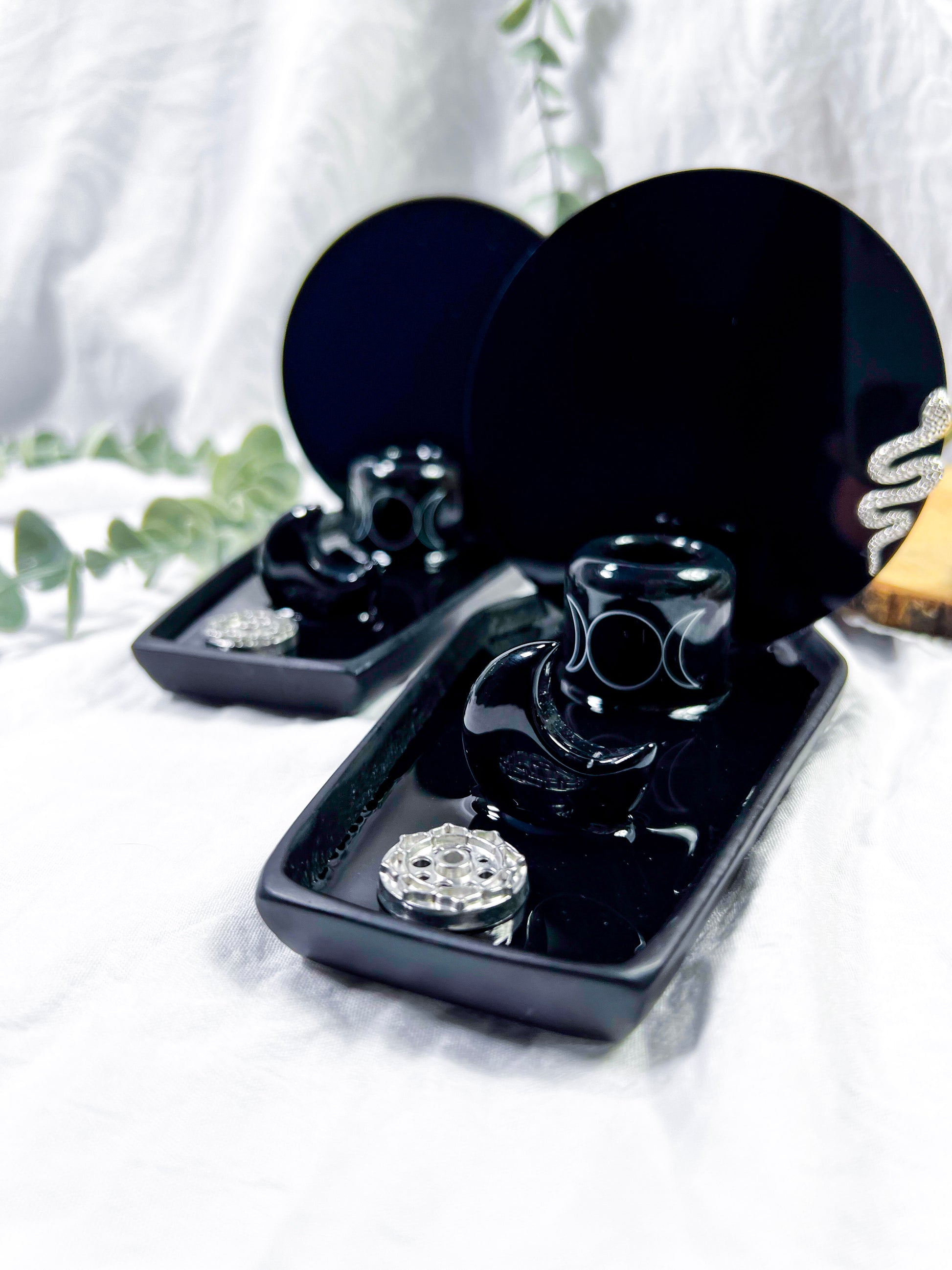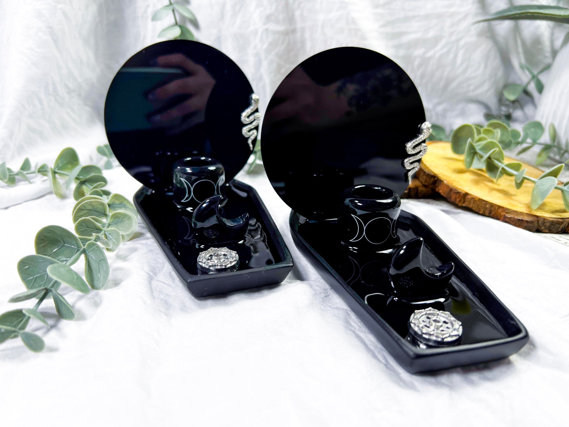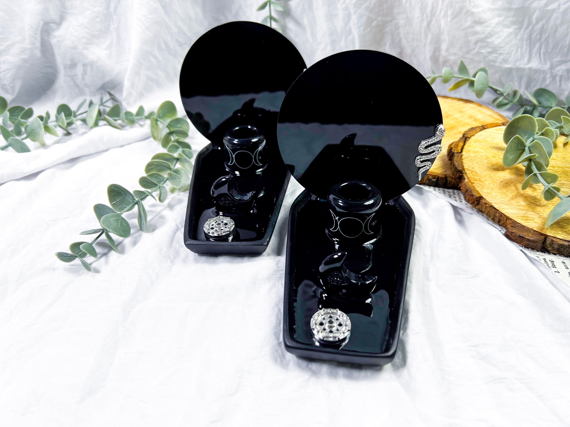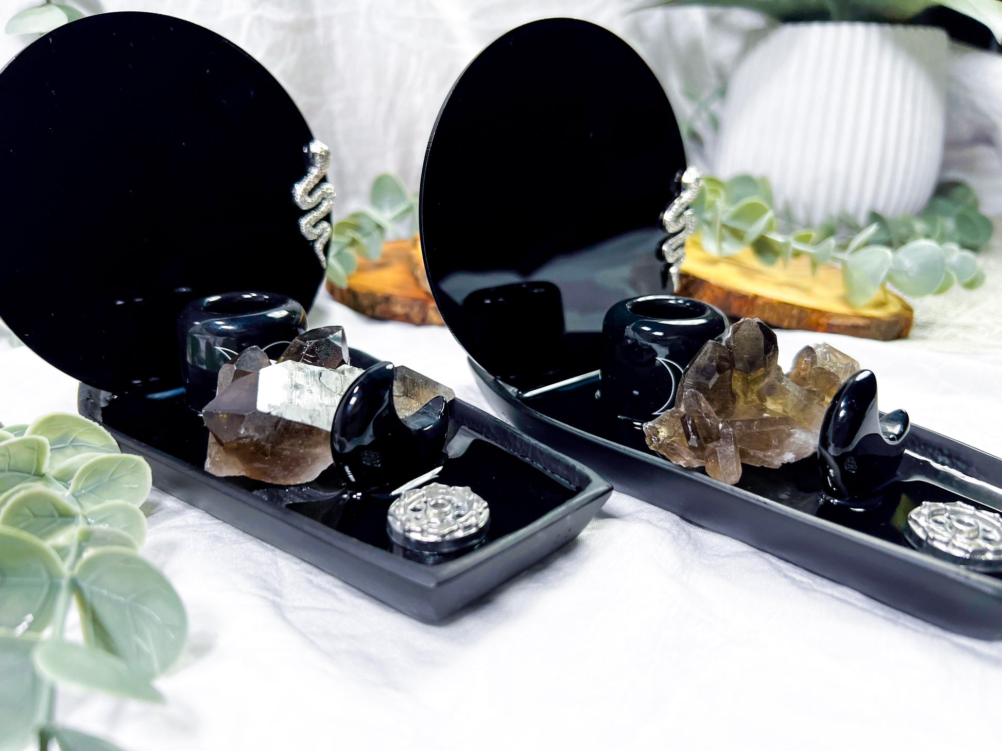 The tray includes a black onyx moon for grounding and protection, a silver incense holder for smoke cleansing and offerings, and a detachable smoky quartz cluster that can be placed inside the tray or moved as needed. A triple moon chime candle holder allows you to work with lunar cycles and small ritual fires, while a round black scrying mirror gives a direct tool for divination and shadow work. A silver snake charm completes the piece, symbolizing wisdom, cycles, and transformation.