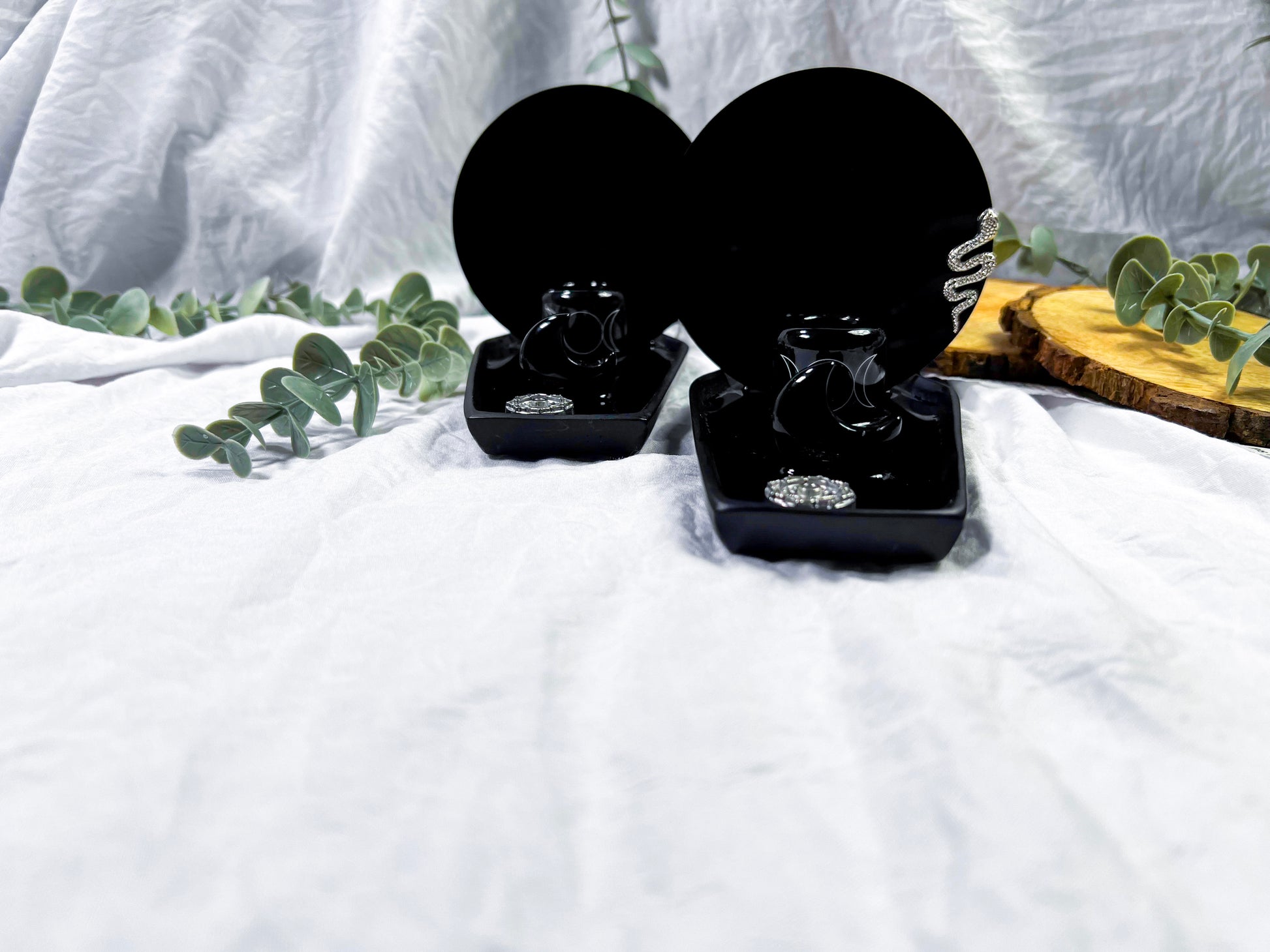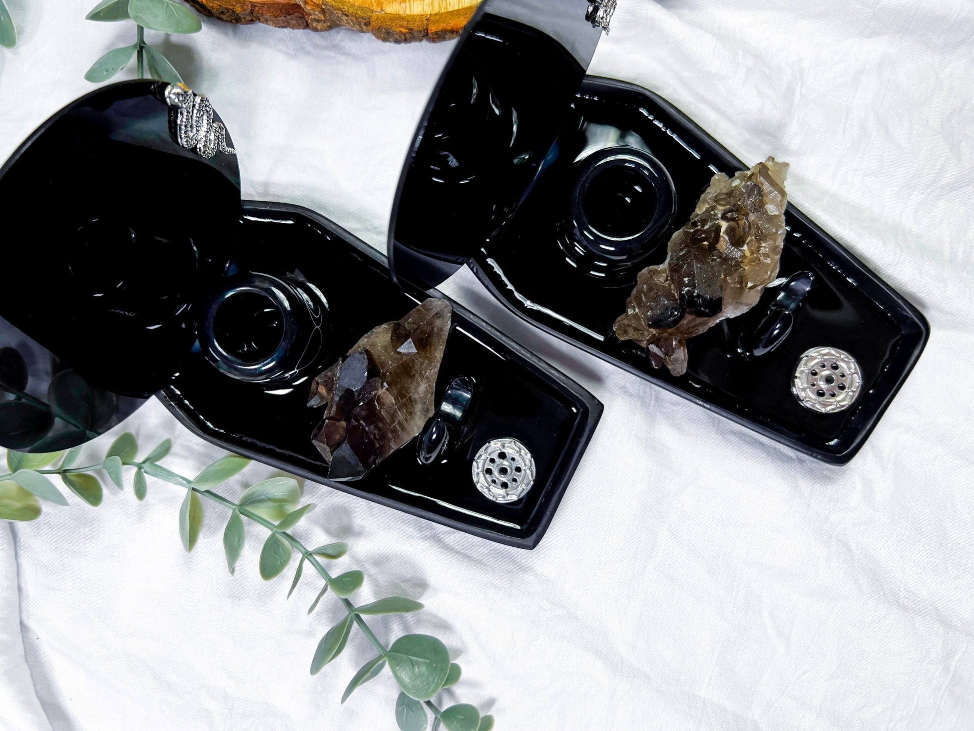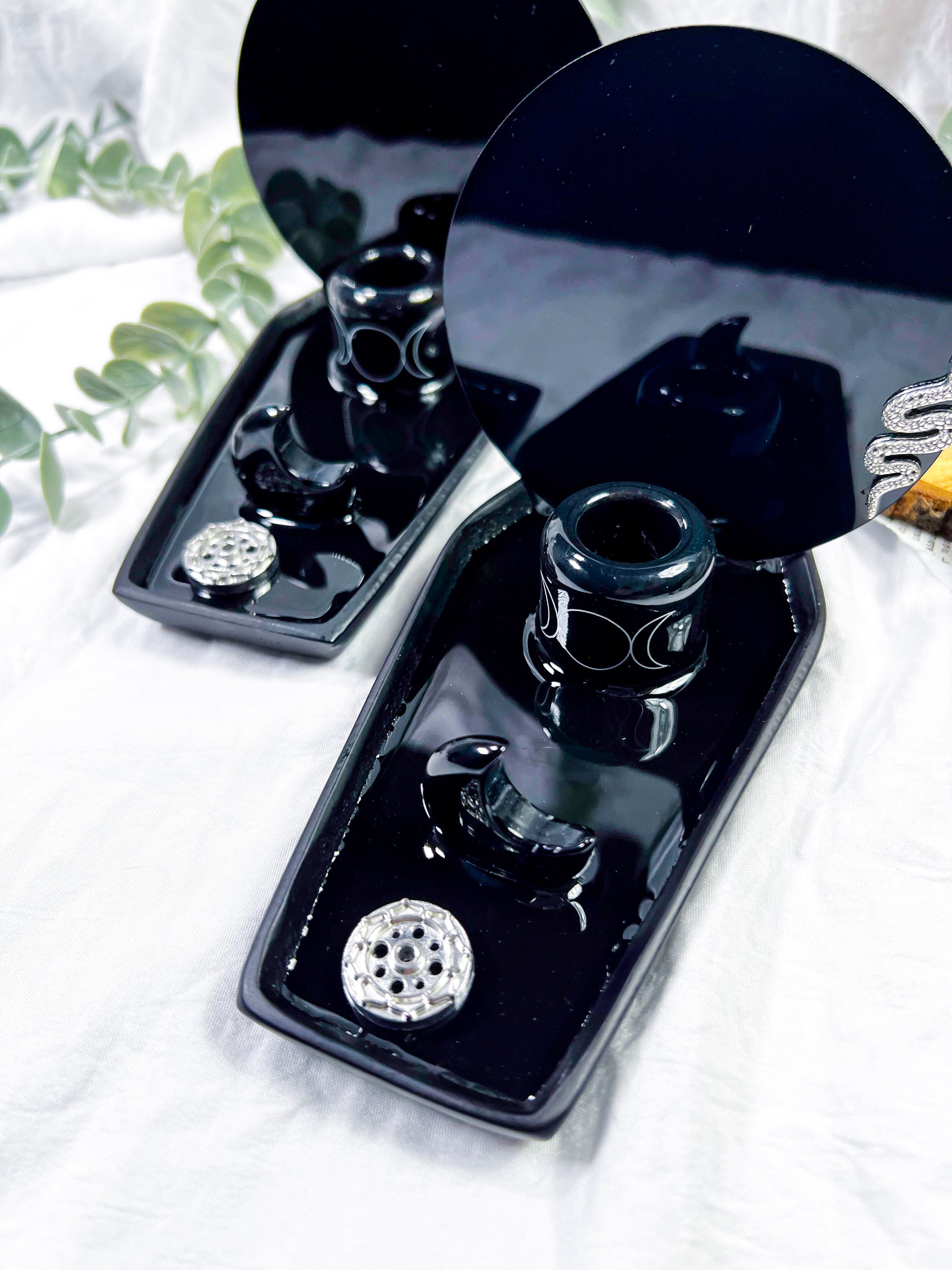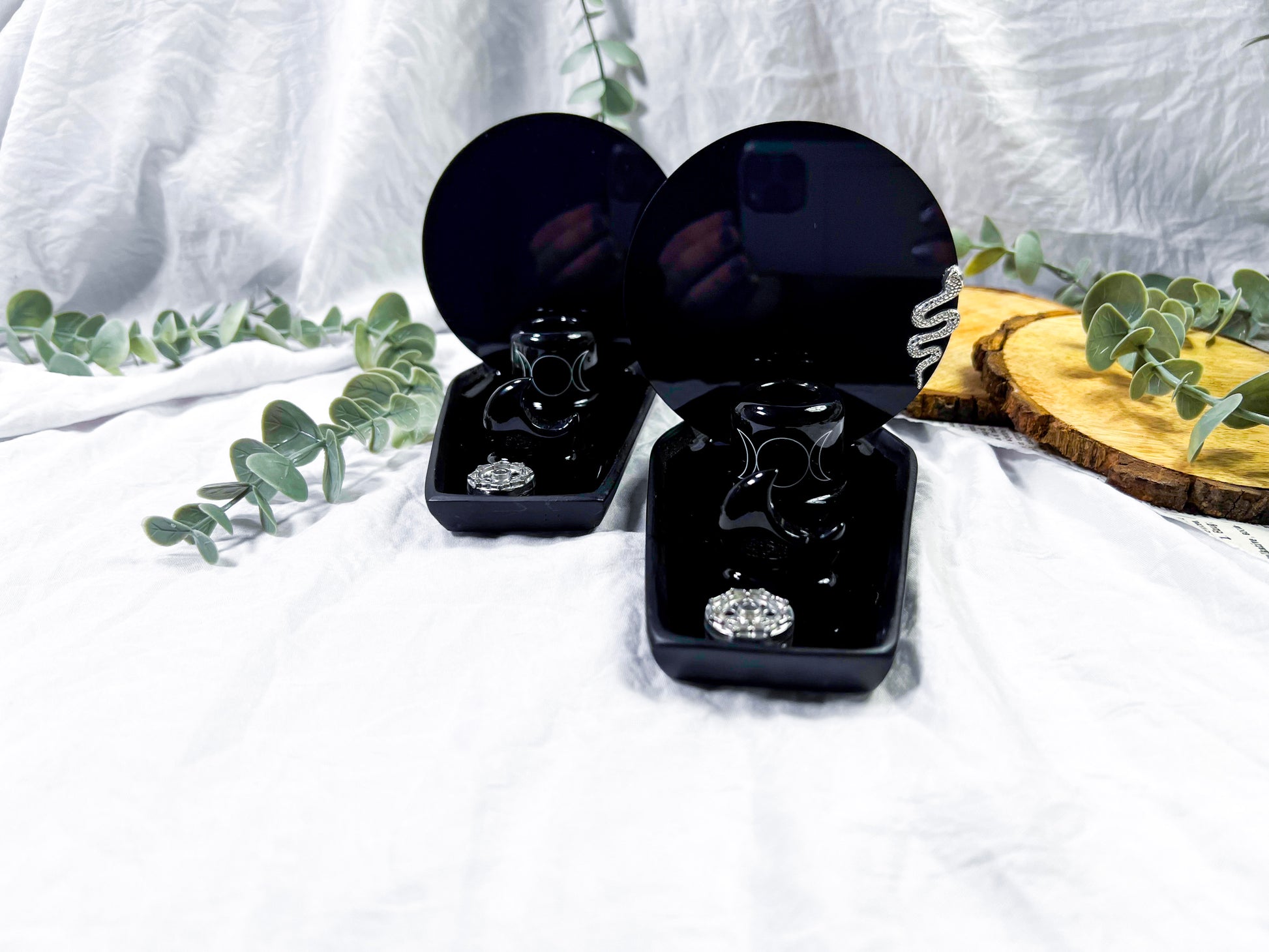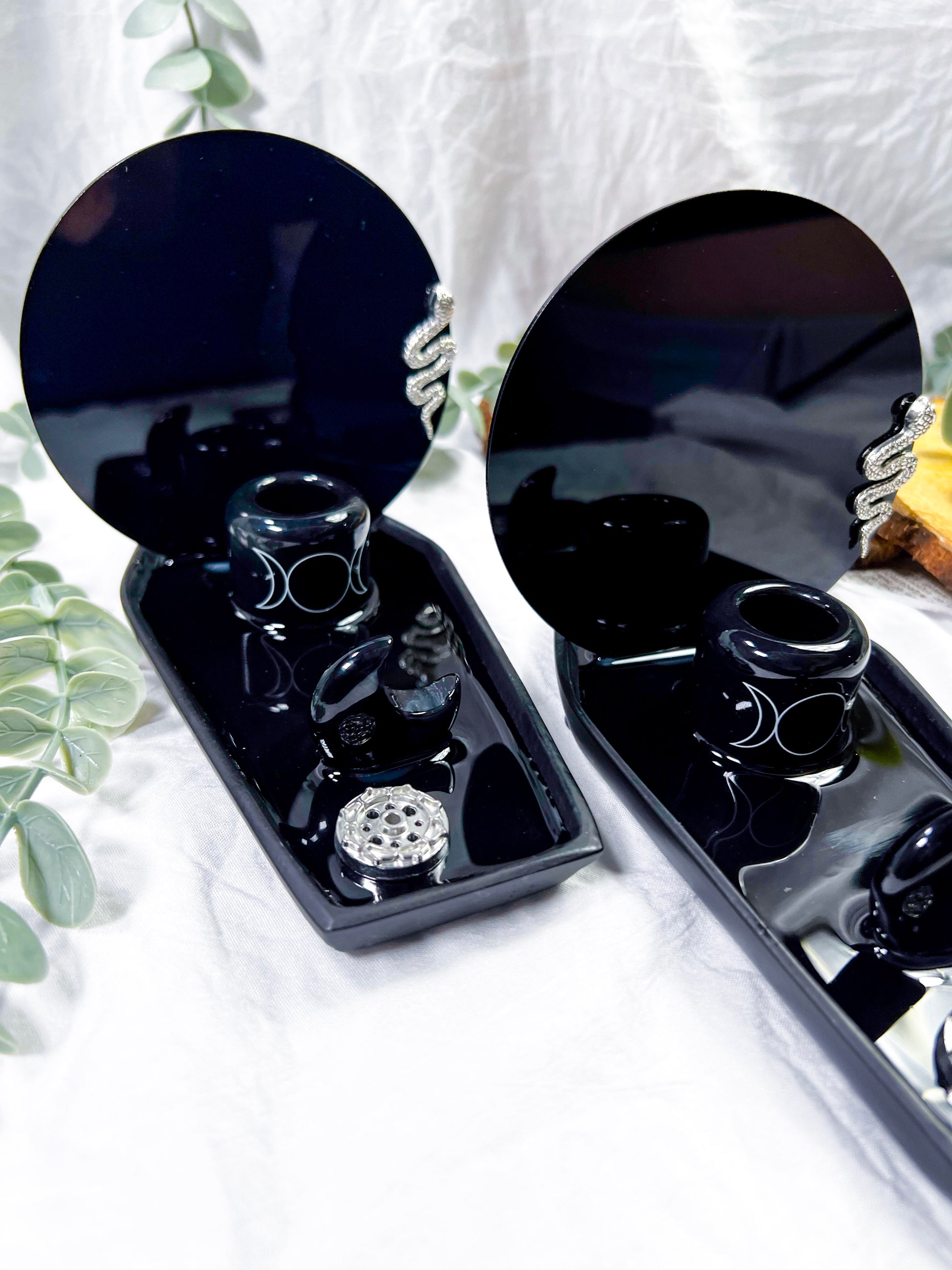 The tray includes a black onyx moon for grounding and protection, a silver incense holder for smoke cleansing and offerings, and a detachable smoky quartz cluster that can be placed inside the tray or moved as needed. A triple moon chime candle holder allows you to work with lunar cycles and small ritual fires, while a round black scrying mirror gives a direct tool for divination and shadow work. A silver snake charm completes the piece, symbolizing wisdom, cycles, and transformation.
