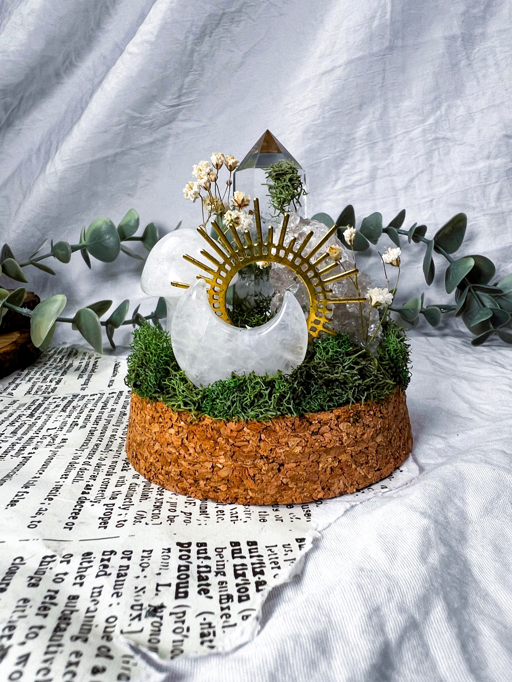 Clear quartz tower | Clear quartz mushroom | Clear quartz moon | Clear quartz cluster | Baby’s breath | Preserved moss | Gold sun