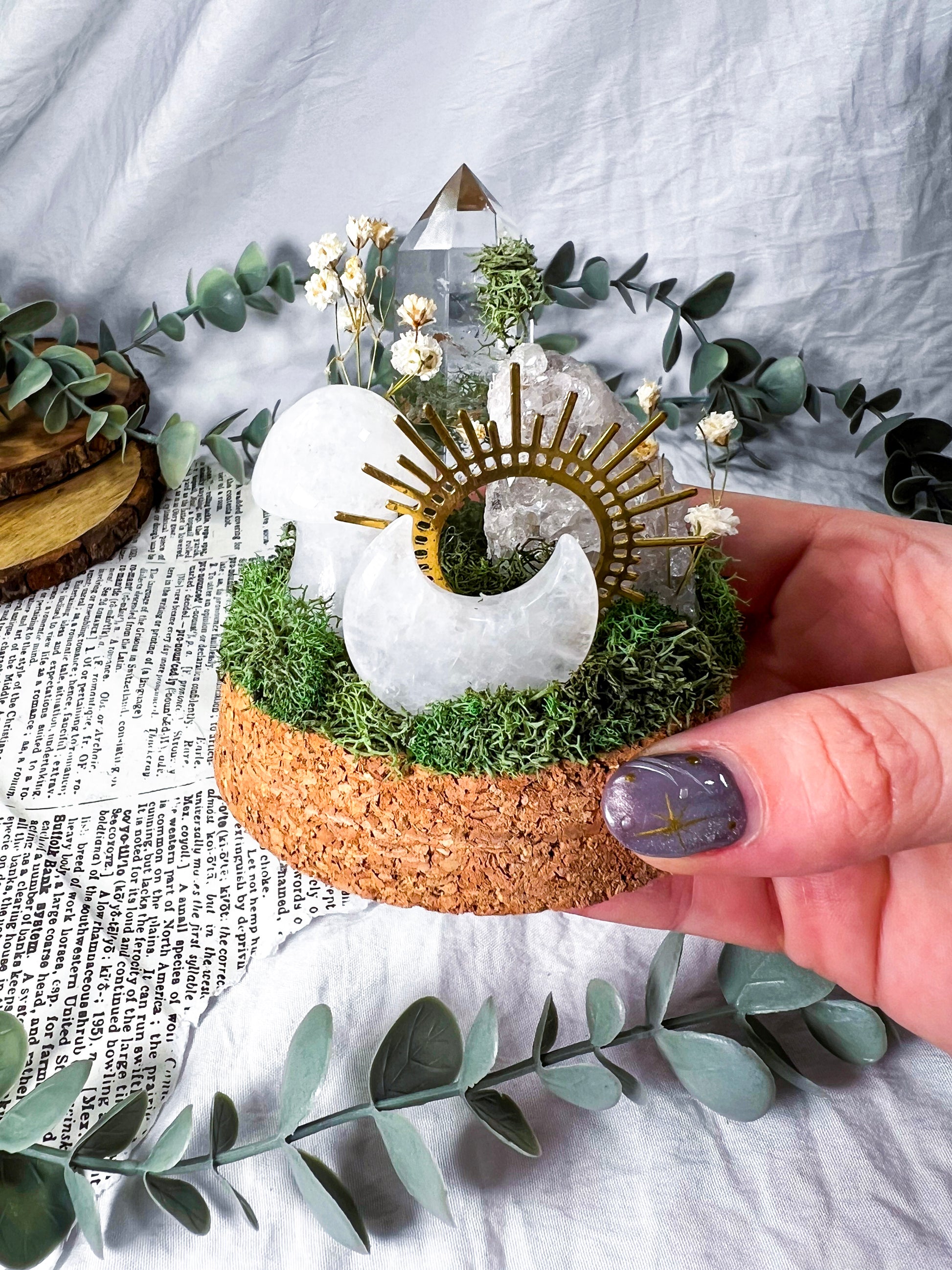 Handcrafted crystal garden domes designed to bring intentional energy, beauty, and magic into your space. Each 5” glass dome features a curated crystal arrangement resting on a cork base, accented with dried florals, preserved moss, and celestial charms. The glass cloche is fully removable, allowing you to interact with your altar pieces while keeping them protected when displayed.