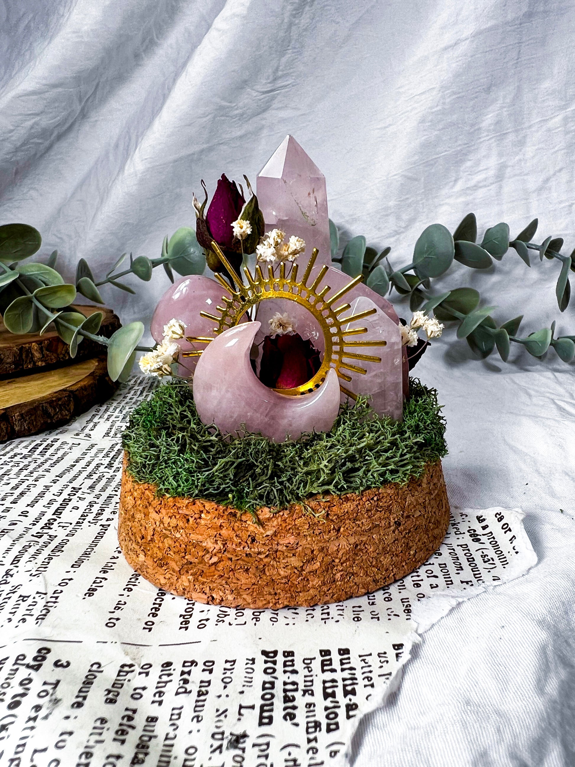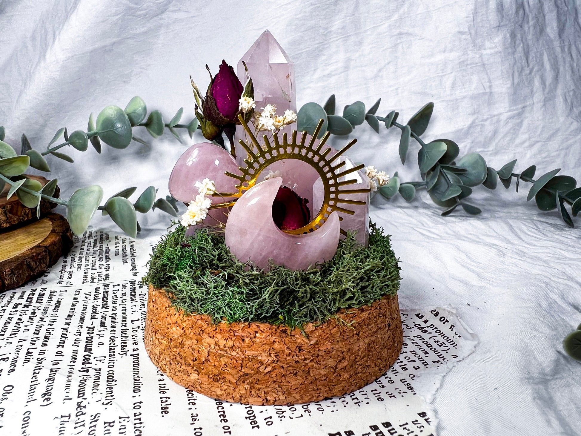 Rose quartz towers (2) | Rose quartz slab | Rose quartz mushroom | Rose quartz moon | Gold sun | Dried rose | Baby’s breath | Preserved moss