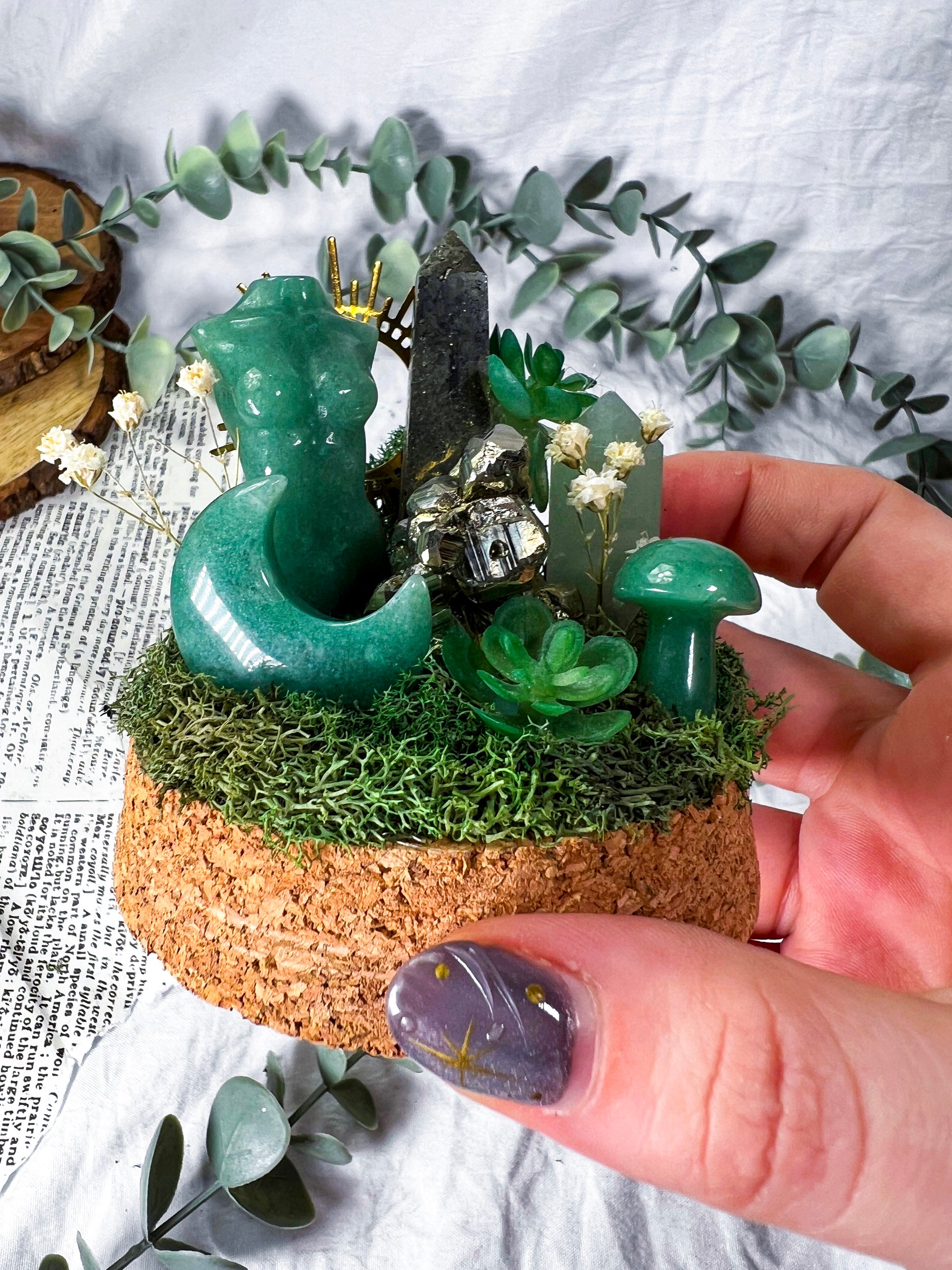 Green aventurine mini tower | Green aventurine moon | Green aventurine goddess | Green aventurine mushroom | Pyrite tower | Pyrite cluster | Baby’s breath | Preserved moss | Gold sun