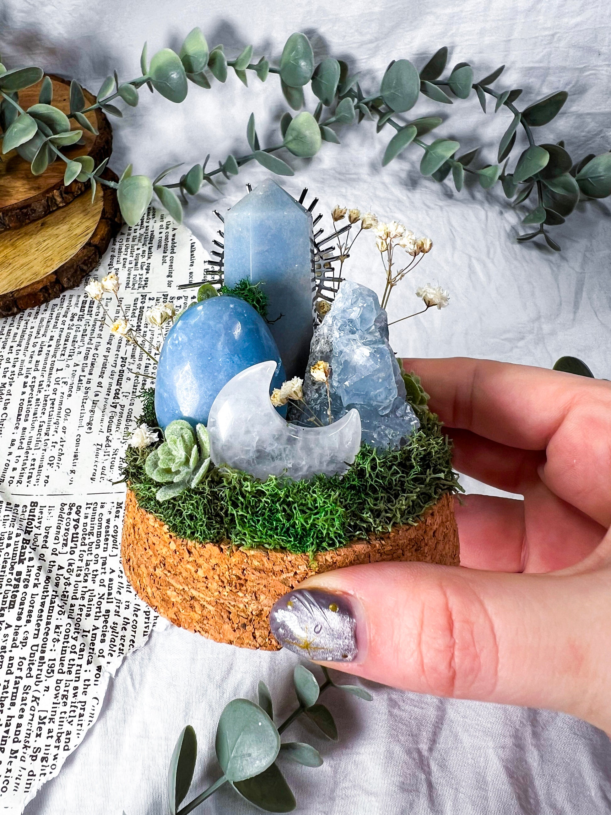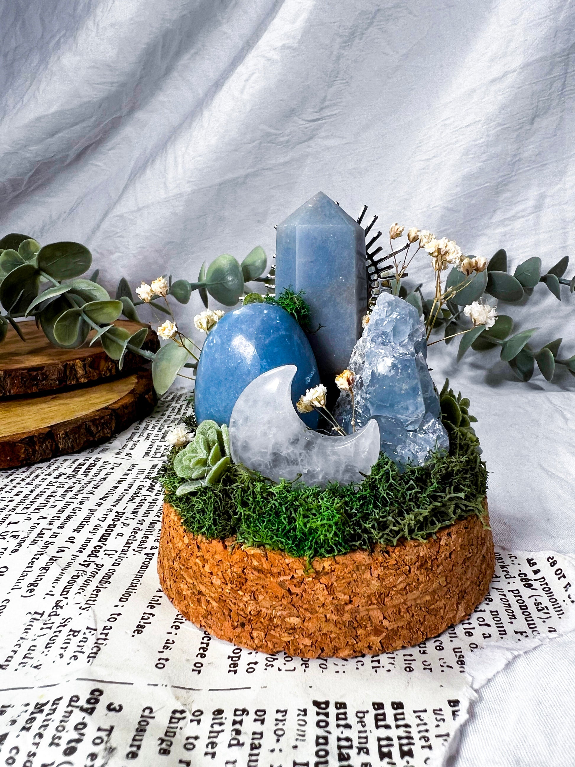 Angelite tower | Celestite cluster | Blue calcite pillow | Clear quartz moon | Faux succulents | Baby’s breath | Preserved moss | Silver sun