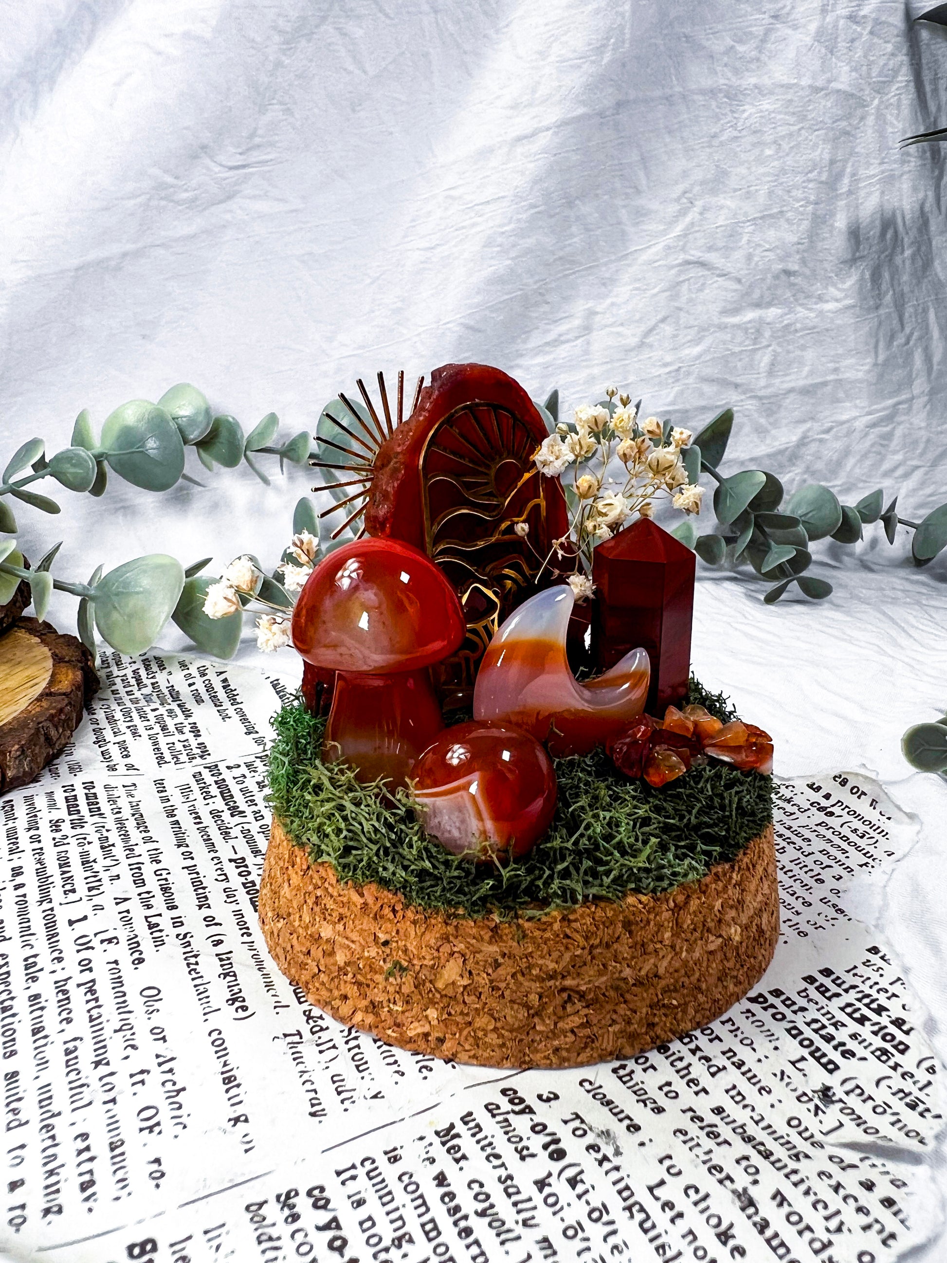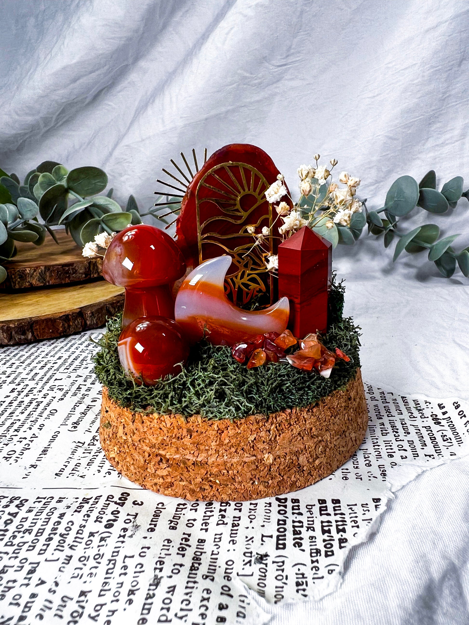 Carnelian slab | Carnelian mushroom | Mini red jasper tower | Carnelian moon | Carnelian sphere | Gold sun charms | Baby’s breath | Preserved moss