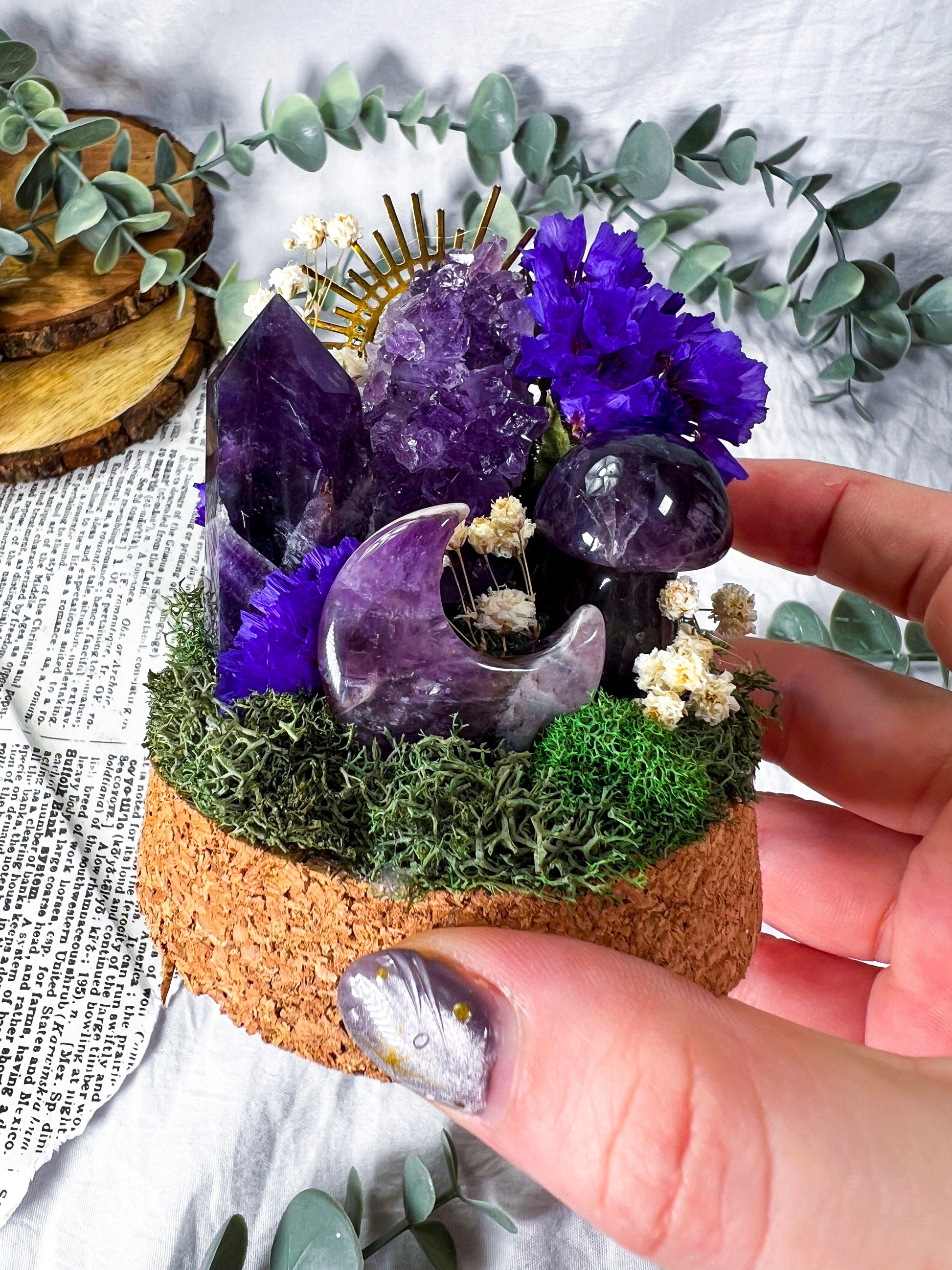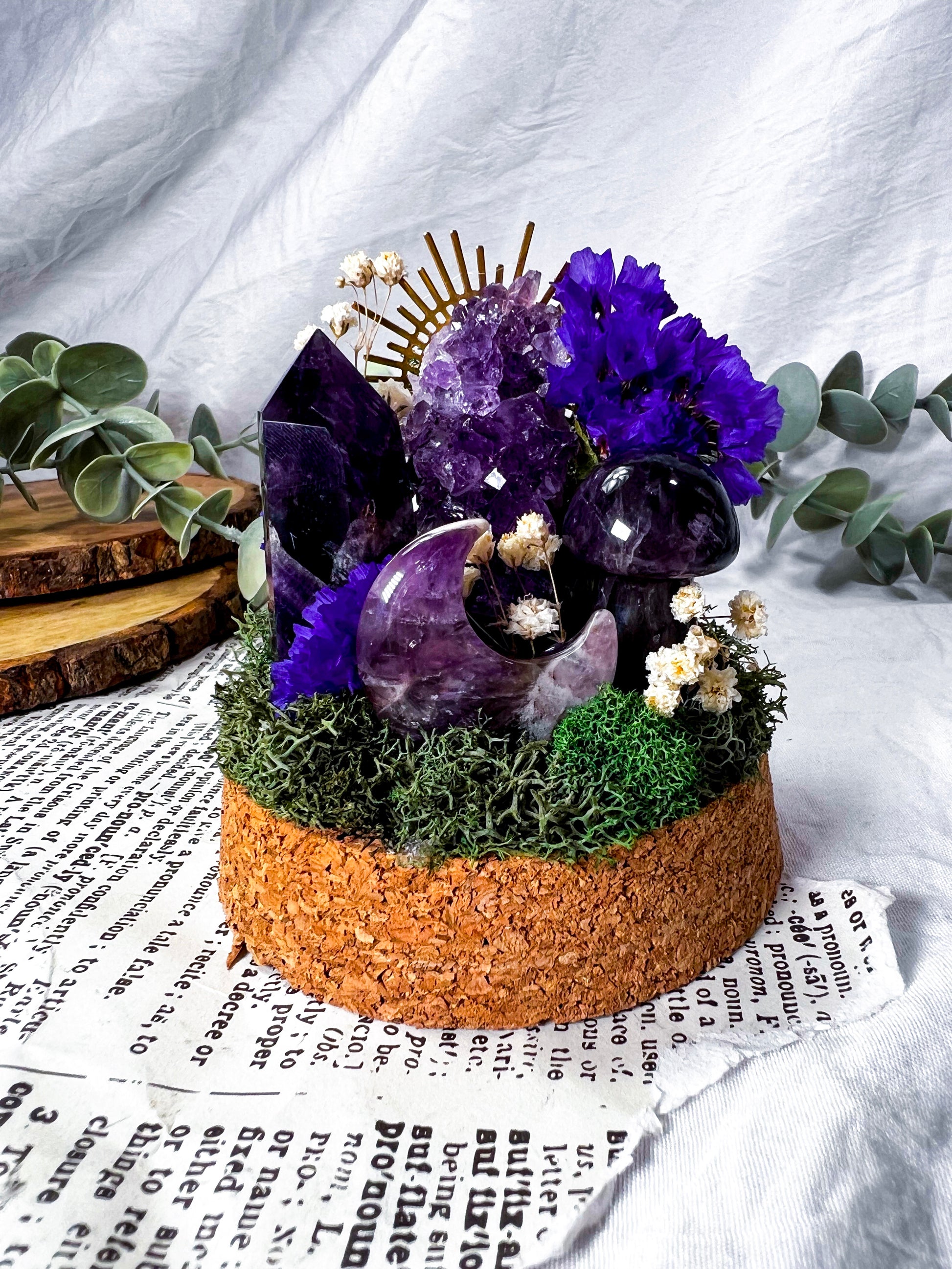 Amethyst cluster | Amethyst tower | Amethyst moon | Amethyst mushroom | Deep purple flowers | Baby’s breath | Preserved moss | Gold sun