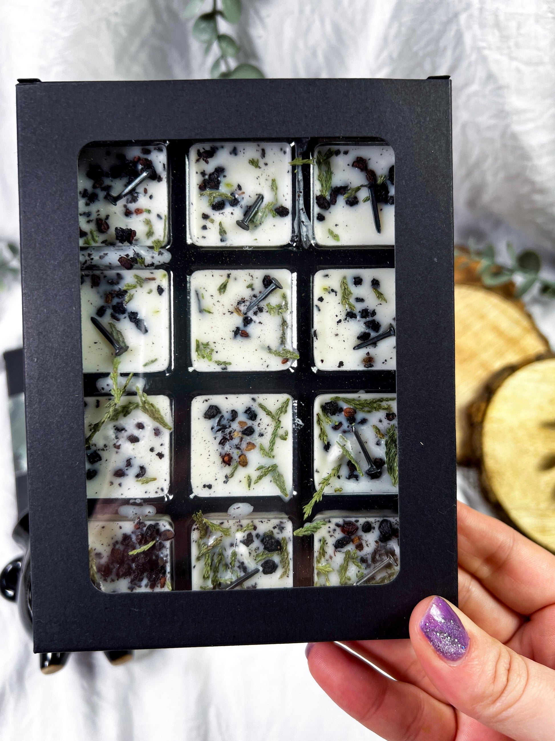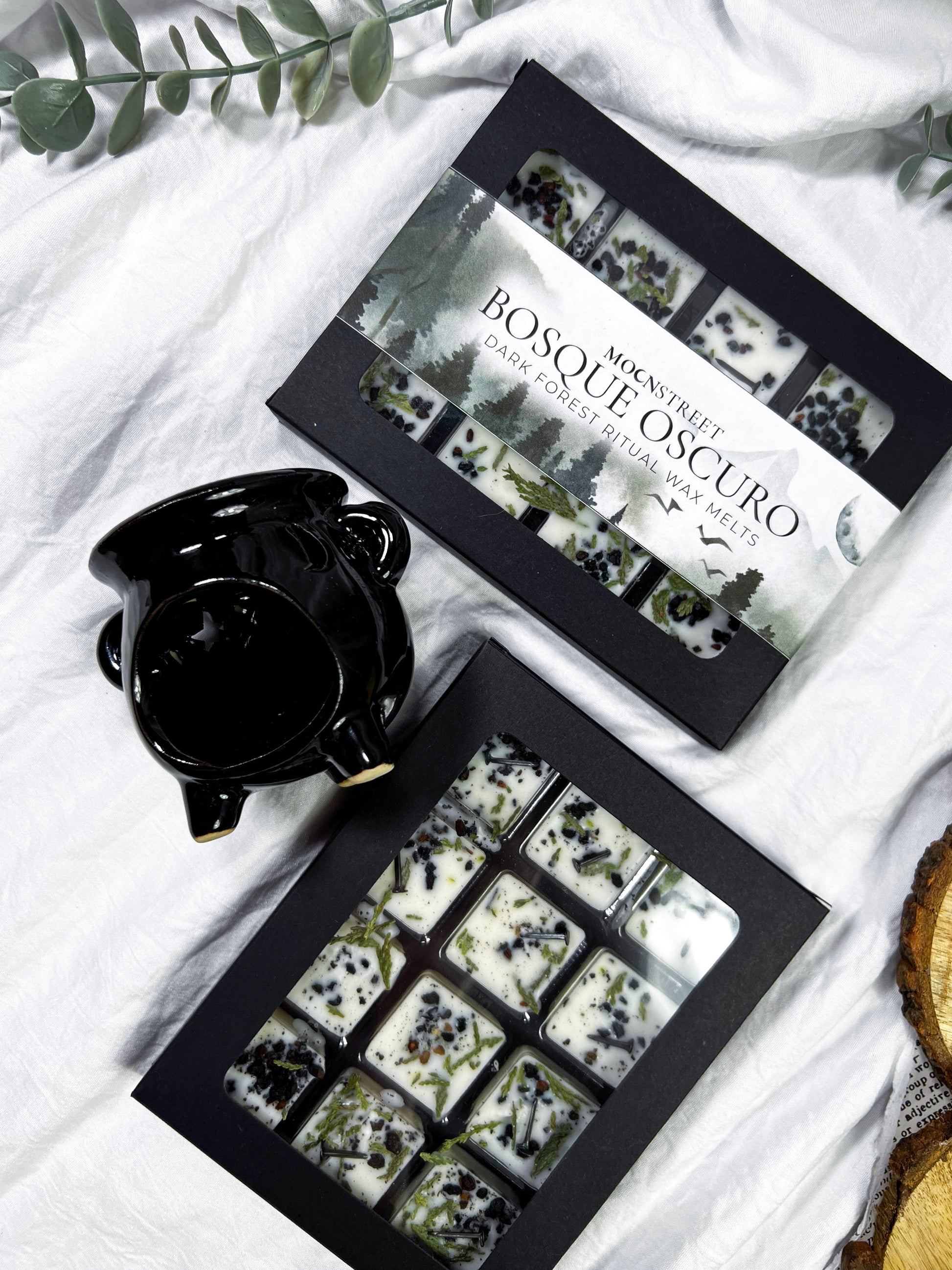 Dark Forest Melts are a limited-edition set of 12 wax melts crafted for protection, shadow work, and grounding. Each piece is poured with a warm sandalwood fragrance and infused with black walnut, elderberry, cedar, comfrey, and iron nails, creating a traditional blend of warding and ancestral power. The set comes with a black ceramic cauldron wax melter that holds a tealight candle beneath, making it both a functional tool and a striking altar piece. Place a melt in the cauldron, light your candle, and allow the forest-inspired scent and energy to fill your space. These melts carry the essence of the dark woods, offering both spiritual defense and guidance during Samhain or year-round rituals.