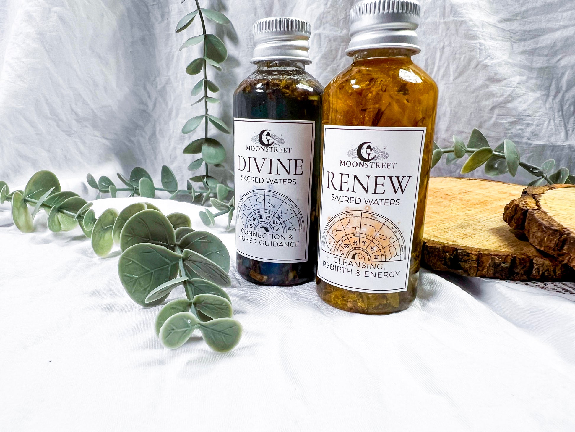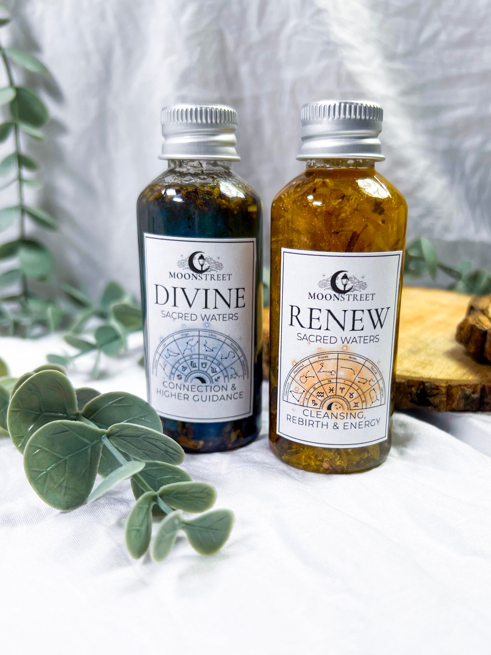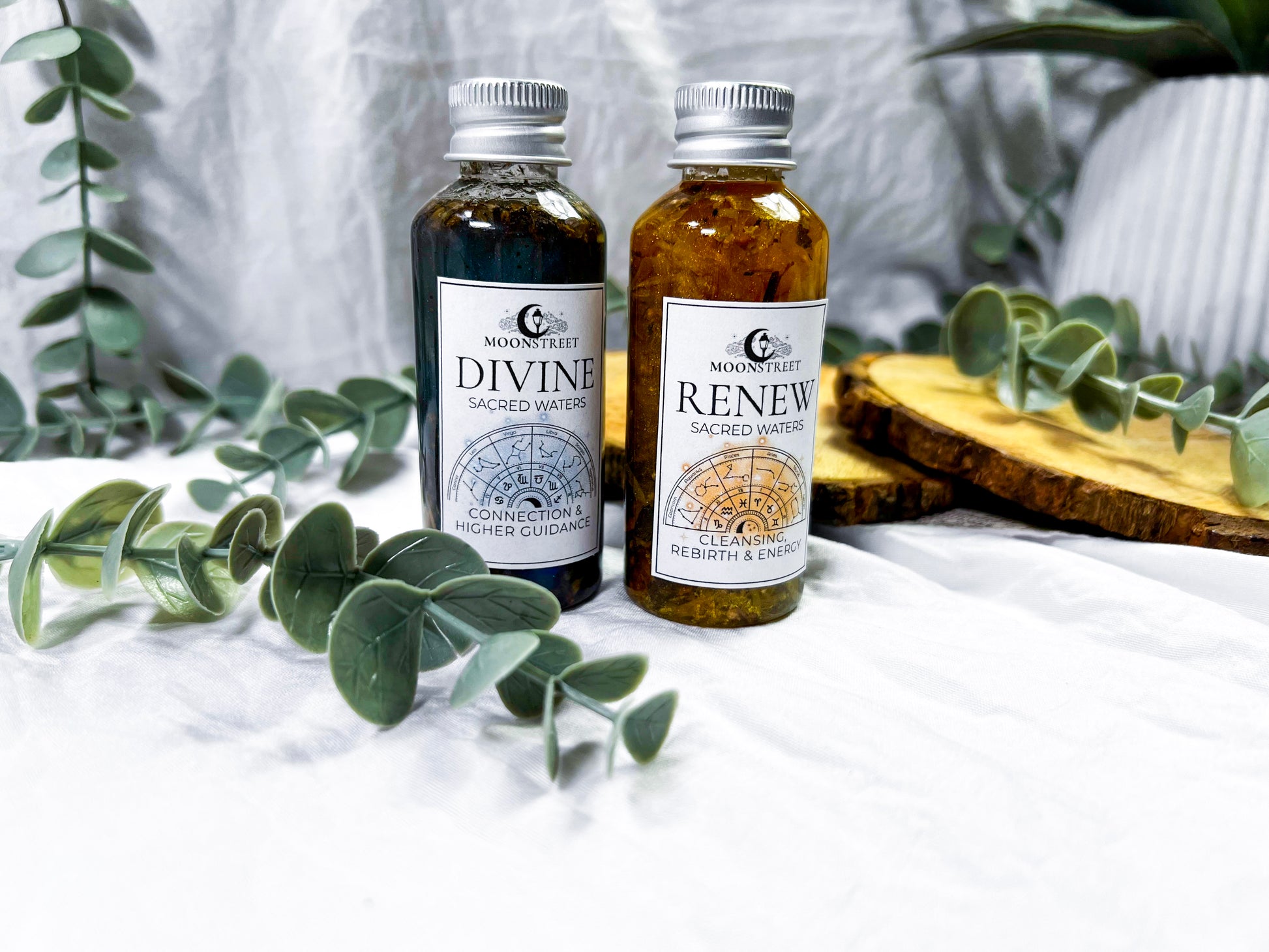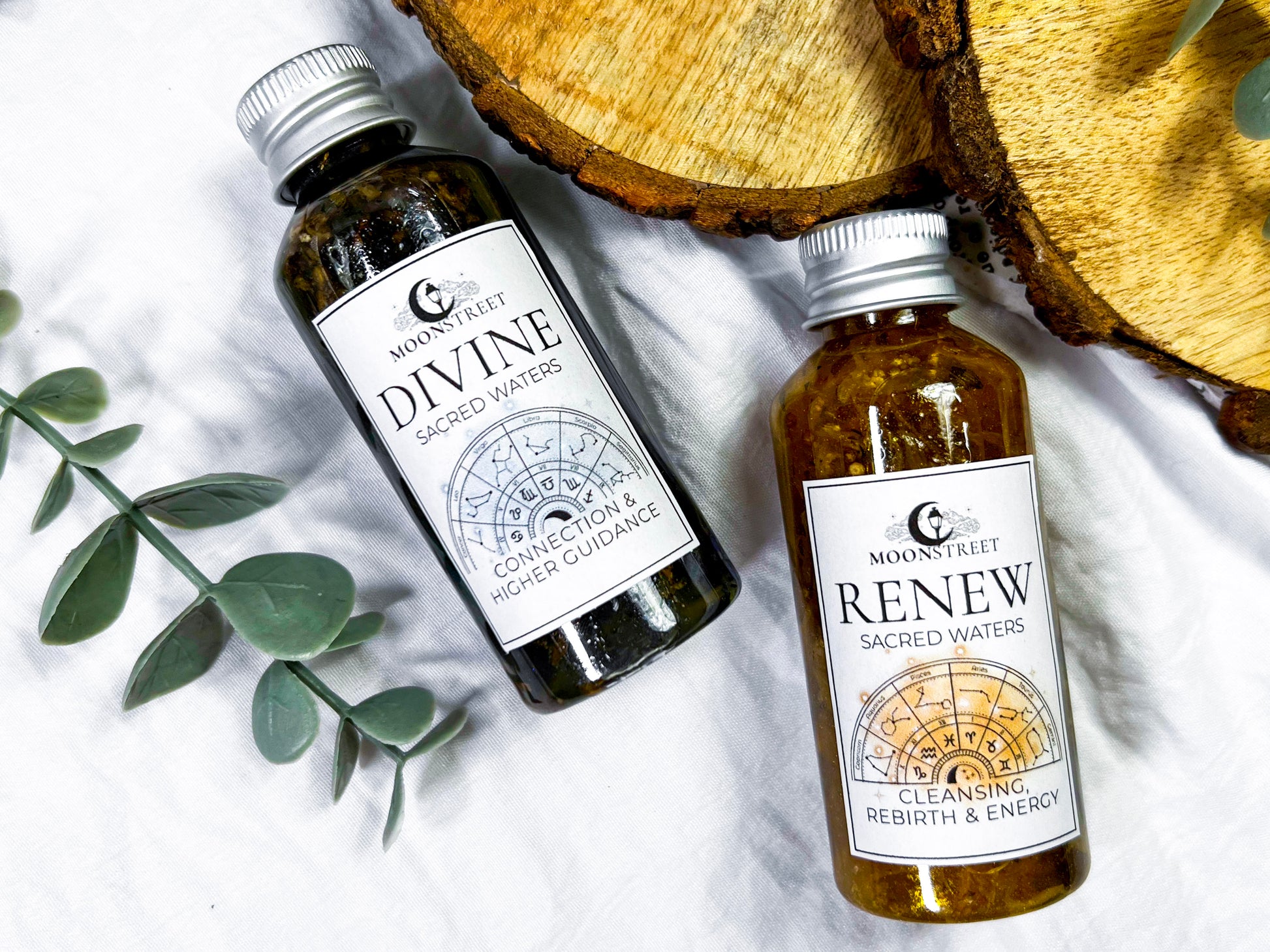 This handcrafted ritual water set pairs two sacred blends for balance: one to lift you into divine clarity, the other to refresh your spirit with renewal.
