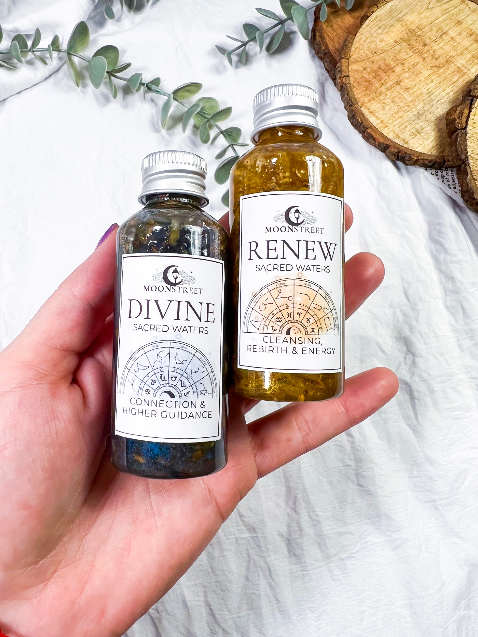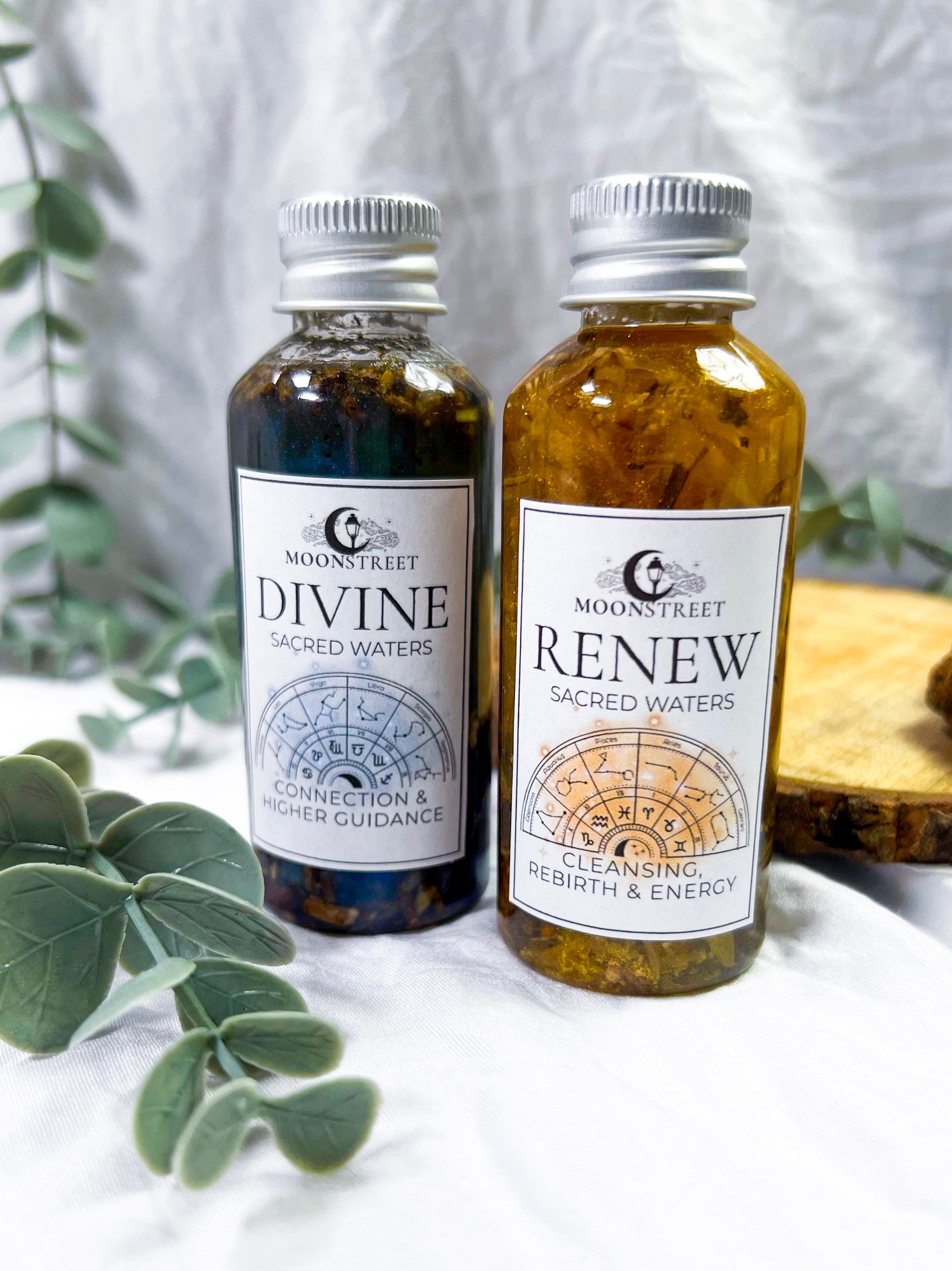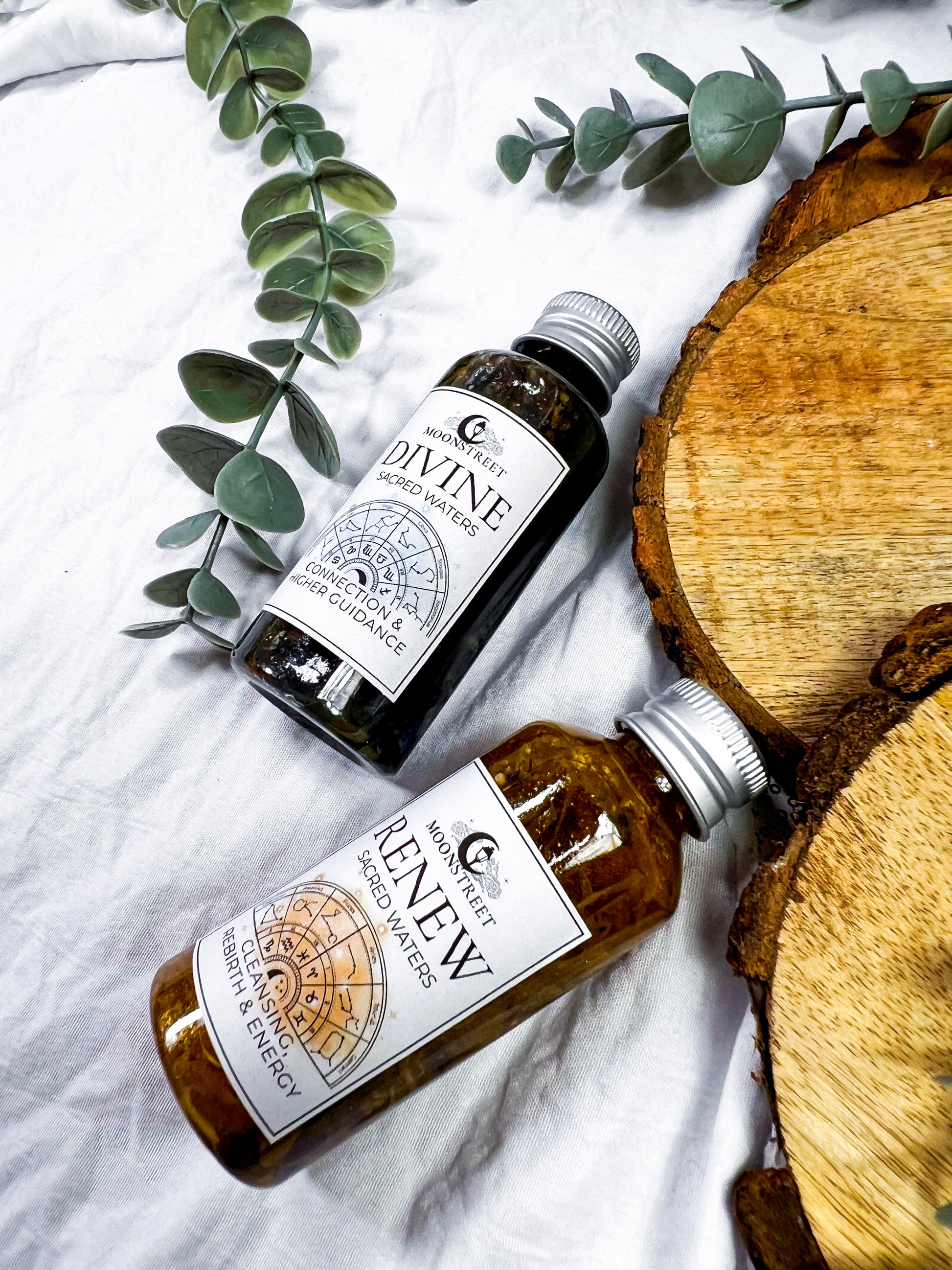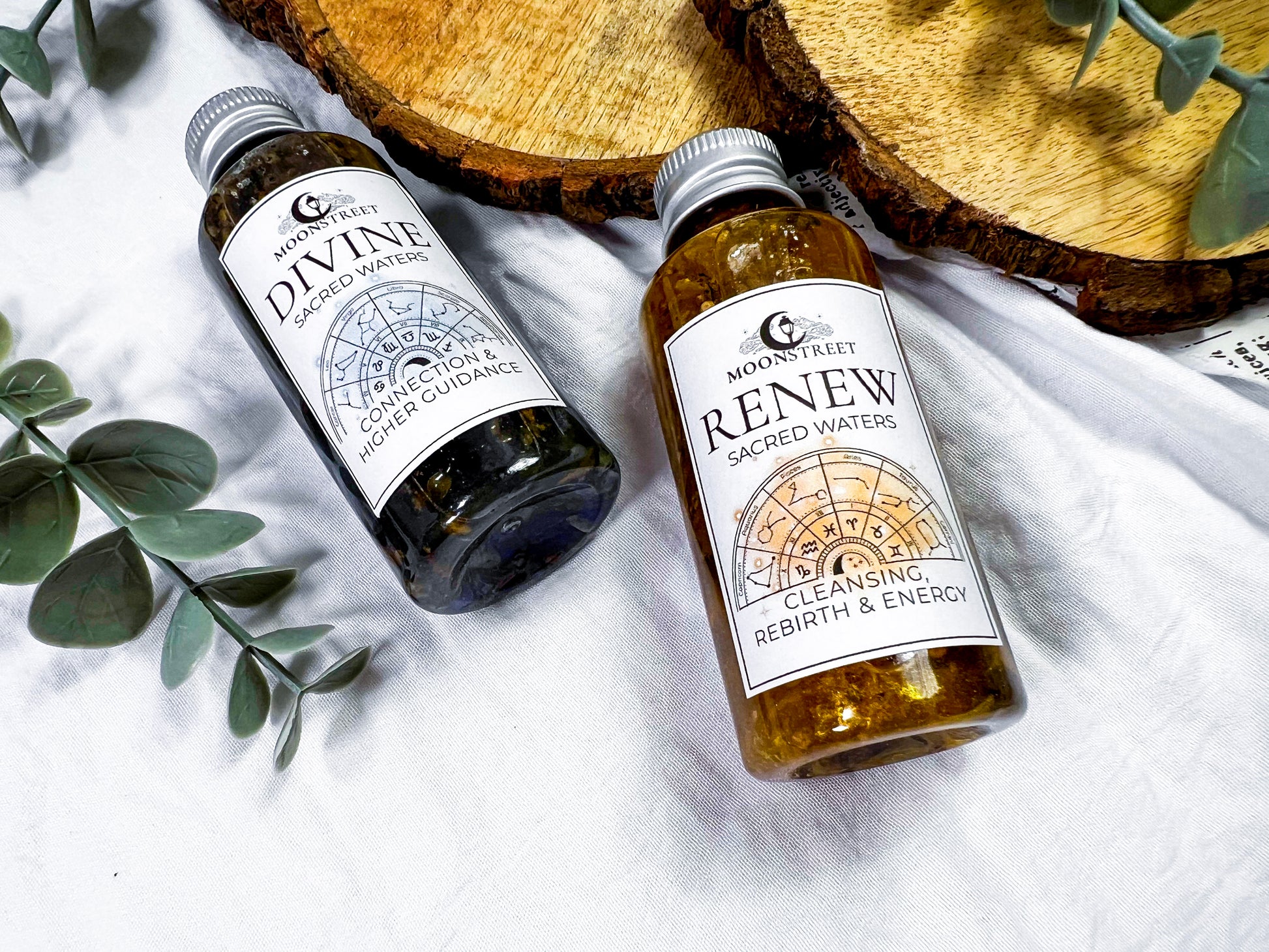This handcrafted ritual water set pairs two sacred blends for balance: one to lift you into divine clarity, the other to refresh your spirit with renewal.