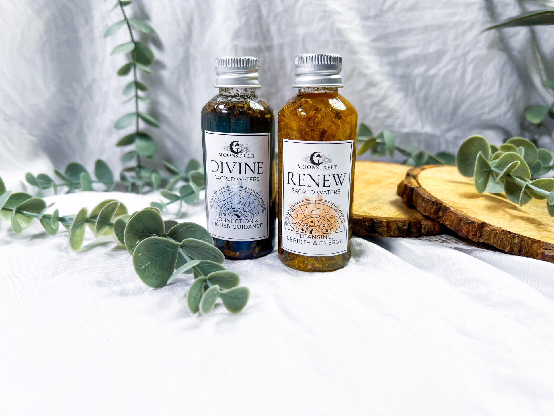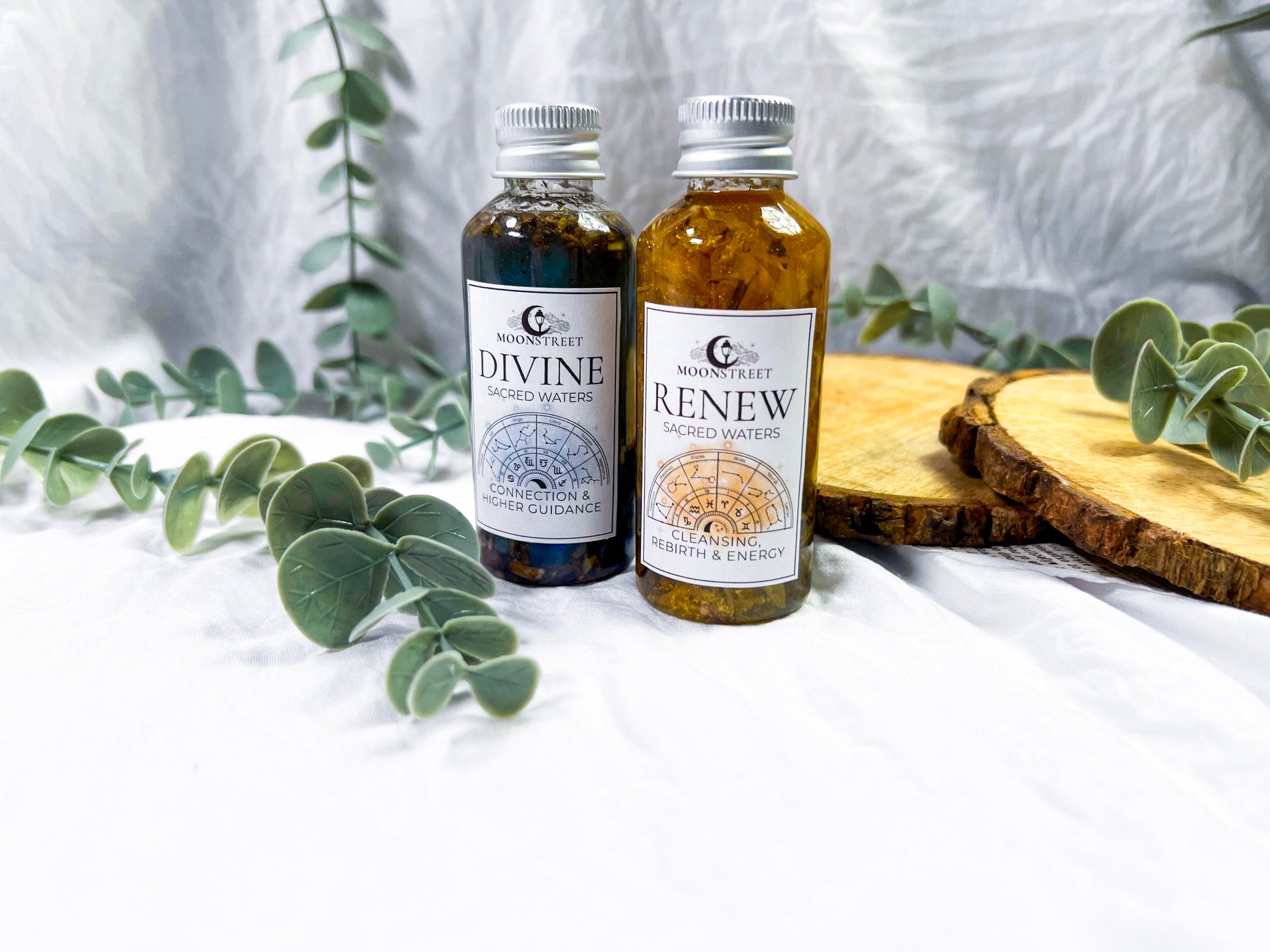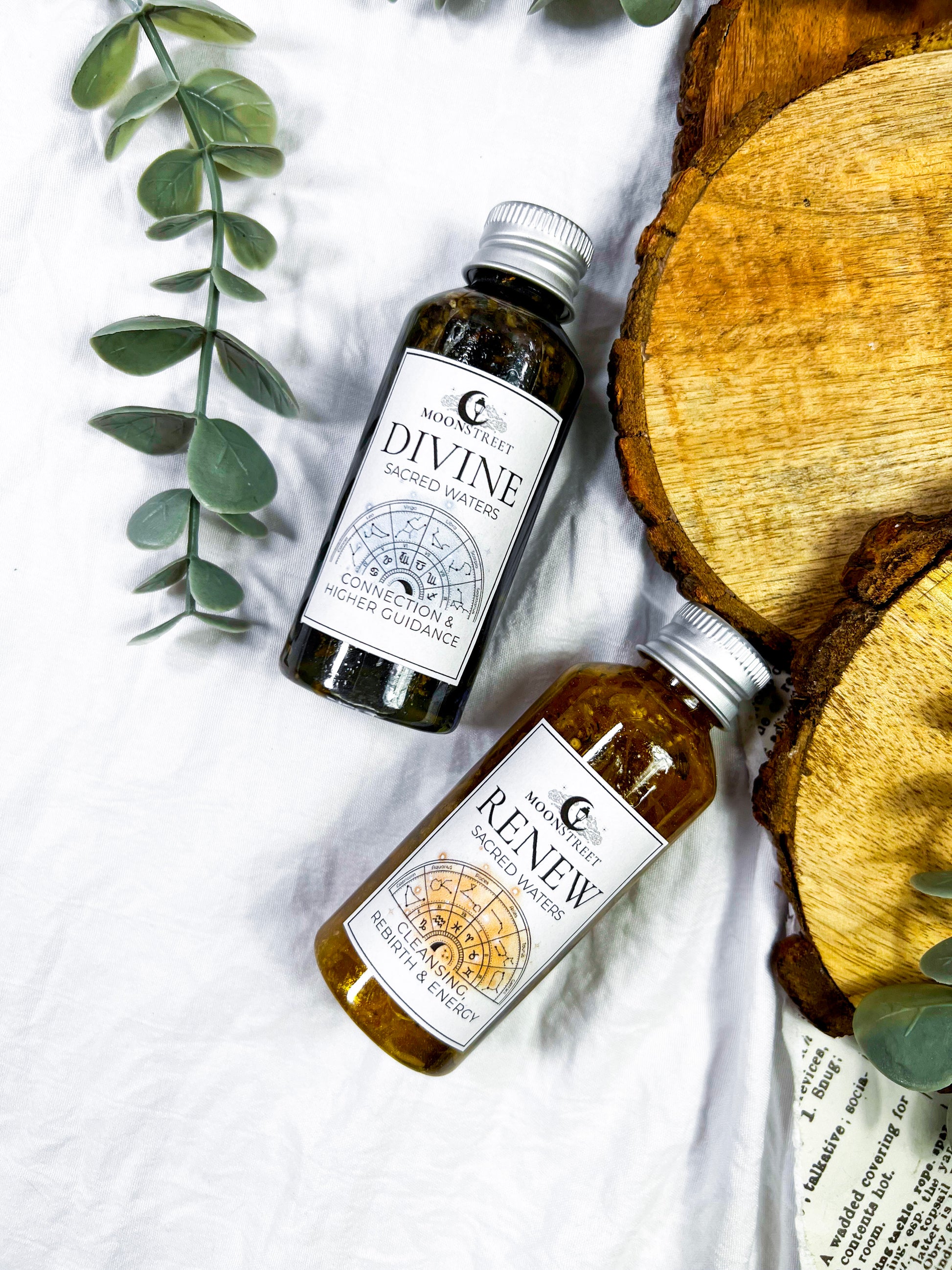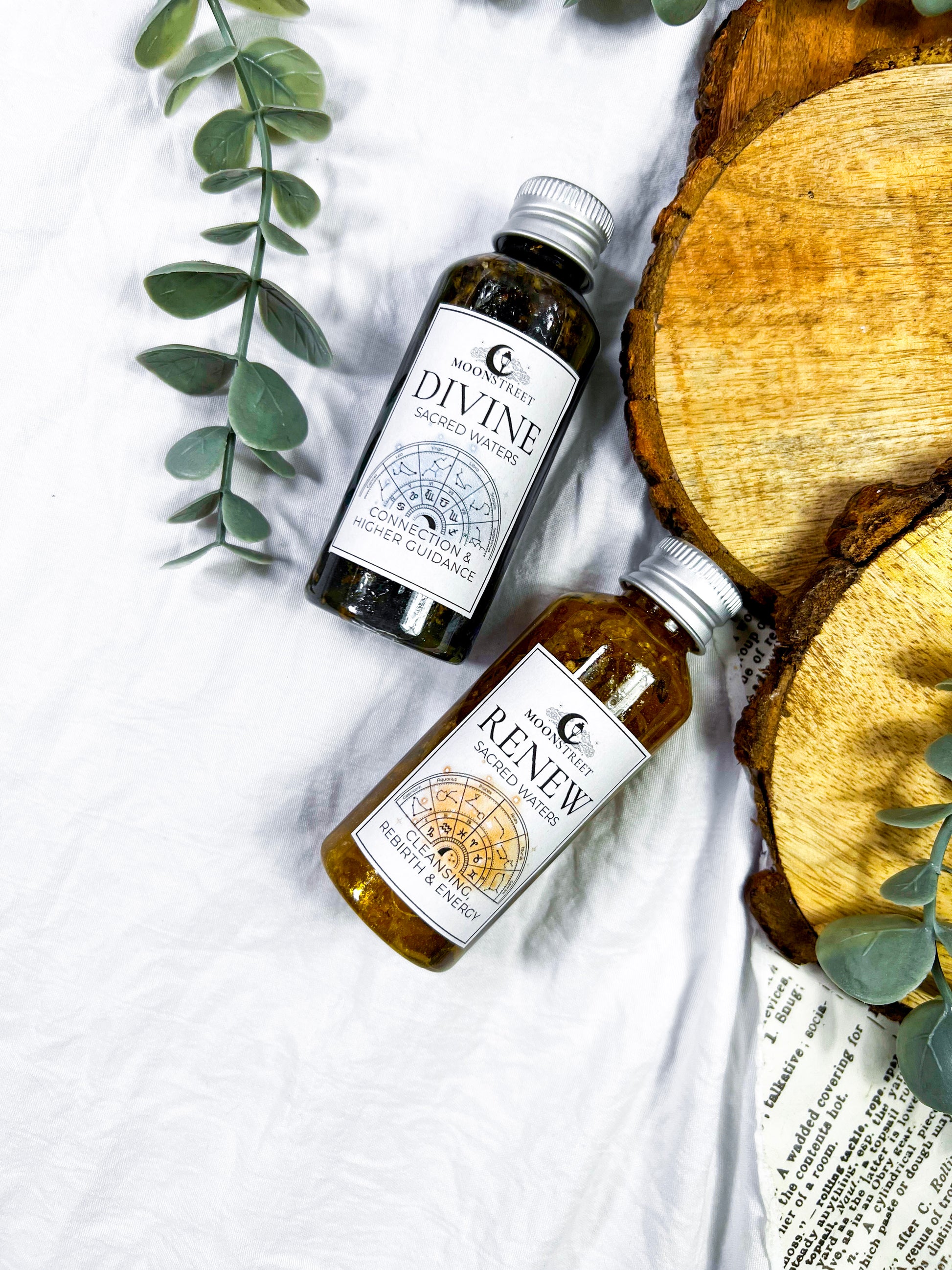 This handcrafted ritual water set pairs two sacred blends for balance: one to lift you into divine clarity, the other to refresh your spirit with renewal.