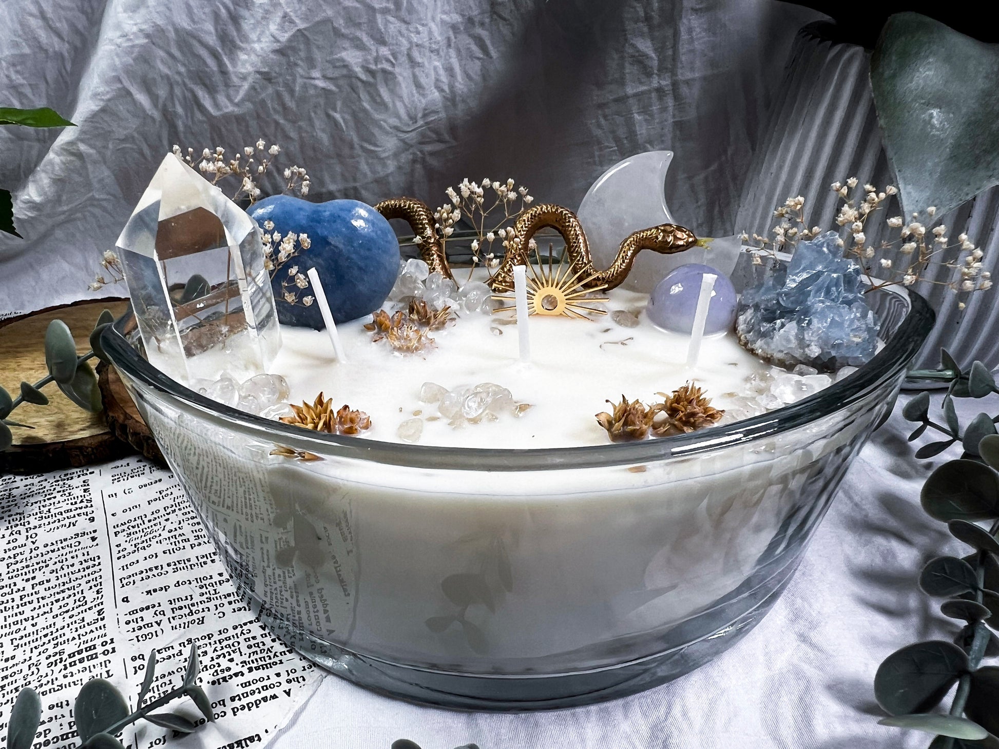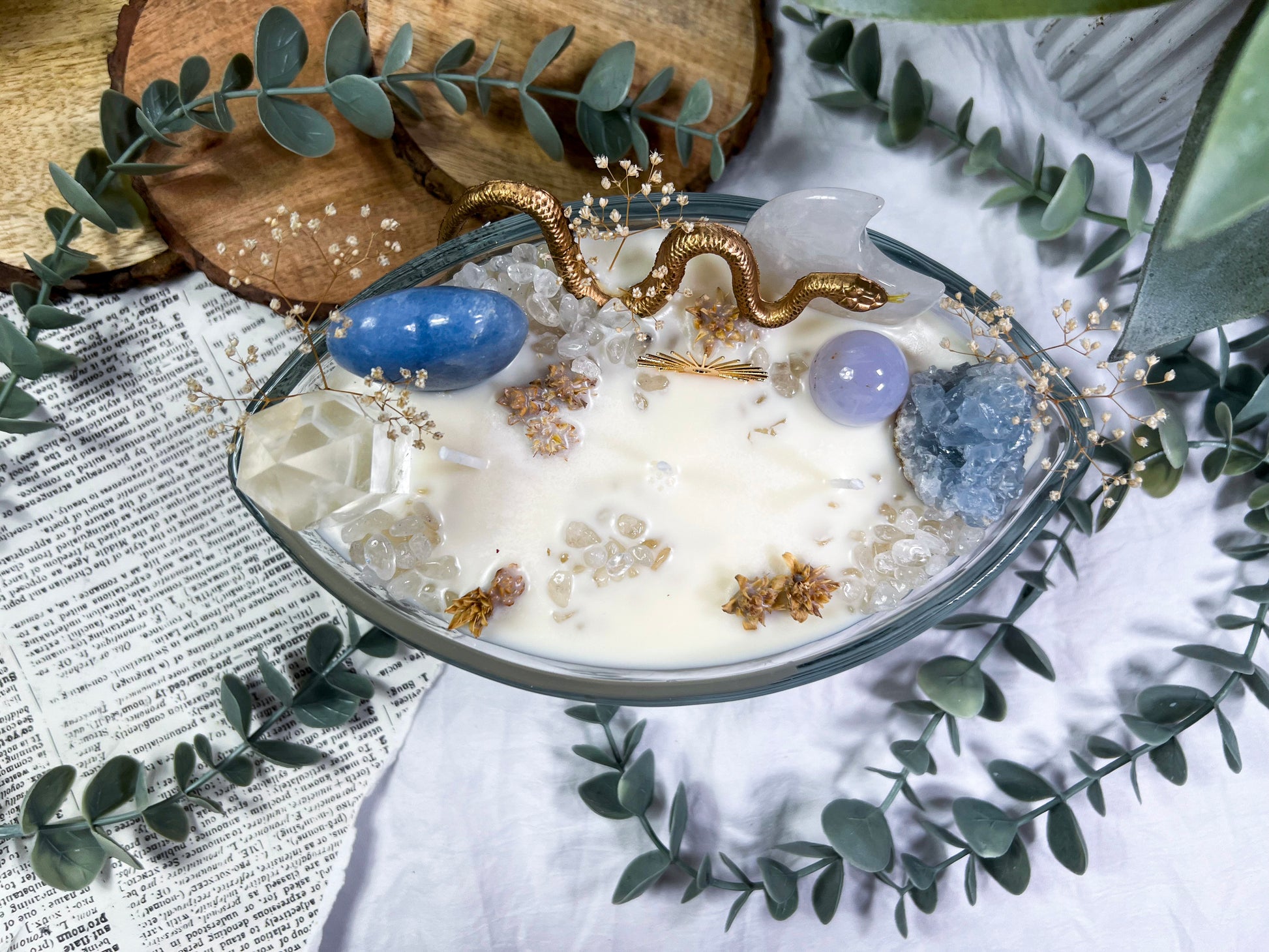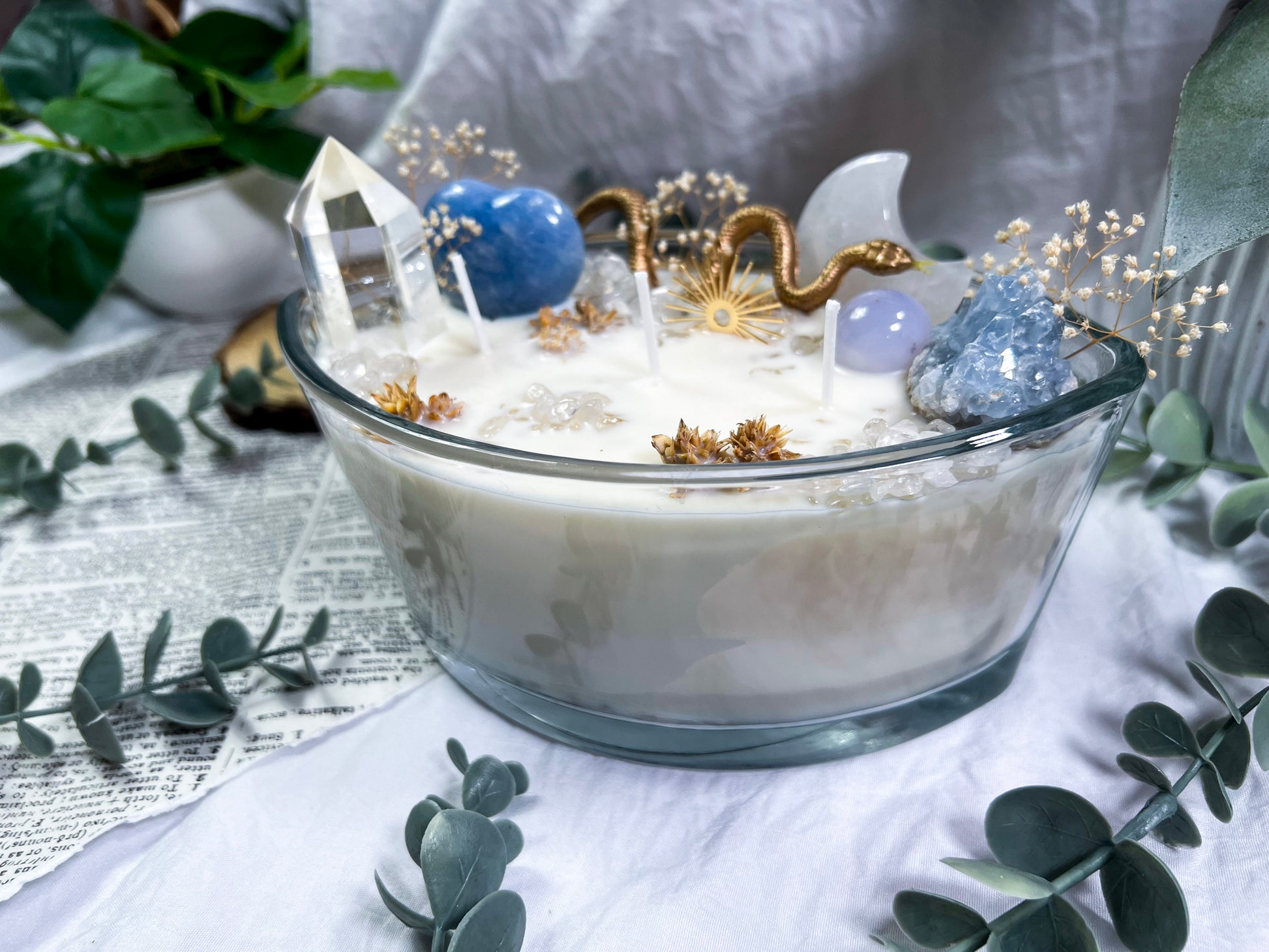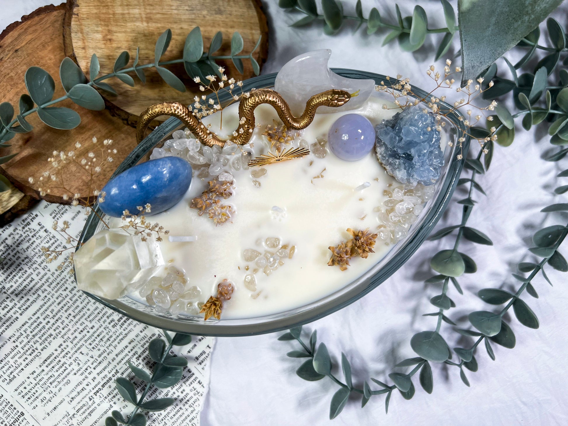 These oversized 24 ounce Eye Candles are powerful altar centerpieces crafted for protection, clarity, and spiritual elevation. Poured into an oval, eye shaped vessel, each candle is layered with bay leaf, cascara sagrada, and meadowsweet at the base for cleansing, truth, and gentle energetic opening. The top is fully dressed with a gold snake, a gold sun charm, a clear quartz tower, a blue calcite heart, a celestite cluster, a clear quartz moon, and scattered quartz chips. Together, the candle creates a full ritual environment inside the wax, blending protection, clarity, intuition, and solar strength in one massive piece. This is the kind of candle you burn when you want the room to shift, your energy to clear, and your intention to take up space.