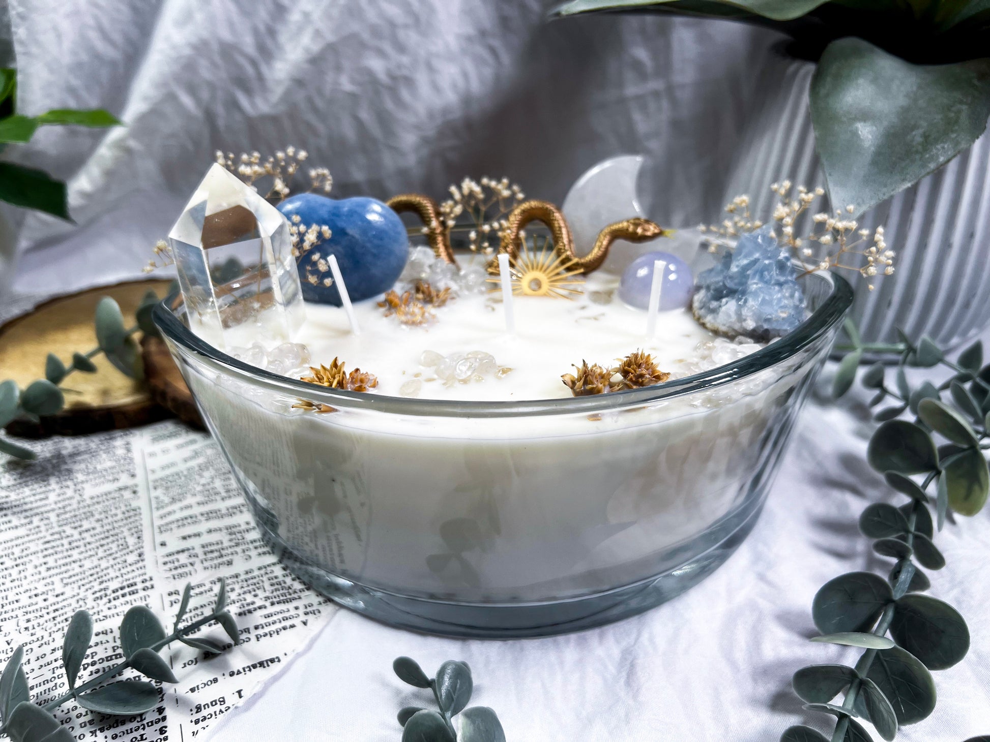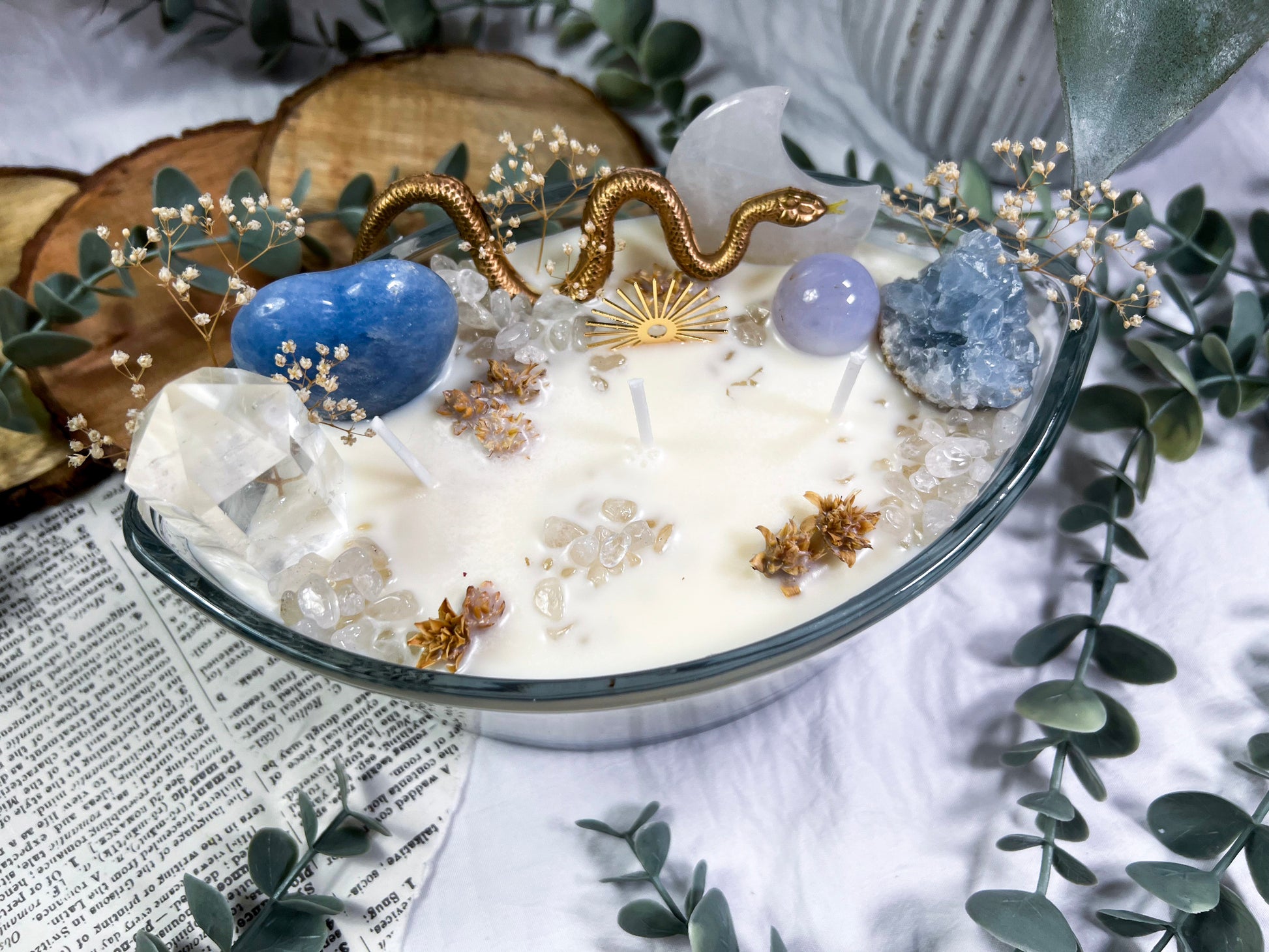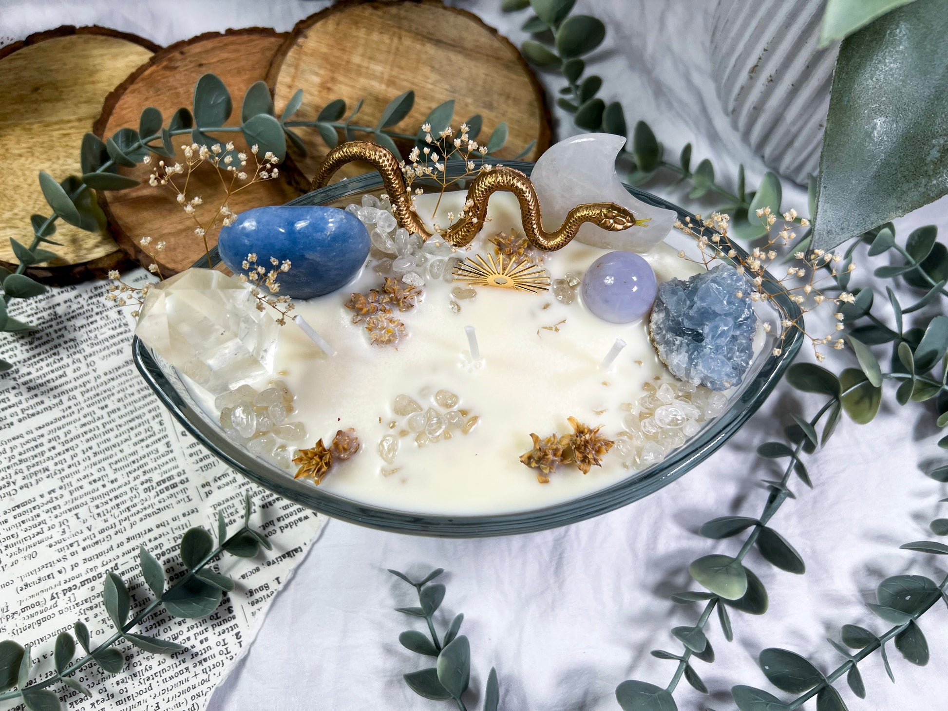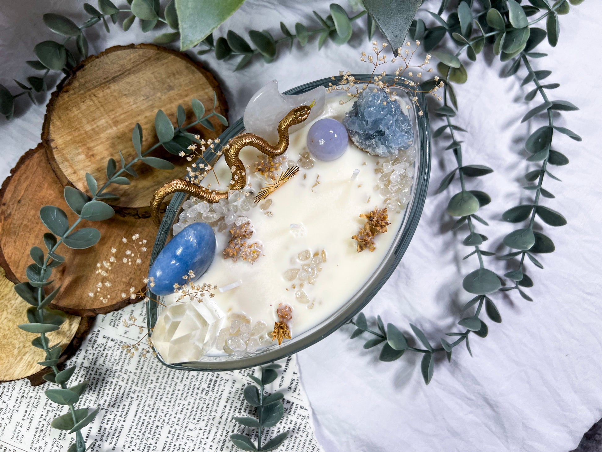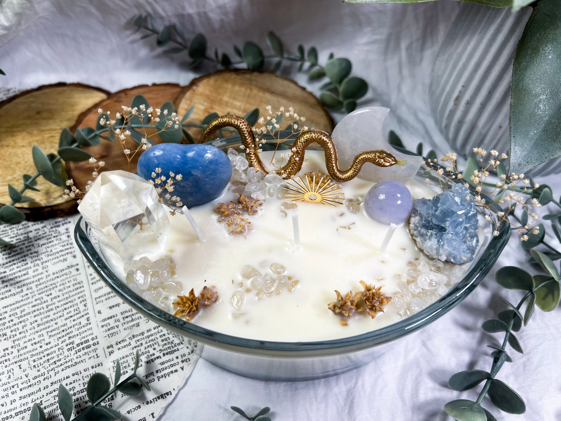 These oversized 24 ounce Eye Candles are powerful altar centerpieces crafted for protection, clarity, and spiritual elevation. Poured into an oval, eye shaped vessel, each candle is layered with bay leaf, cascara sagrada, and meadowsweet at the base for cleansing, truth, and gentle energetic opening. The top is fully dressed with a gold snake, a gold sun charm, a clear quartz tower, a blue calcite heart, a celestite cluster, a clear quartz moon, and scattered quartz chips. Together, the candle creates a full ritual environment inside the wax, blending protection, clarity, intuition, and solar strength in one massive piece. This is the kind of candle you burn when you want the room to shift, your energy to clear, and your intention to take up space.
