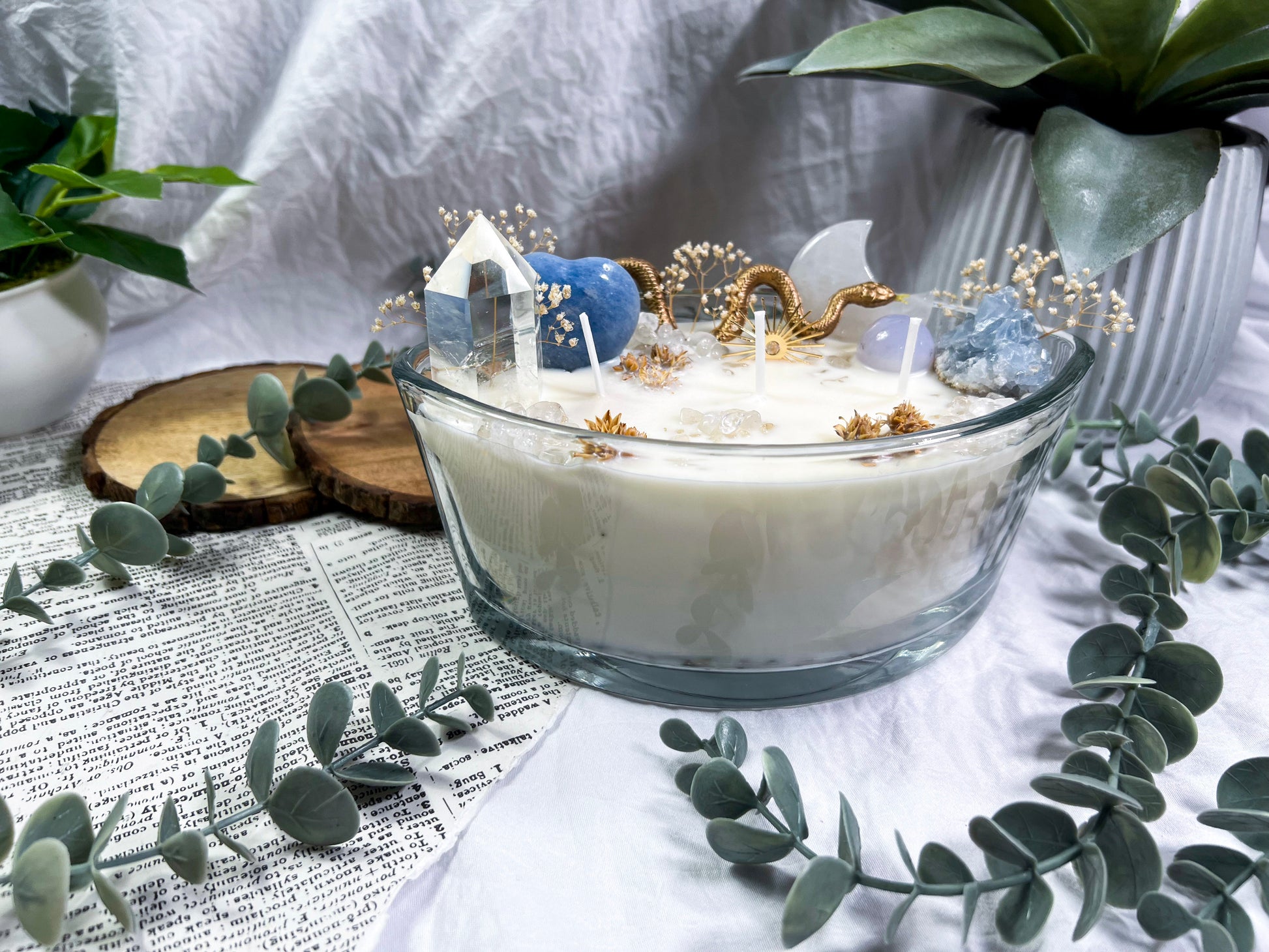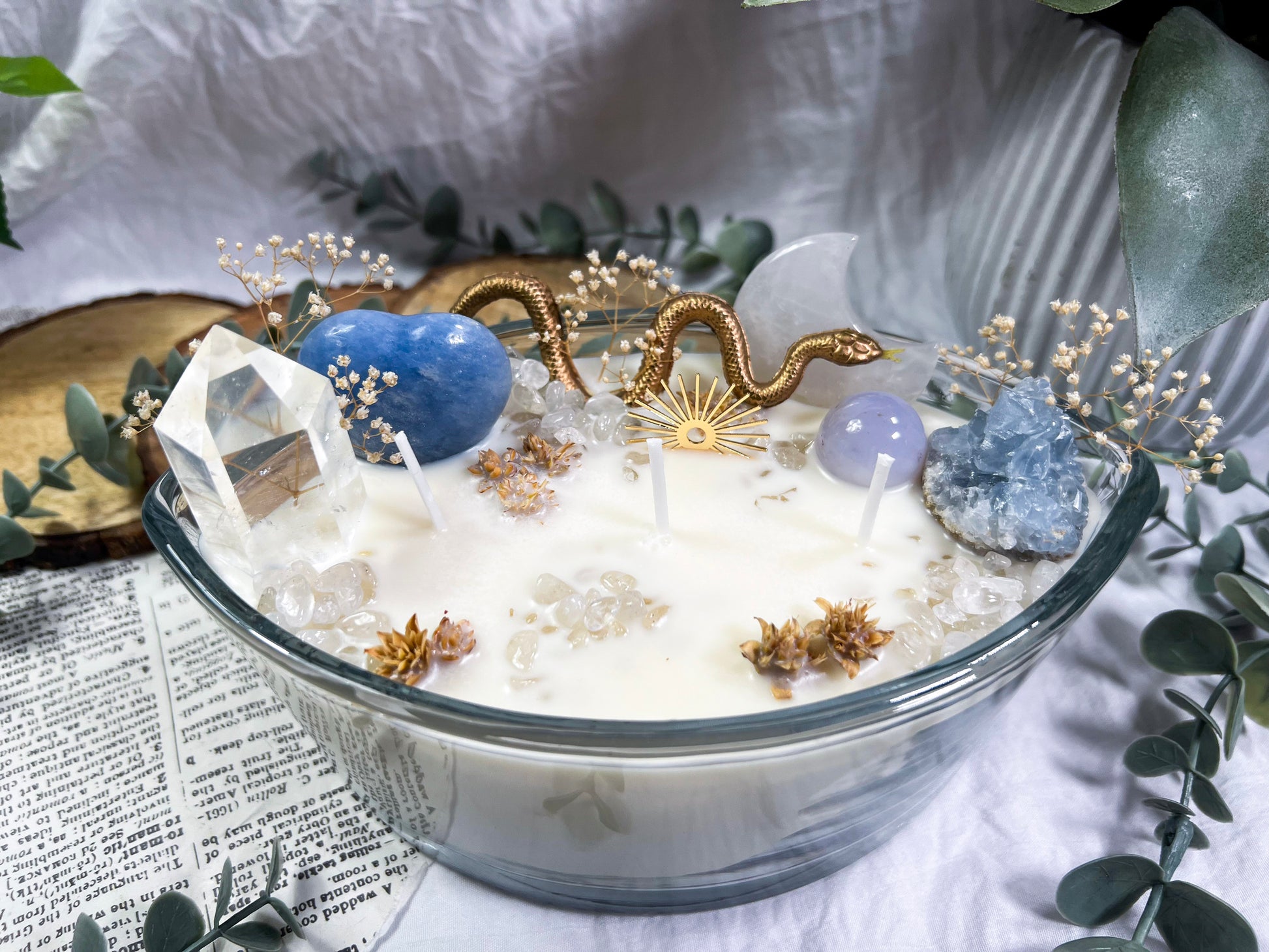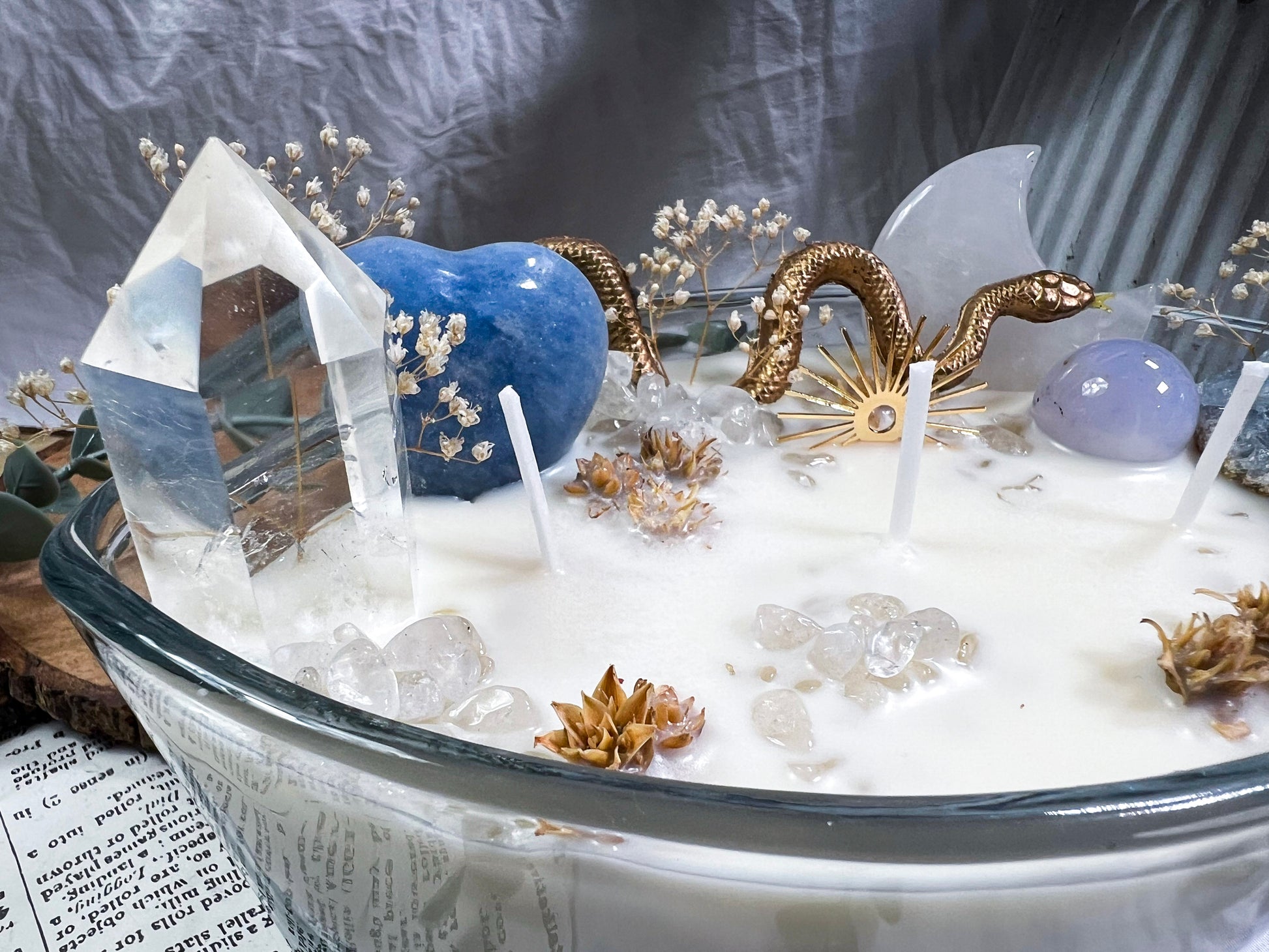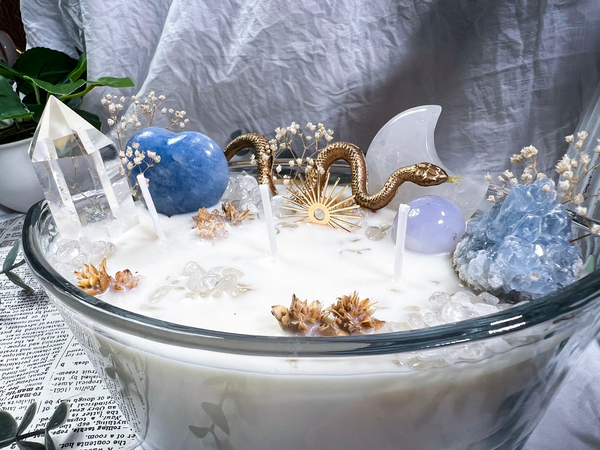 These oversized 24 ounce Eye Candles are powerful altar centerpieces crafted for protection, clarity, and spiritual elevation. Poured into an oval, eye shaped vessel, each candle is layered with bay leaf, cascara sagrada, and meadowsweet at the base for cleansing, truth, and gentle energetic opening. The top is fully dressed with a gold snake, a gold sun charm, a clear quartz tower, a blue calcite heart, a celestite cluster, a clear quartz moon, and scattered quartz chips. Together, the candle creates a full ritual environment inside the wax, blending protection, clarity, intuition, and solar strength in one massive piece. This is the kind of candle you burn when you want the room to shift, your energy to clear, and your intention to take up space.