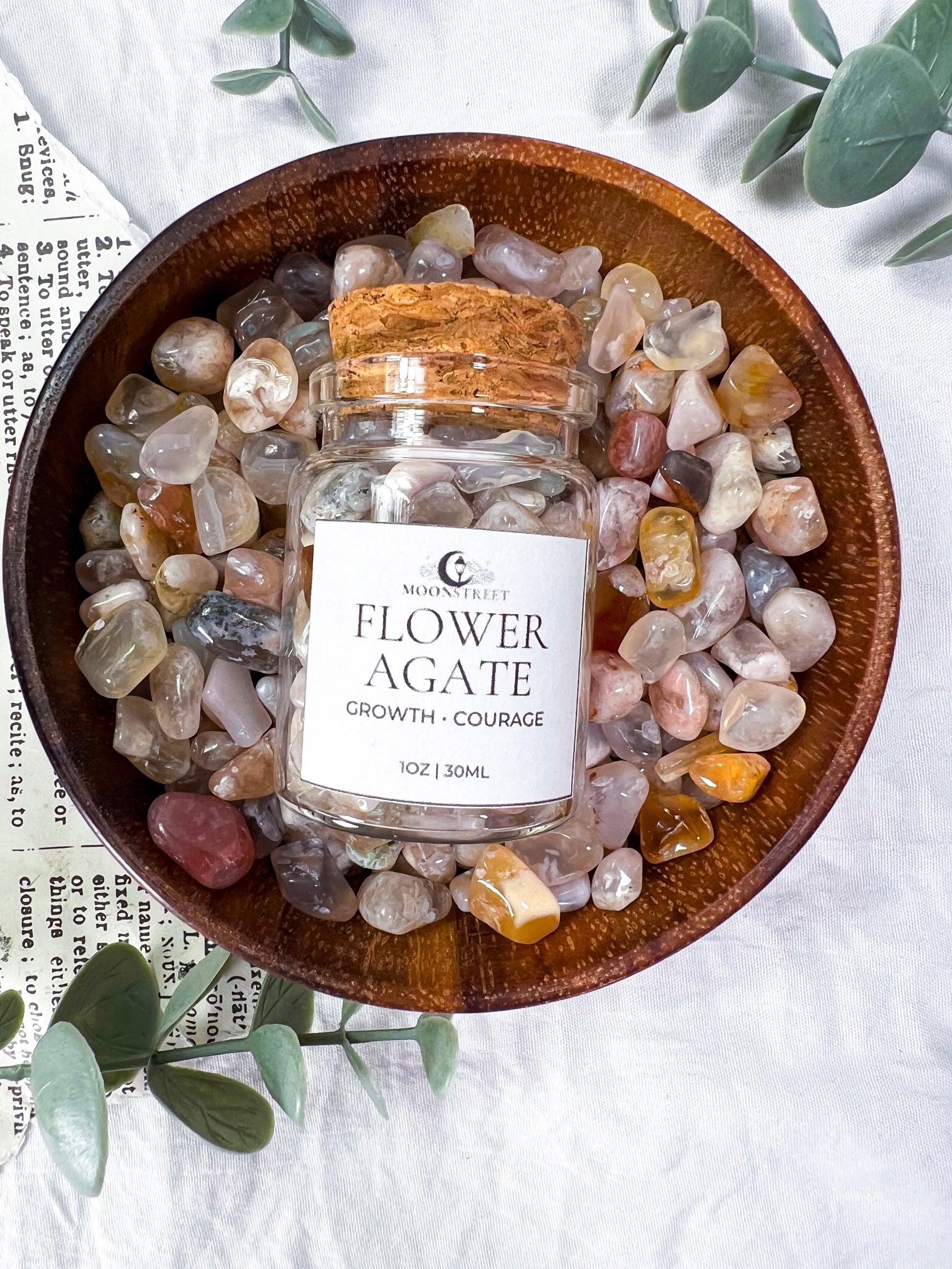 Bulk Flower Agate crystal chips in a 2oz glass jar, perfect for spell work, altars, jars, candles, grids, baths, and ritual magic. Known as the stone of growth and courage, Flower Agate supports personal development, emotional healing, and stepping into your potential.