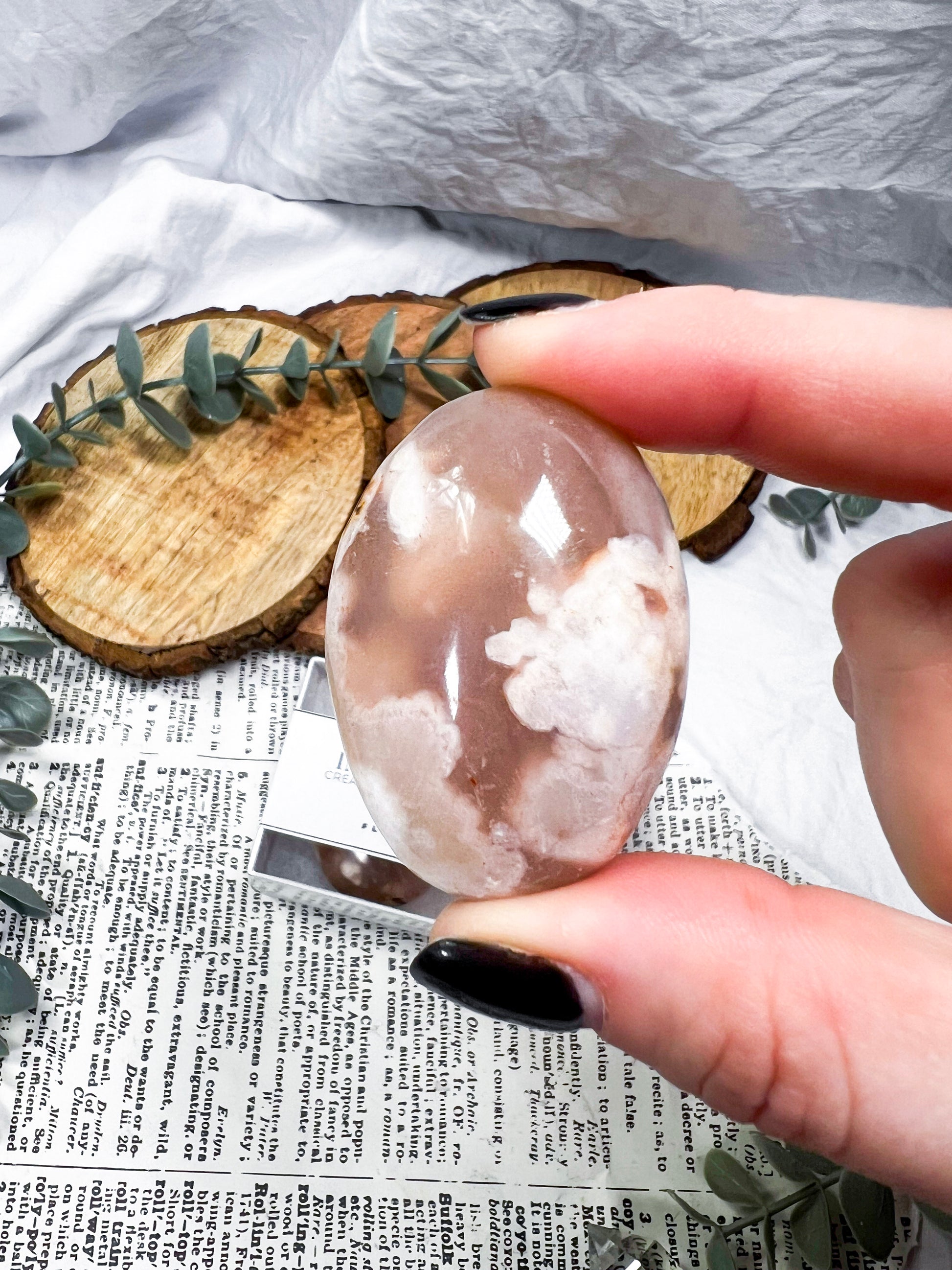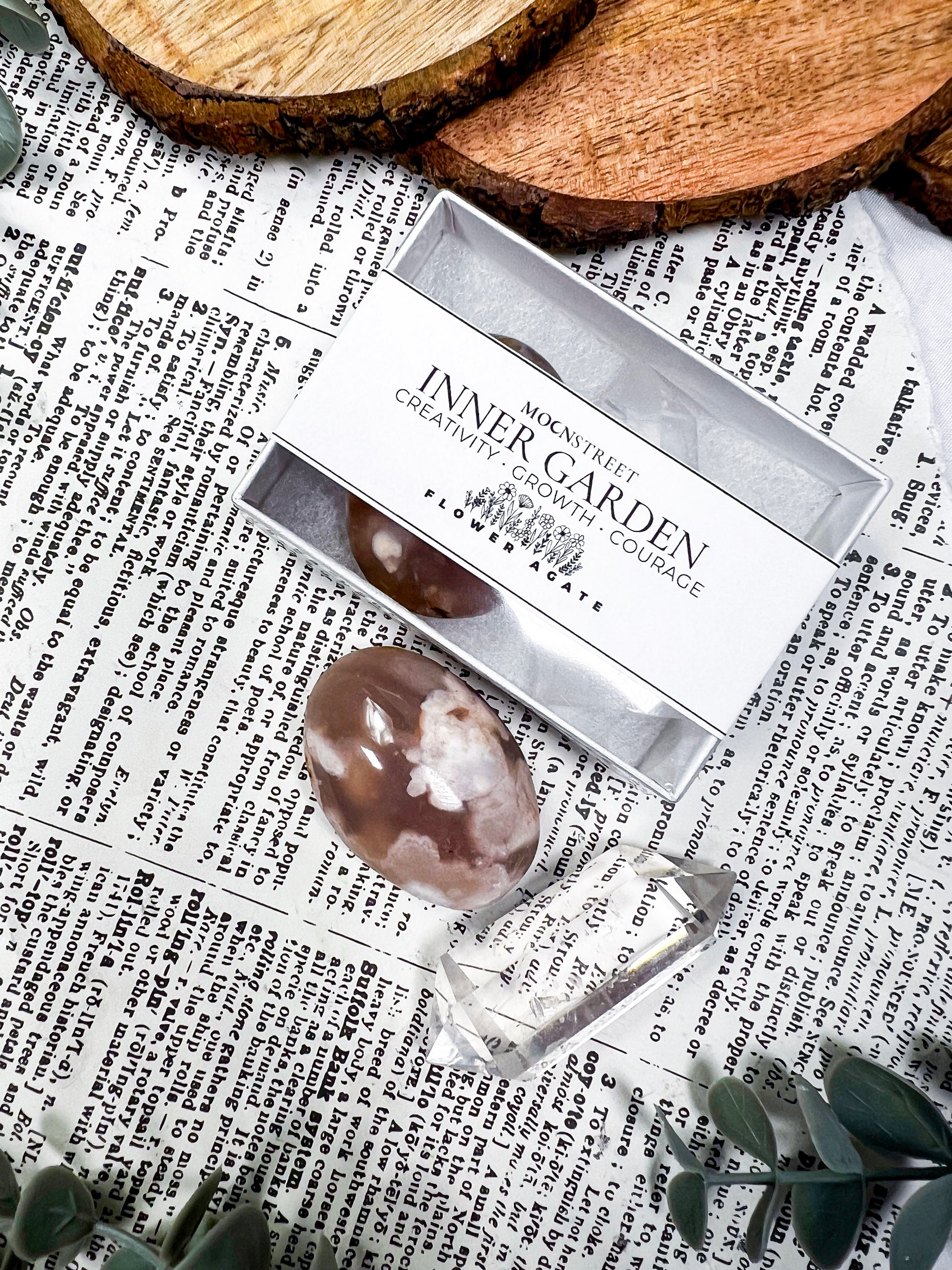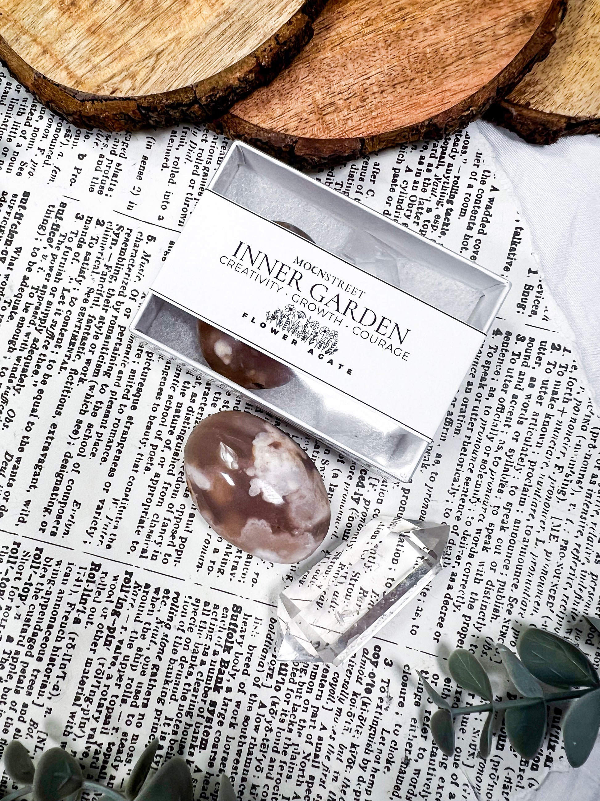 The Flower Agate Mini Set inspires creativity, self-growth, and balance. Each includes a flower agate palm stone and either a clear quartz double point or tower (chosen intuitively).