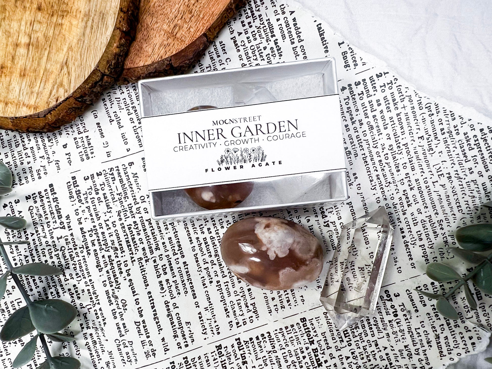 flower agate · clear quartz · creativity crystal · personal growth · pocket crystal set · witchy decor