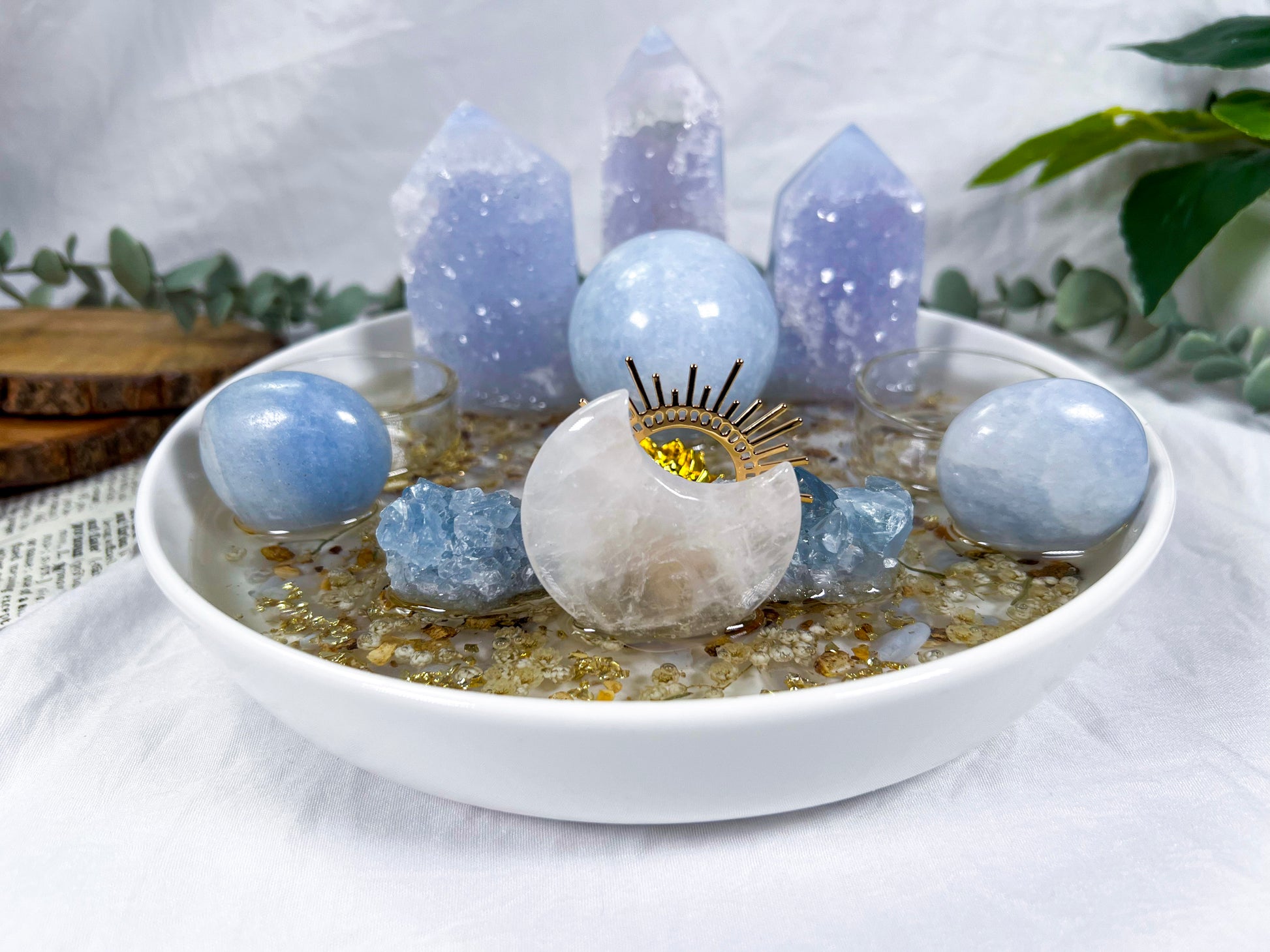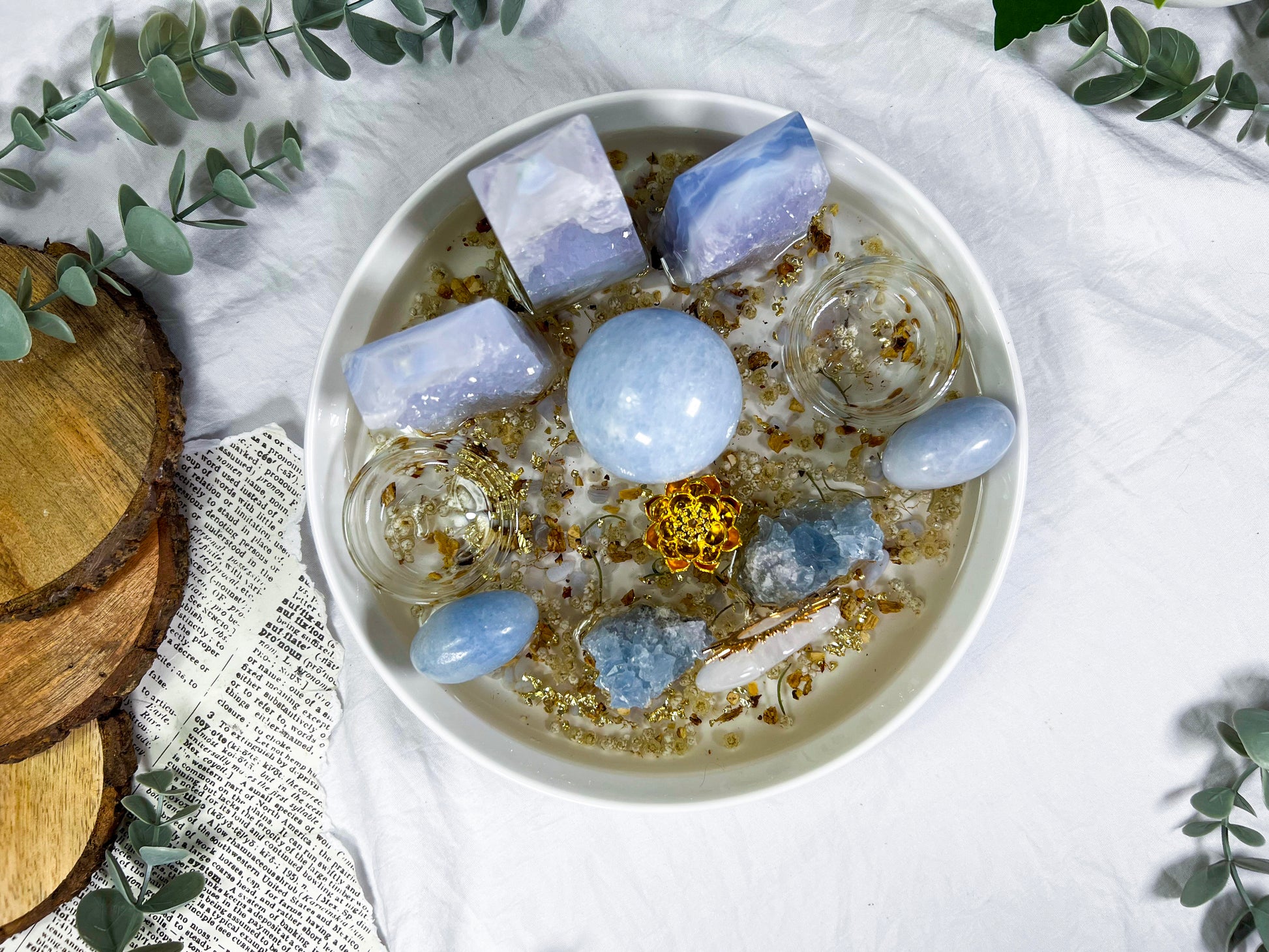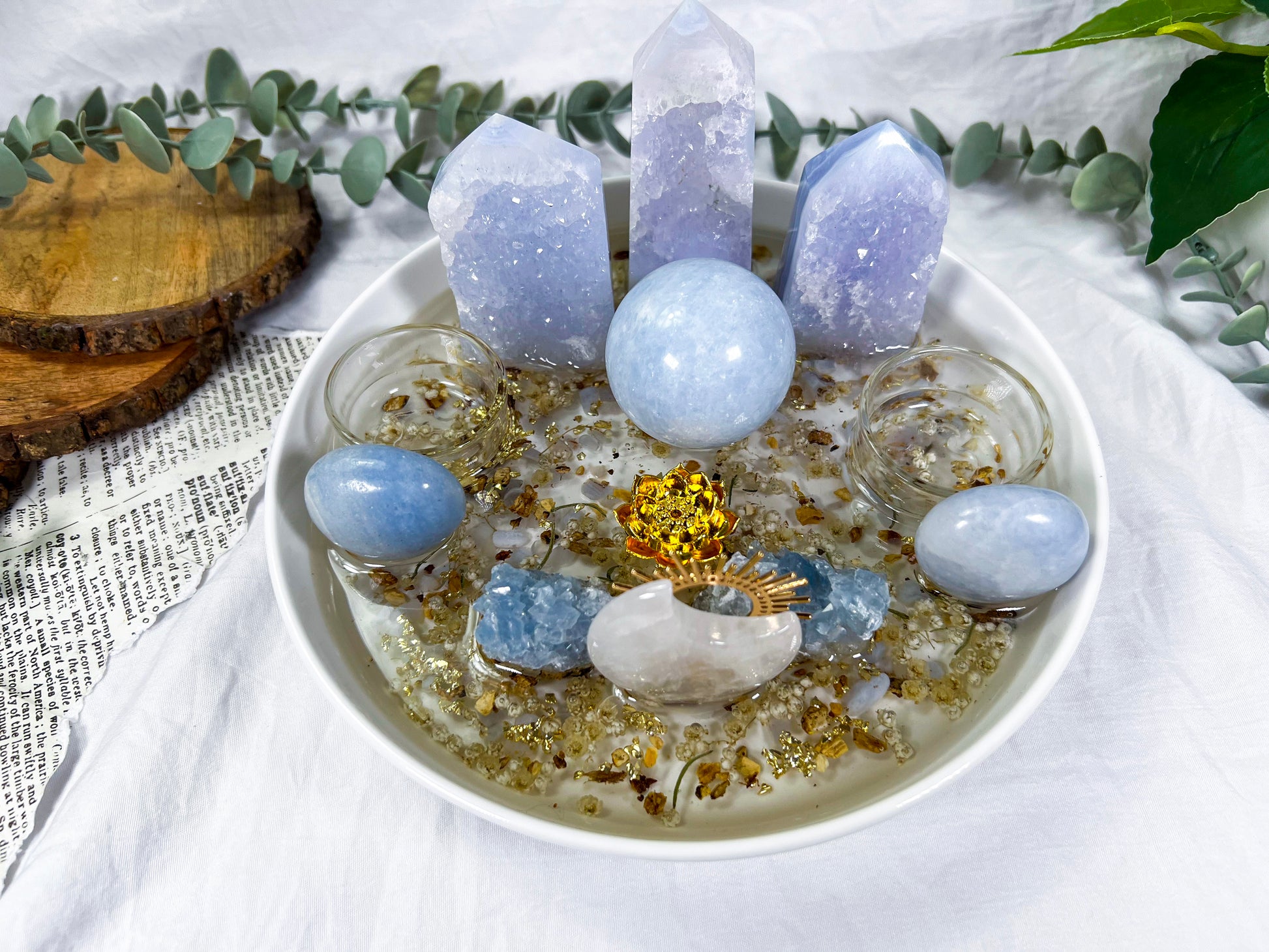 blue chalcedony altar, celestite decor, celestial altar, peaceful energy crystals, spiritual ritual vessel, calming altar decor, crystal centerpiece, moon ritual decor, meditation altar, witchy decor, sacred space tools, intuition crystals, spiritual home decor, crystal display, energy alignment, sky energy altar, ritual setup, soothing crystal decor, mystical centerpiece, altar vessel