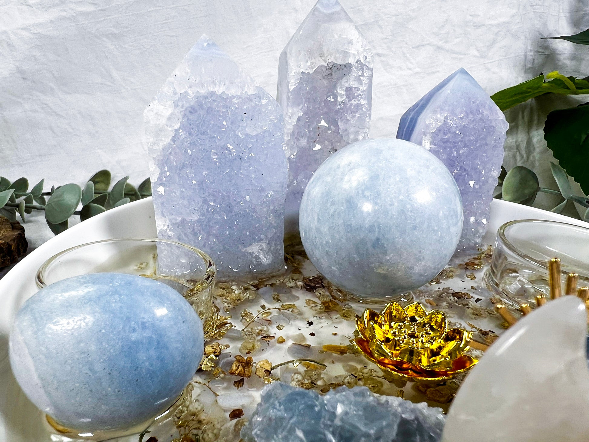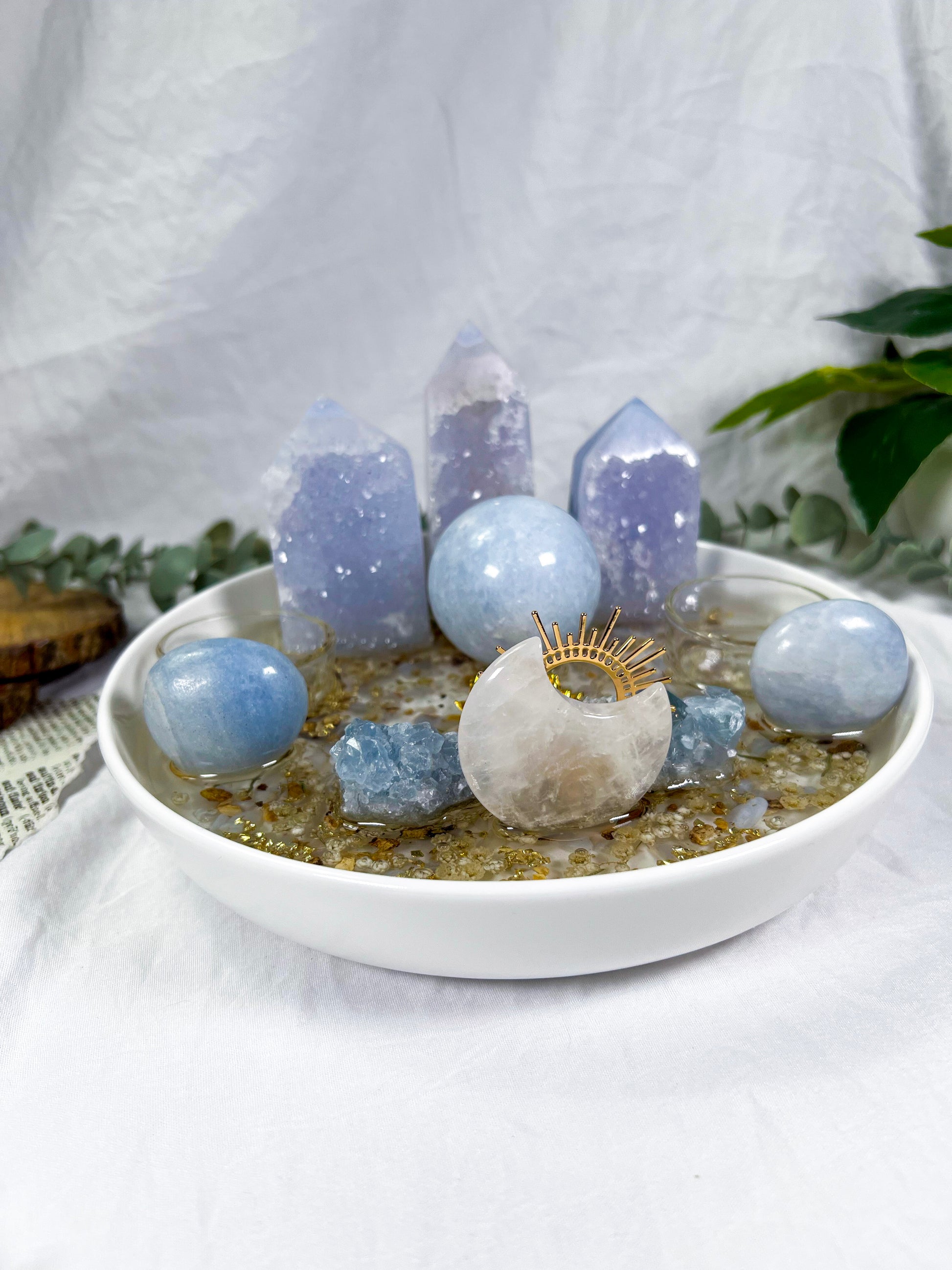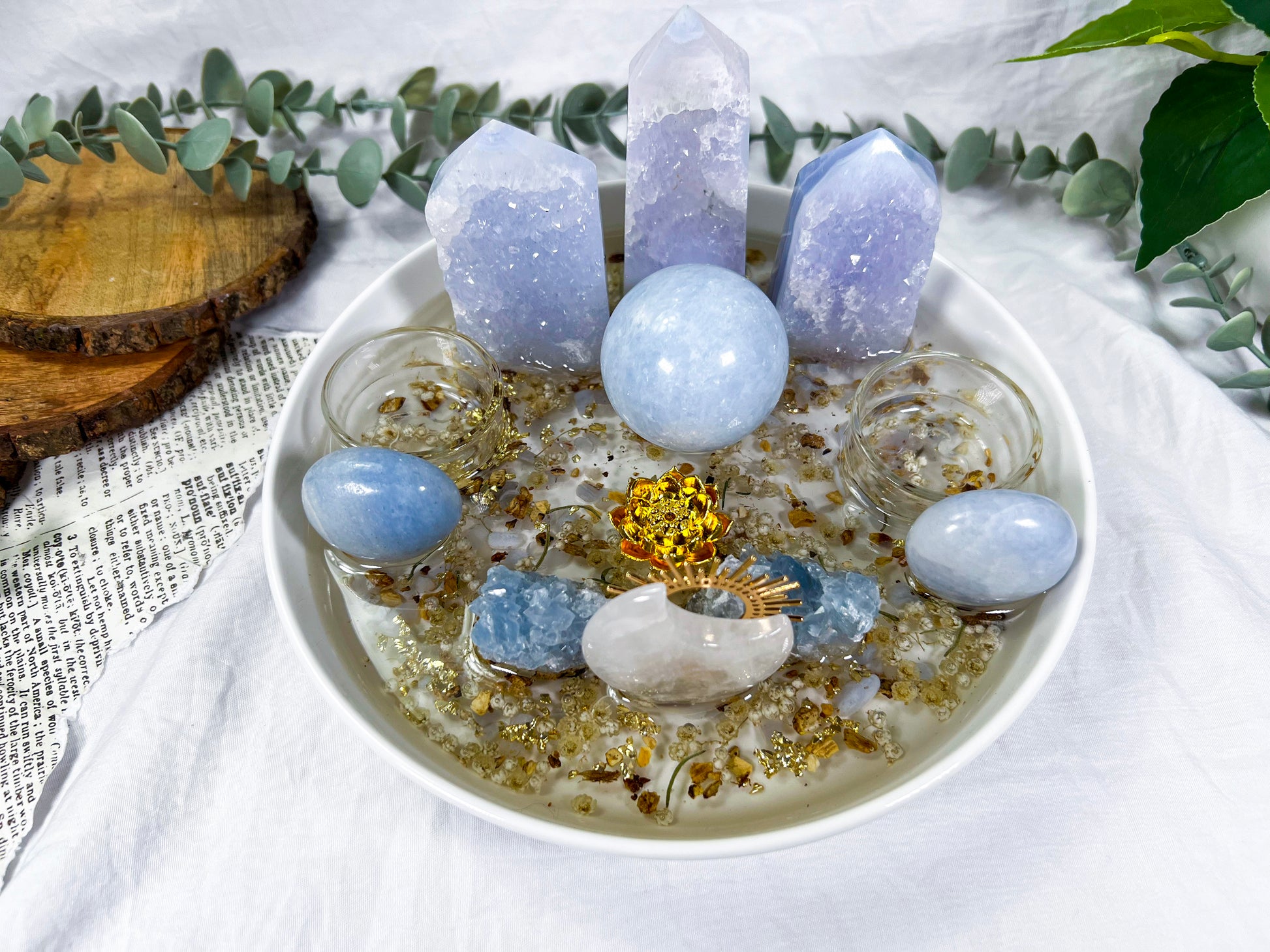 blue chalcedony altar, celestite decor, celestial altar, peaceful energy crystals, spiritual ritual vessel, calming altar decor, crystal centerpiece, moon ritual decor, meditation altar, witchy decor, sacred space tools, intuition crystals, spiritual home decor, crystal display, energy alignment, sky energy altar, ritual setup, soothing crystal decor, mystical centerpiece, altar vessel