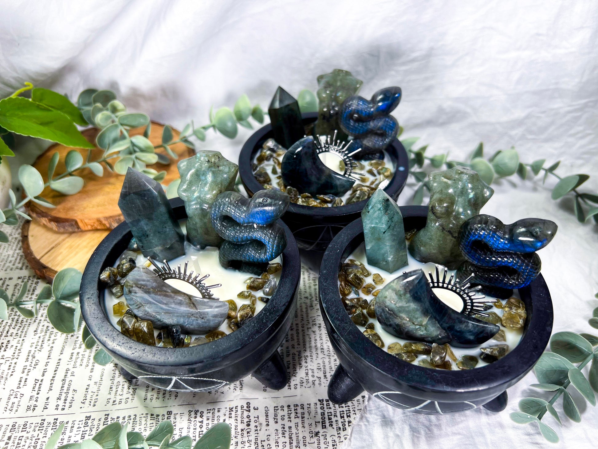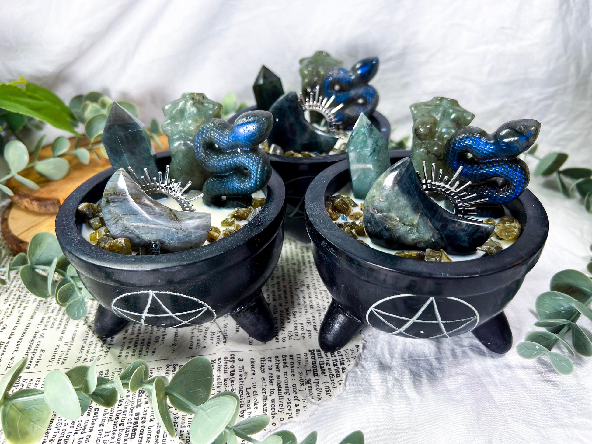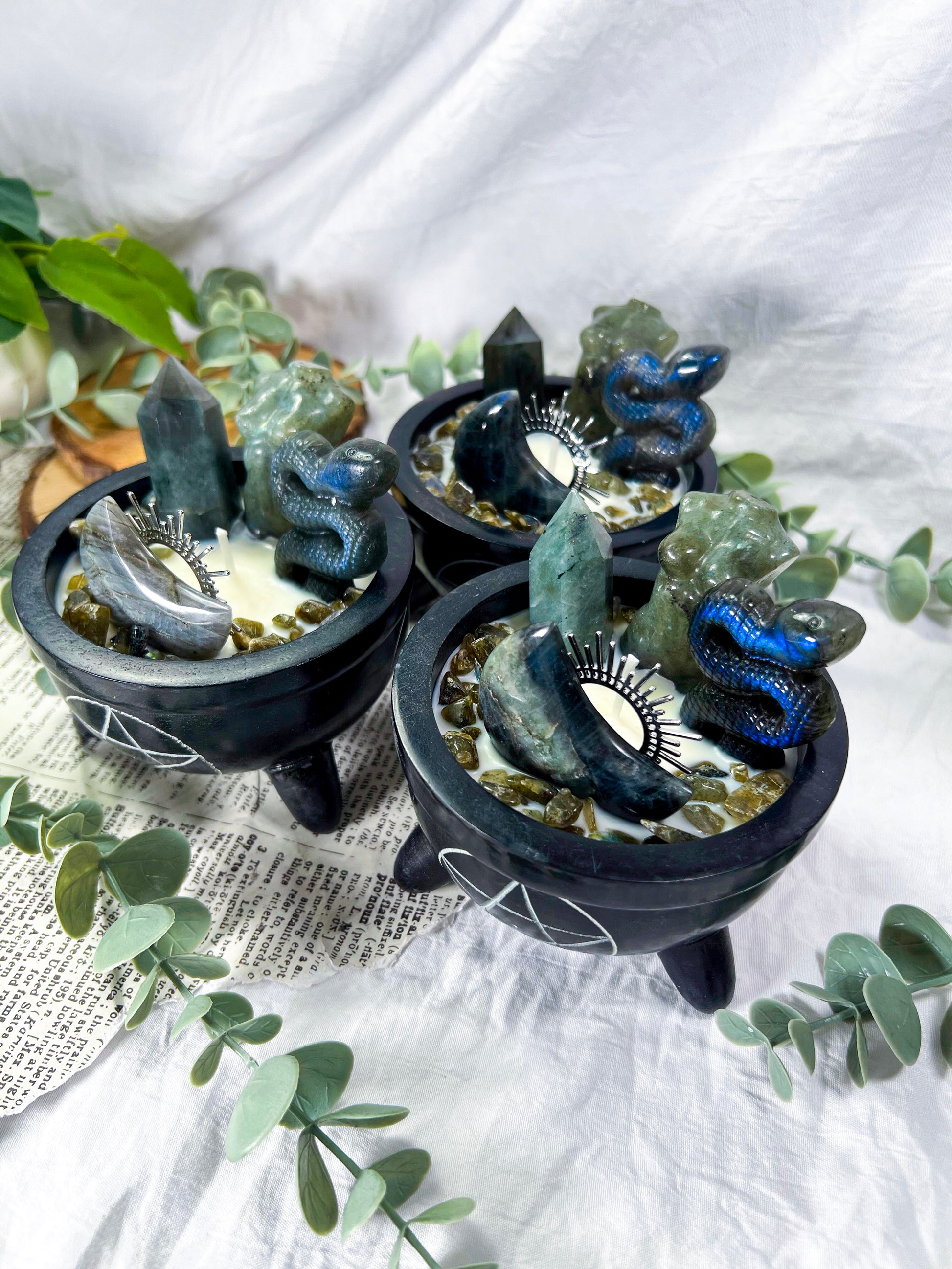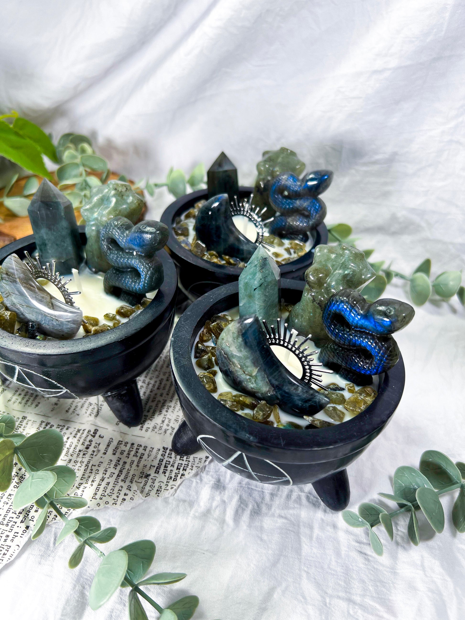 A protective candle designed to support energetic boundaries, inner strength, and divine feminine power. Goddess Ward blends labradorite with serpent symbolism and grounding scent notes of bergamot, patchouli, musk, and leather to create a bold ritual flame for protection and empowerment. Set in a pentacle cauldron vessel and finished with goddess moon and snake elements, this candle is perfect for warding work, shadow integration, or reclaiming personal power.