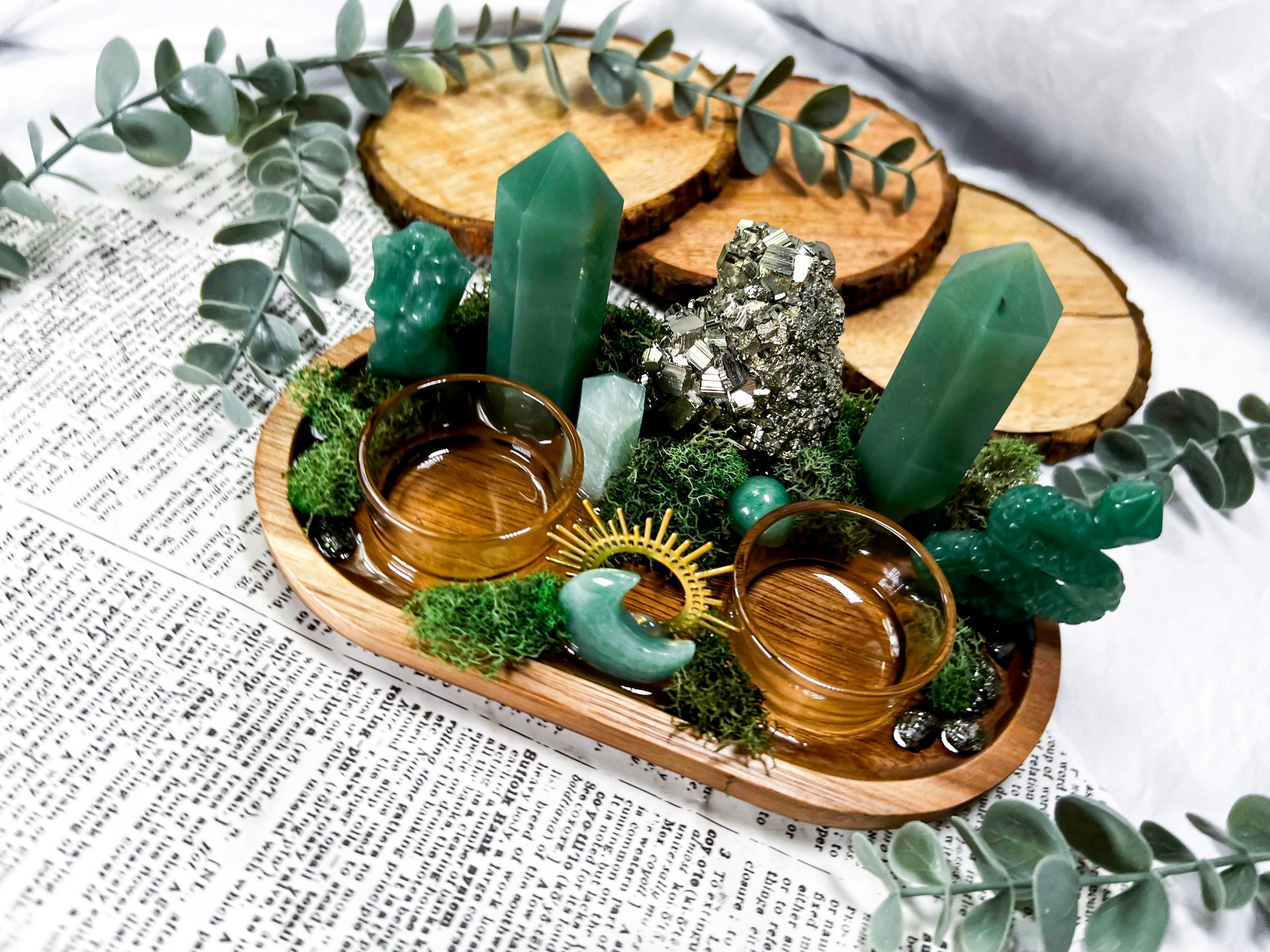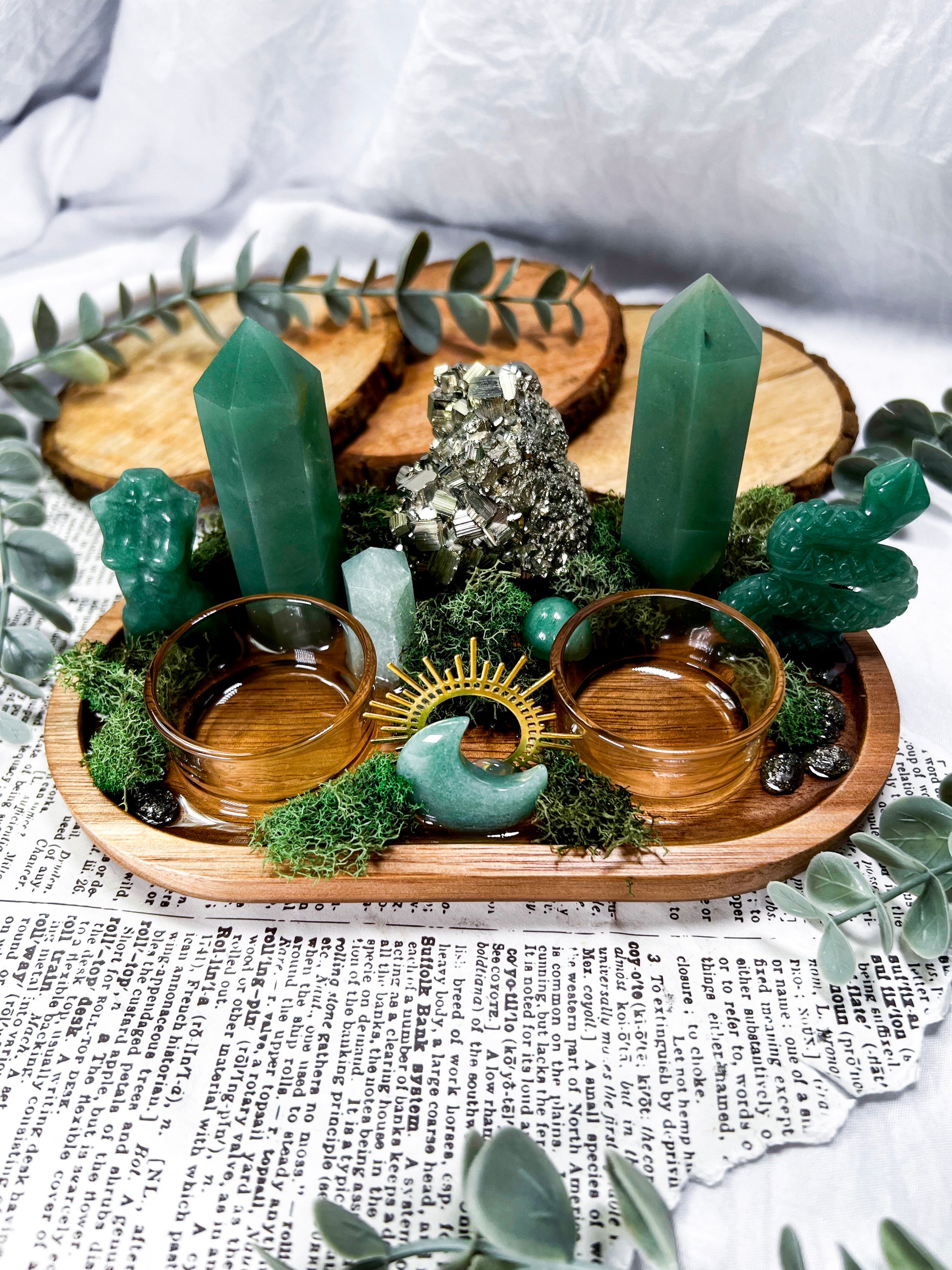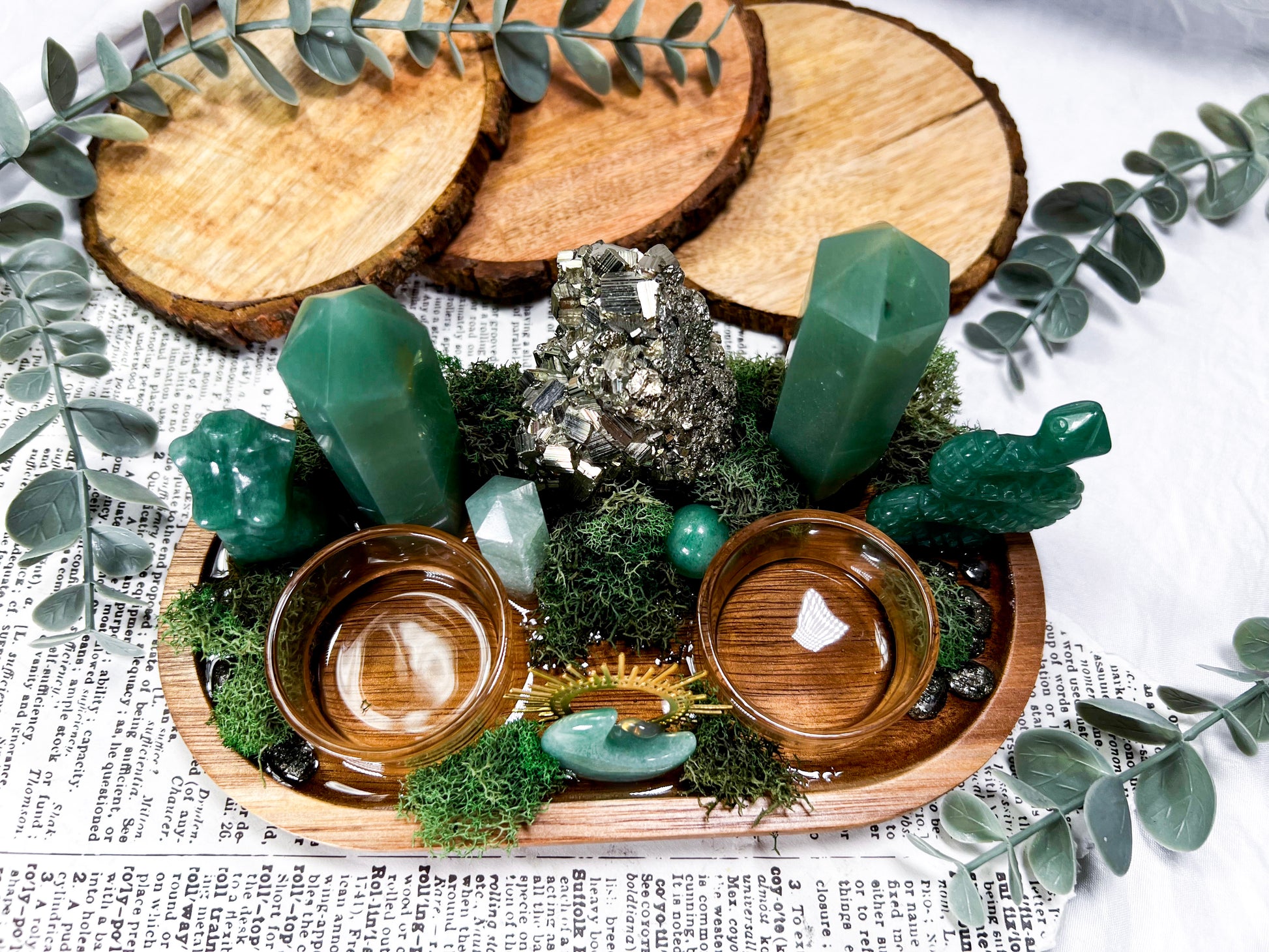 green aventurine · pyrite · abundance altar · prosperity magic · money altar · grounding energy · luck and success · crystal altar · handmade altar set · witchy home decor · earth magic · manifestation ritual · moss decor · wooden altar