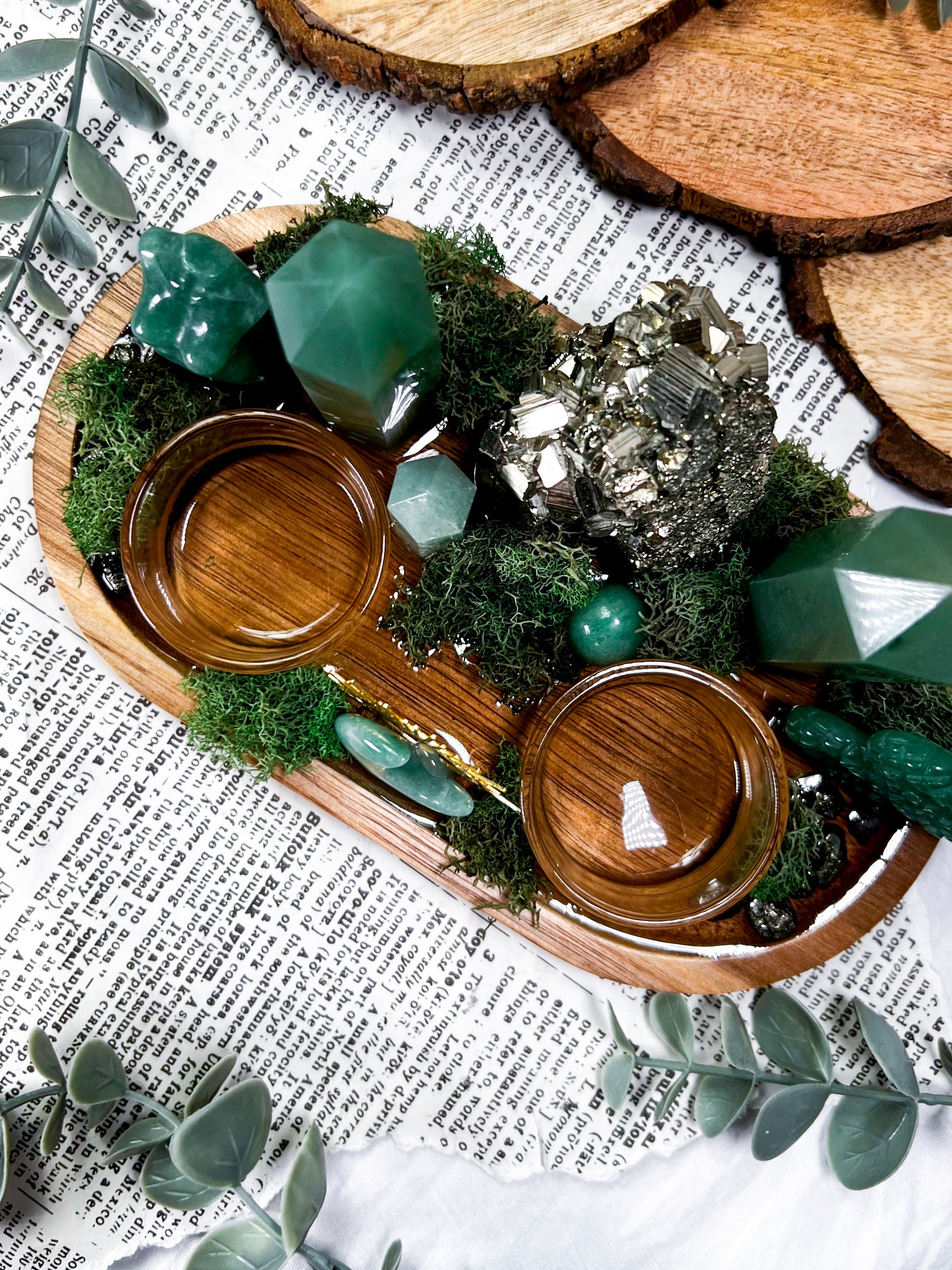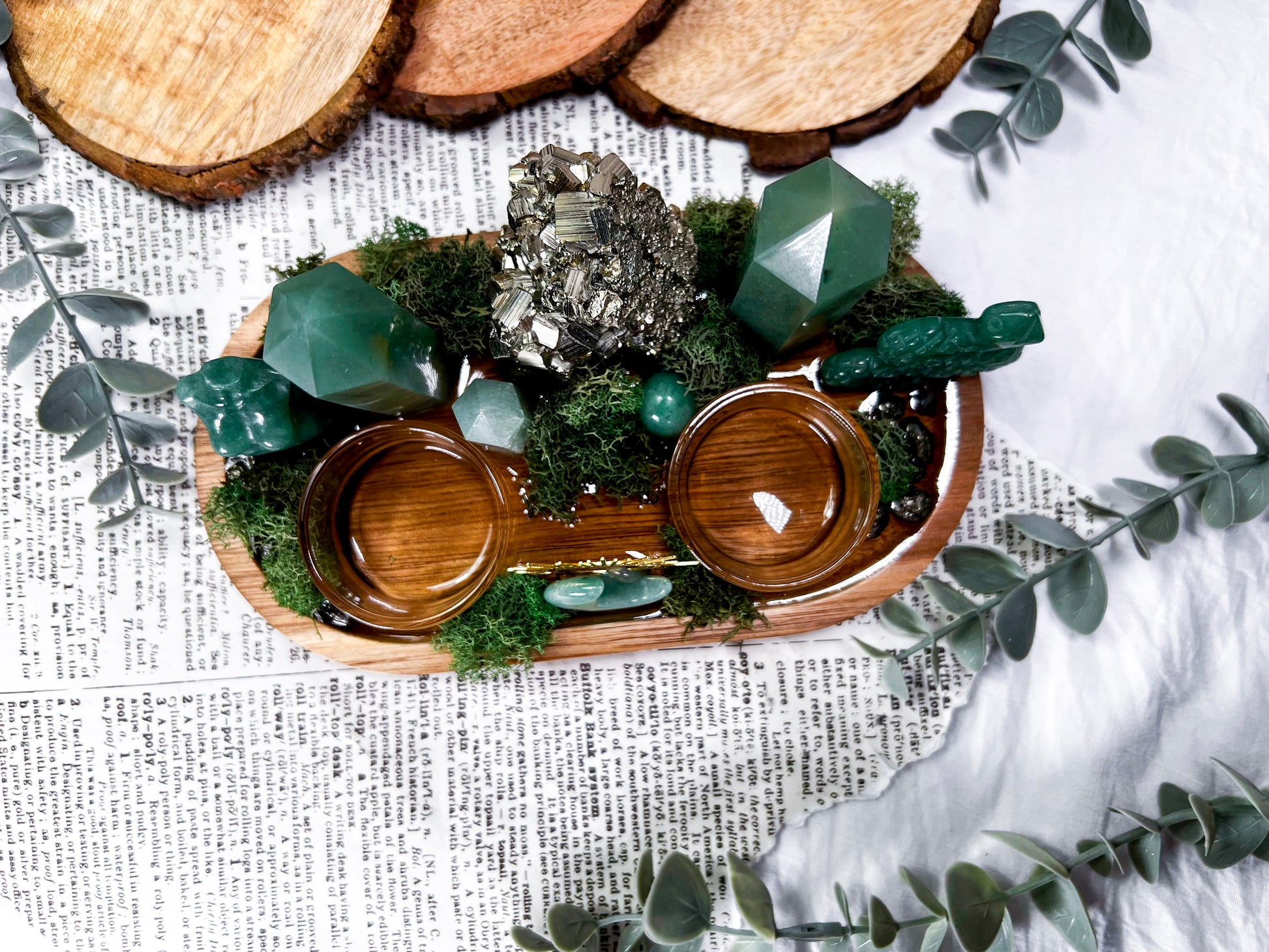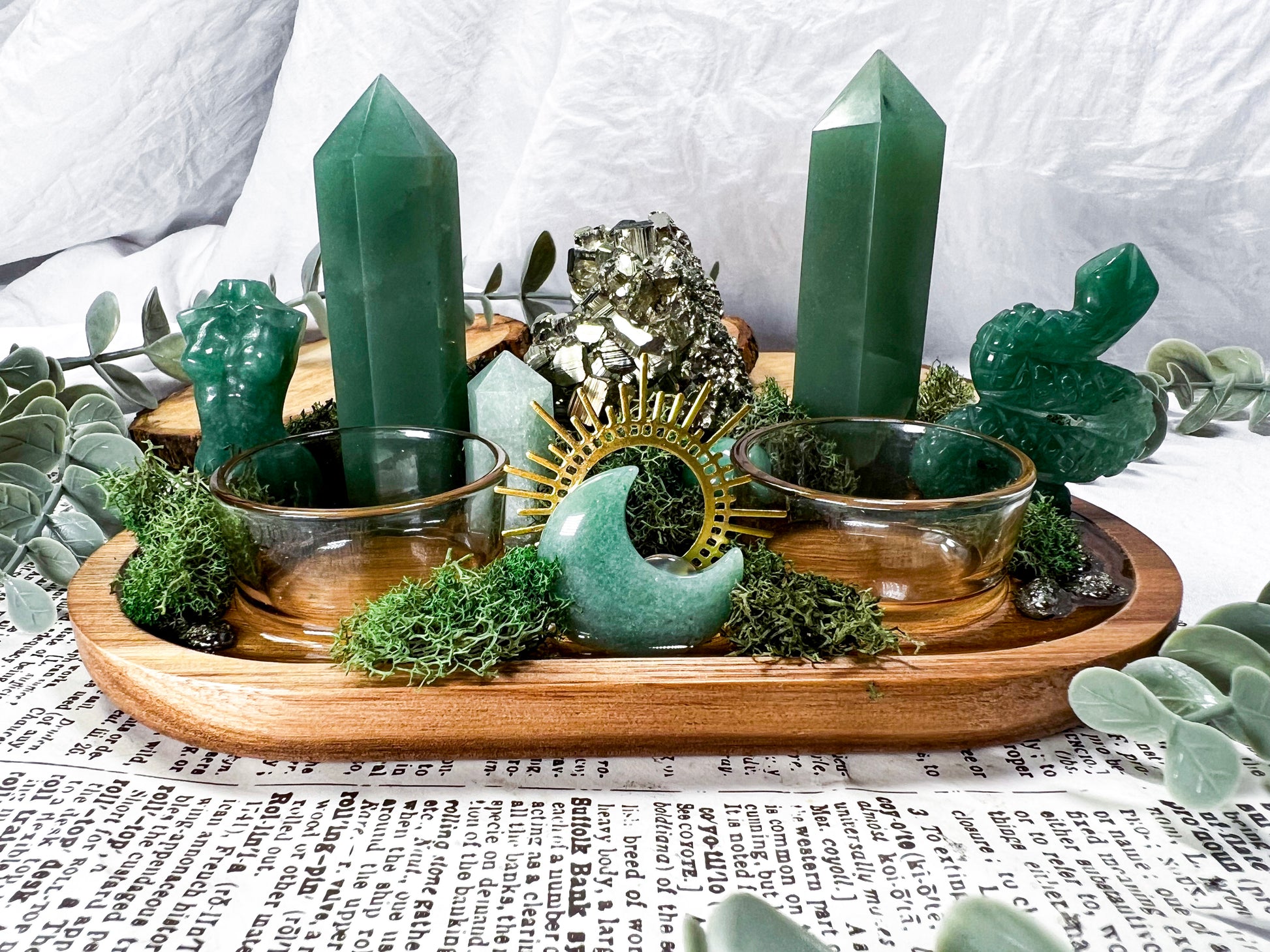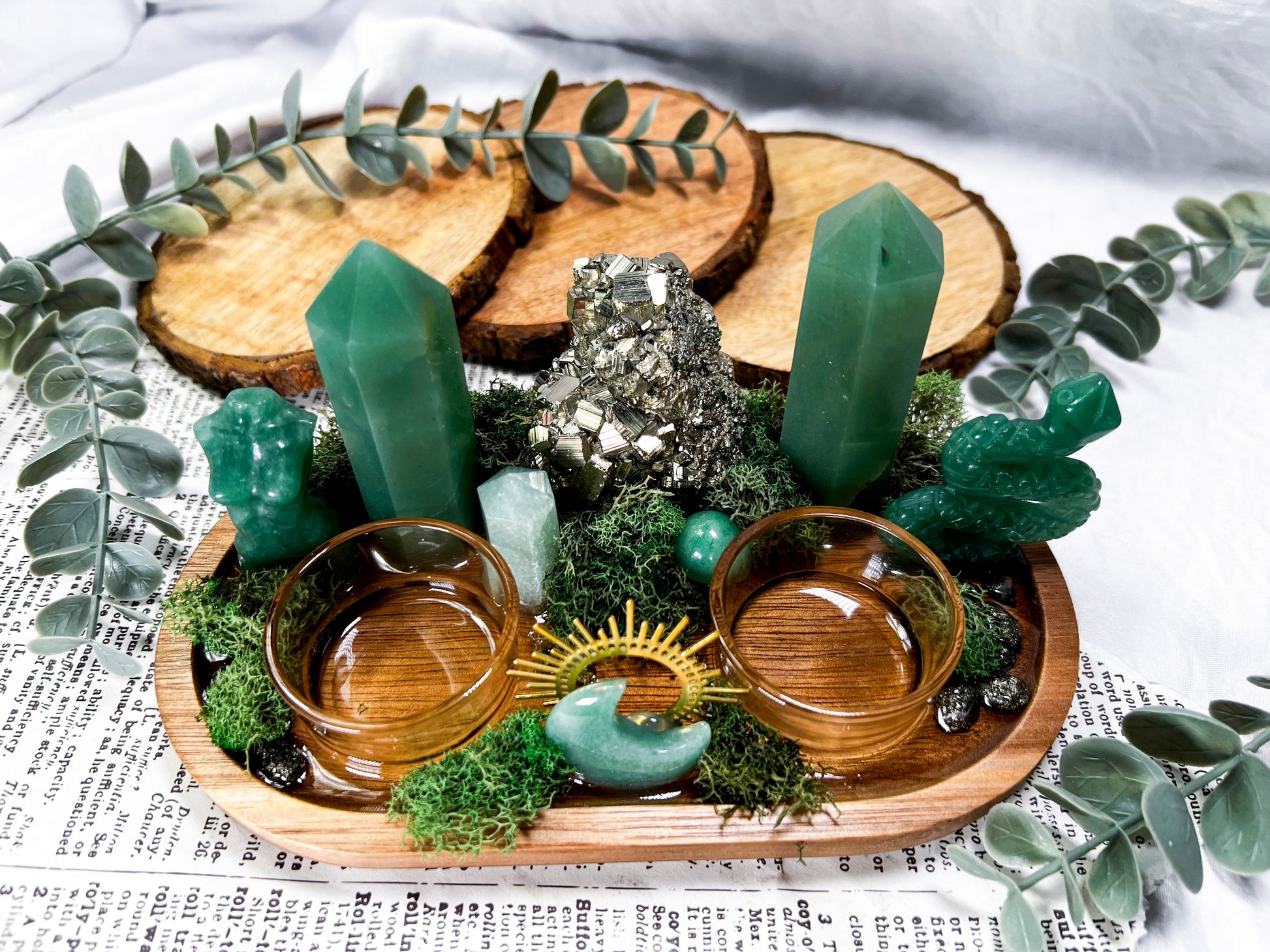 green aventurine · pyrite · abundance altar · prosperity magic · money altar · grounding energy · luck and success · crystal altar · handmade altar set · witchy home decor · earth magic · manifestation ritual · moss decor · wooden altar