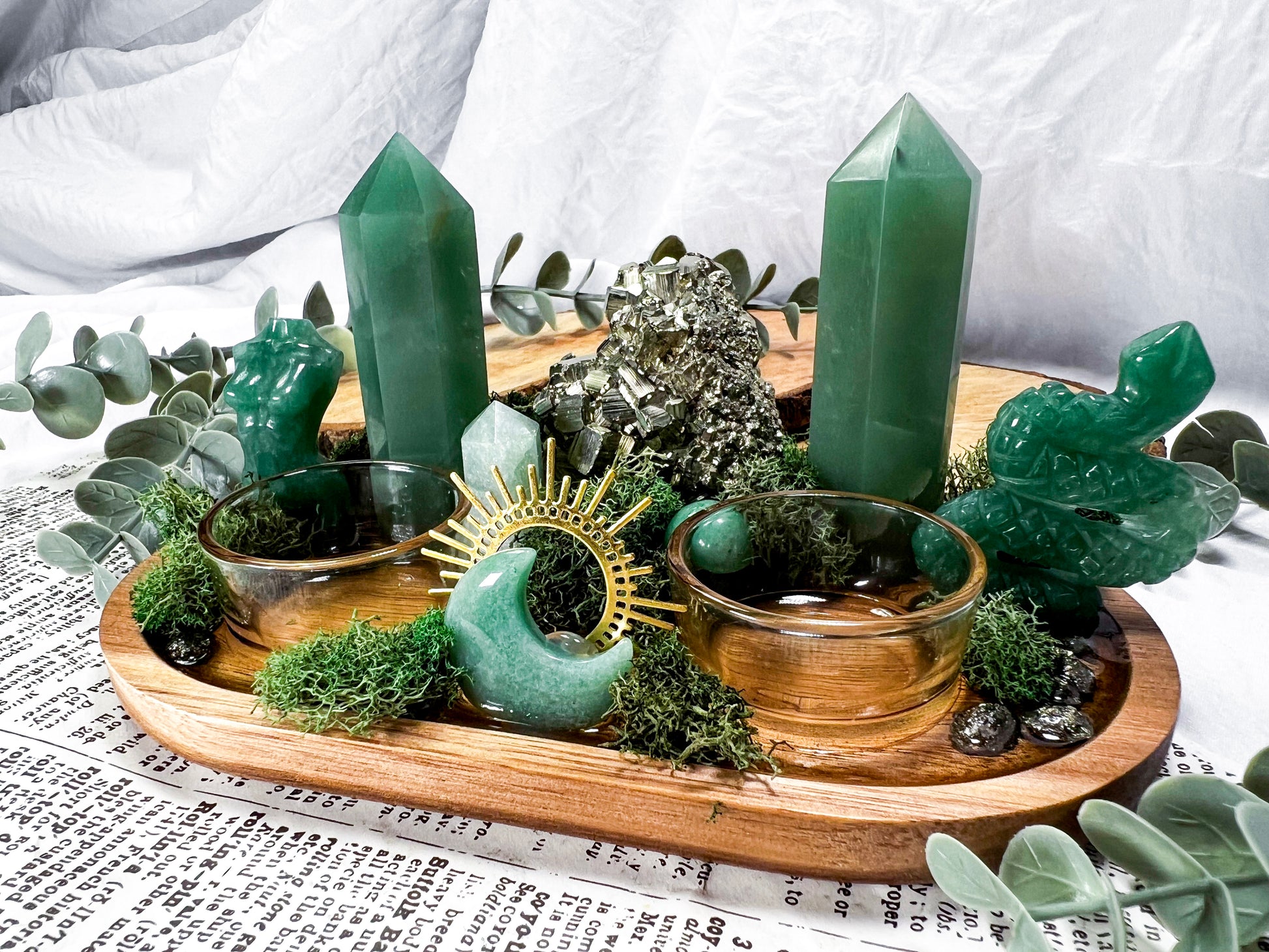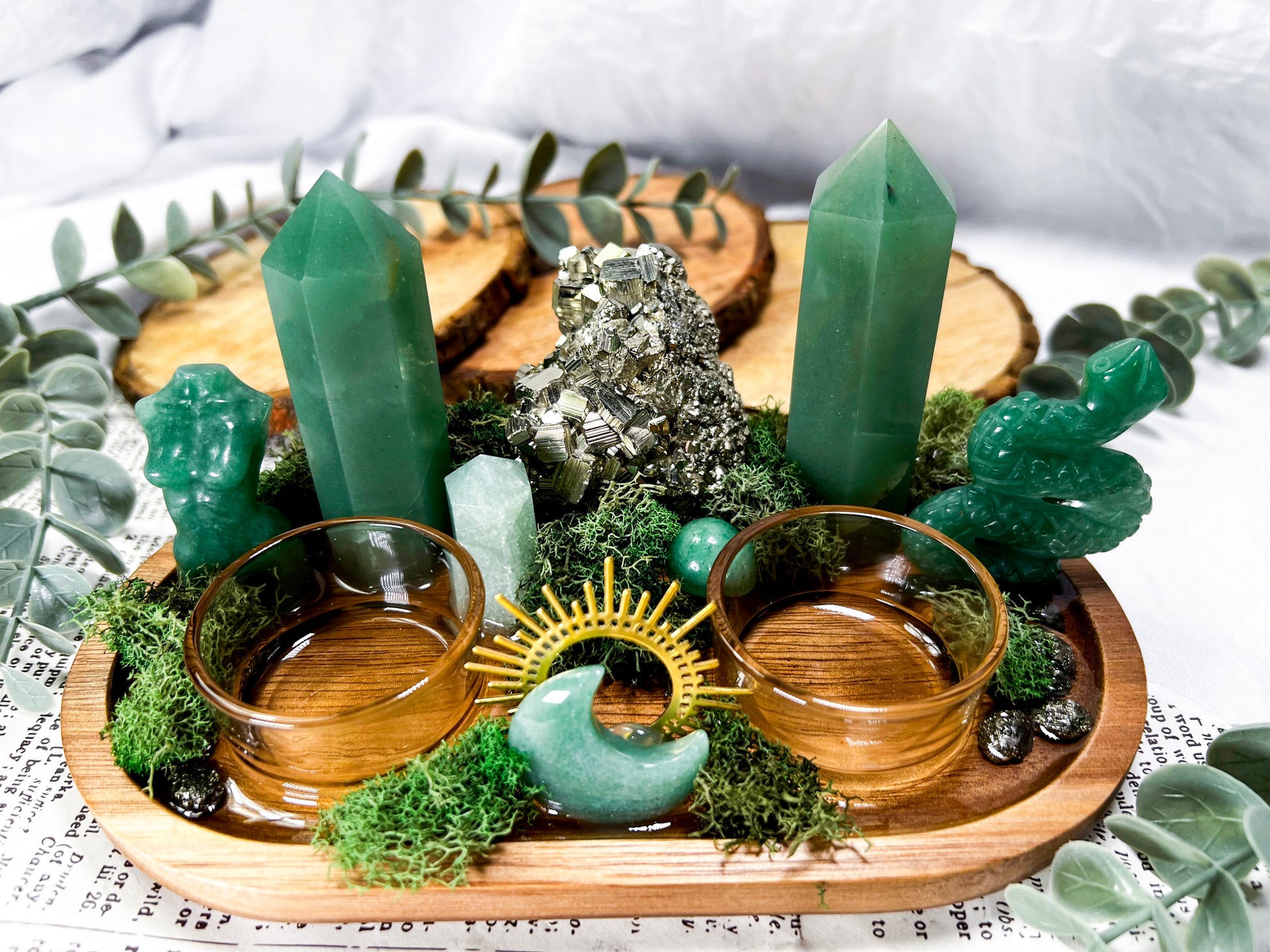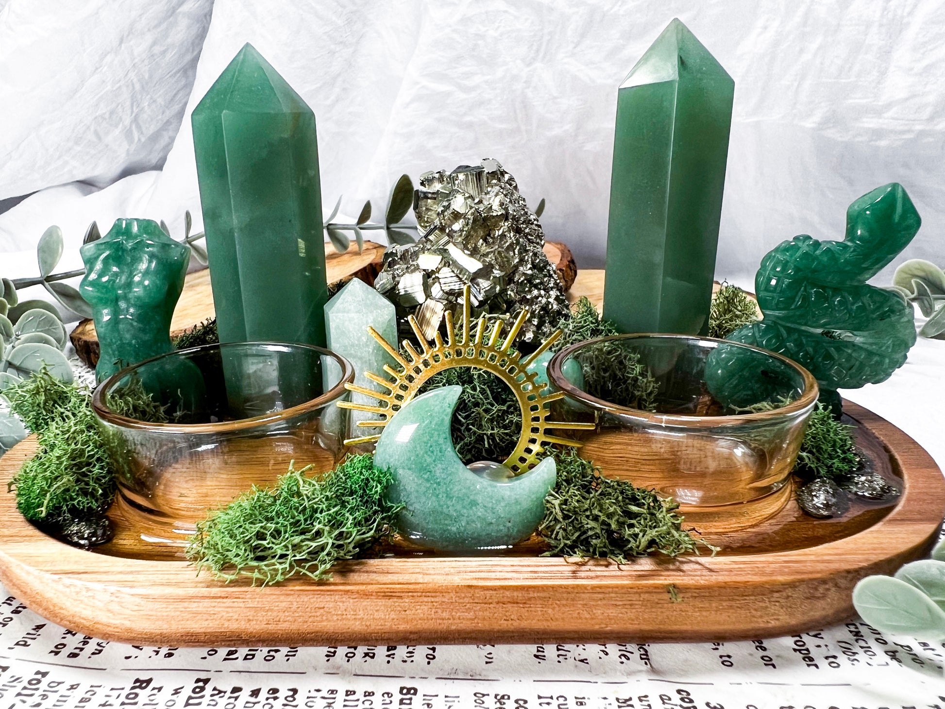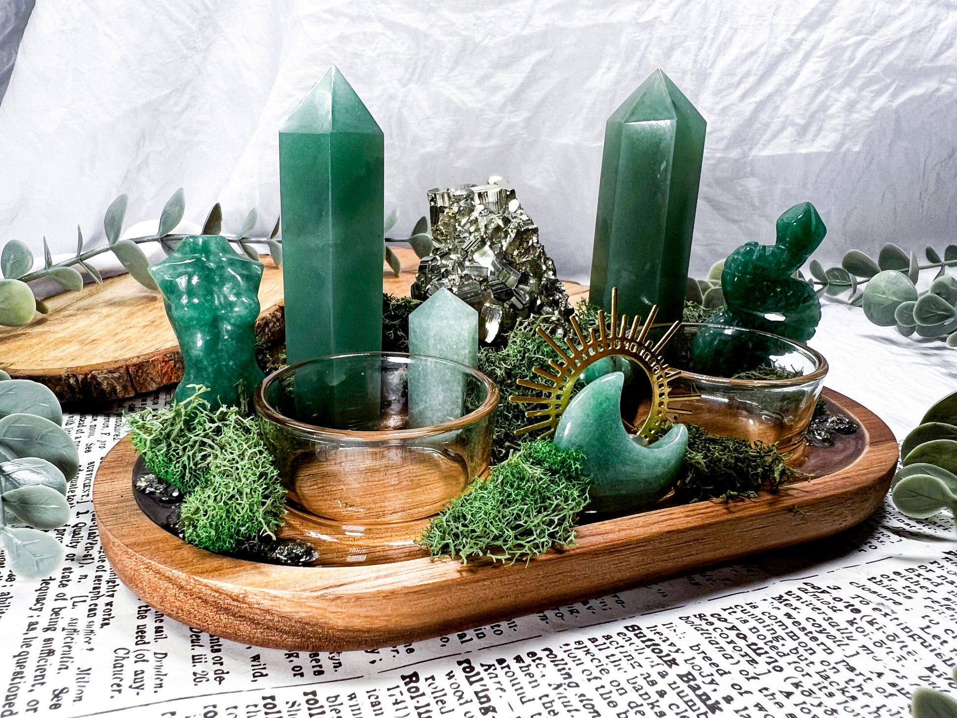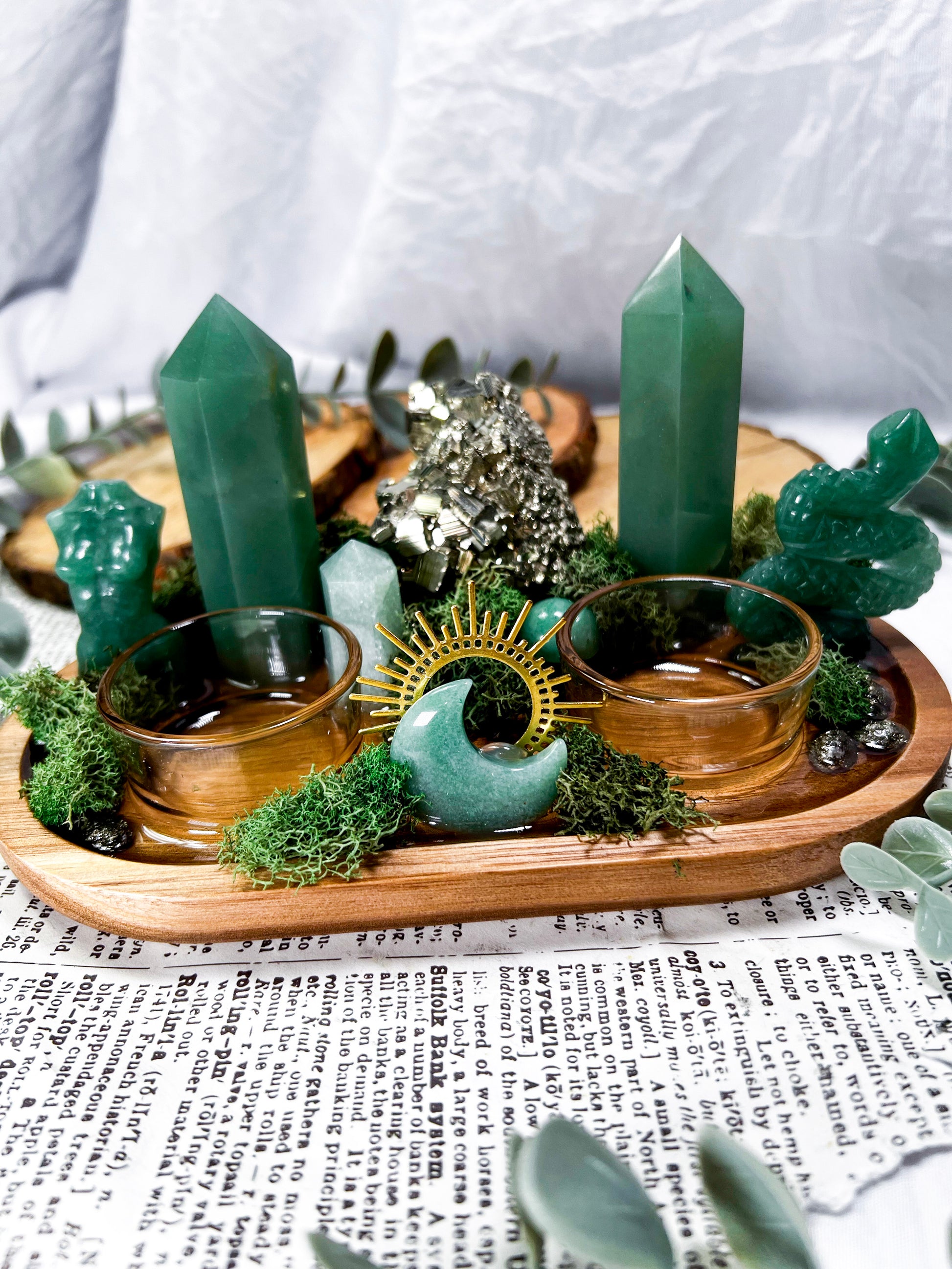 Each altar includes two tealight holders, a gold sun charm, a green aventurine snake, two towers, a mini tower, a goddess figure, and a mushroom carving. Together they form a living symbol of luck, growth, and ambition rooted in earth magic.