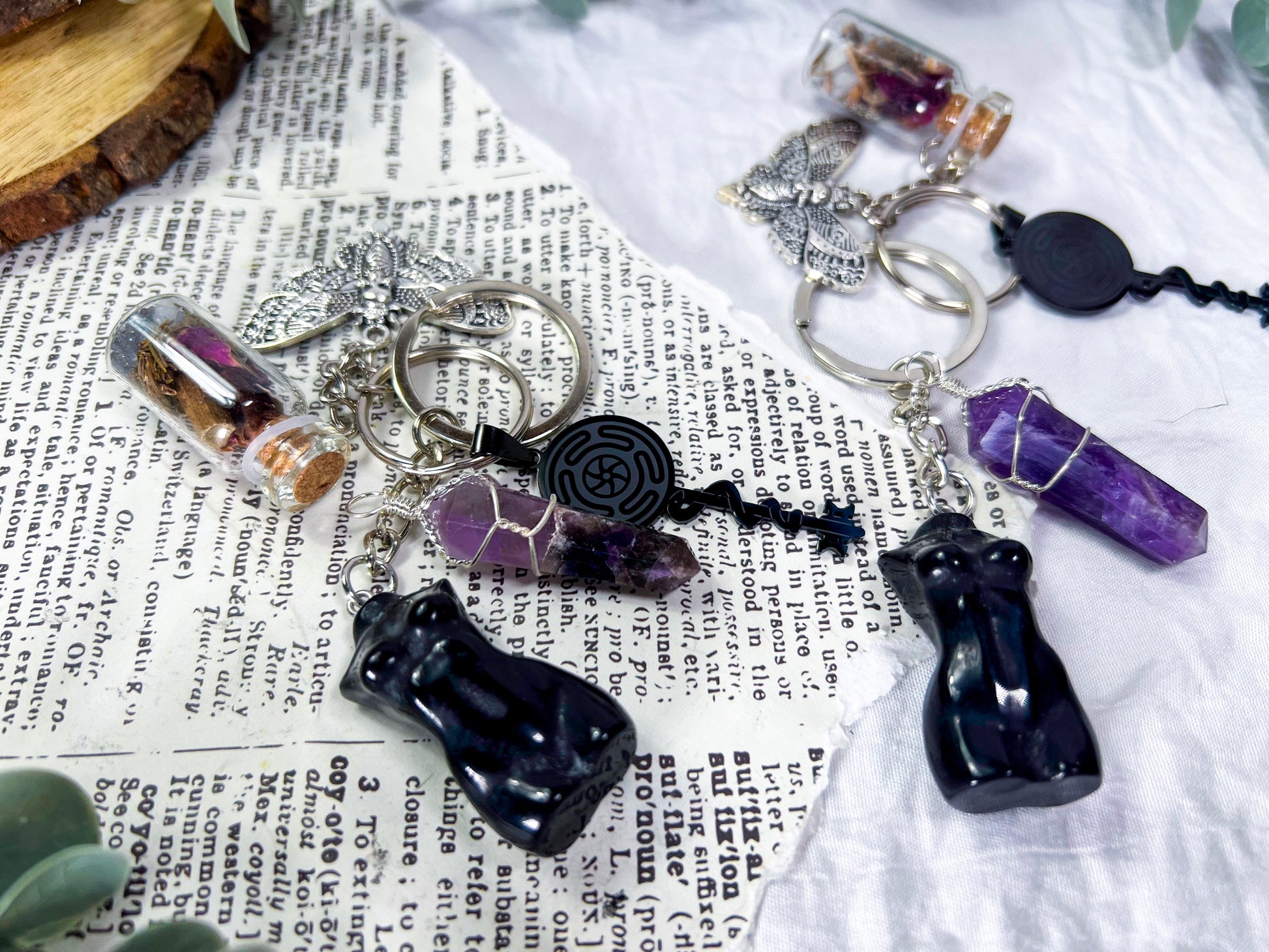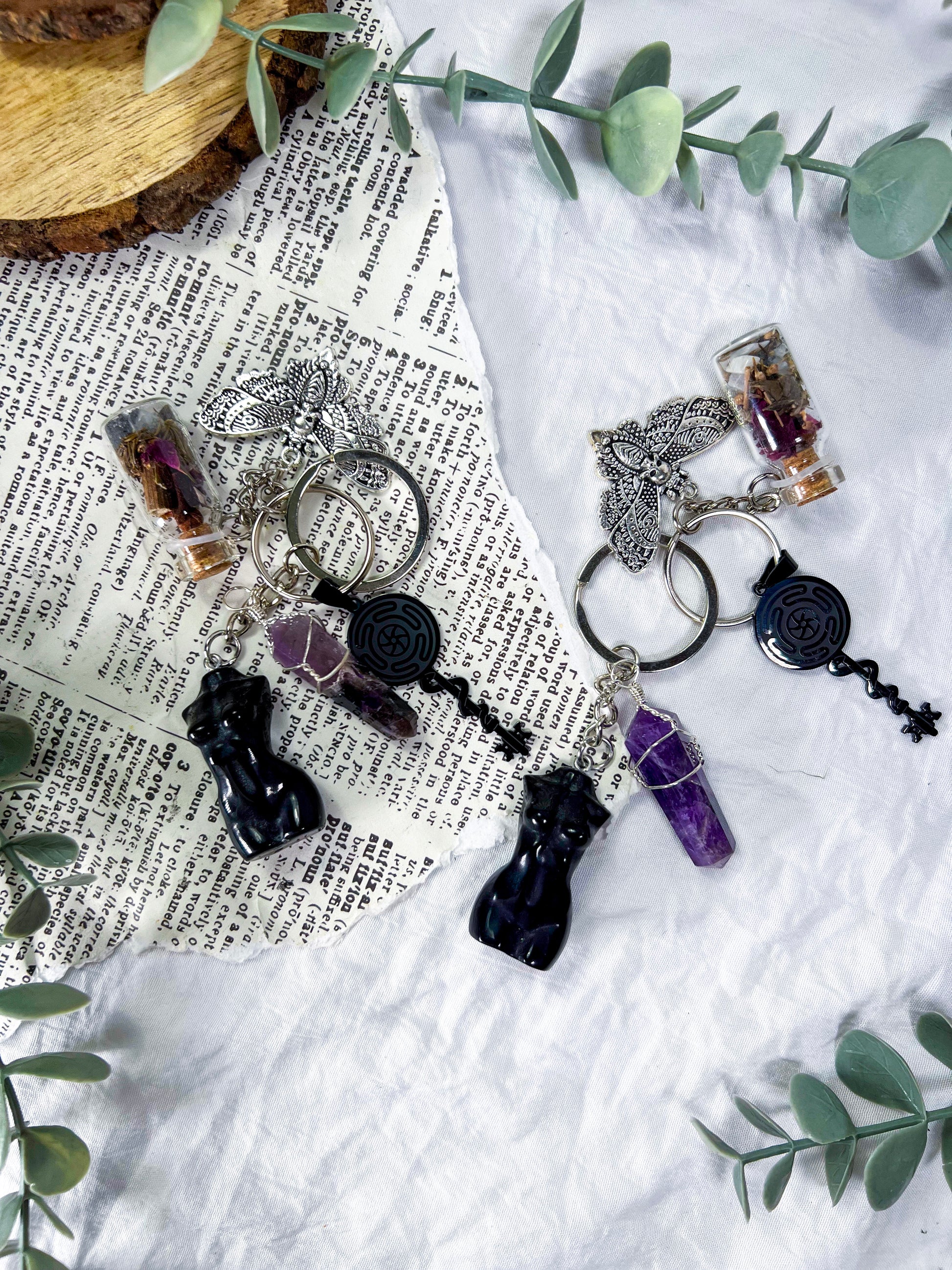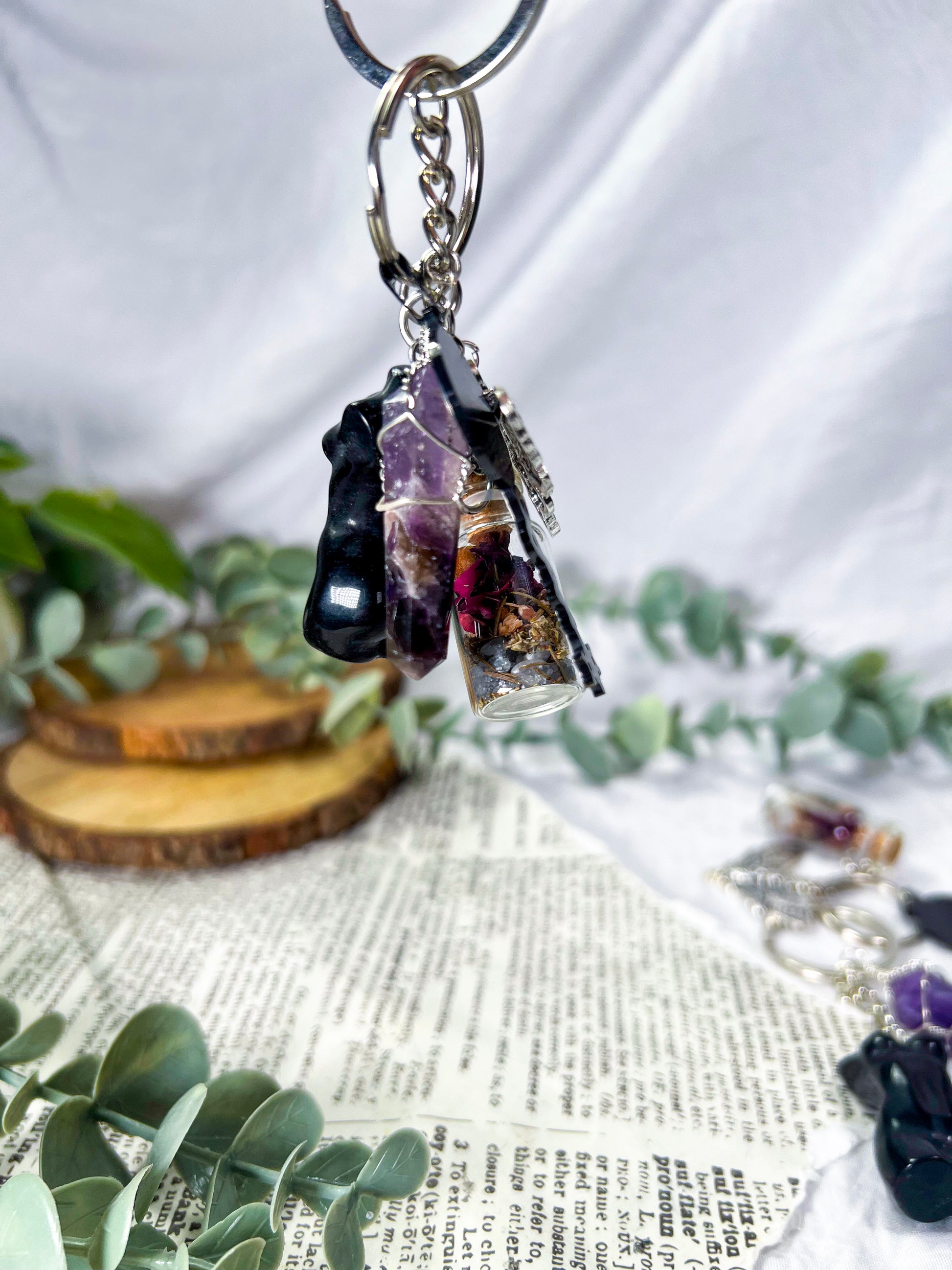 Each keychain is intentionally assembled to help you strengthen boundaries, move through shadow with clarity, and feel supported by protective energy.