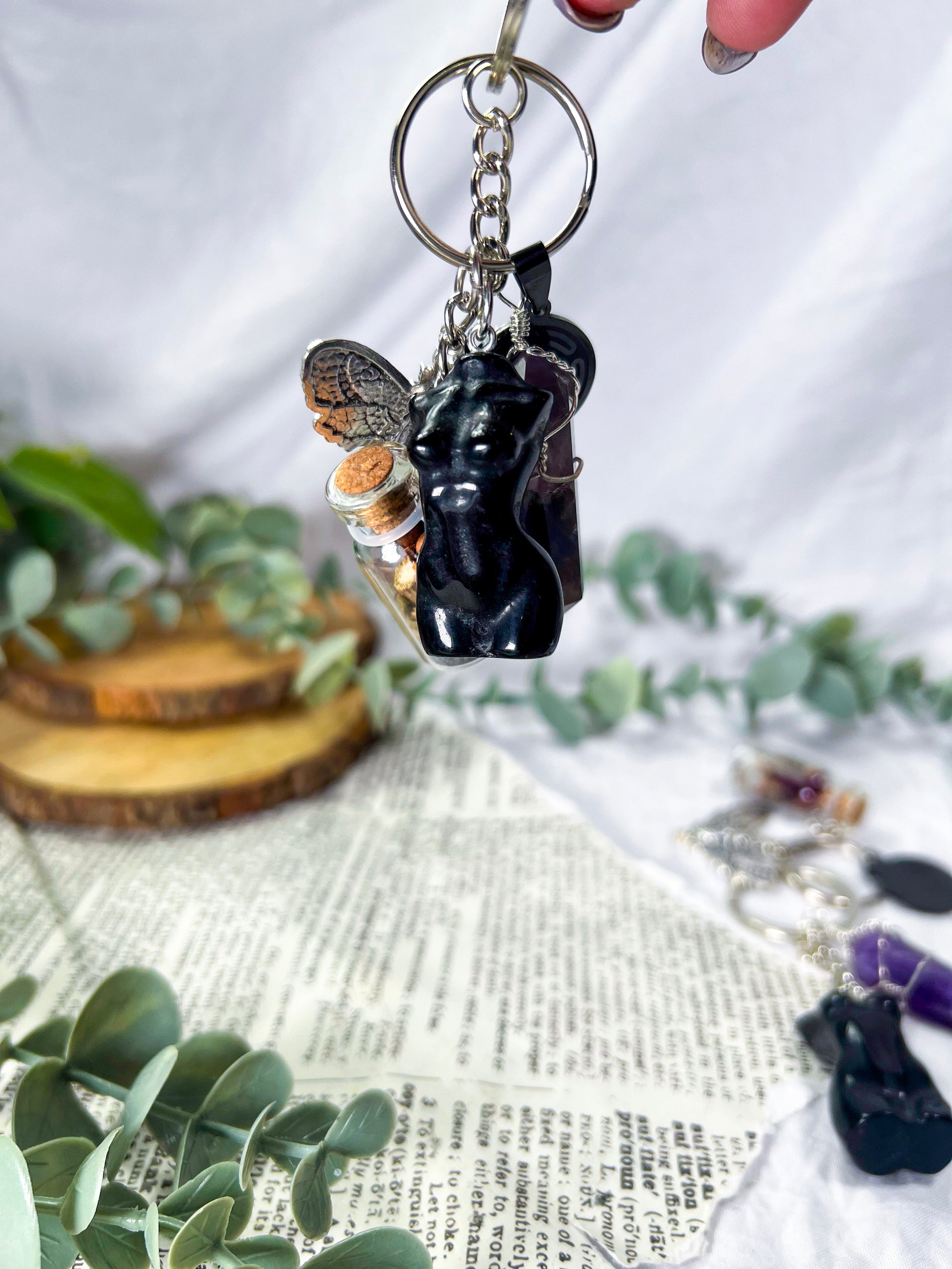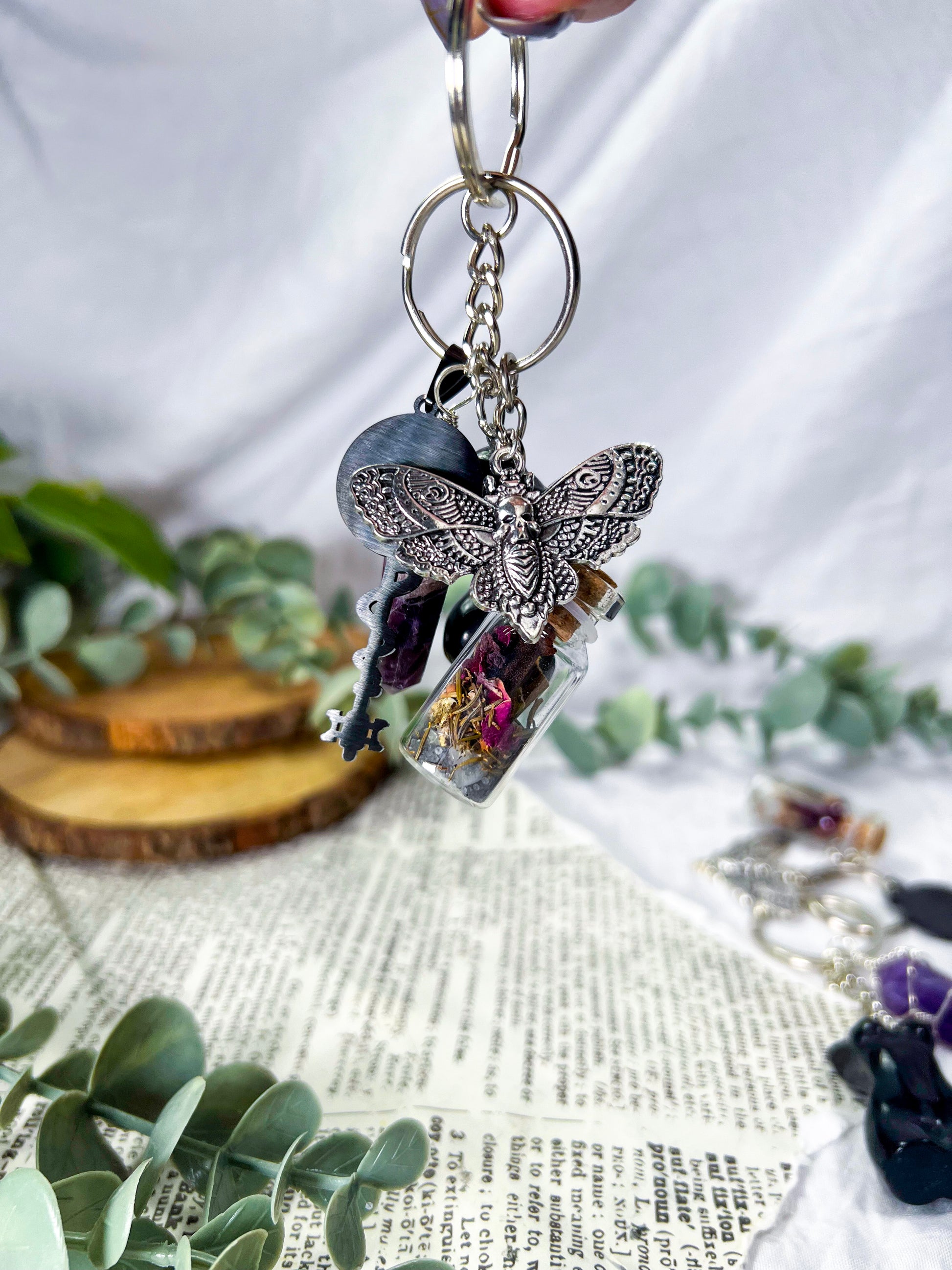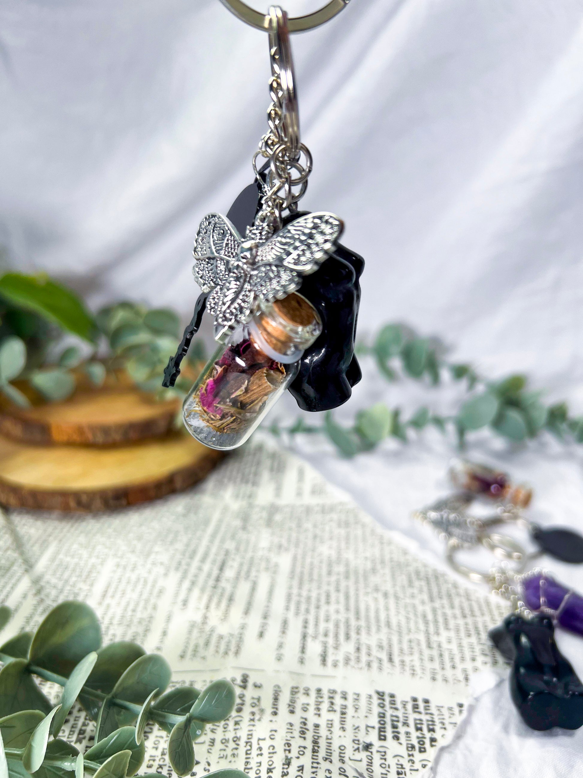 A protective ritual keychain designed to support energetic boundaries, shadow guidance, and spiritual protection. Hekate Protection features an obsidian goddess, amethyst point, and a mini spell jar filled with wormwood, clove, moonstone, and rose, paired with a luna moth charm and Hekate’s Wheel charm. This powerful portable talisman is crafted for warding, transition work, and honoring liminal spaces. Perfect for keys, bags, or travel altars when you need protection on the go.
