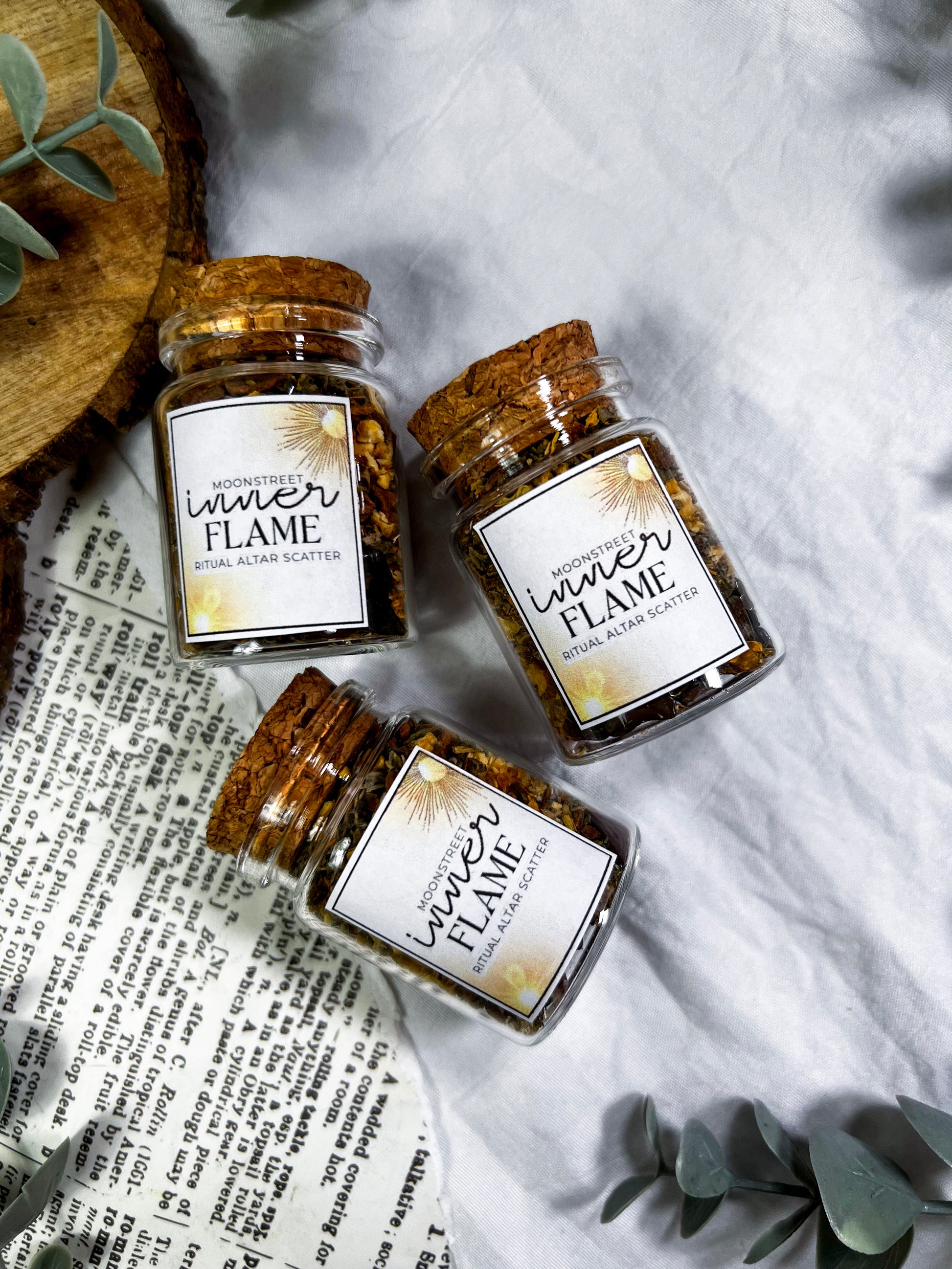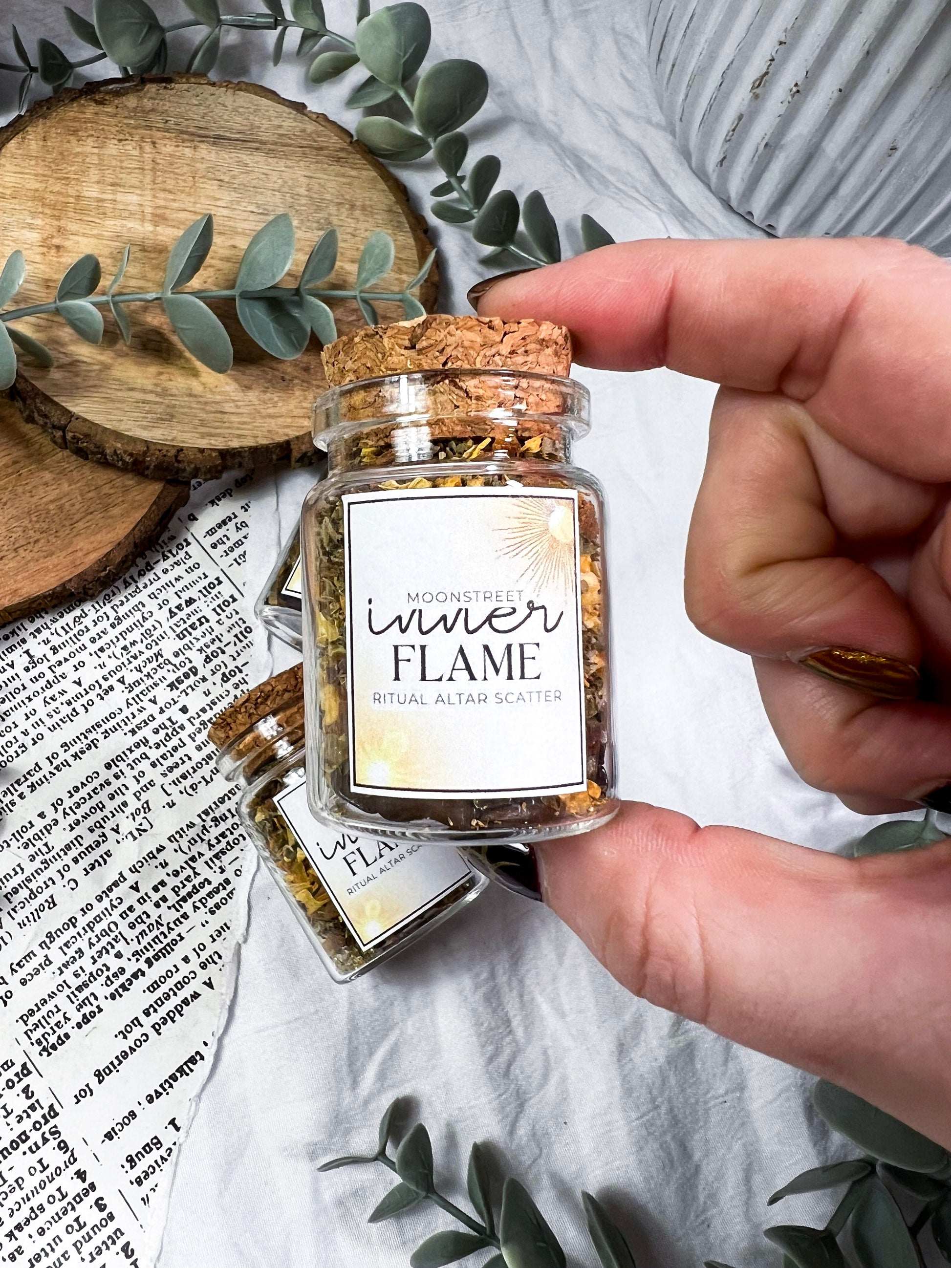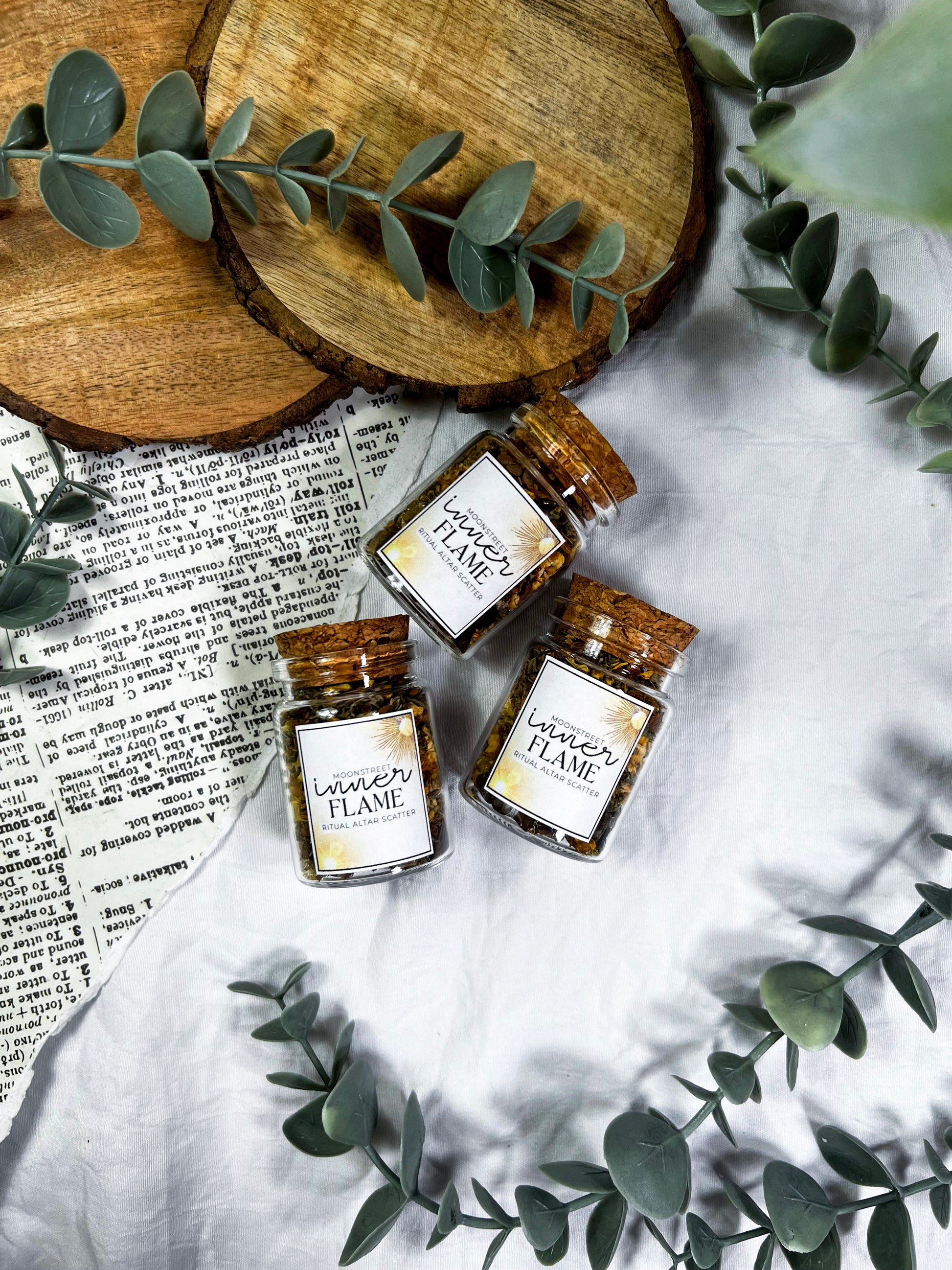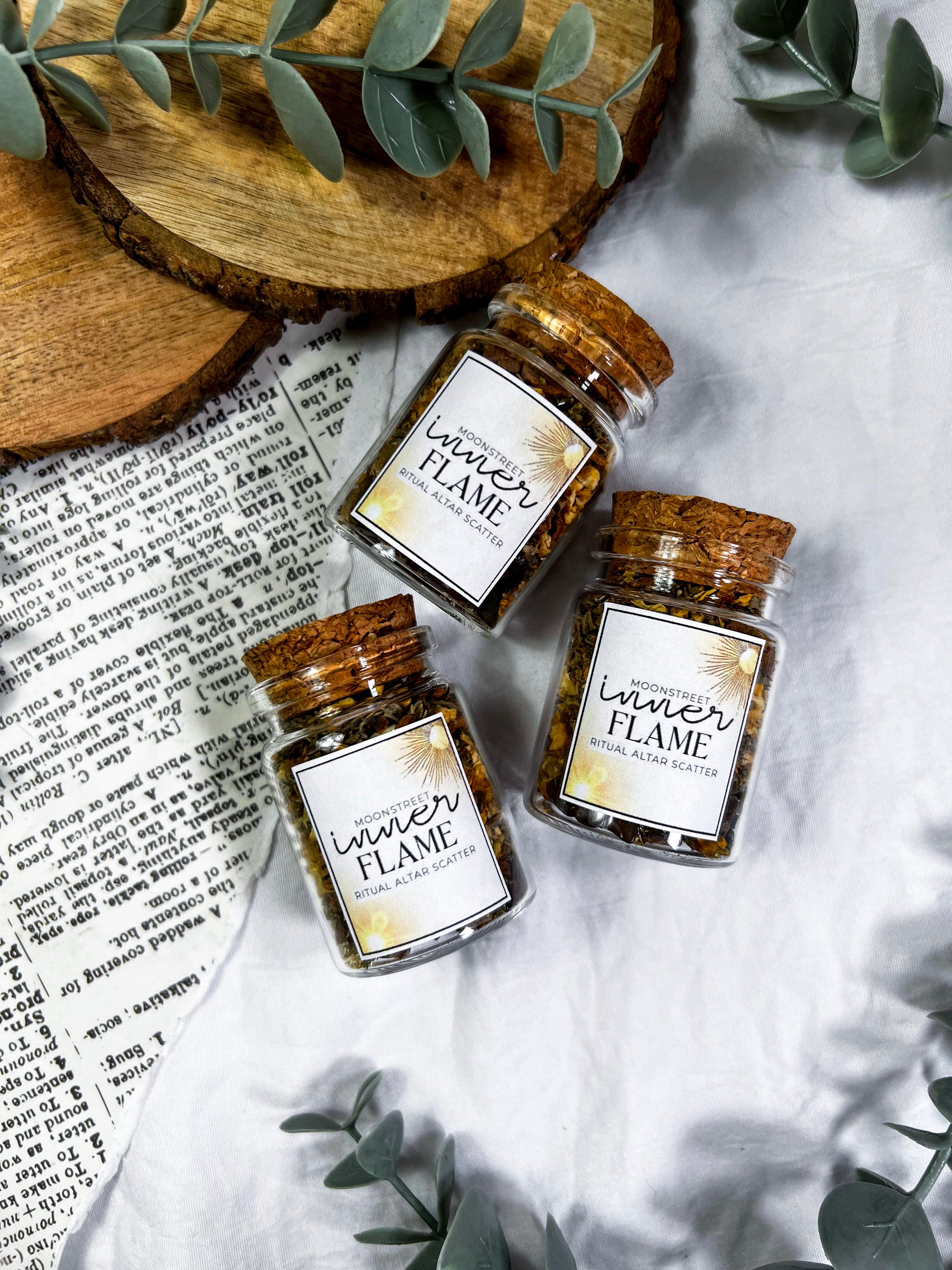 Inner Flame is a mini ritual scatter crafted to spark motivation, confidence, and a strong sense of personal power. The blend combines bright herbs and energizing crystal chips to help you reconnect with your inner drive and move with intention. Use it around candles, in spell bowls, on your altar, or during manifestation work when you need a warm push forward. Inner Flame is designed to help you step into your strength and take action with clarity.