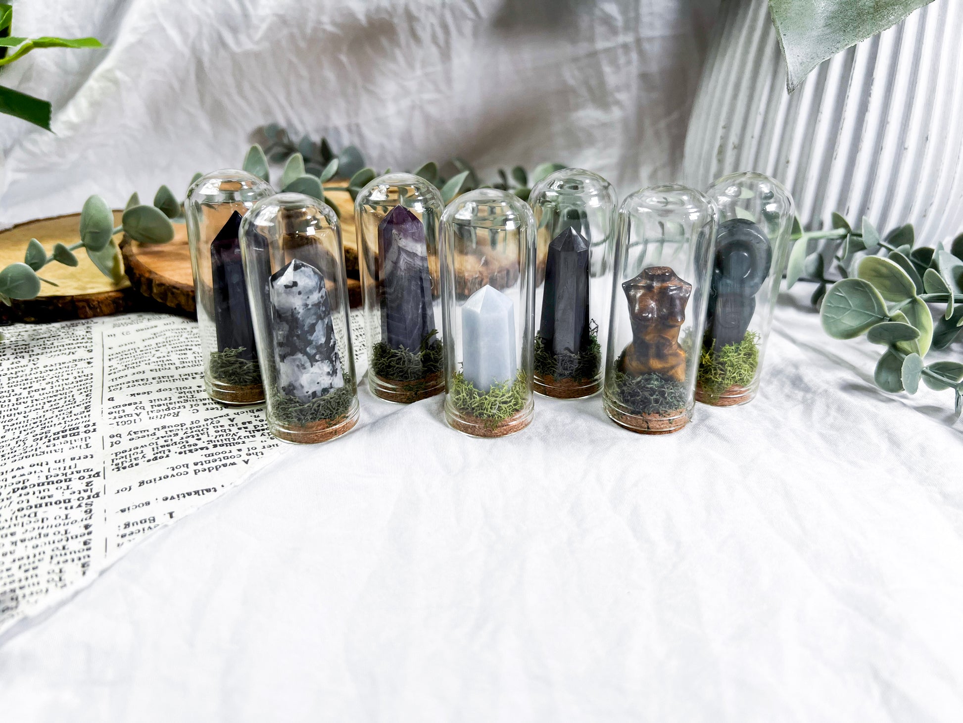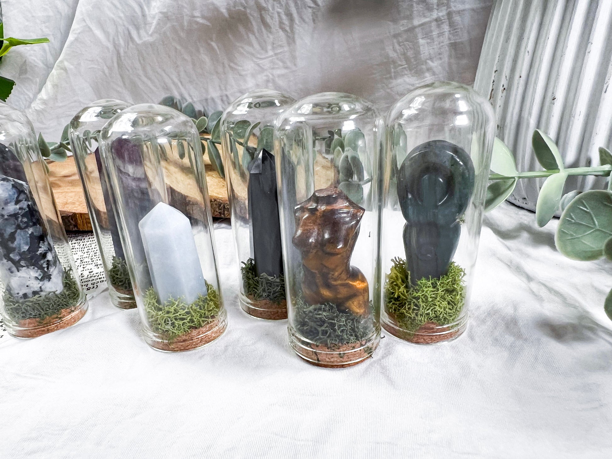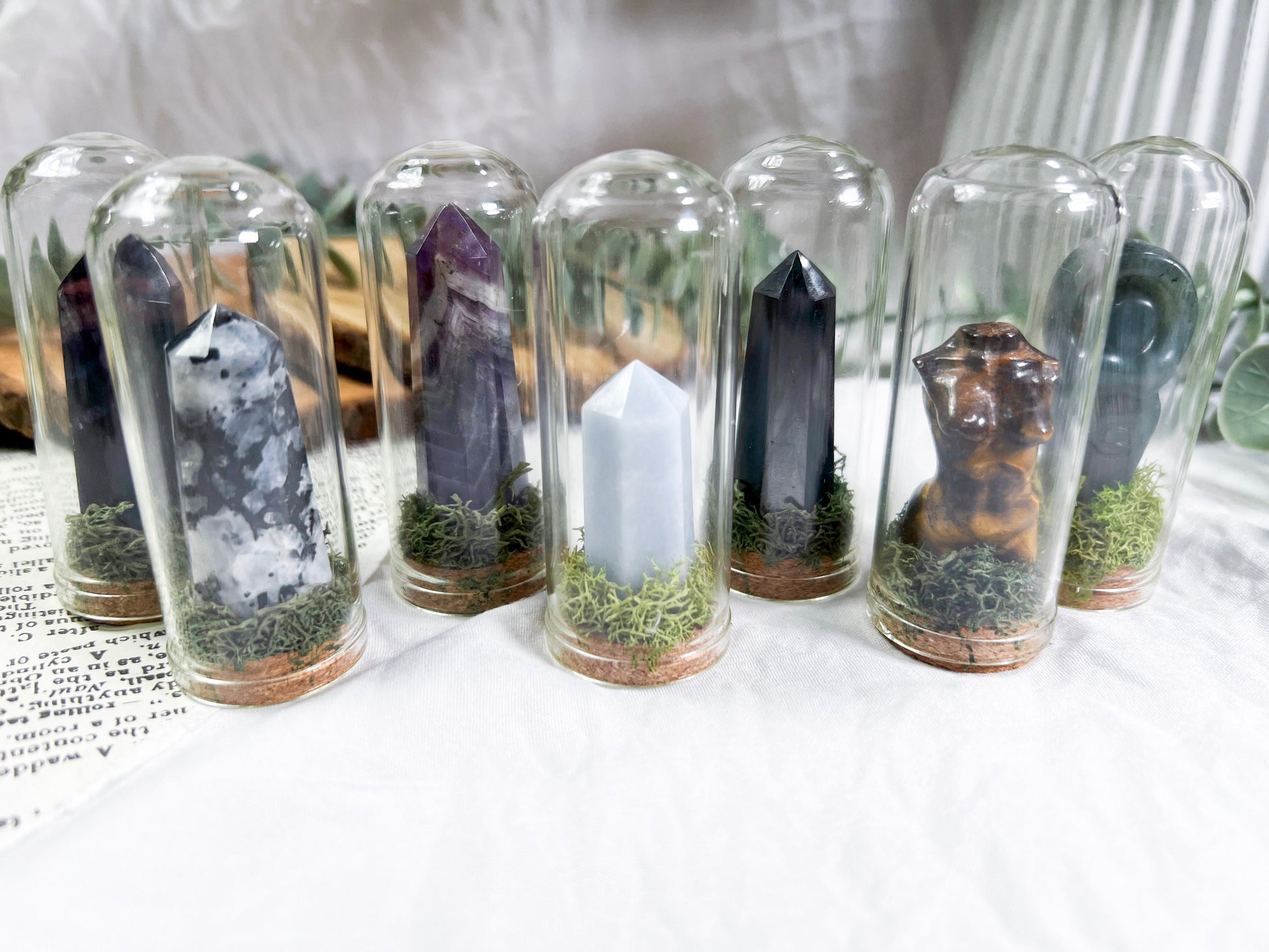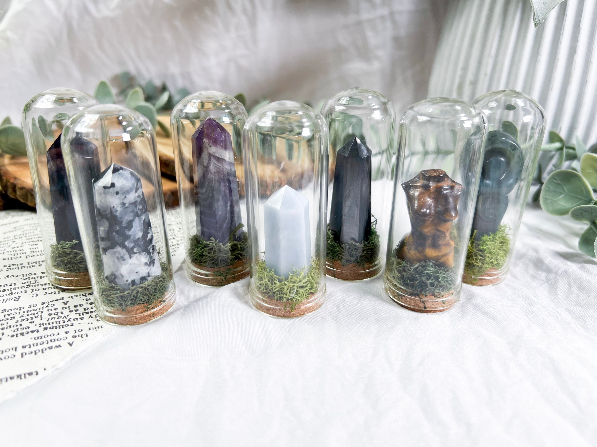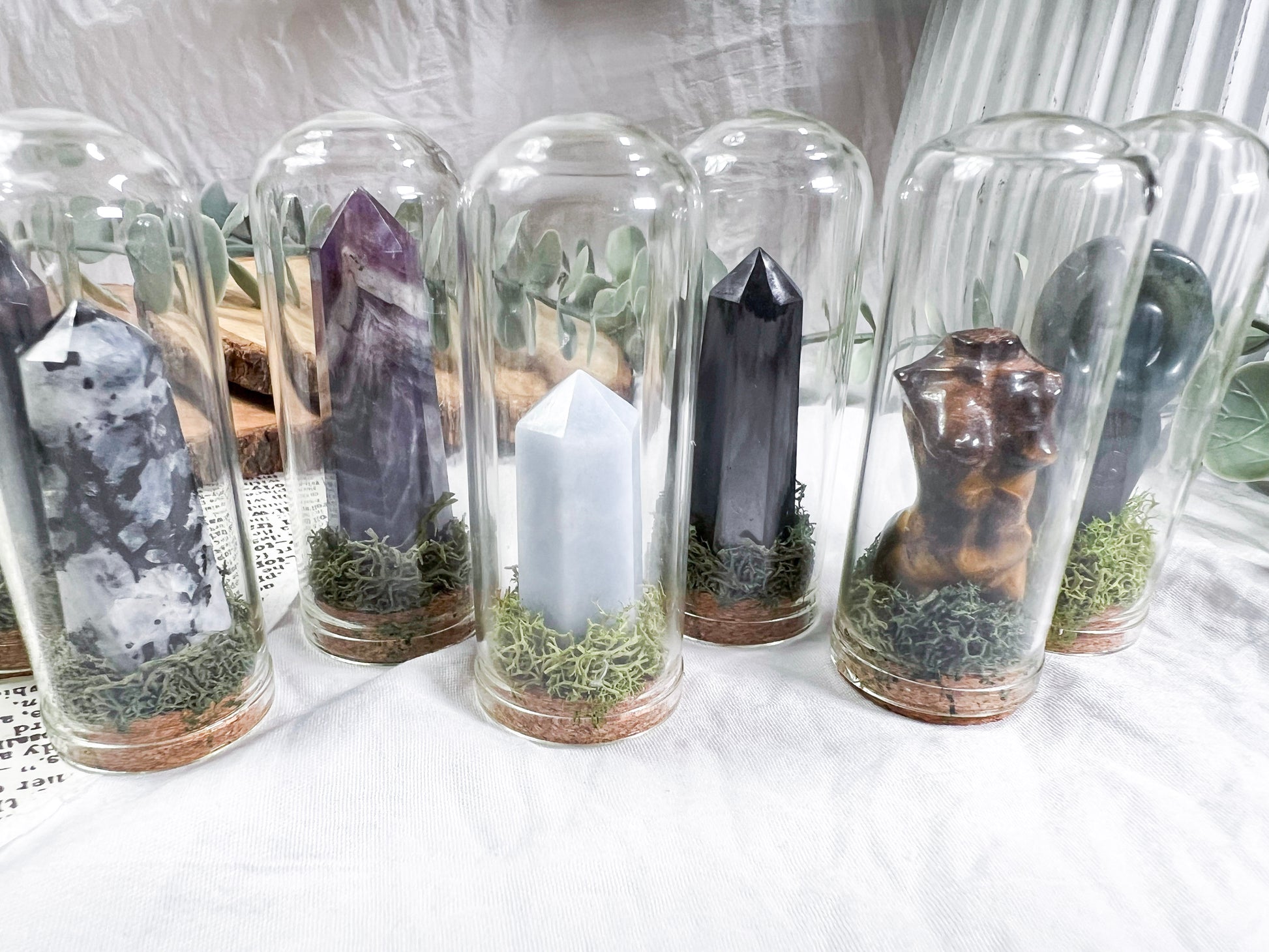 These mini glass domes are small, powerful altar pieces designed to bring focused energy into any space. Standing around two and a half to three inches tall, each dome sits on a moss covered cork base and features a single crystal tower or goddess figure chosen for its specific intention. These little domes are perfect for desks, nightstands, car dashboards, travel altars, or as gifts for anyone who loves simple, beautiful magic. Choose the energy you need — intuition, grounding, confidence, peace, or clarity — and let your dome hold that vibration for you throughout the day.