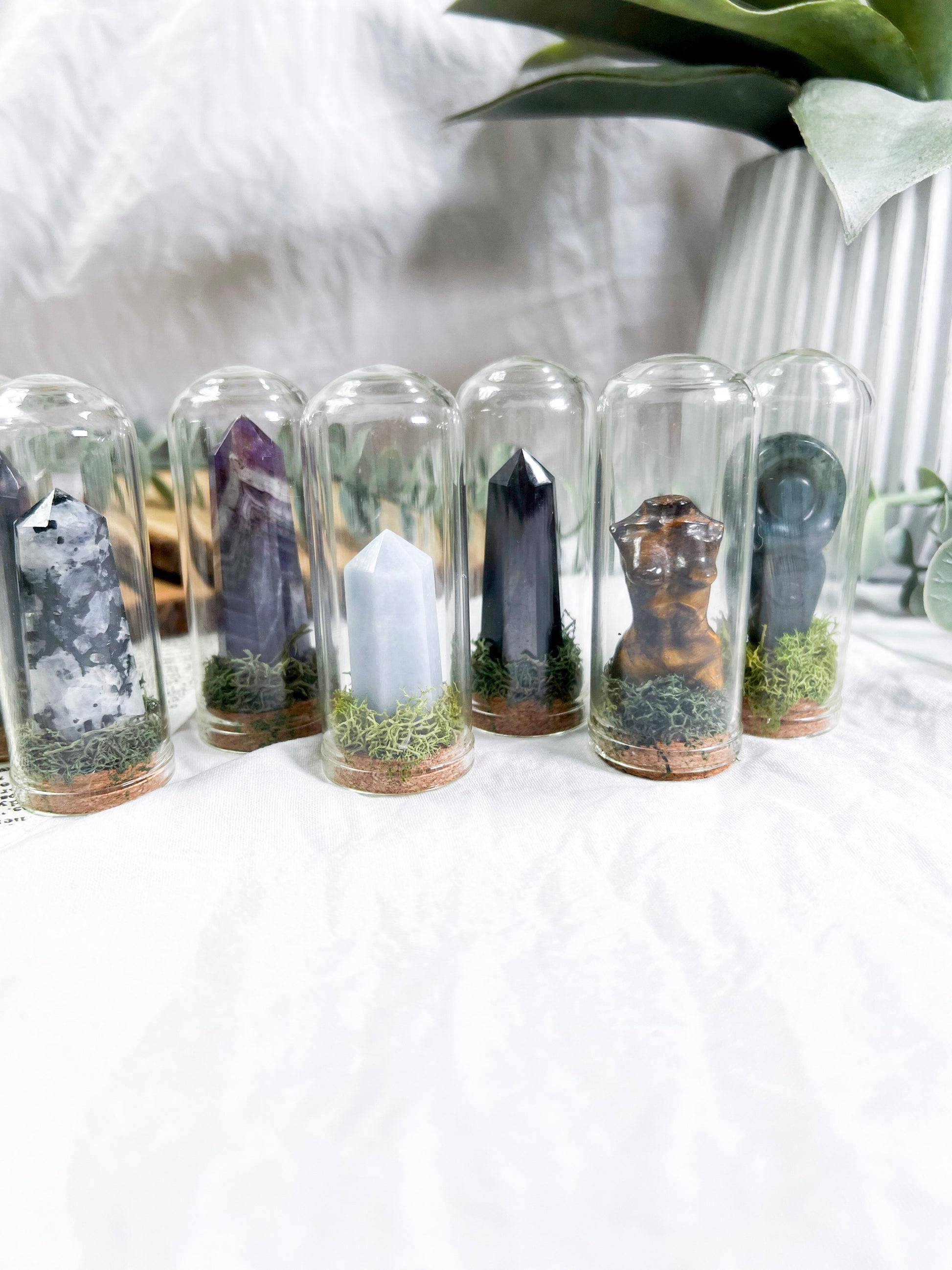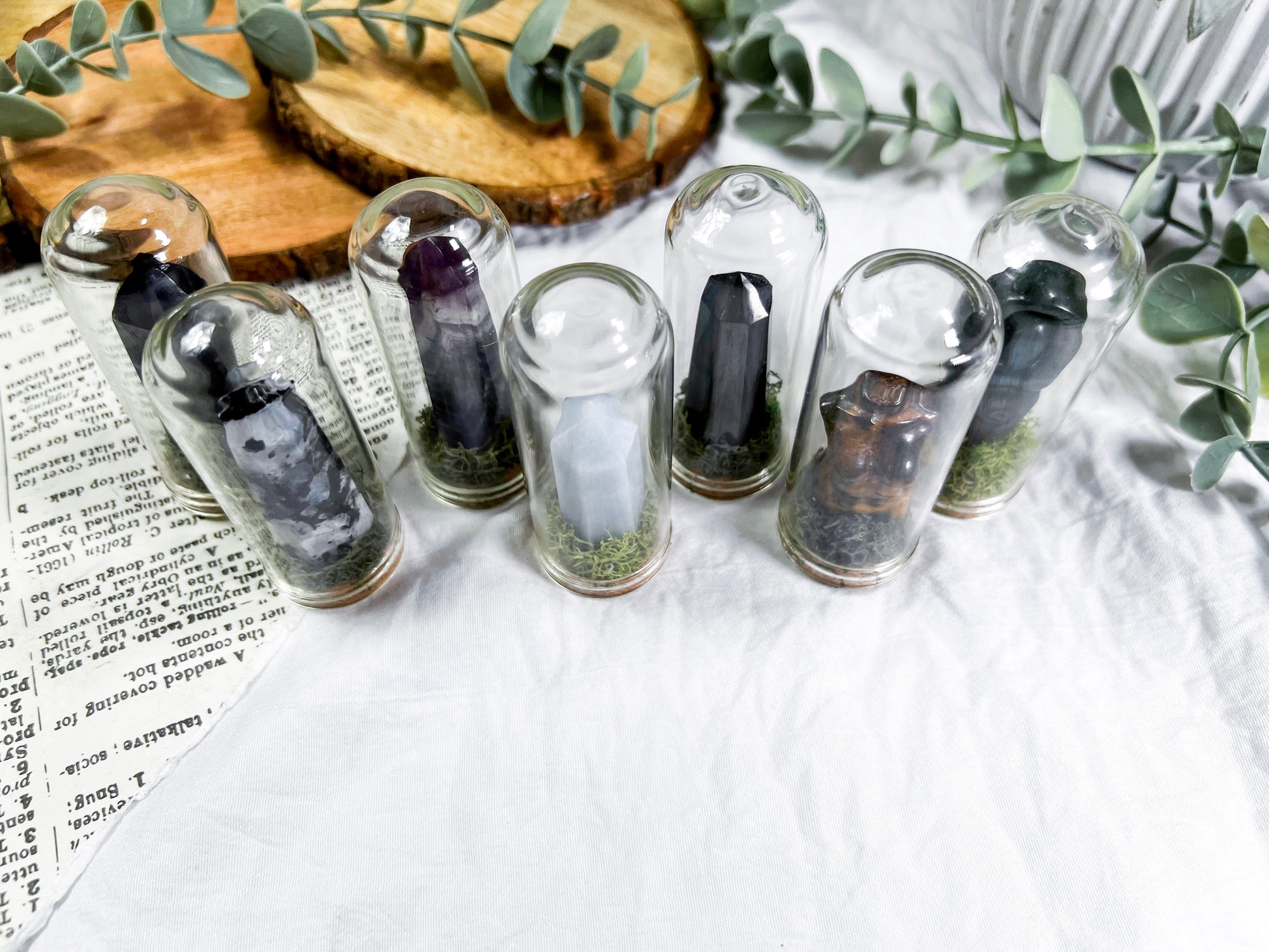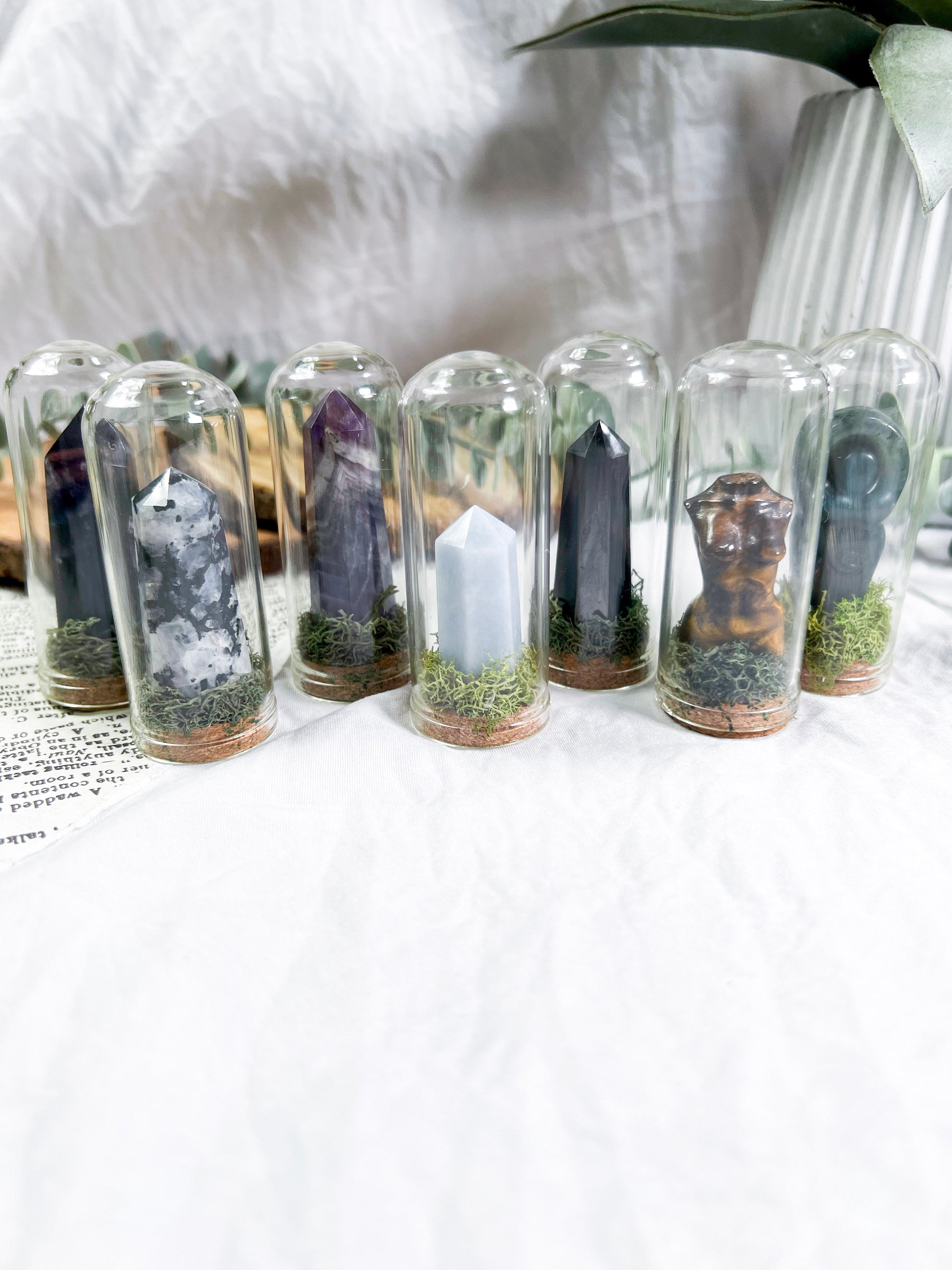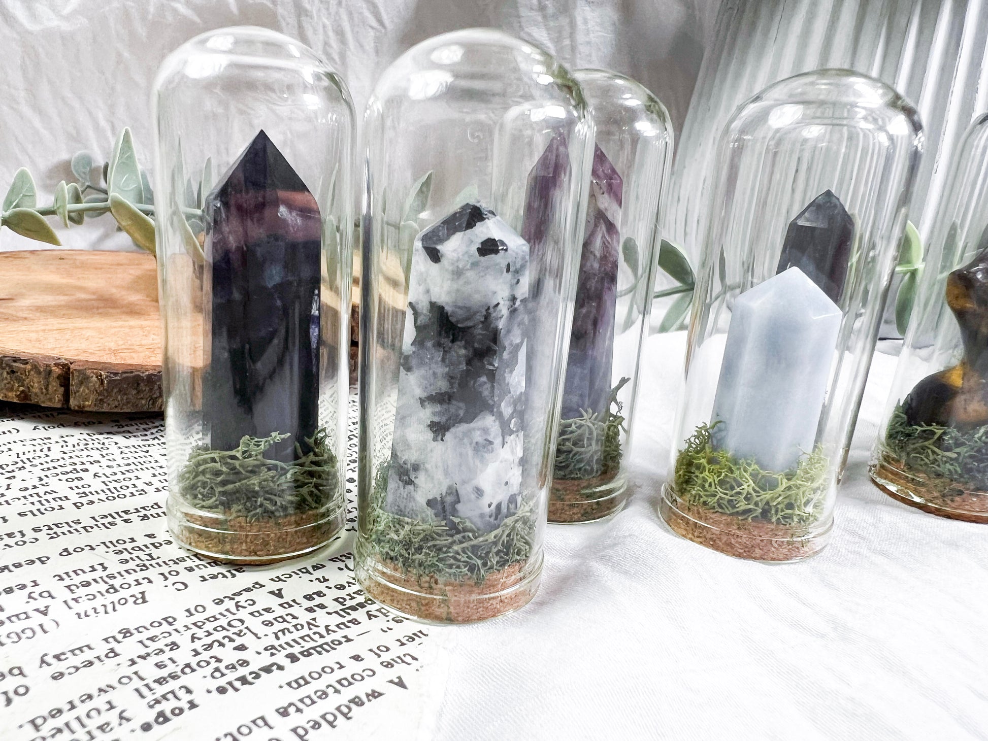 These mini glass domes are small, powerful altar pieces designed to bring focused energy into any space. Standing around two and a half to three inches tall, each dome sits on a moss covered cork base and features a single crystal tower or goddess figure chosen for its specific intention. These little domes are perfect for desks, nightstands, car dashboards, travel altars, or as gifts for anyone who loves simple, beautiful magic. Choose the energy you need — intuition, grounding, confidence, peace, or clarity — and let your dome hold that vibration for you throughout the day.