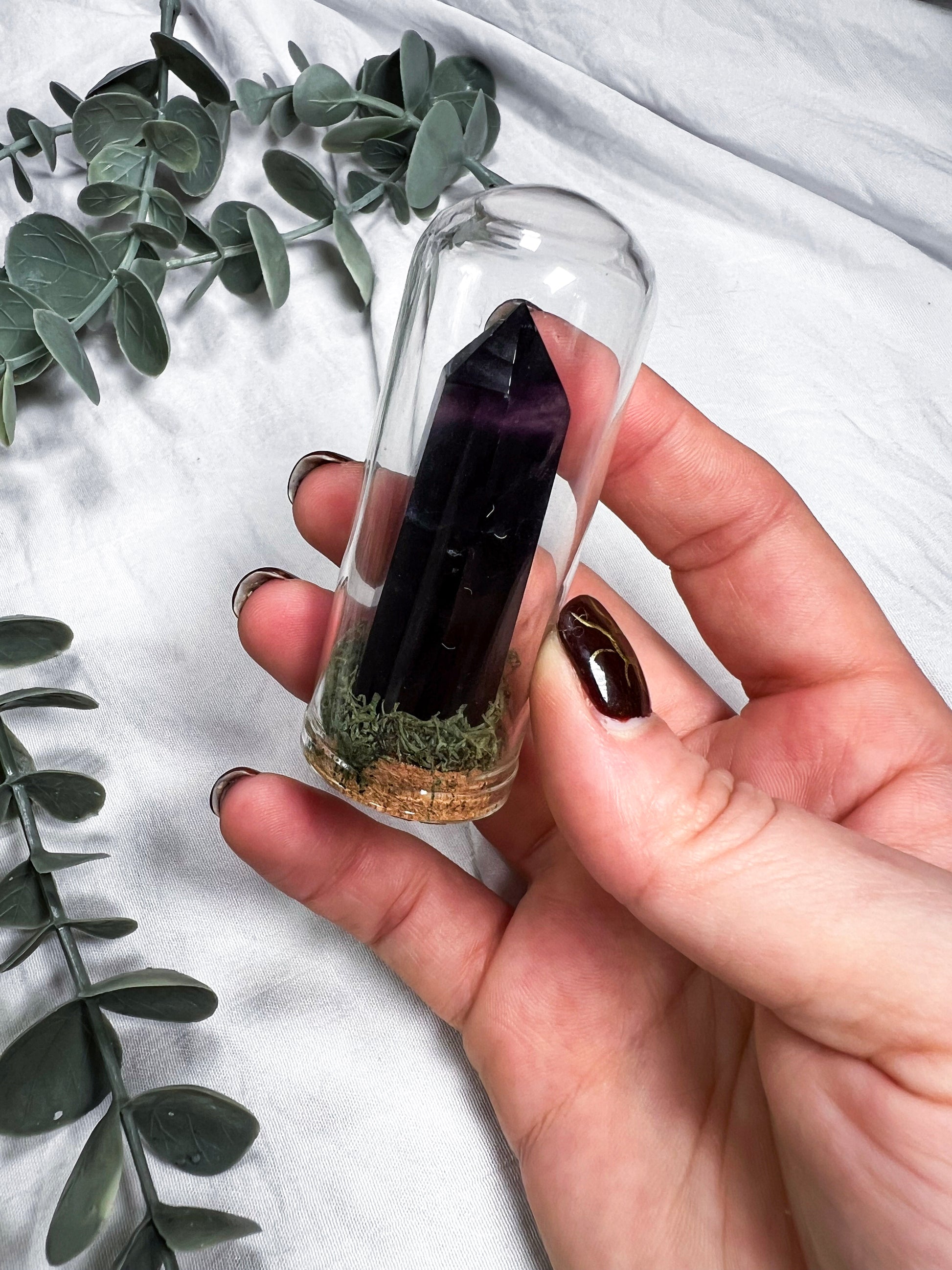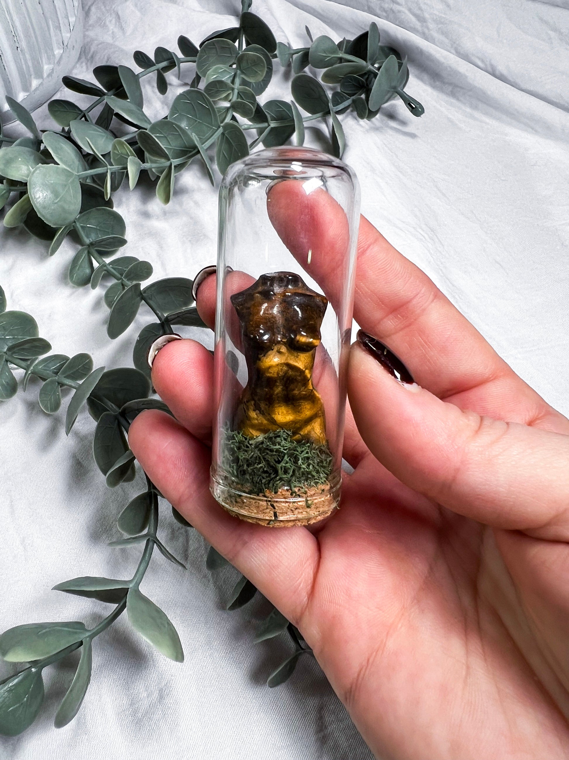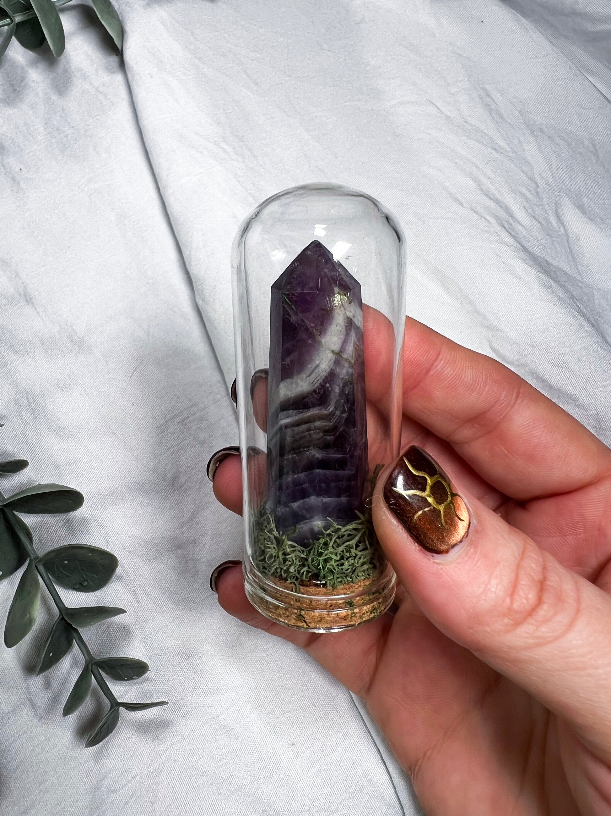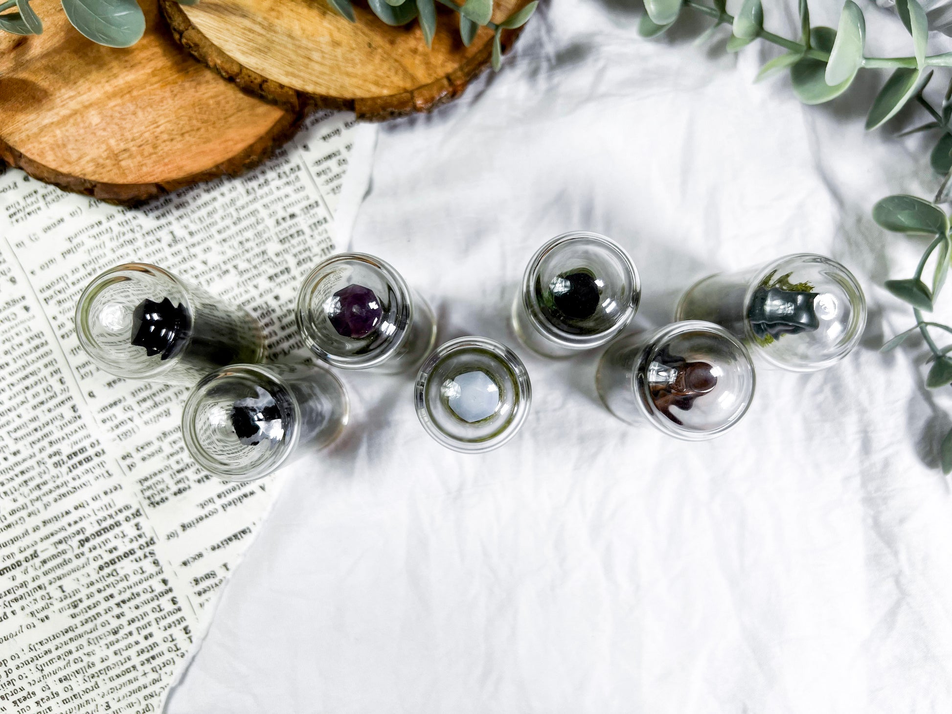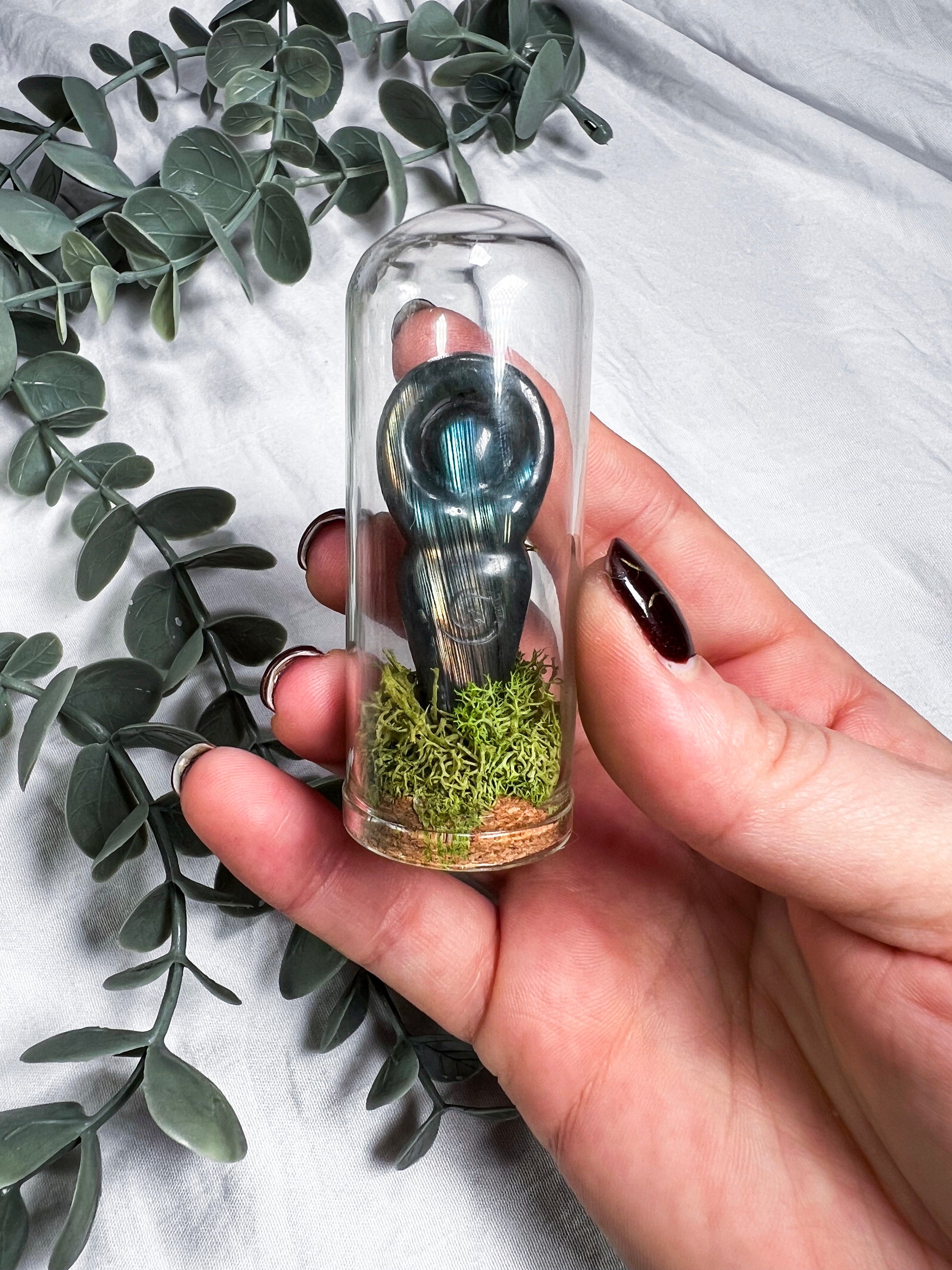 These mini glass domes are small, powerful altar pieces designed to bring focused energy into any space. Standing around two and a half to three inches tall, each dome sits on a moss covered cork base and features a single crystal tower or goddess figure chosen for its specific intention. These little domes are perfect for desks, nightstands, car dashboards, travel altars, or as gifts for anyone who loves simple, beautiful magic. Choose the energy you need — intuition, grounding, confidence, peace, or clarity — and let your dome hold that vibration for you throughout the day.