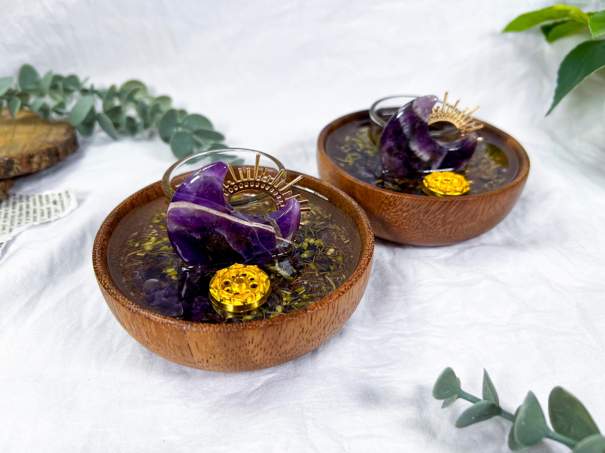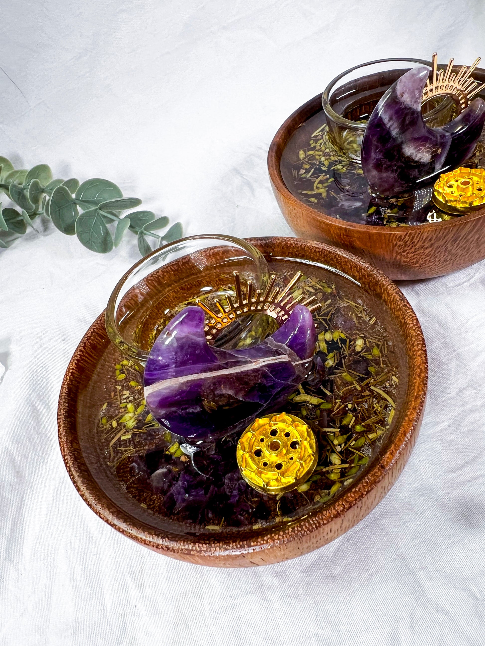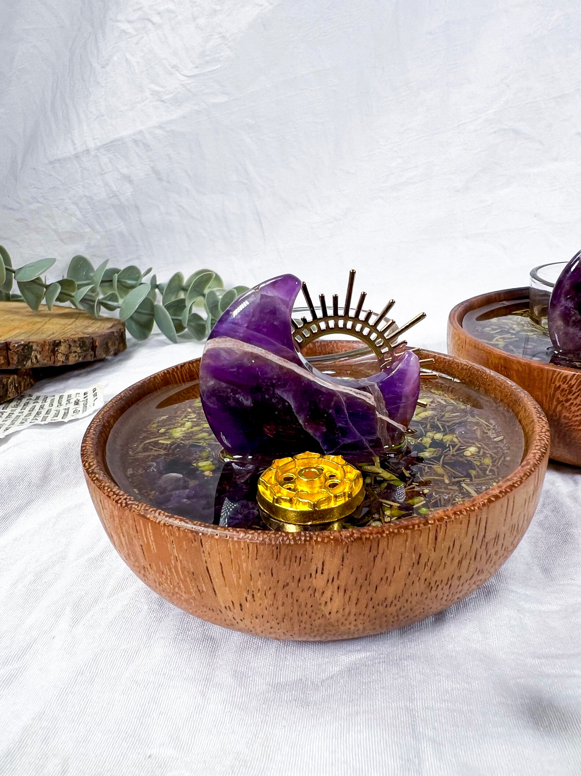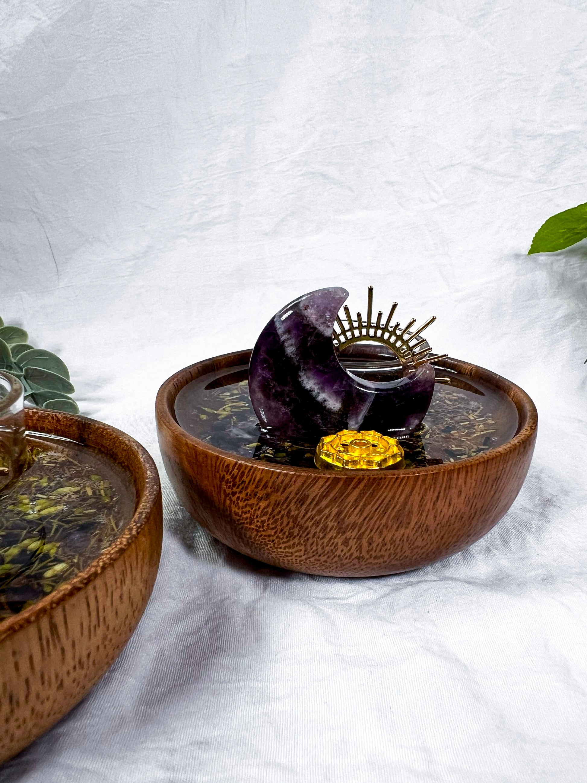 Handcrafted mini ritual vessel featuring an acacia wood bowl with herbs suspended in resin, created to support energetic transmutation, transformation, and intentional change. Anchored by amethyst and solar accents, this piece is ideal for rituals focused on releasing old energy and shifting into new alignment.