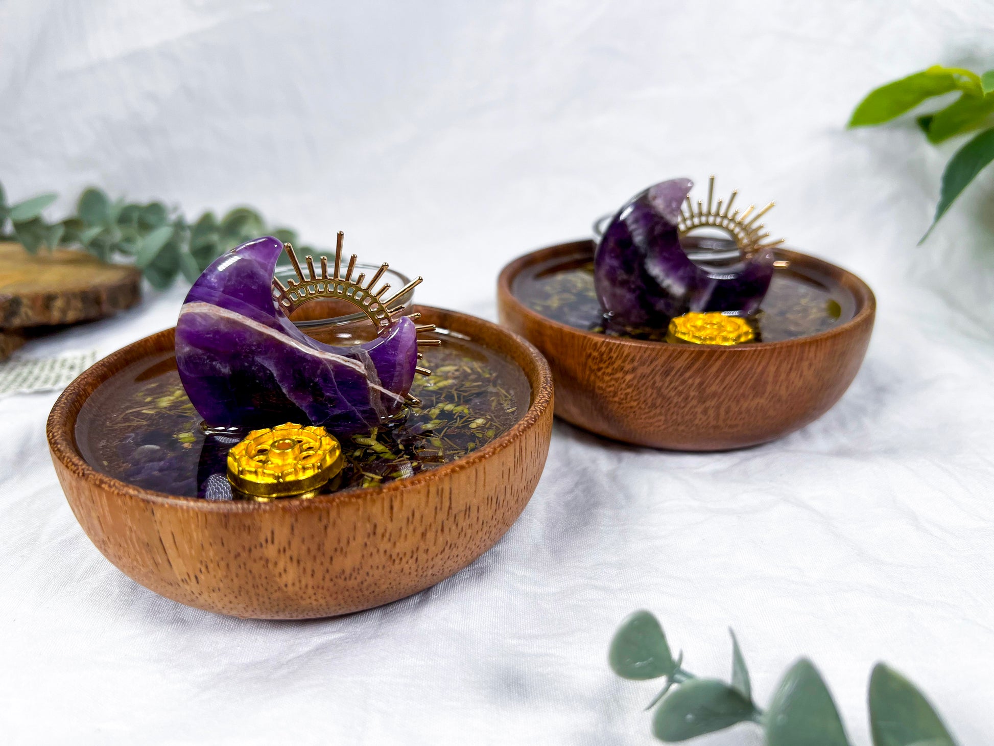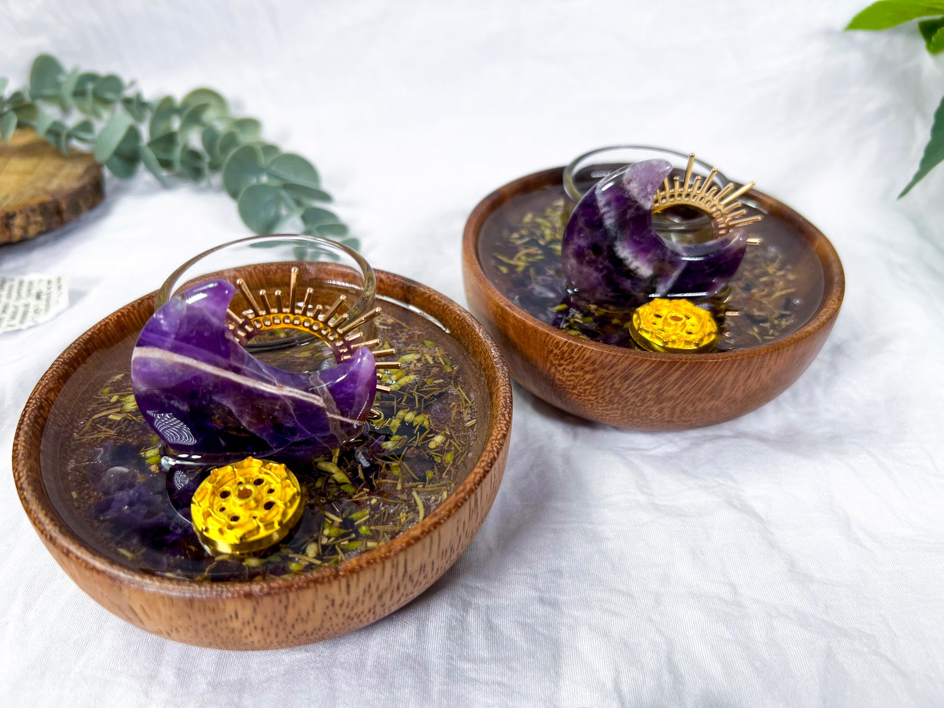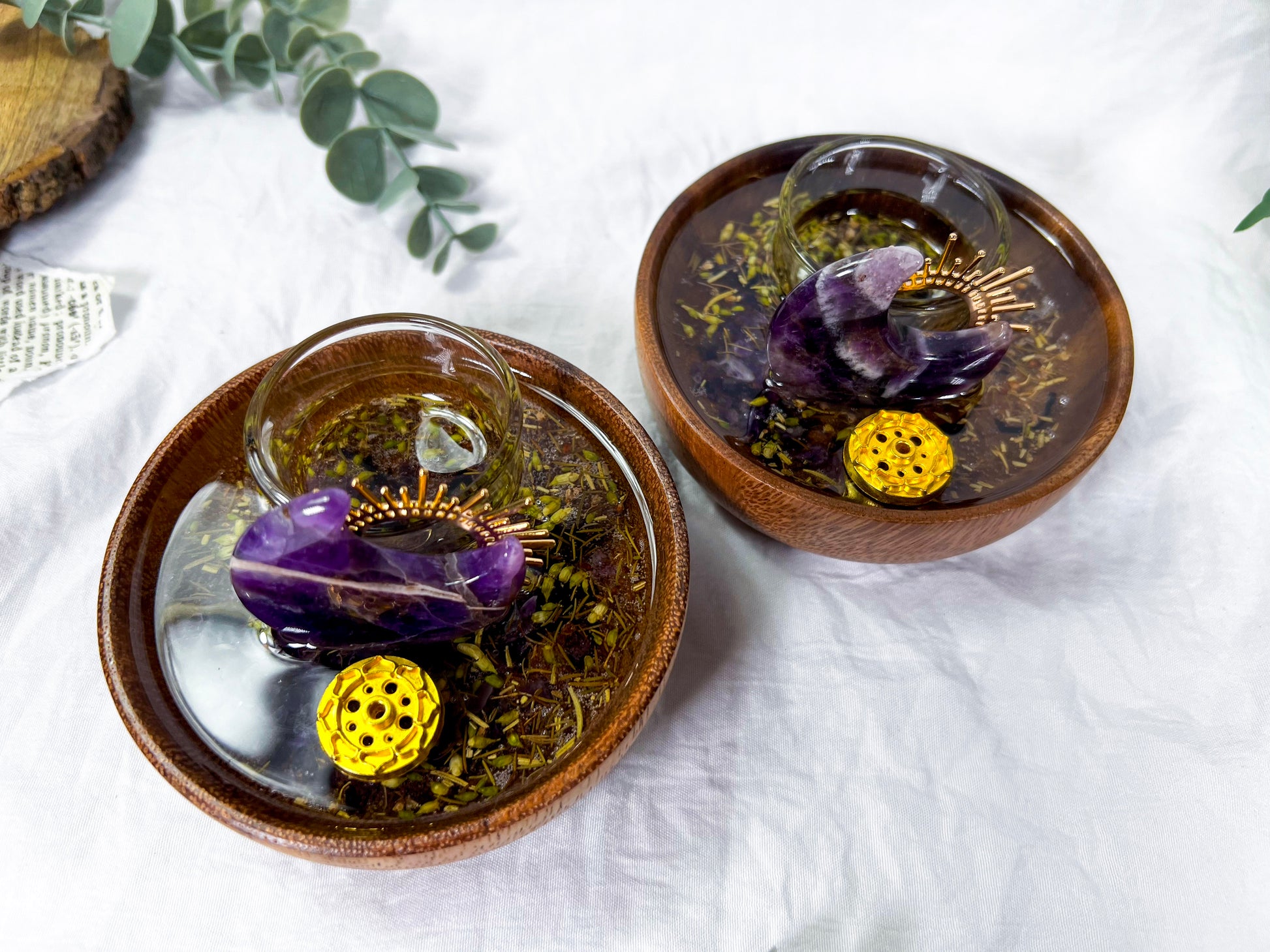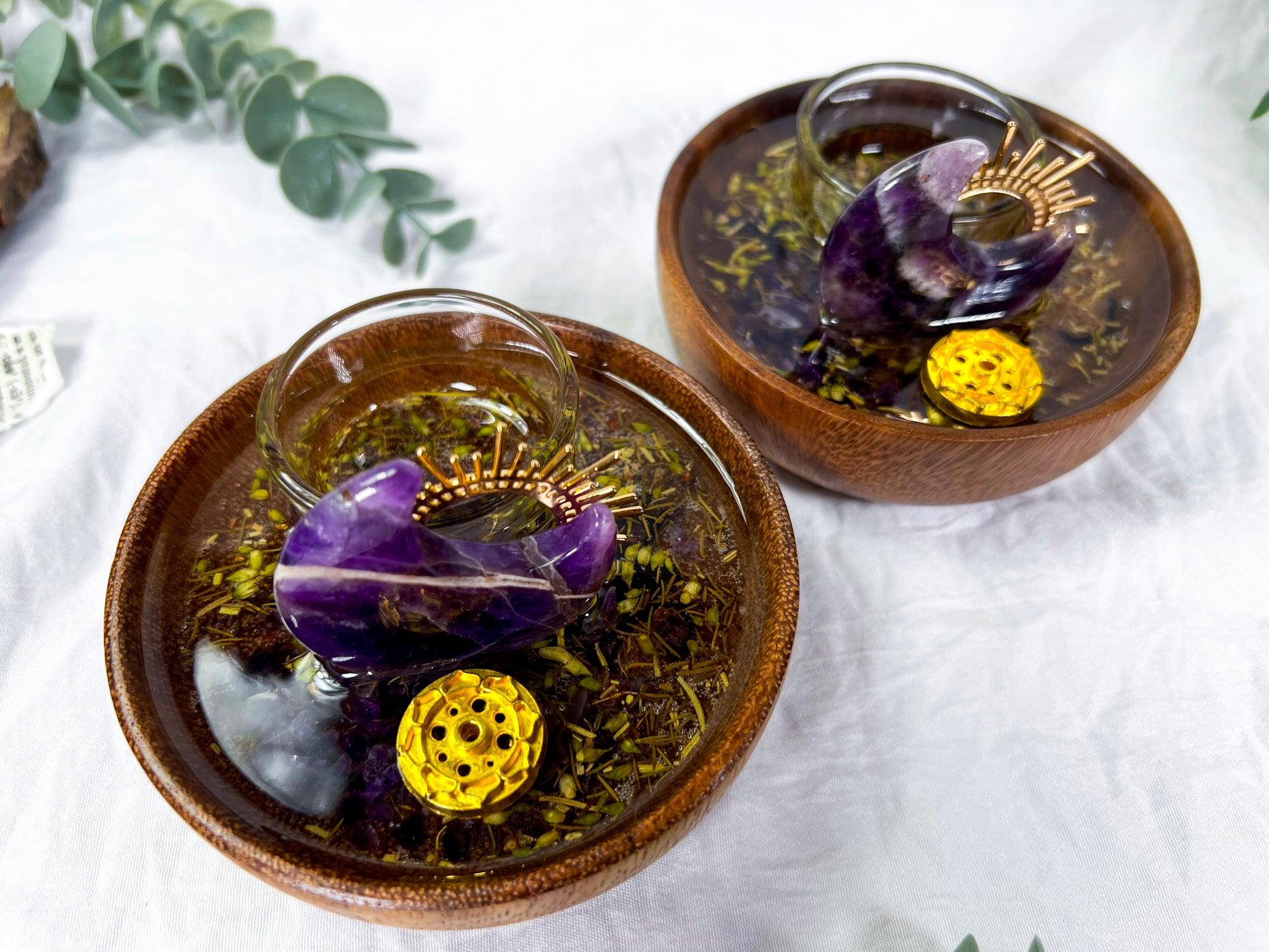Handcrafted mini ritual vessel featuring an acacia wood bowl with herbs suspended in resin, created to support energetic transmutation, transformation, and intentional change. Anchored by amethyst and solar accents, this piece is ideal for rituals focused on releasing old energy and shifting into new alignment.