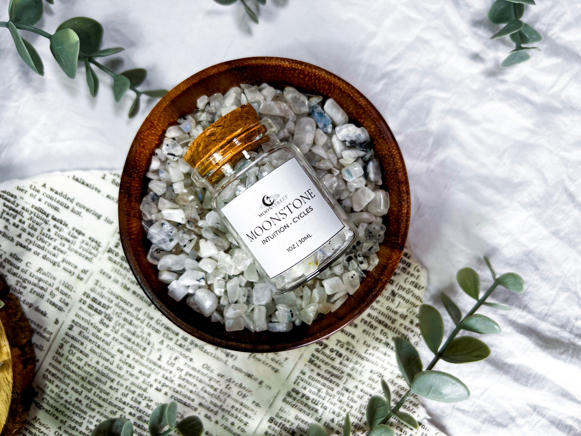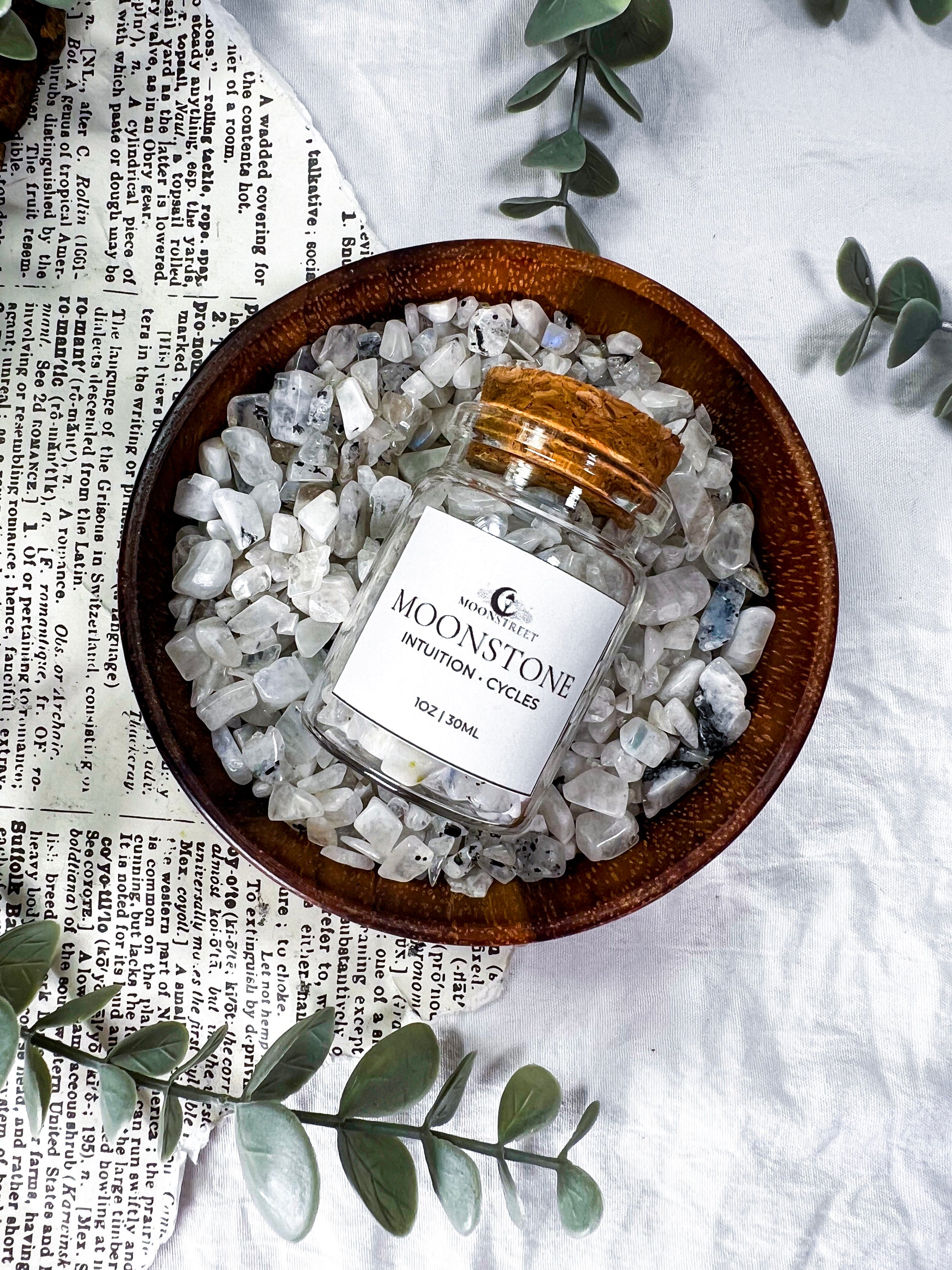Bulk Moonstone crystal chips in a 2oz glass jar, perfect for spell work, altars, jars, candles, grids, baths, and ritual magic. Known as the stone of intuition and cycles, Moonstone supports emotional balance, new beginnings, and inner guidance.