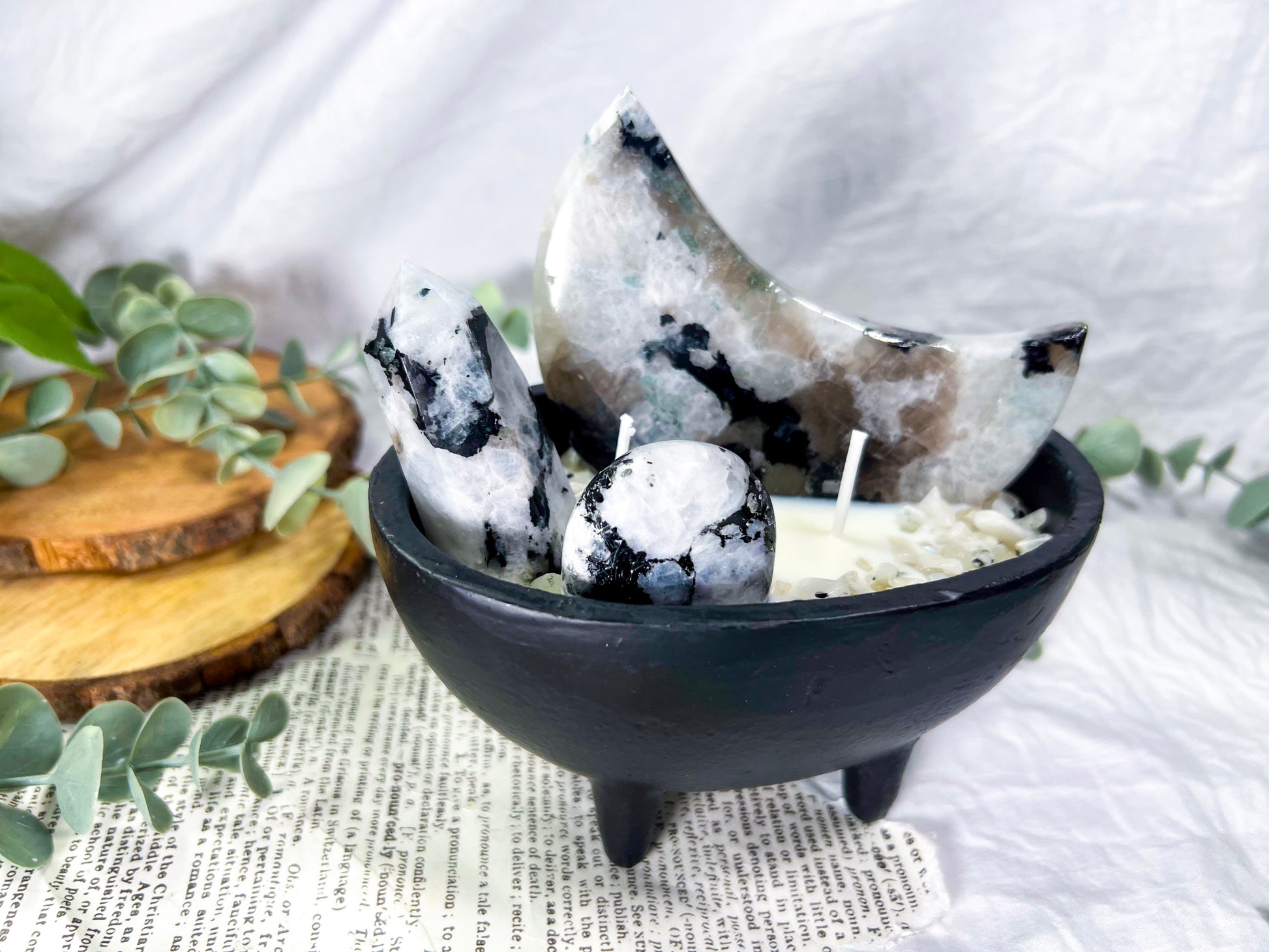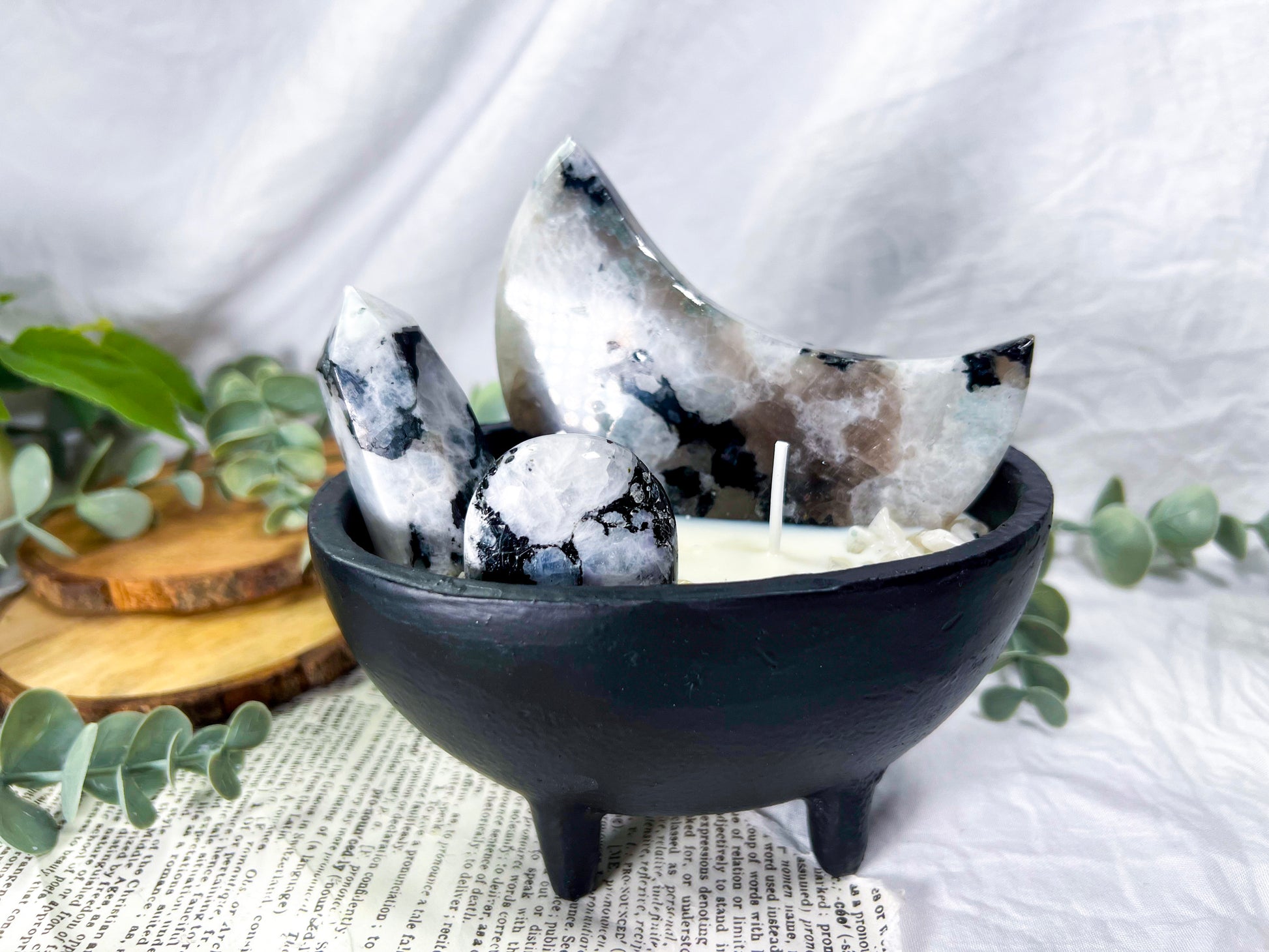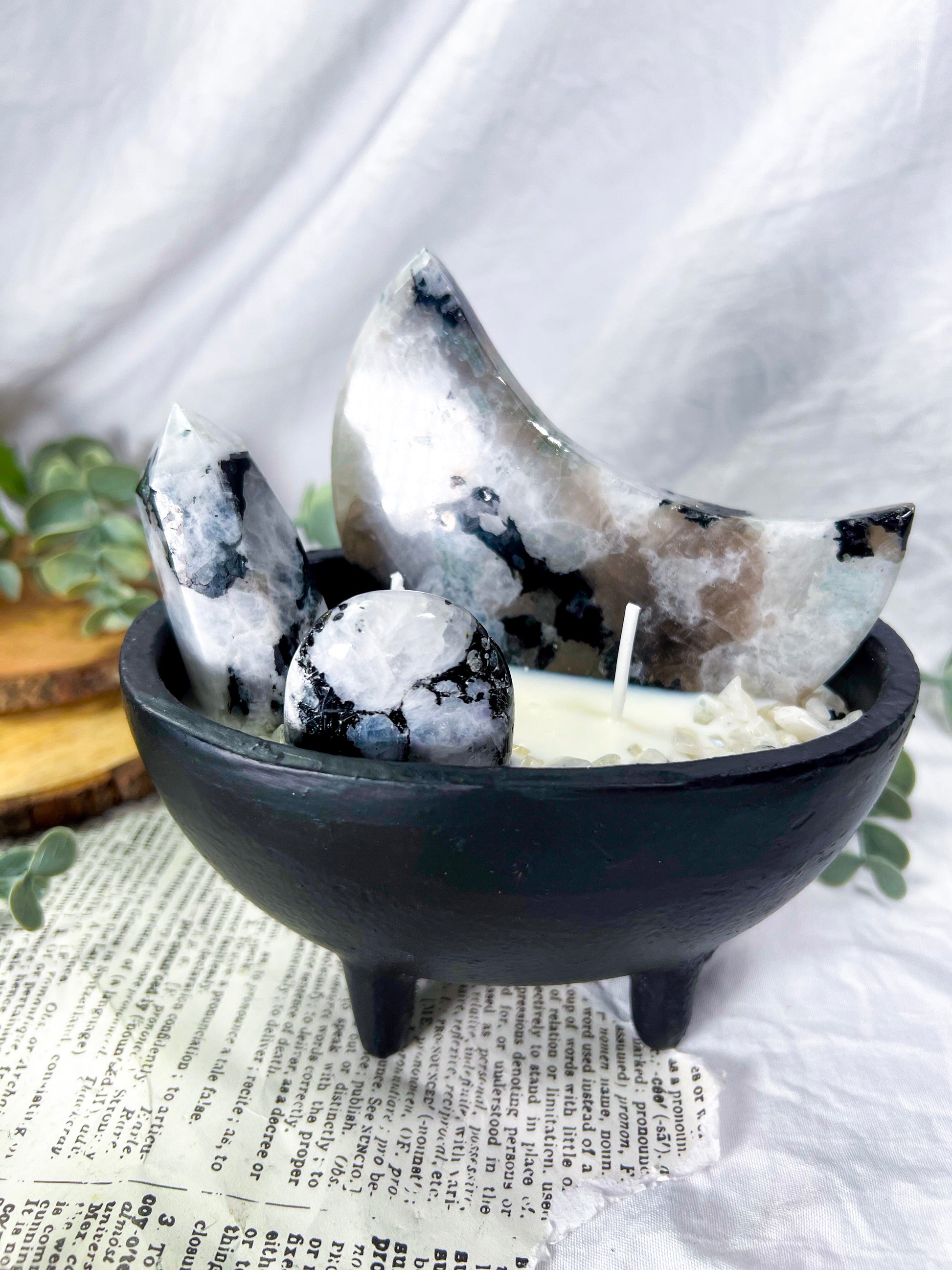 A lunar-aligned cauldron candle designed to support intuition, emotional healing, and inner reflection. Moonstone Night blends moonstone with lavender and sandalwood to create a gentle ritual flame for connecting with cycles, dreams, and intuitive flow.