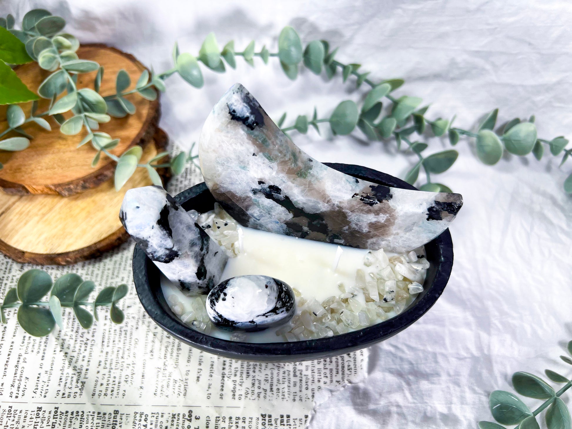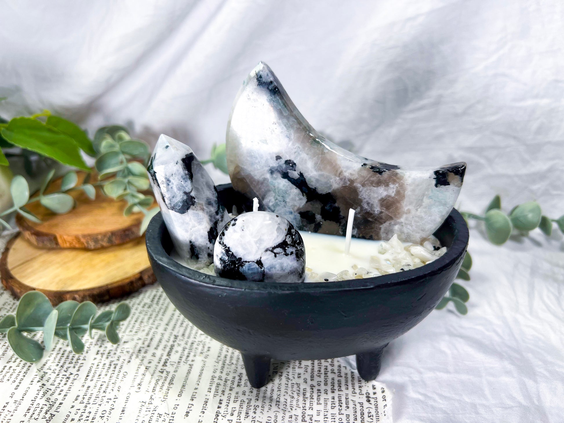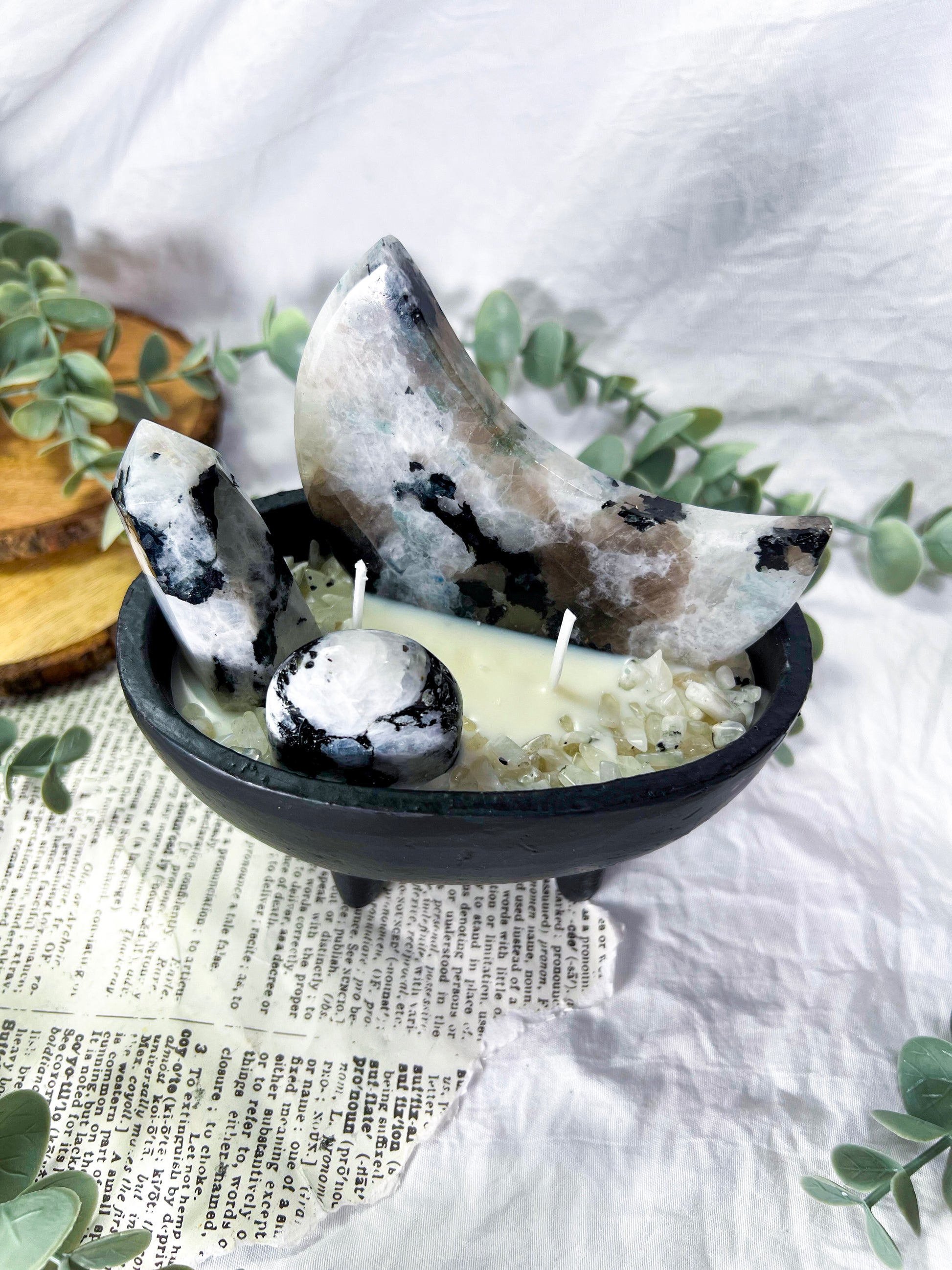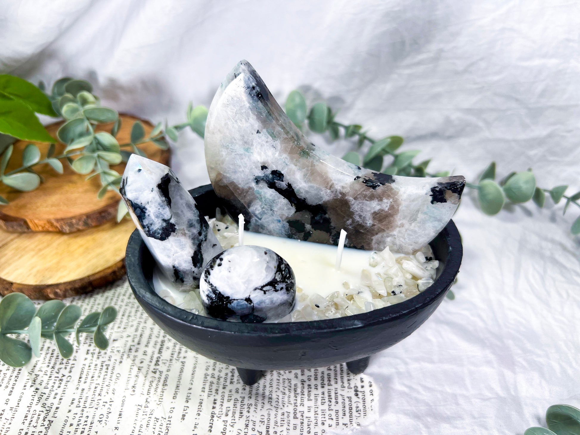 A lunar-aligned cauldron candle designed to support intuition, emotional healing, and inner reflection. Moonstone Night blends moonstone with lavender and sandalwood to create a gentle ritual flame for connecting with cycles, dreams, and intuitive flow.