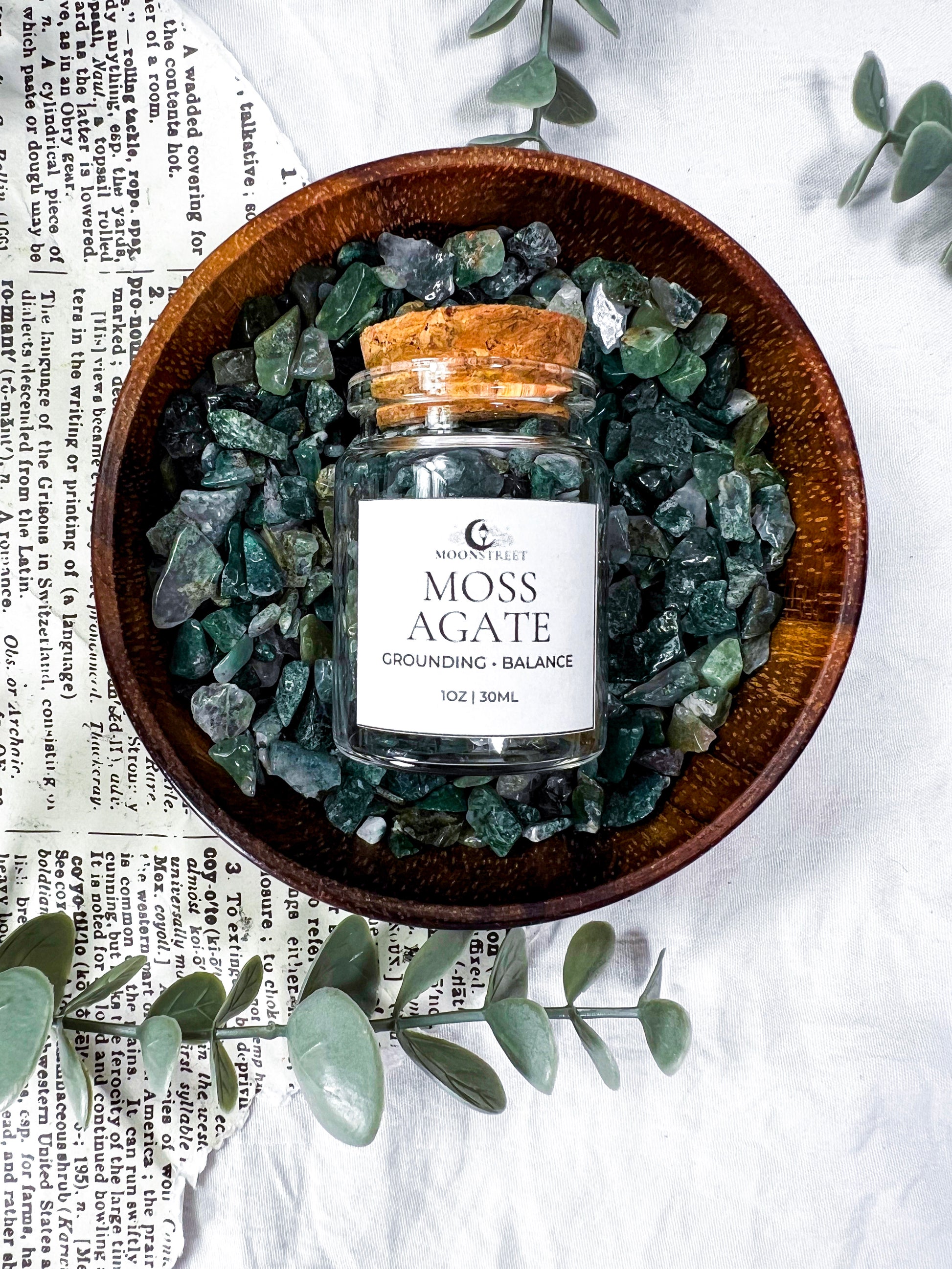 Bulk Moss Agate crystal chips in a 2oz glass jar, perfect for spell work, altars, jars, candles, grids, baths, and ritual magic. Known as the stone of grounding and balance, Moss Agate supports emotional stability, growth, and deep connection to earth energy.