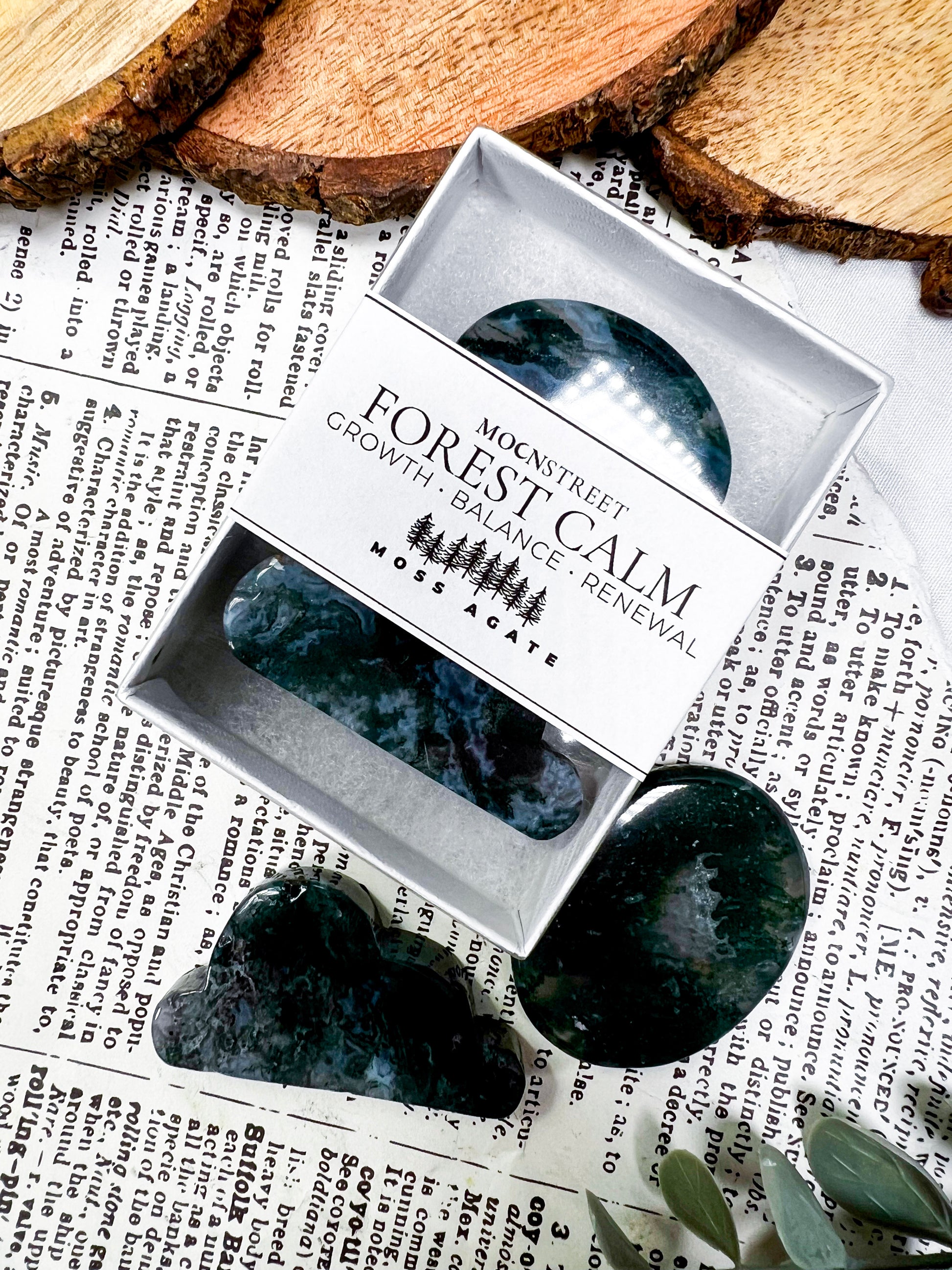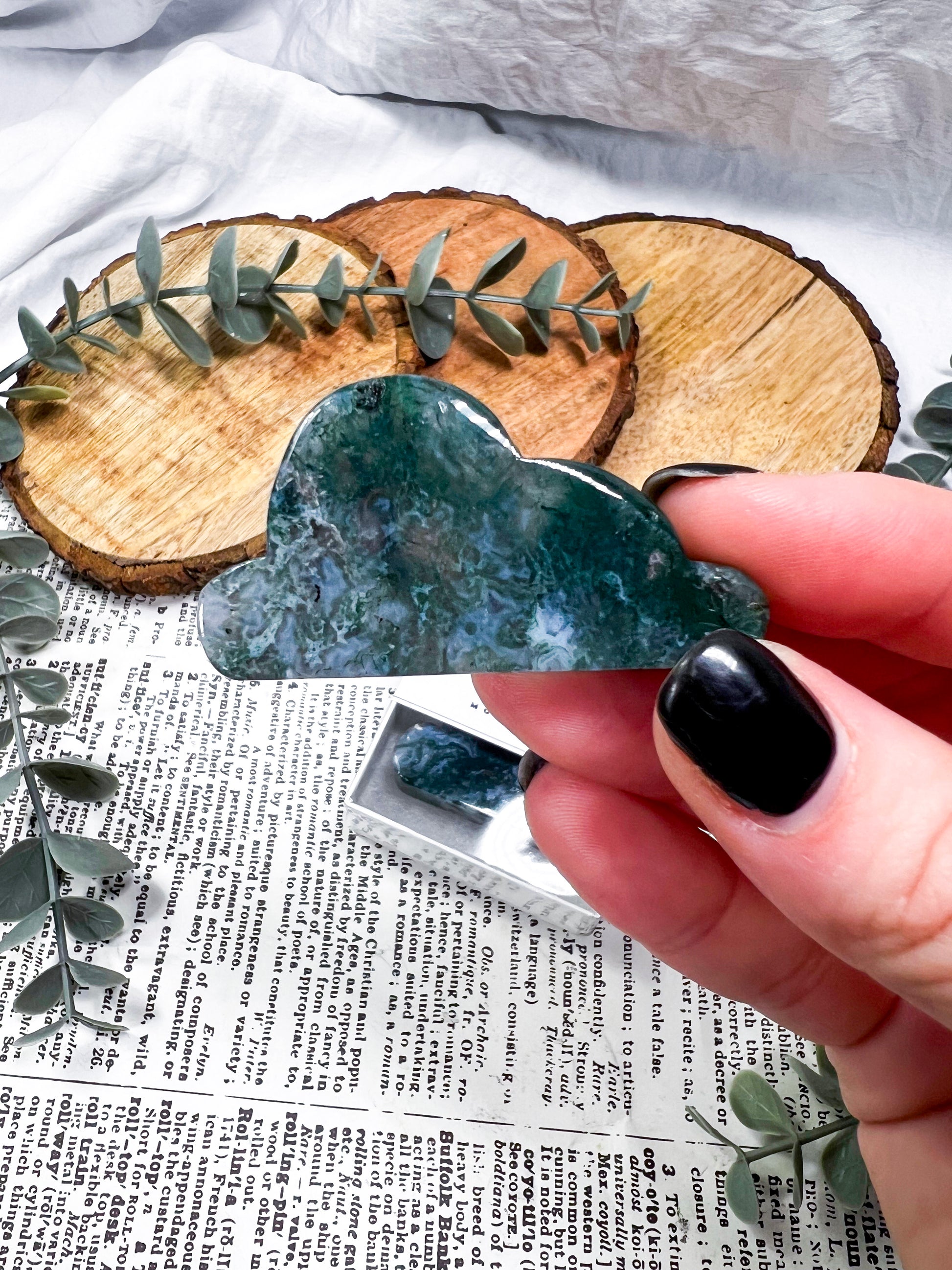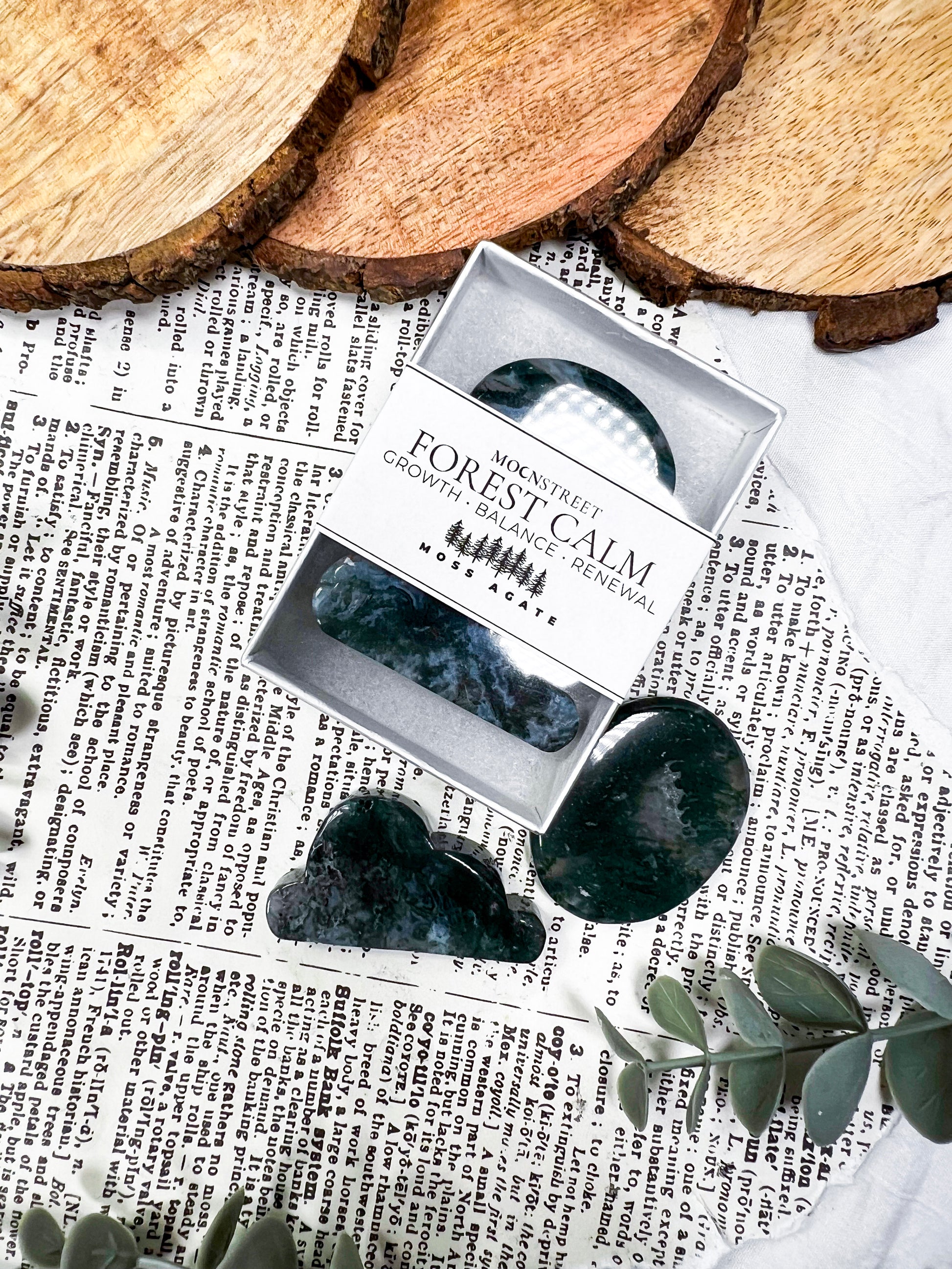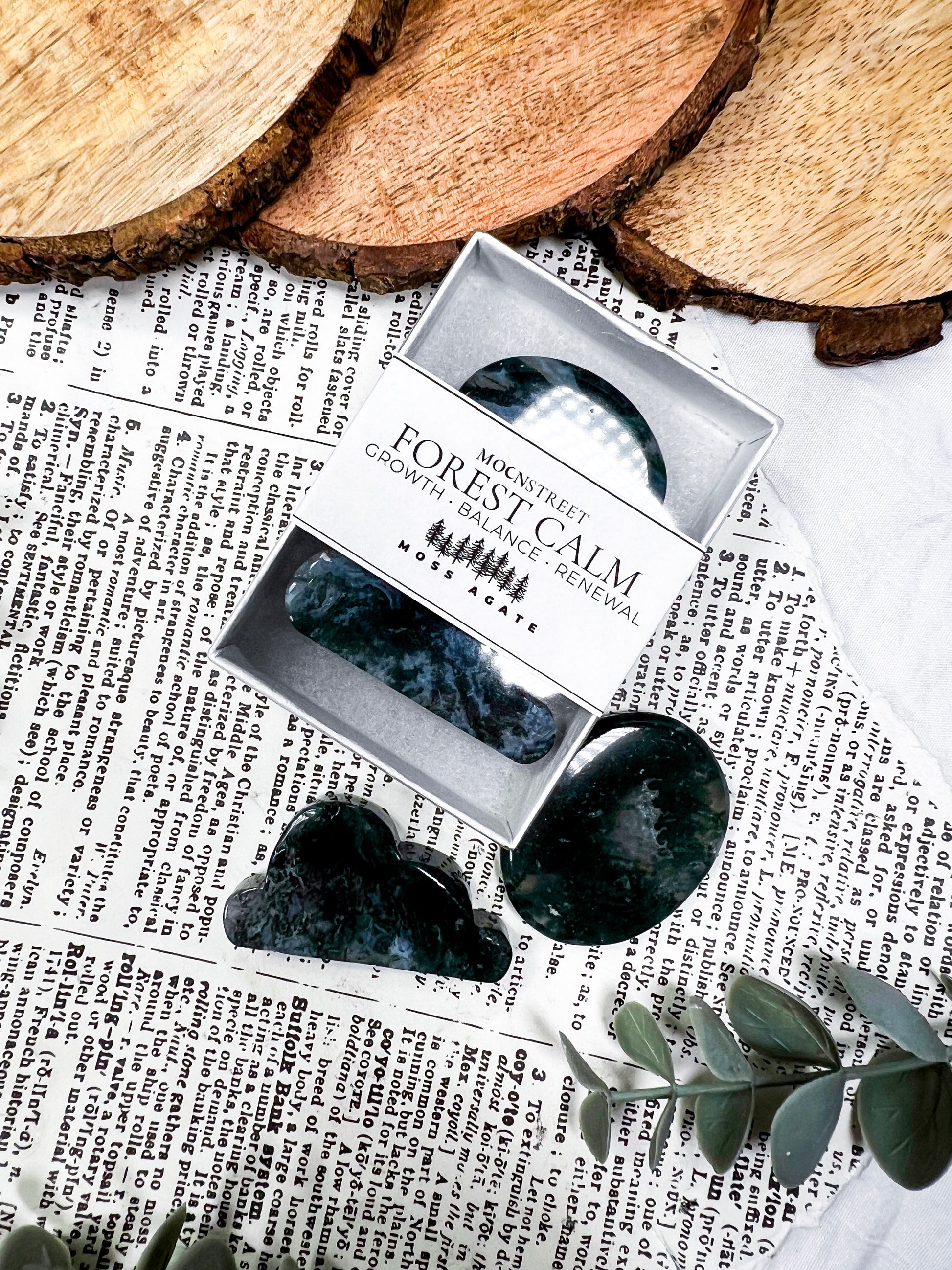 The Moss Agate Mini Set embodies renewal and earthy calm. Includes a moss agate thumb stone and a cloud carving, perfect for grounding rituals, intention work, or stress relief.
