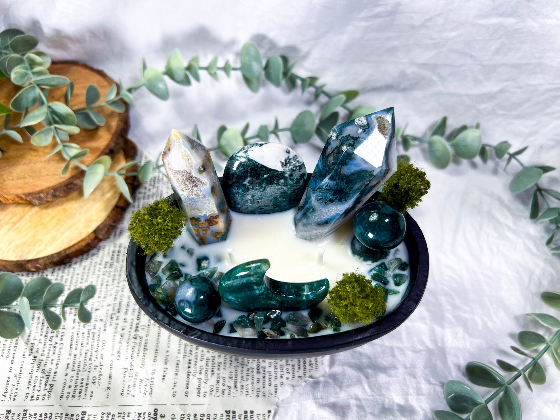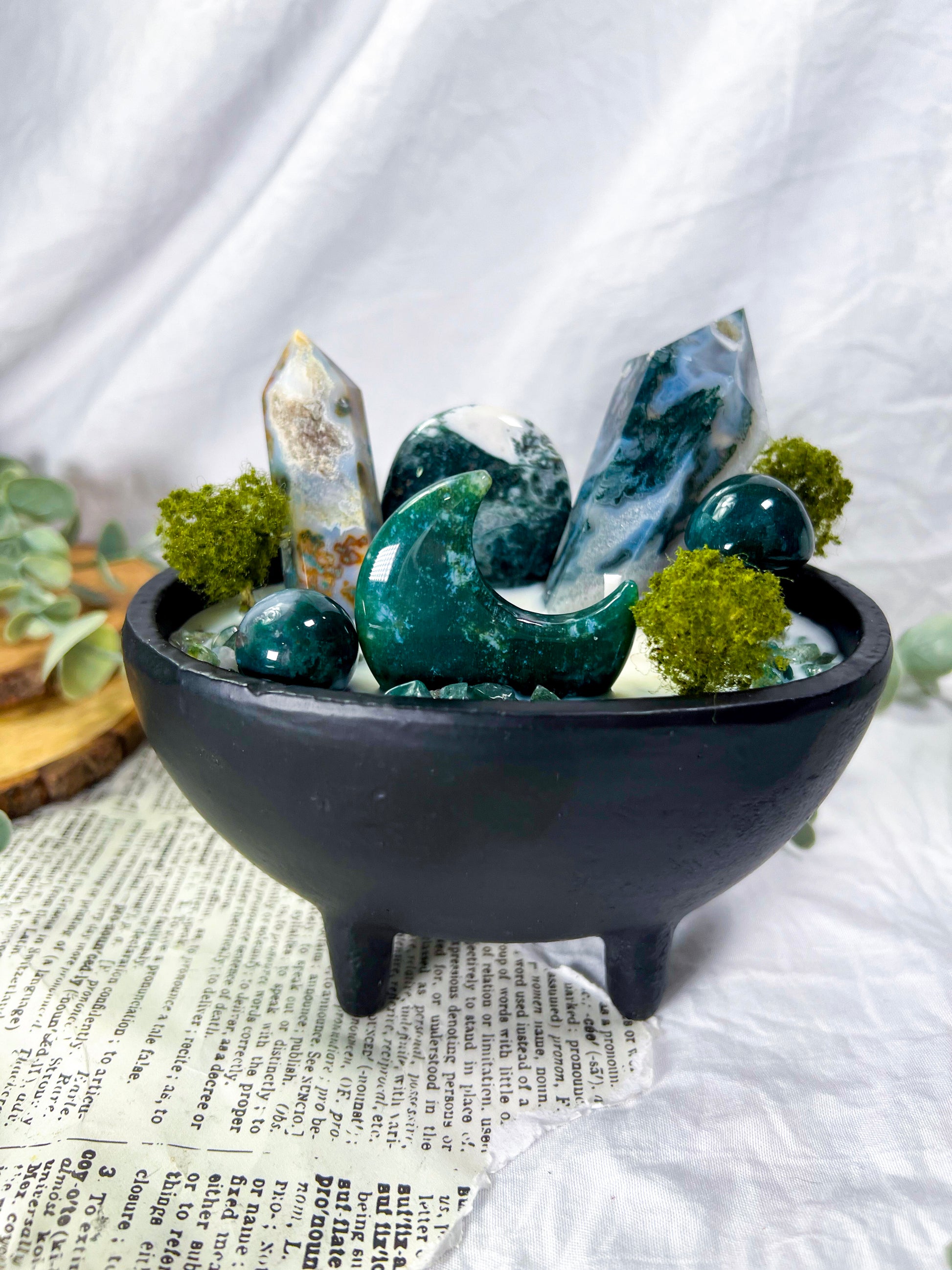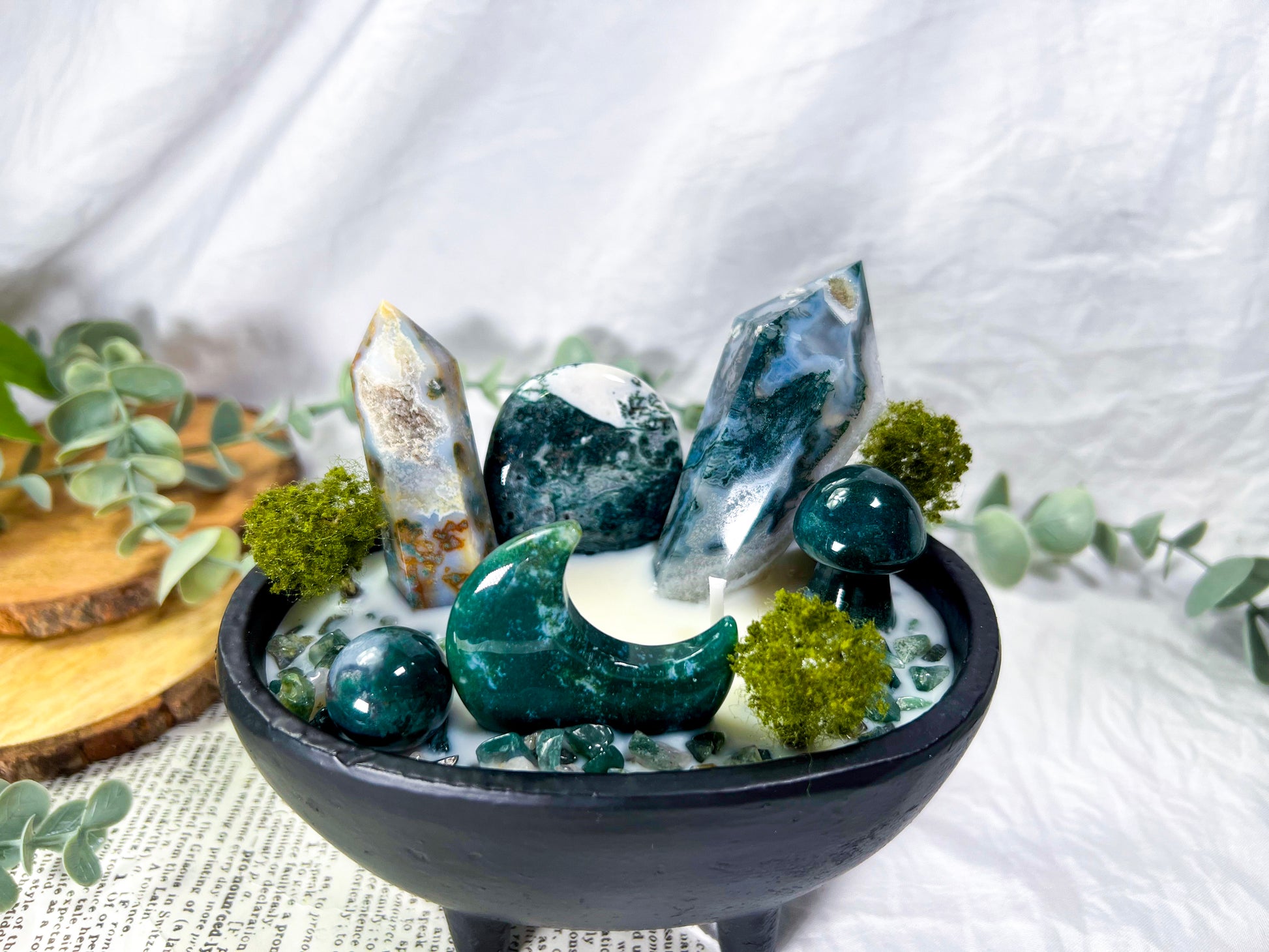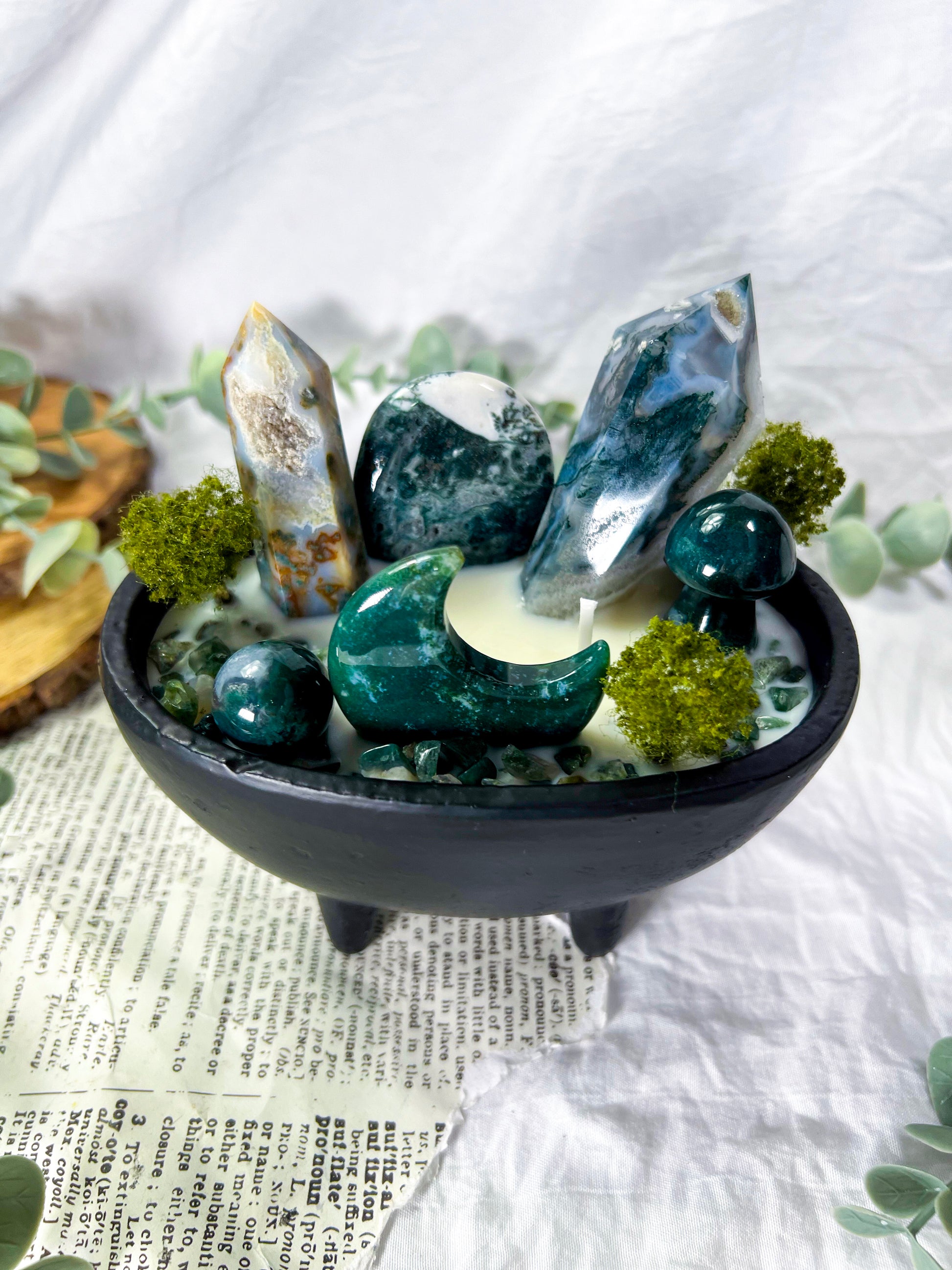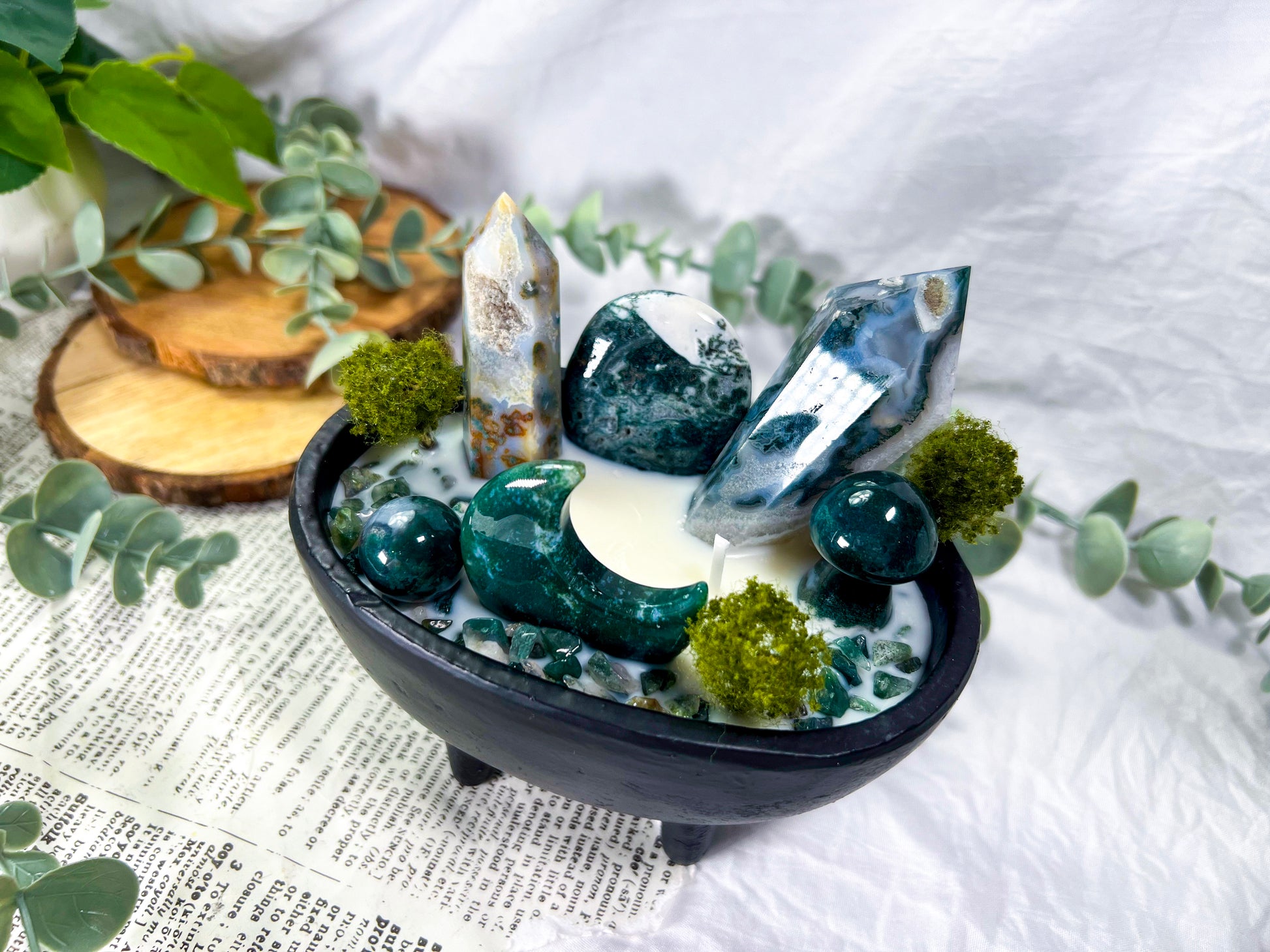 A grounding cauldron candle designed to support emotional balance, steady growth, and connection to earth energy. Moss Fields blends moss agate with lavender and sandalwood to create a calming ritual flame for grounding work, renewal, and stabilizing scattered energy.