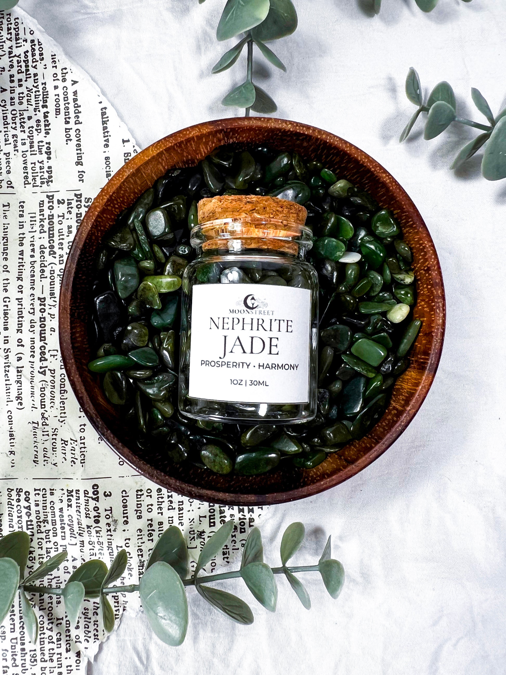 Bulk Nephrite Jade crystal chips in a 2oz glass jar, perfect for spell work, altars, jars, candles, grids, baths, and ritual magic. Known for prosperity and harmony, Nephrite Jade supports emotional balance, steady abundance, and heart-centered grounding.